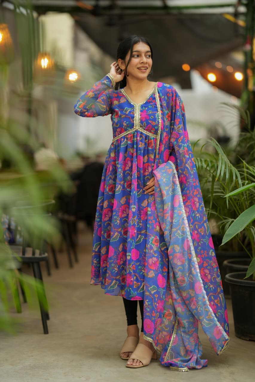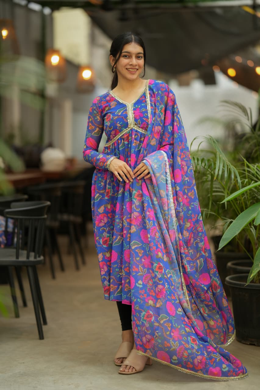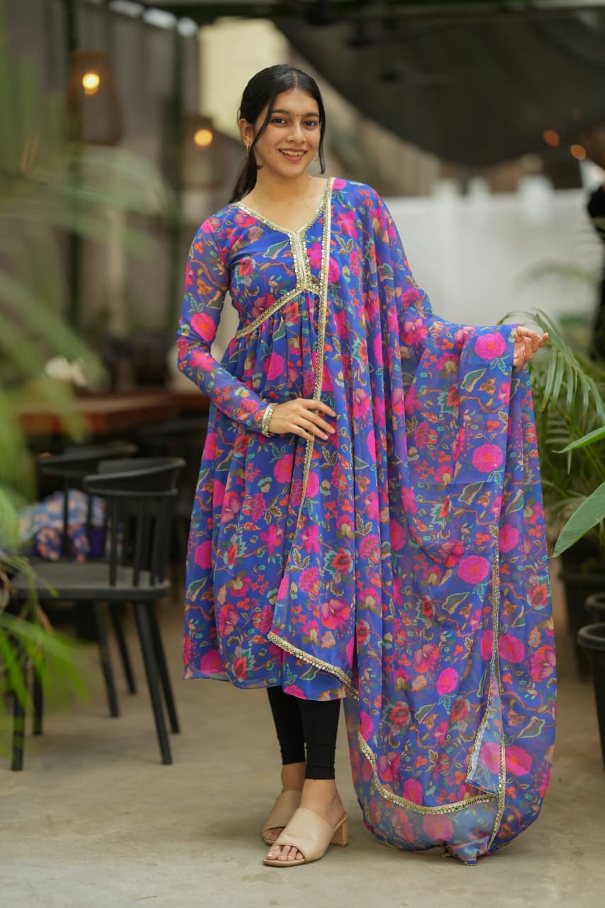 The Alia Series is a graceful blend of elegance and contemporary ethnic style. Crafted from soft georgette fabric, this outfit features a beautifully printed floral kurti paired with a matching dupatta that flows effortlessly, creating a light and feminine silhouette. The vibrant floral patterns over the rich base color add a refreshing charm, making this ensemble perfect for both festive and casual traditional looks.