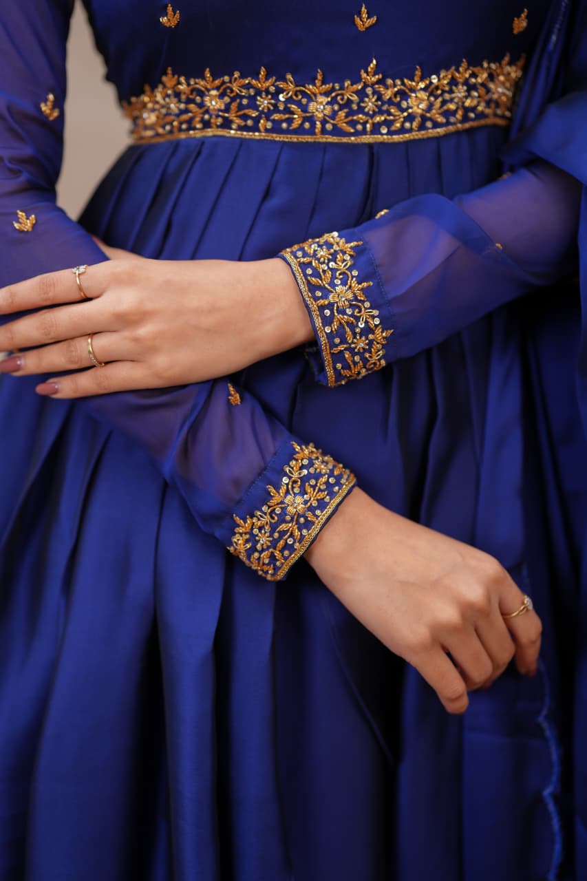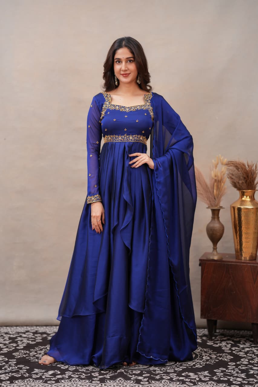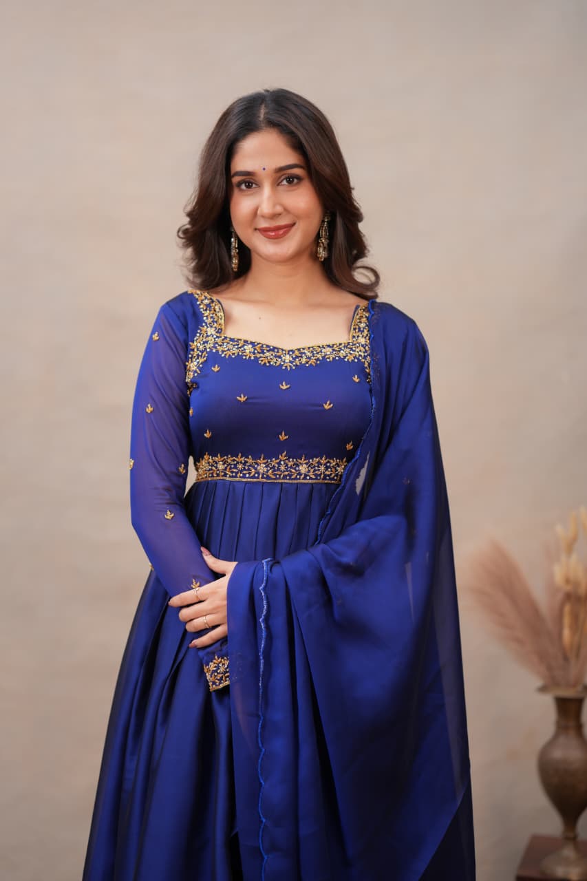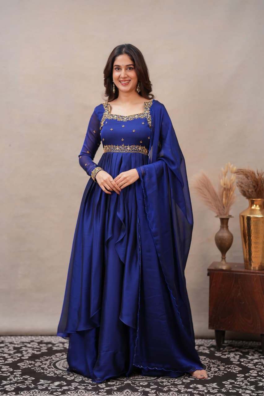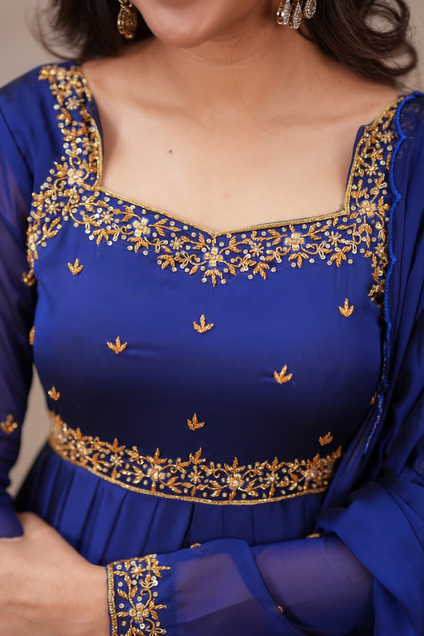 Fabric: Shiny Georgette with Hand Work Colour: Navy Blue Sleeves: Full Dress Type: Slit Top & Skirt Length: Full Number of Items: 3 (Top, Skirt & Dupatta)