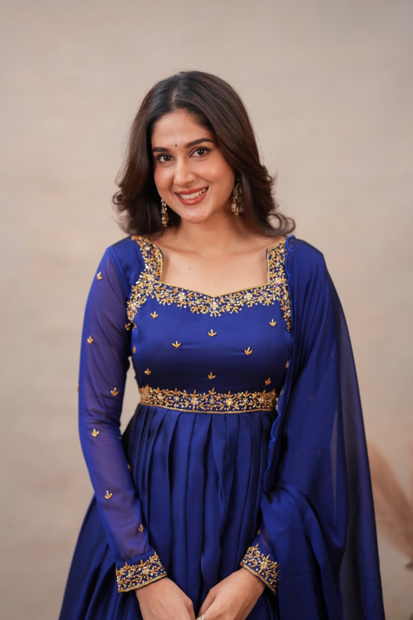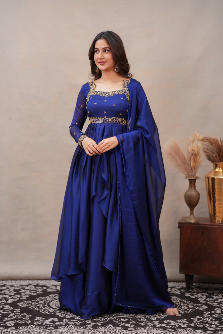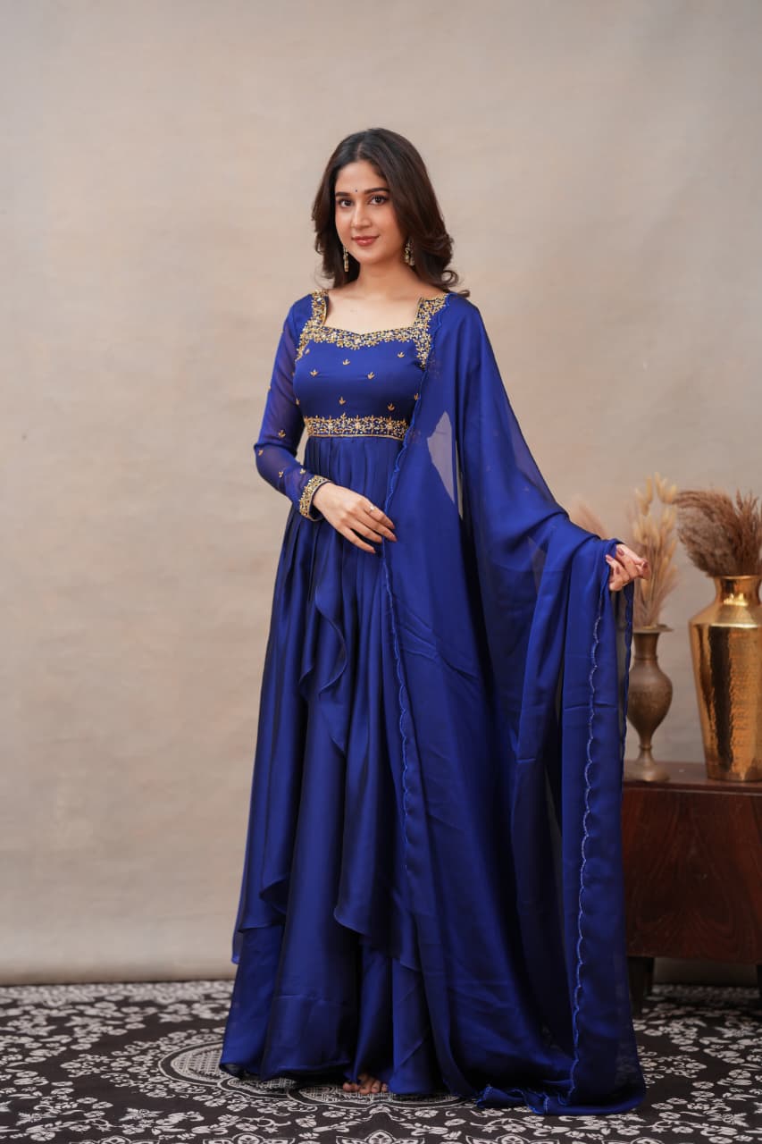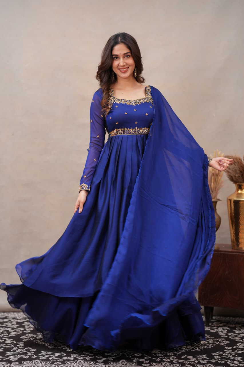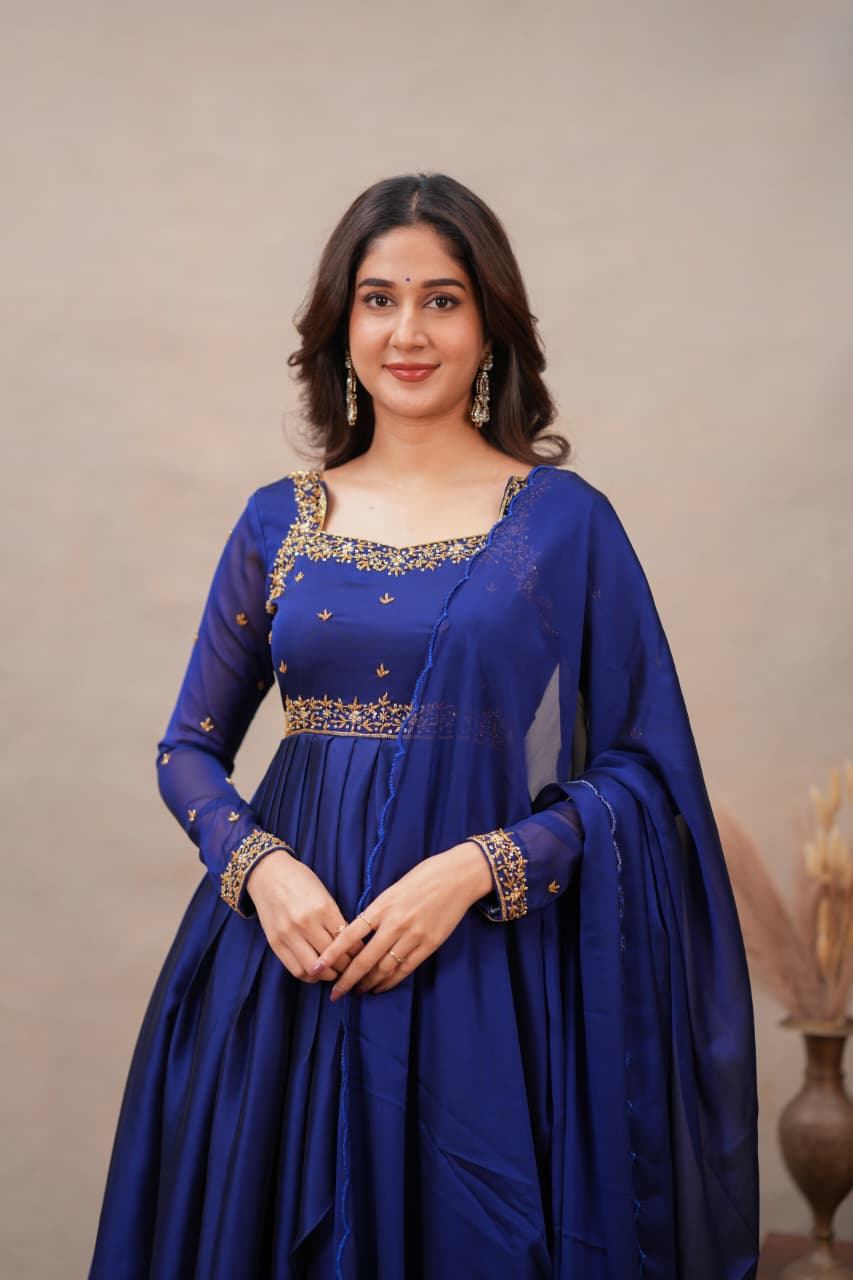 Fabric: Shiny Georgette with Hand Work Colour: Navy Blue Sleeves: Full Dress Type: Slit Top & Skirt Length: Full Number of Items: 3 (Top, Skirt & Dupatta)
