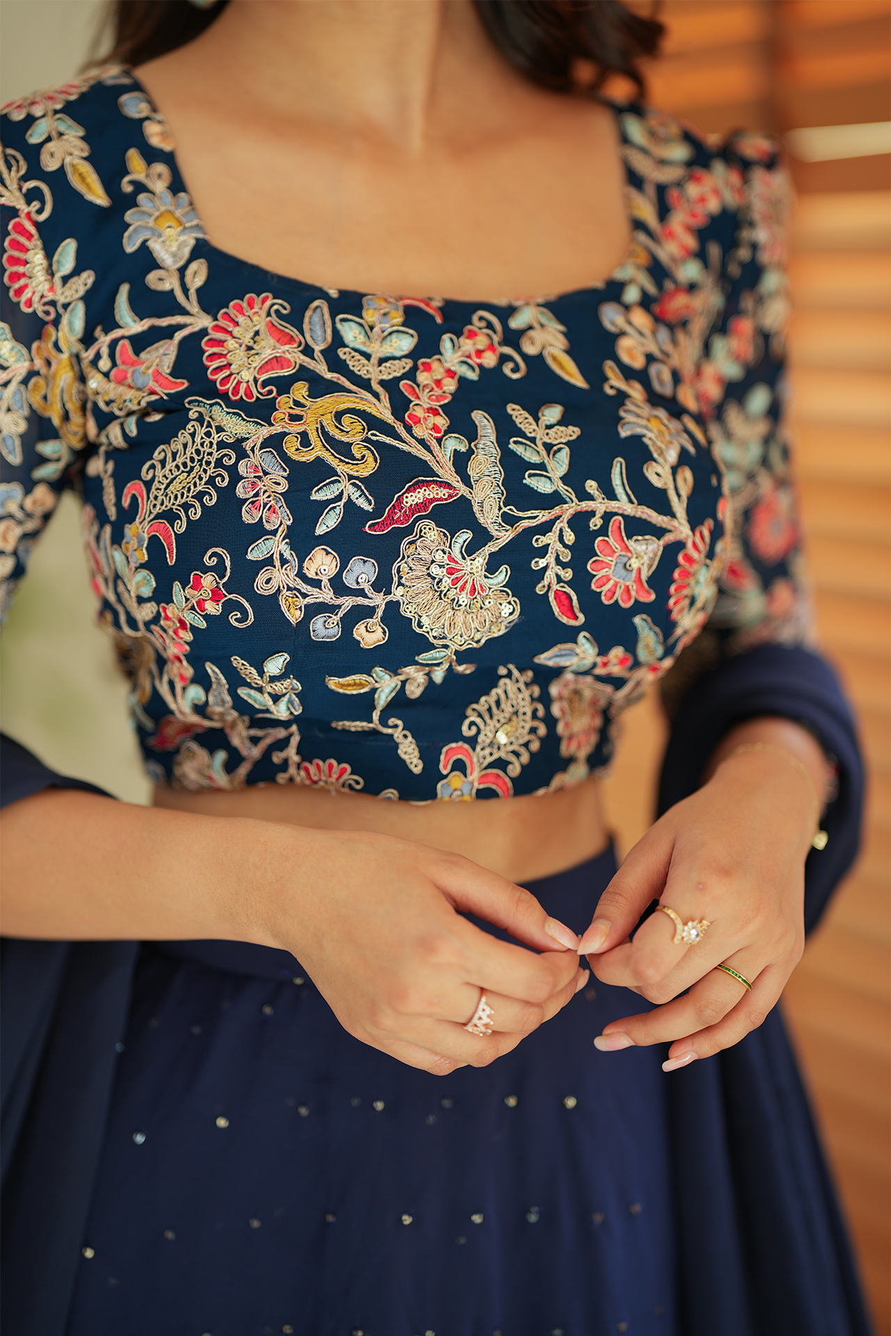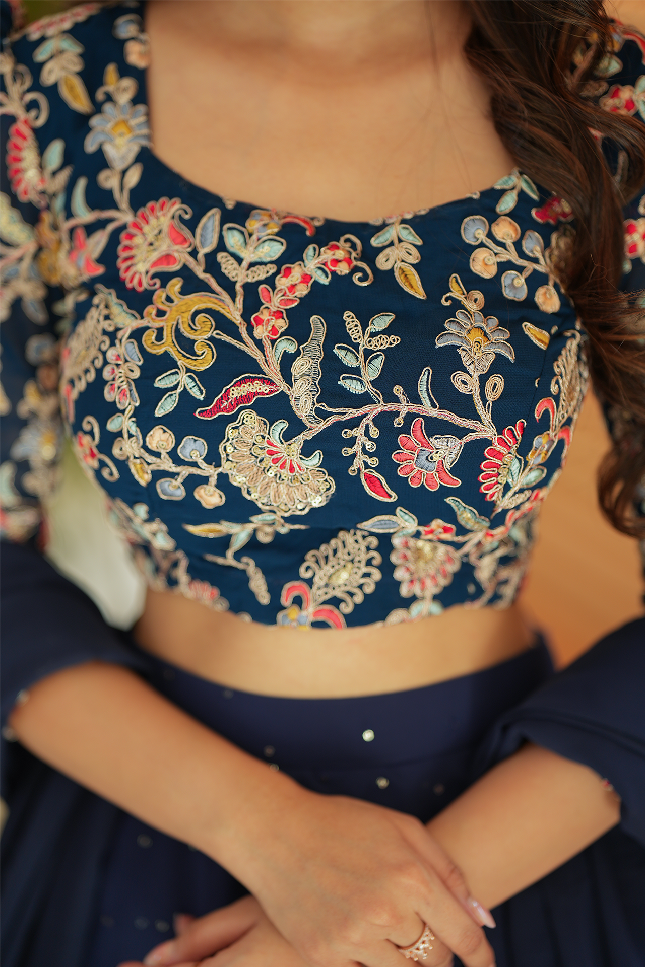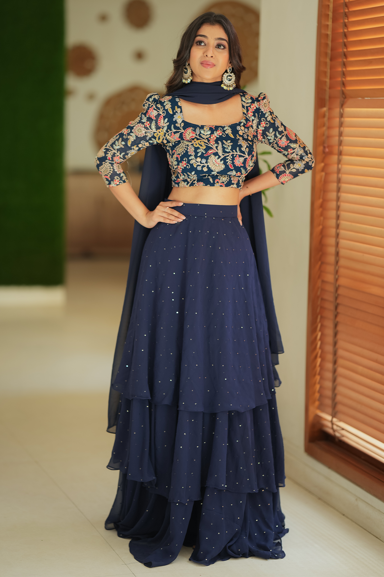 Fabric: Navy blue embroidery yoke with multi color flowers and sequence skirt with triple layer