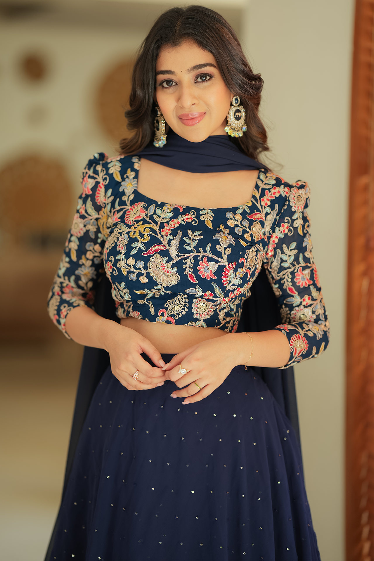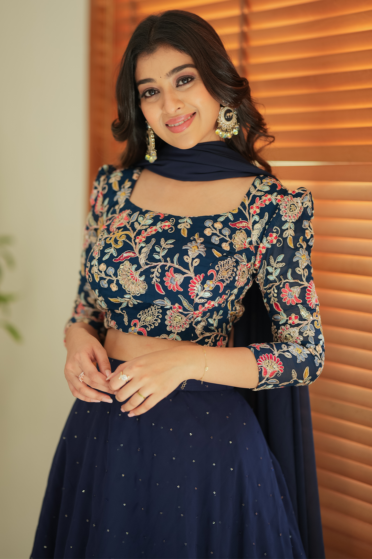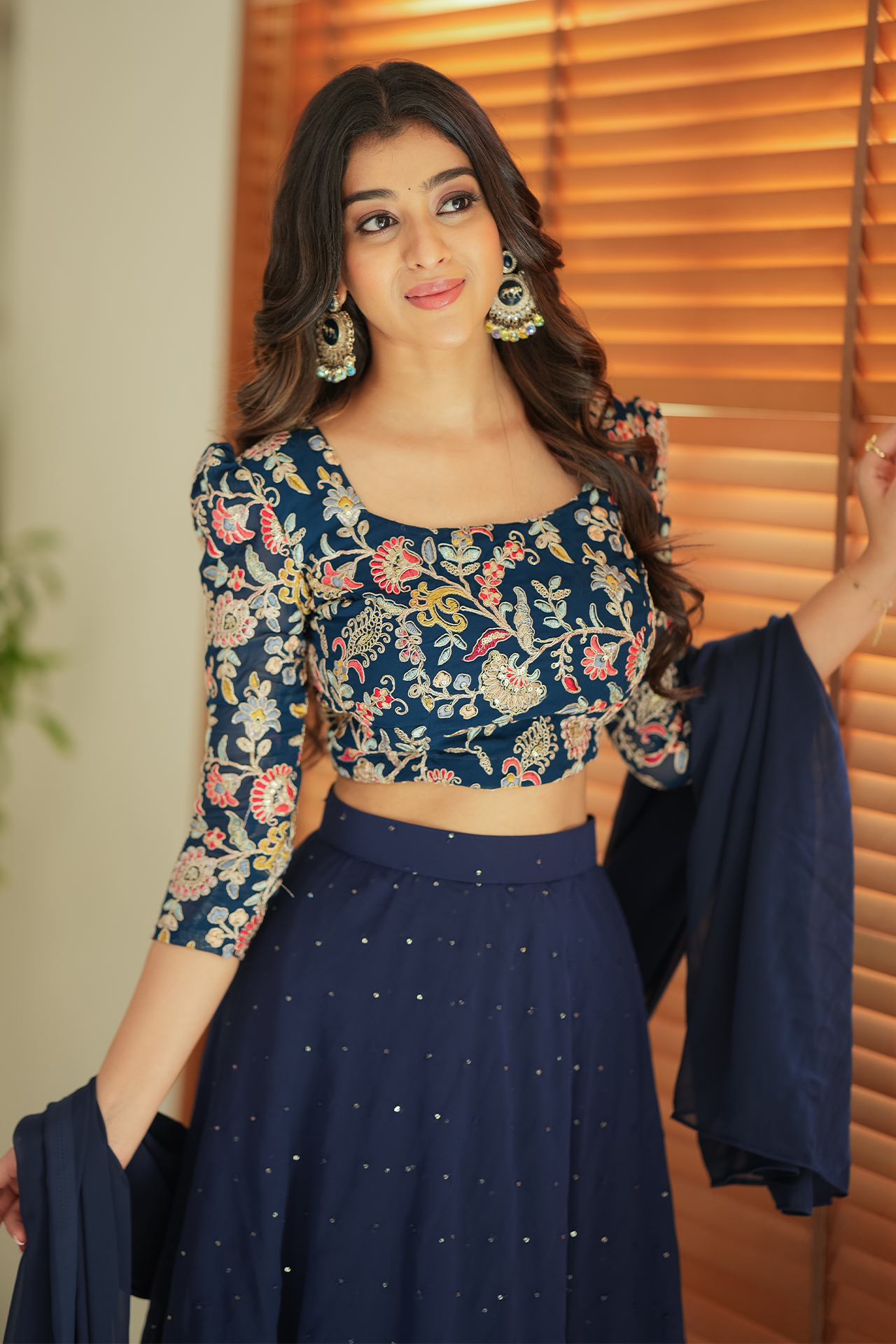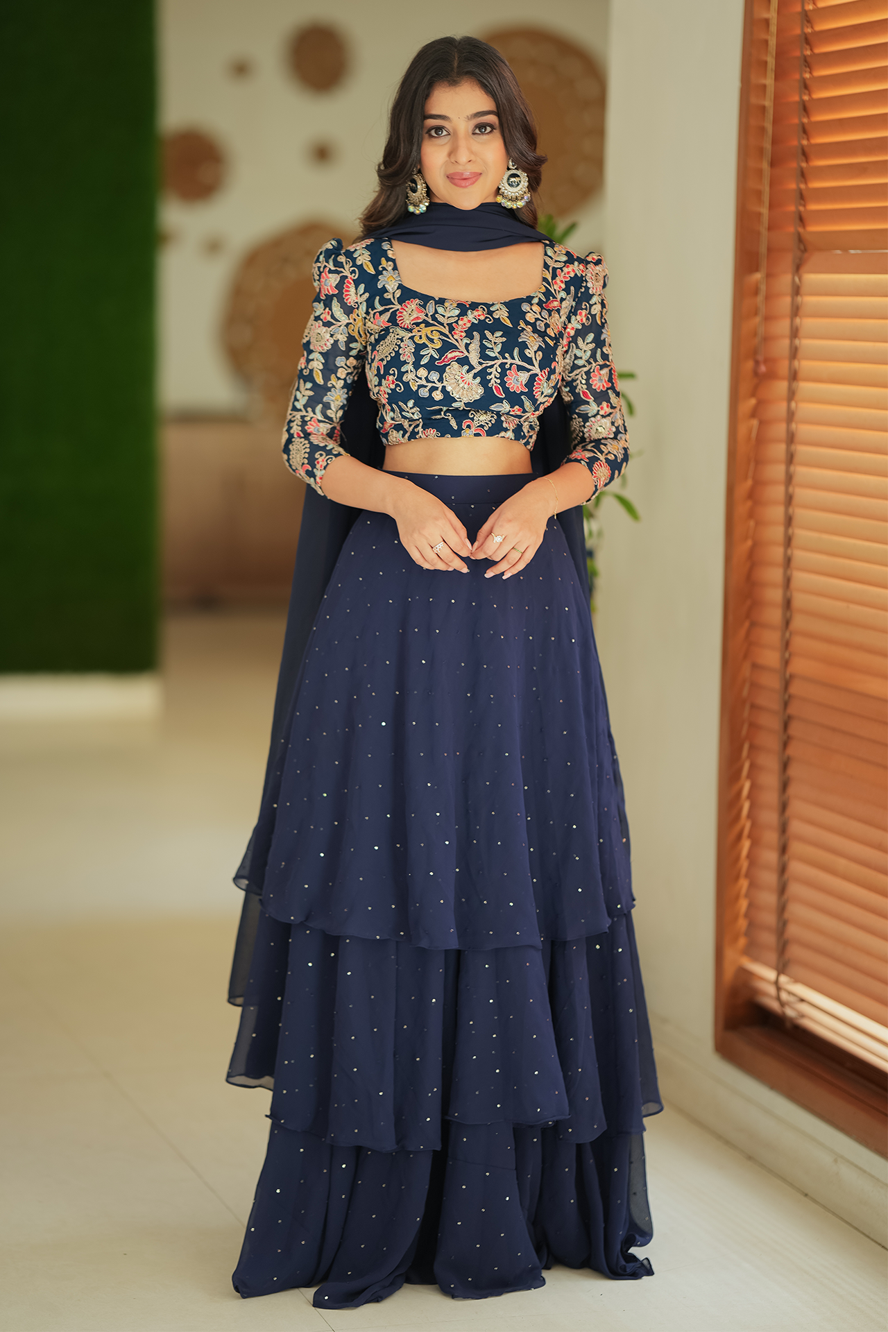Fabric: Navy blue embroidery yoke with multi color flowers and sequence skirt with triple layer
