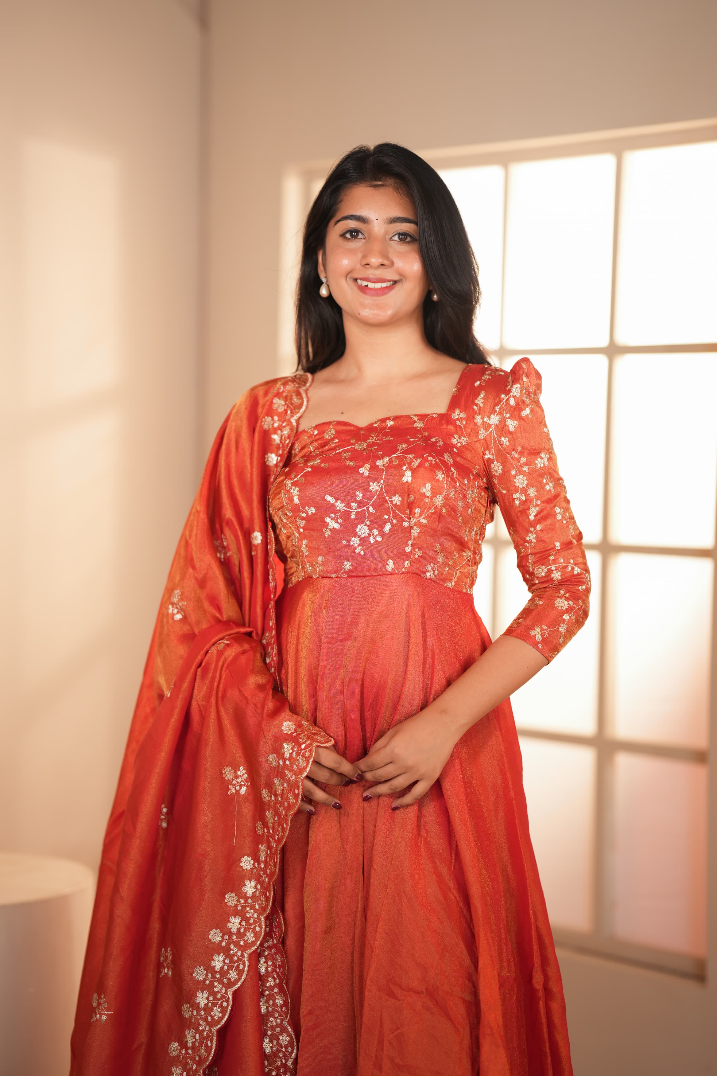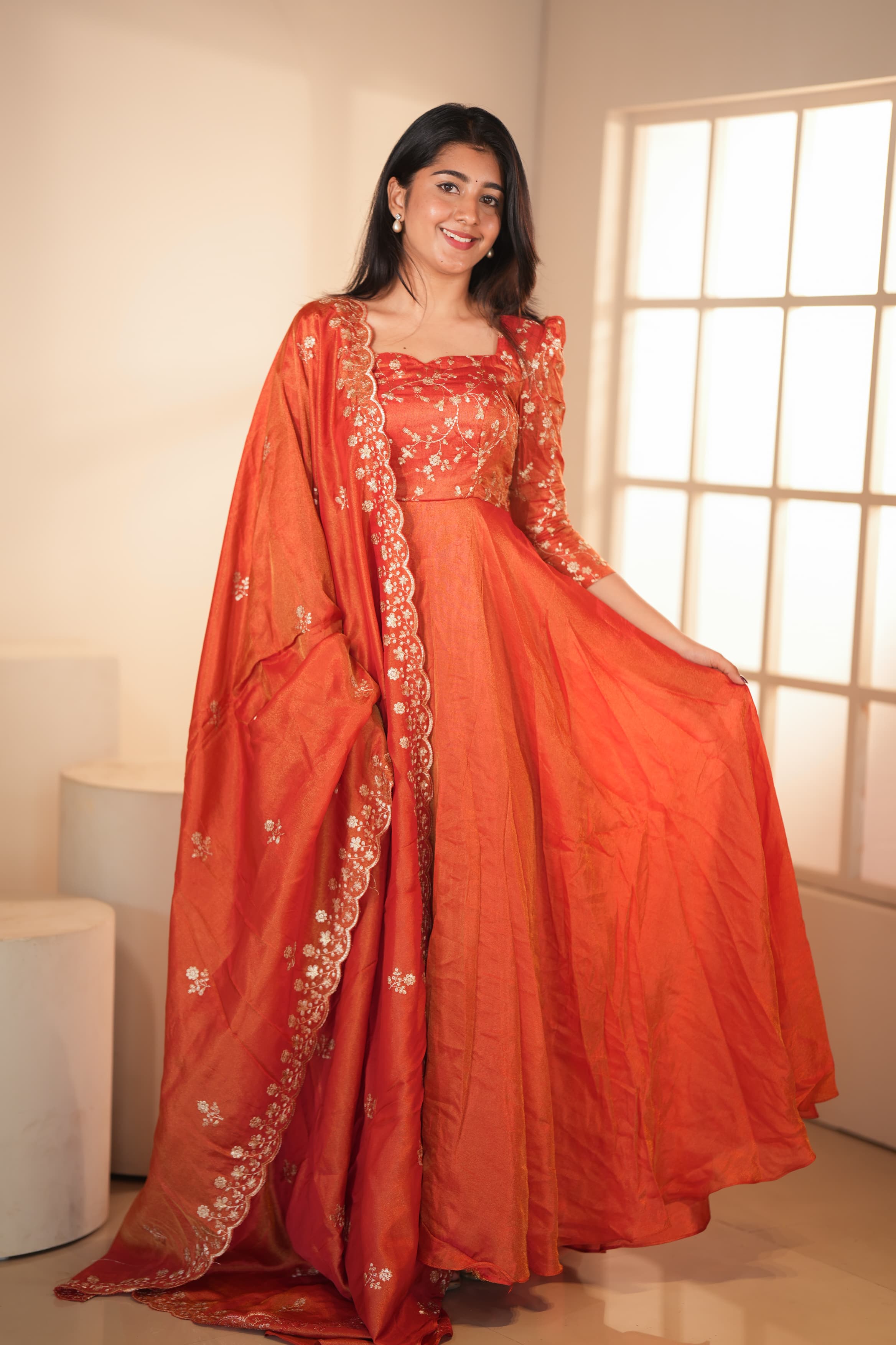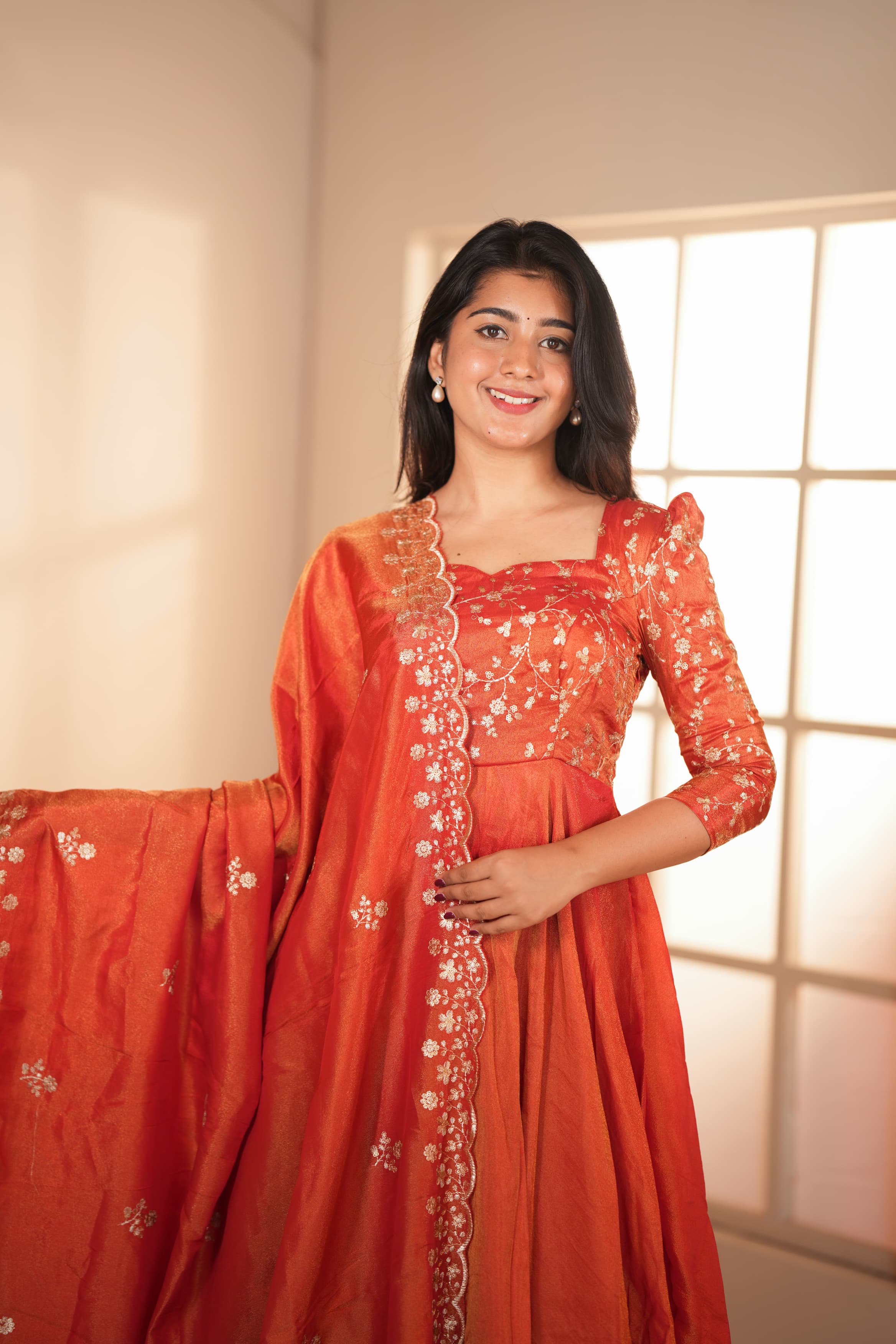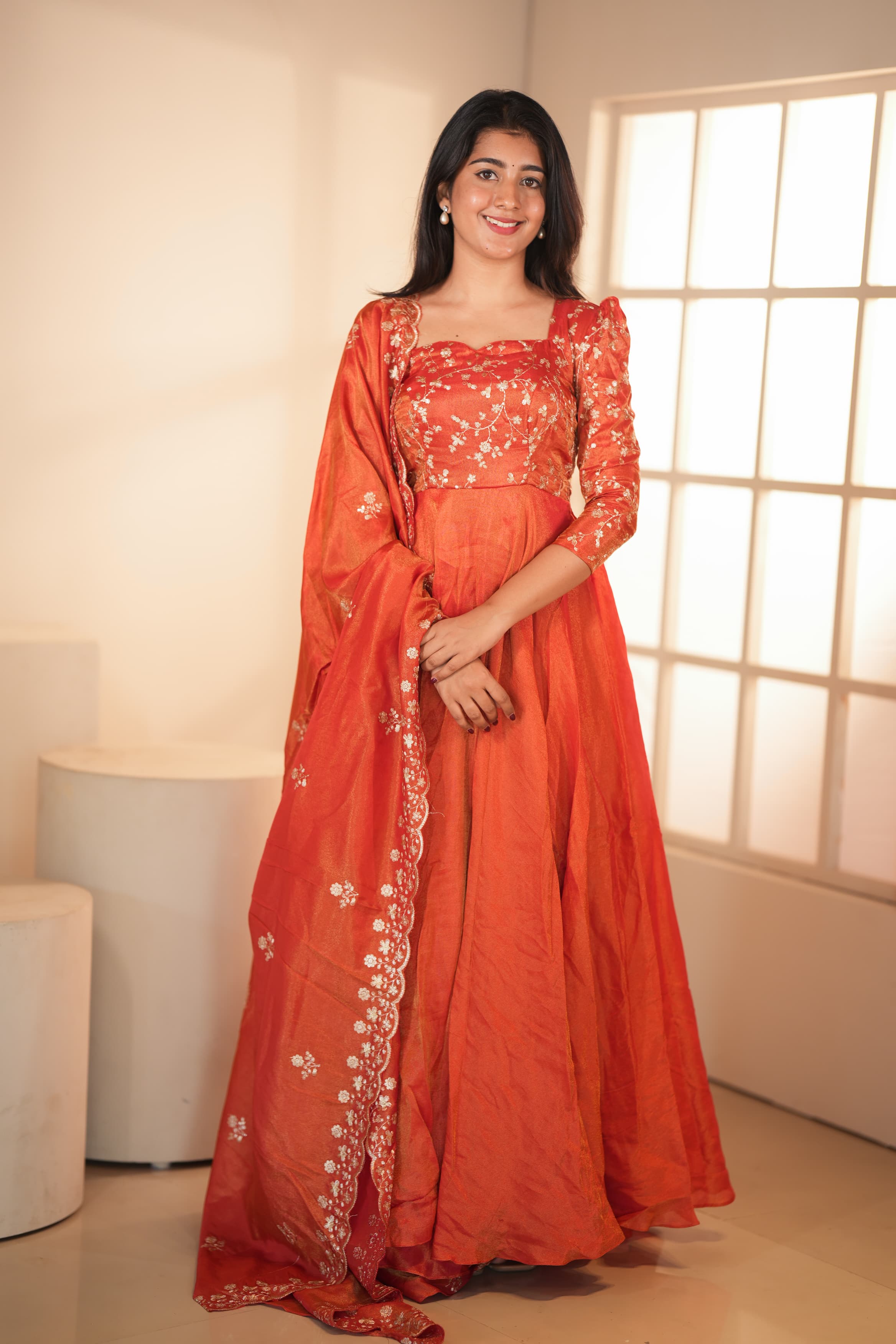 Style Tip: Pair this masterpiece with statement earrings and a sleek hairstyle to let the dress do all the talking! The zari tissue dupatta, with delicate embroidery, completes the ensemble, adding just the right amount of grandeur.
