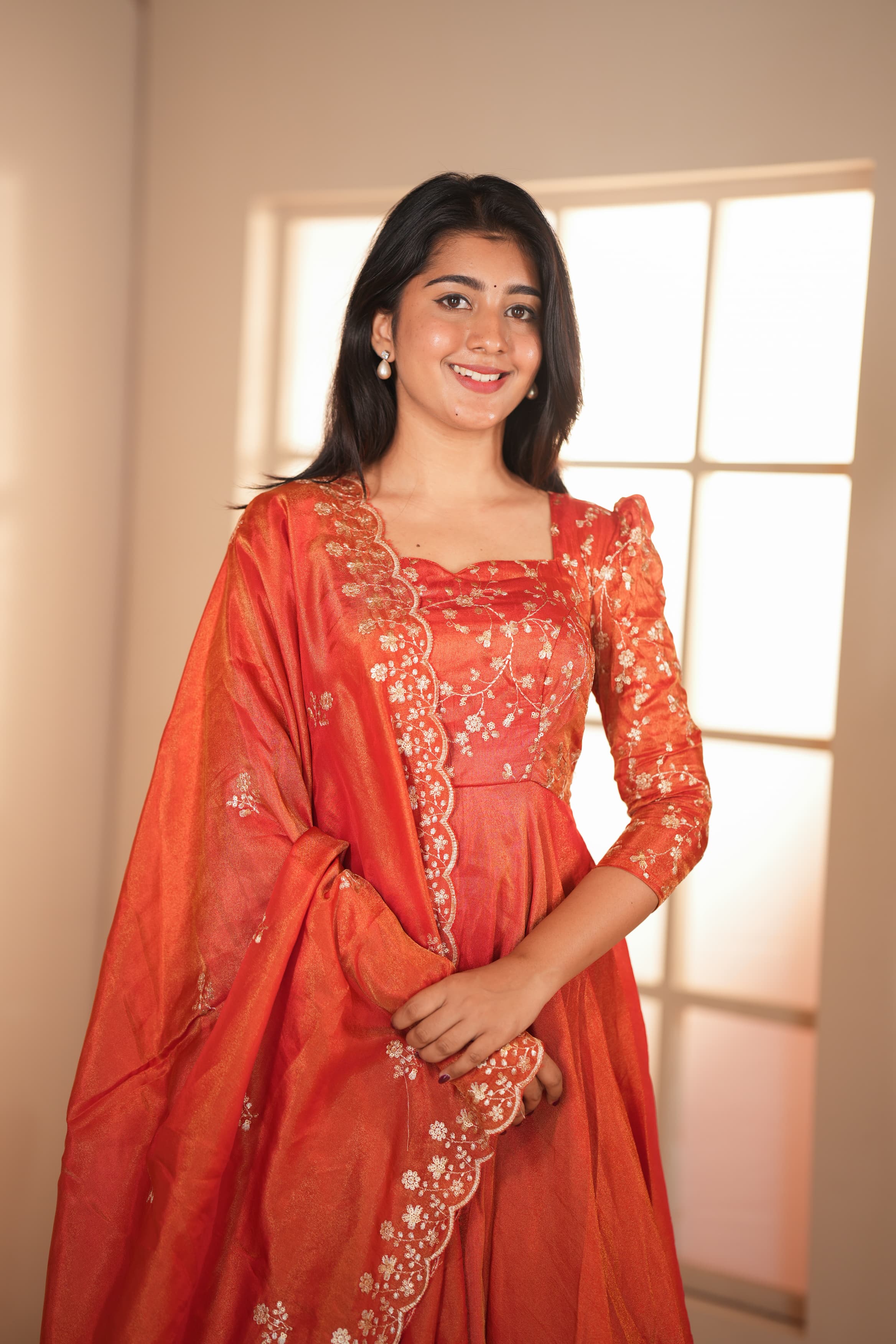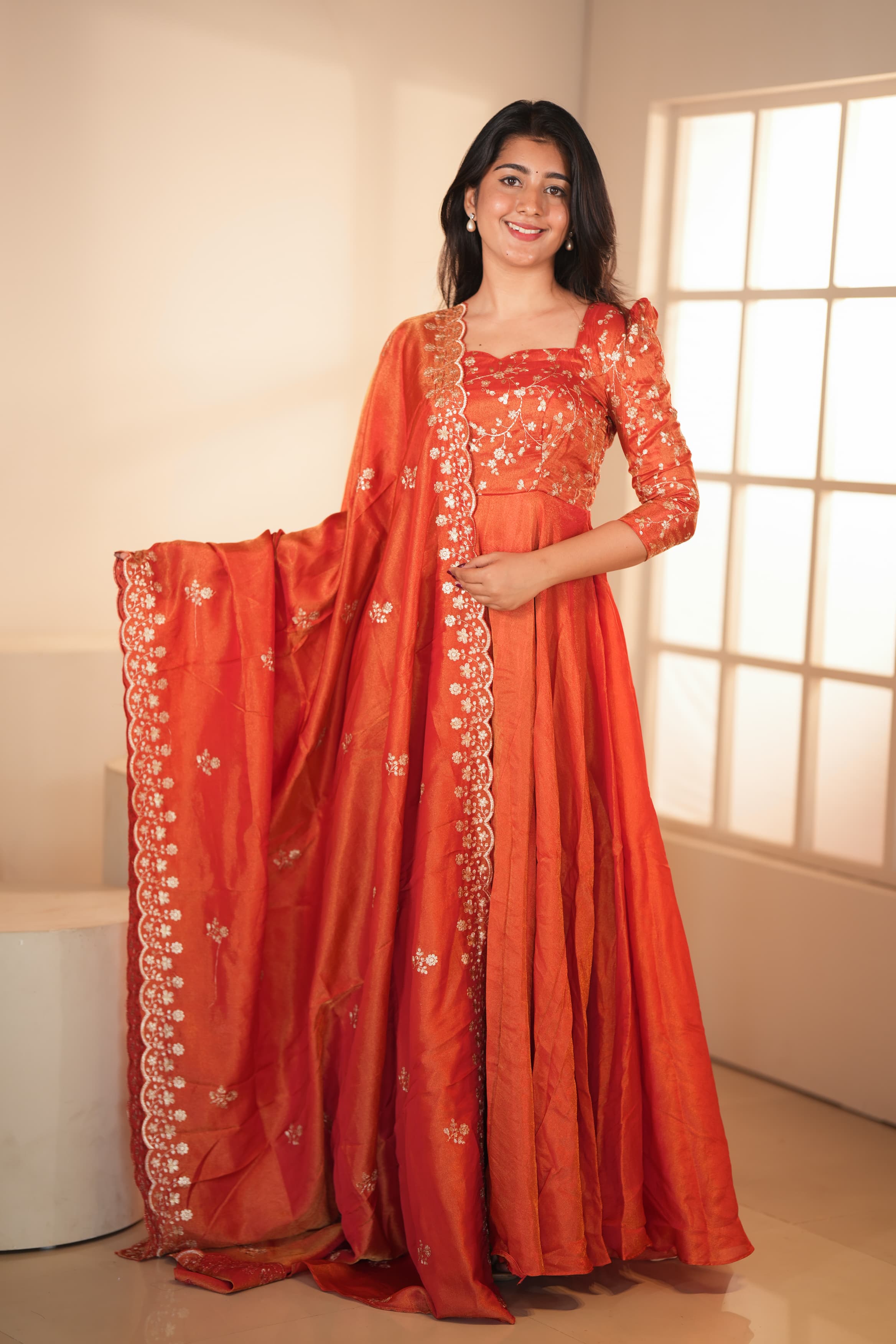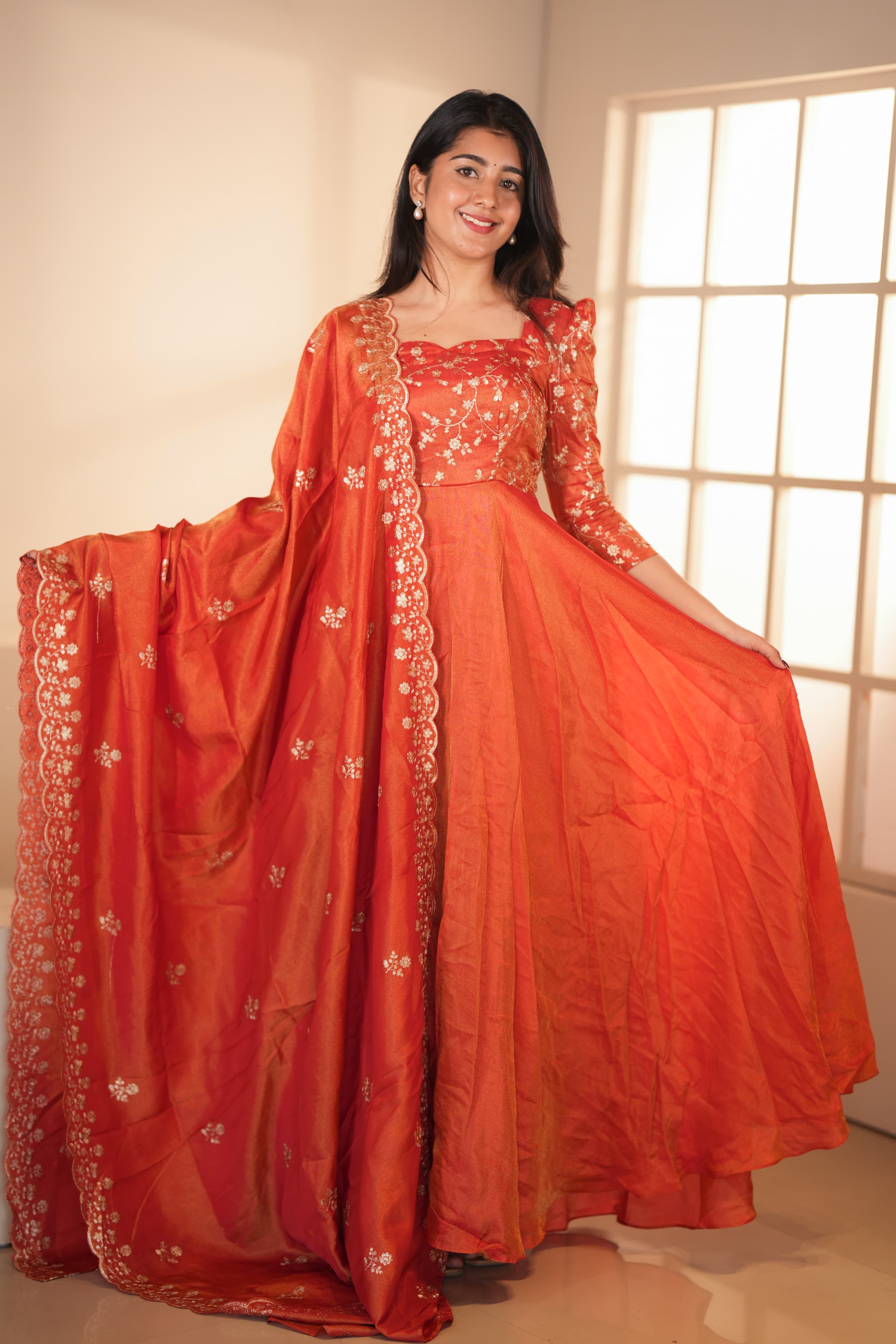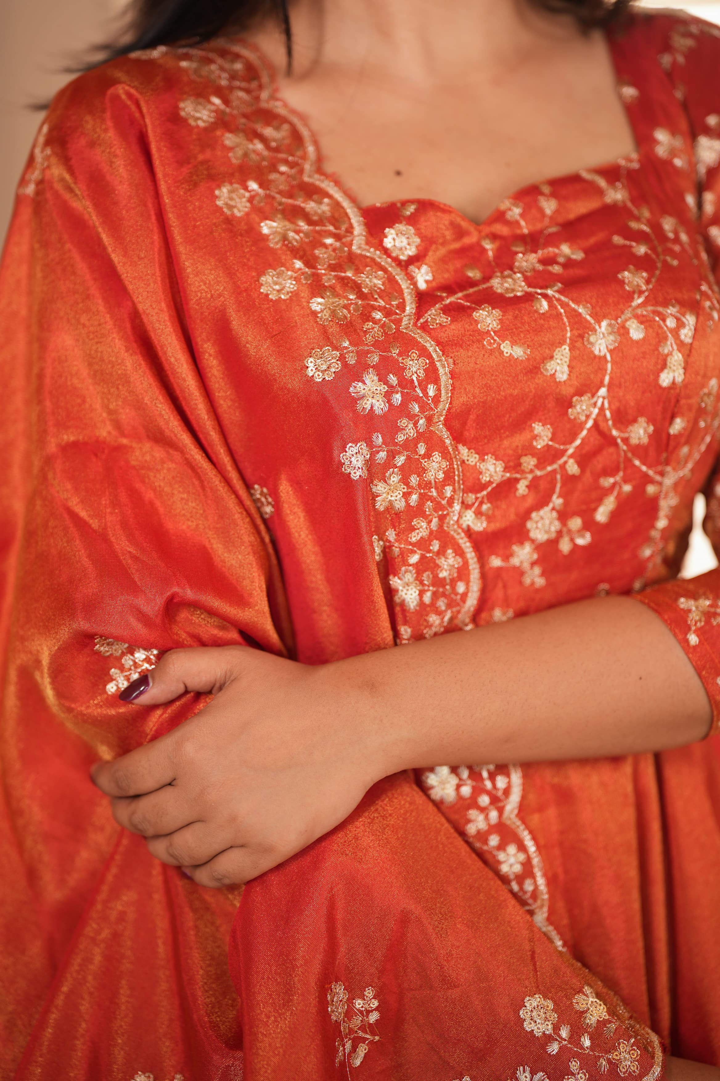 Style Tip: Pair this masterpiece with statement earrings and a sleek hairstyle to let the dress do all the talking! The zari tissue dupatta, with delicate embroidery, completes the ensemble, adding just the right amount of grandeur.