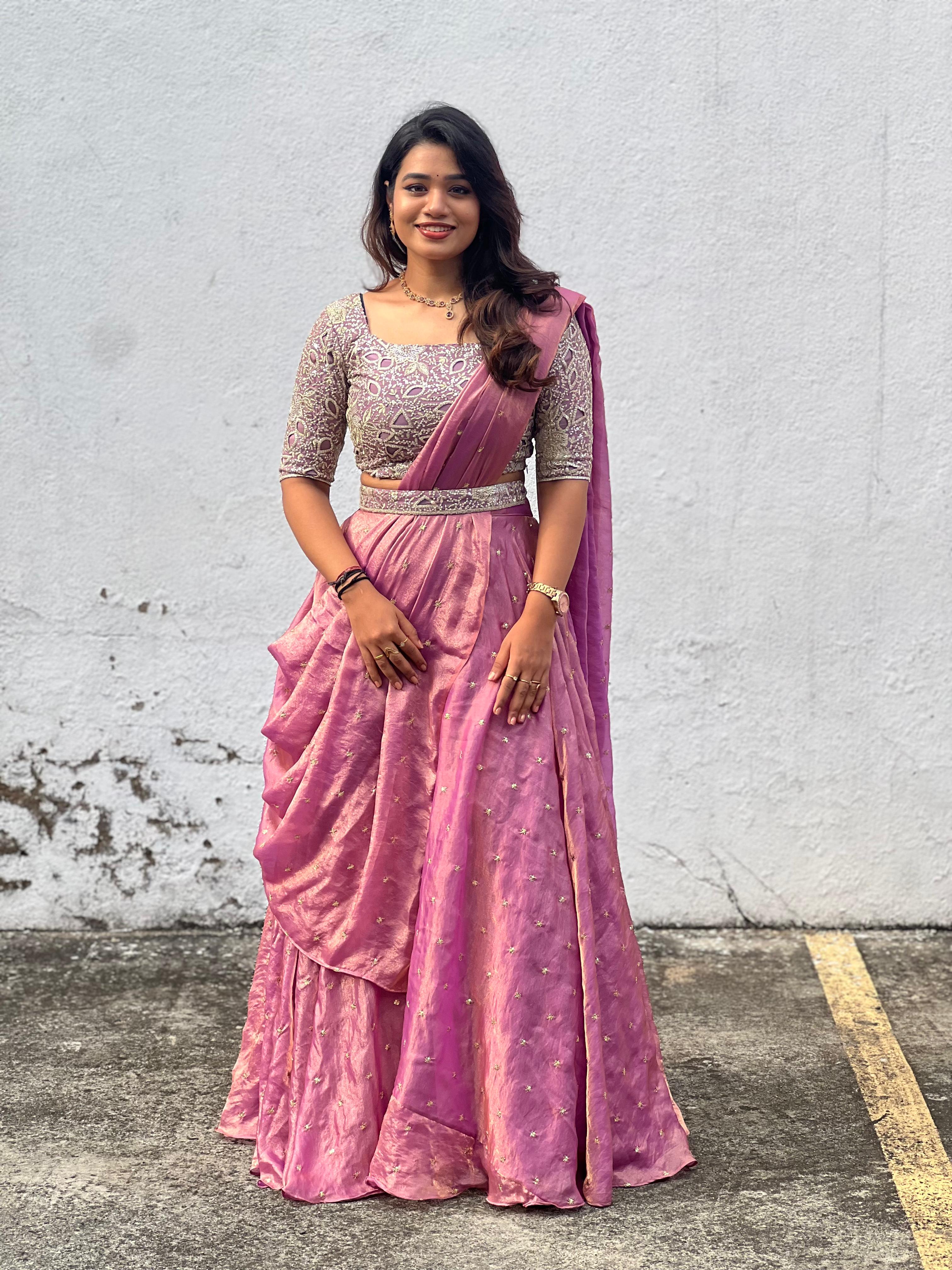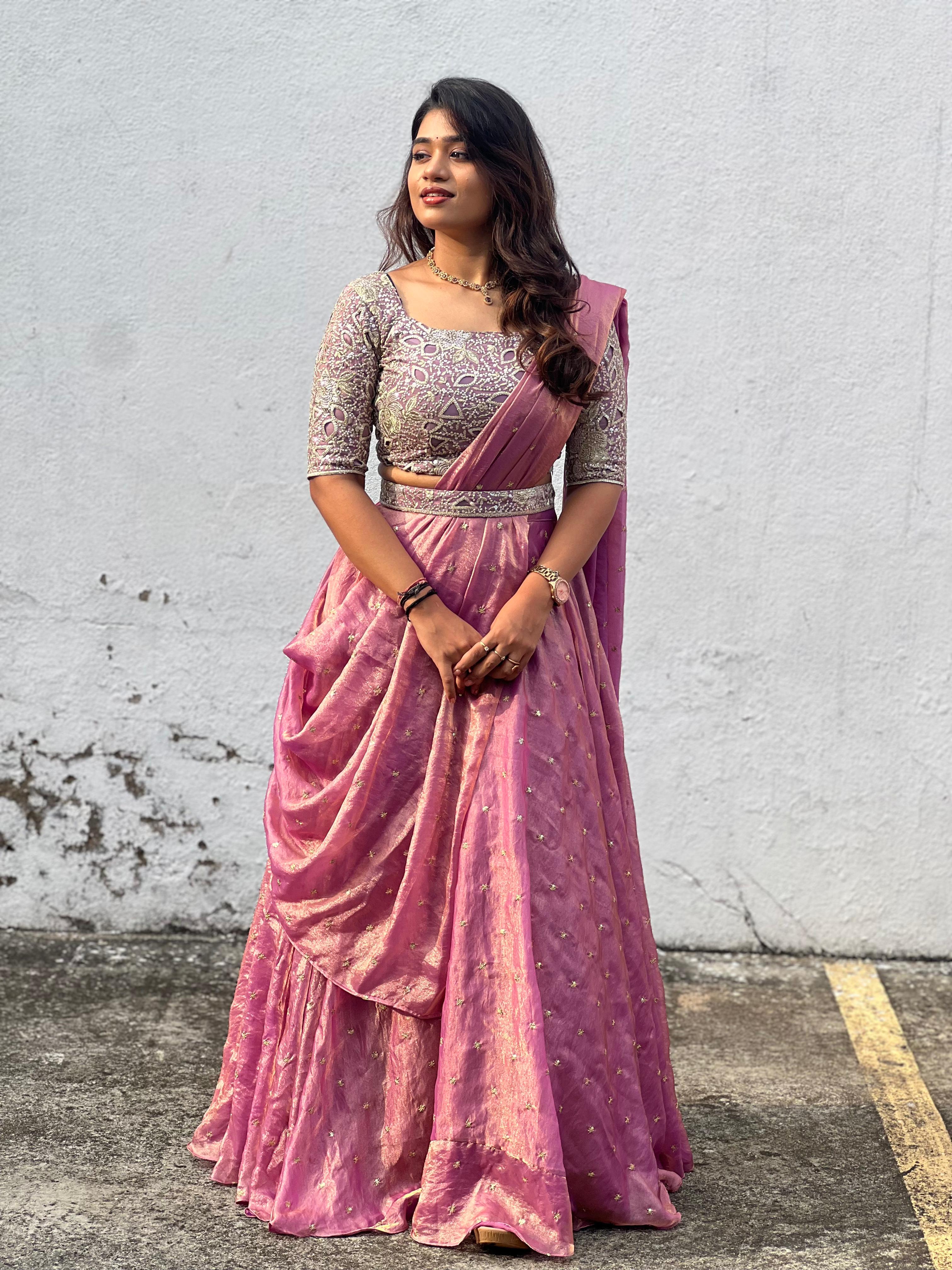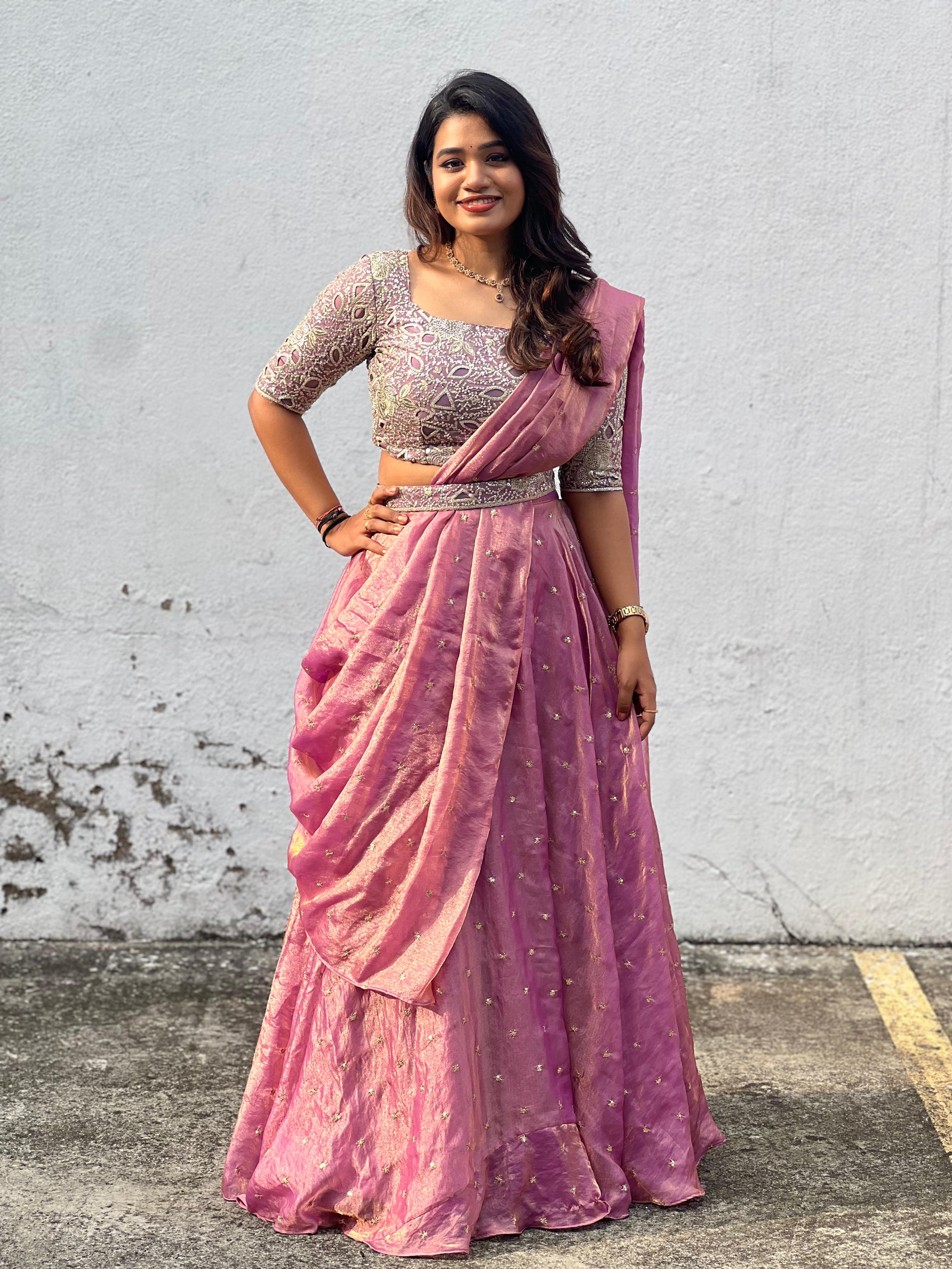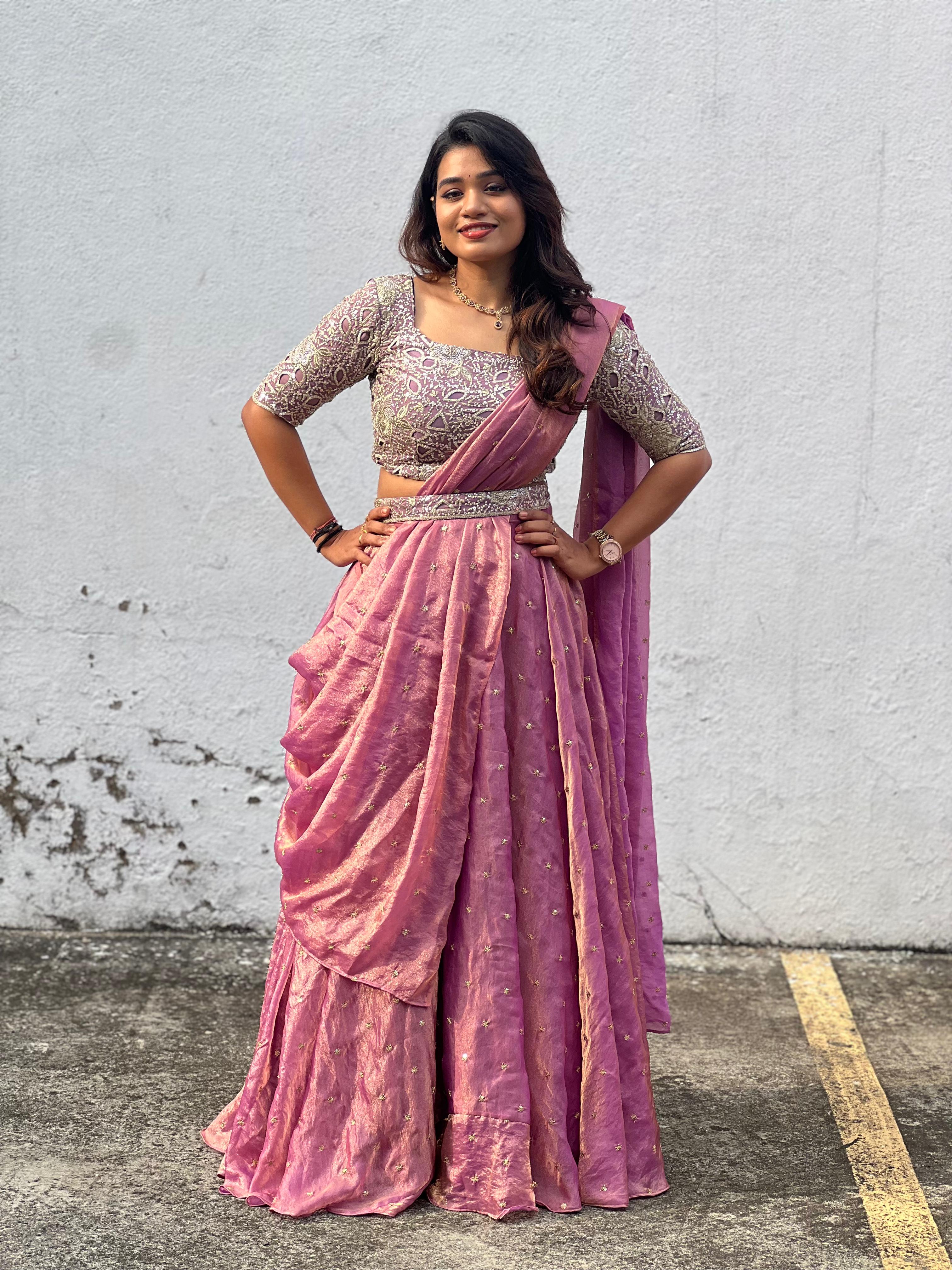 Experience elegance redefined with our exquisite Naveena Collection! This beautiful drapewear, crafted with intricate cutwork and delicate space silk butty fabric, exudes sophistication and style. Paired with a stylish belt, it accentuates your silhouette, making it the perfect outfit for grand occasions.