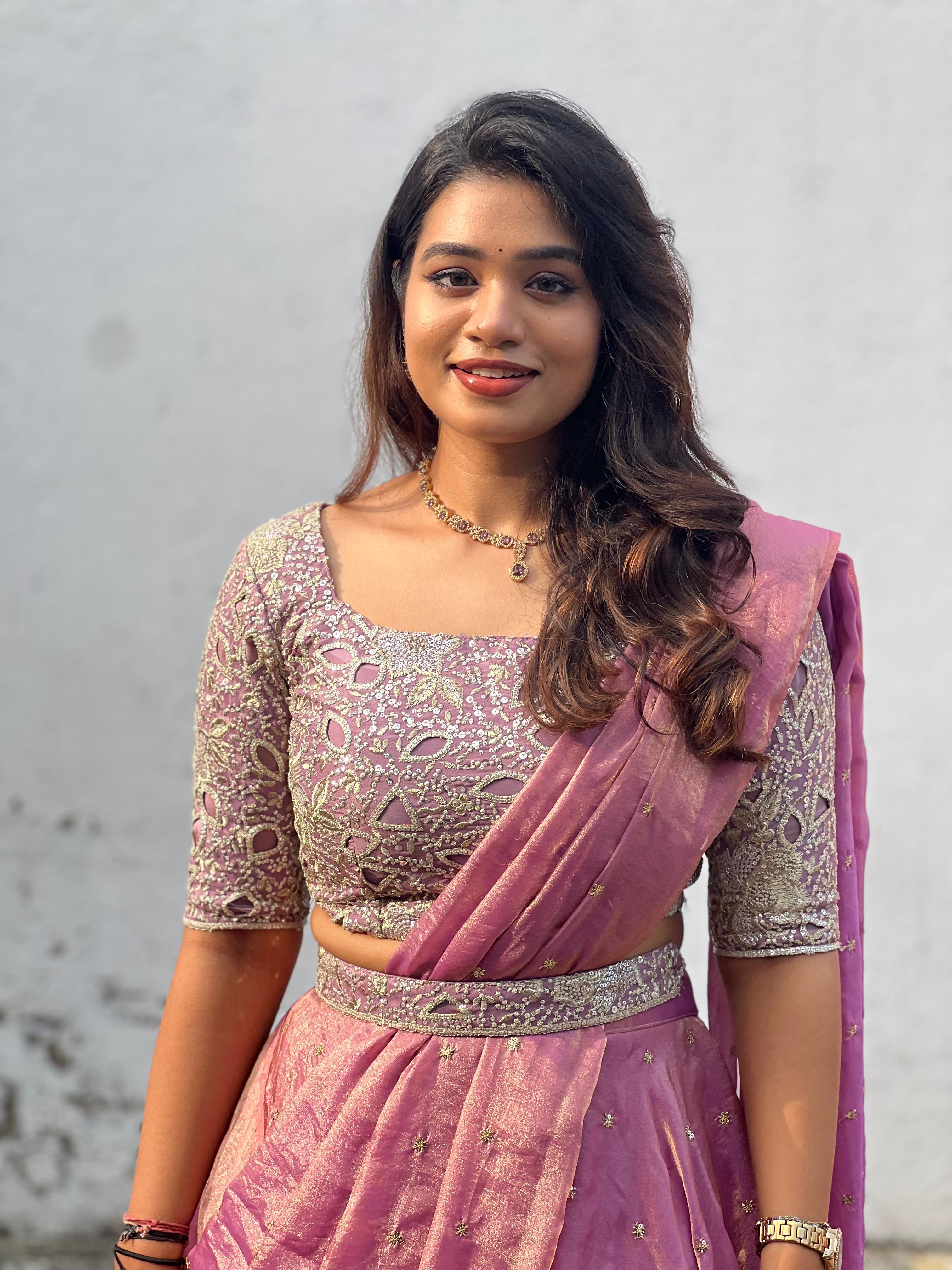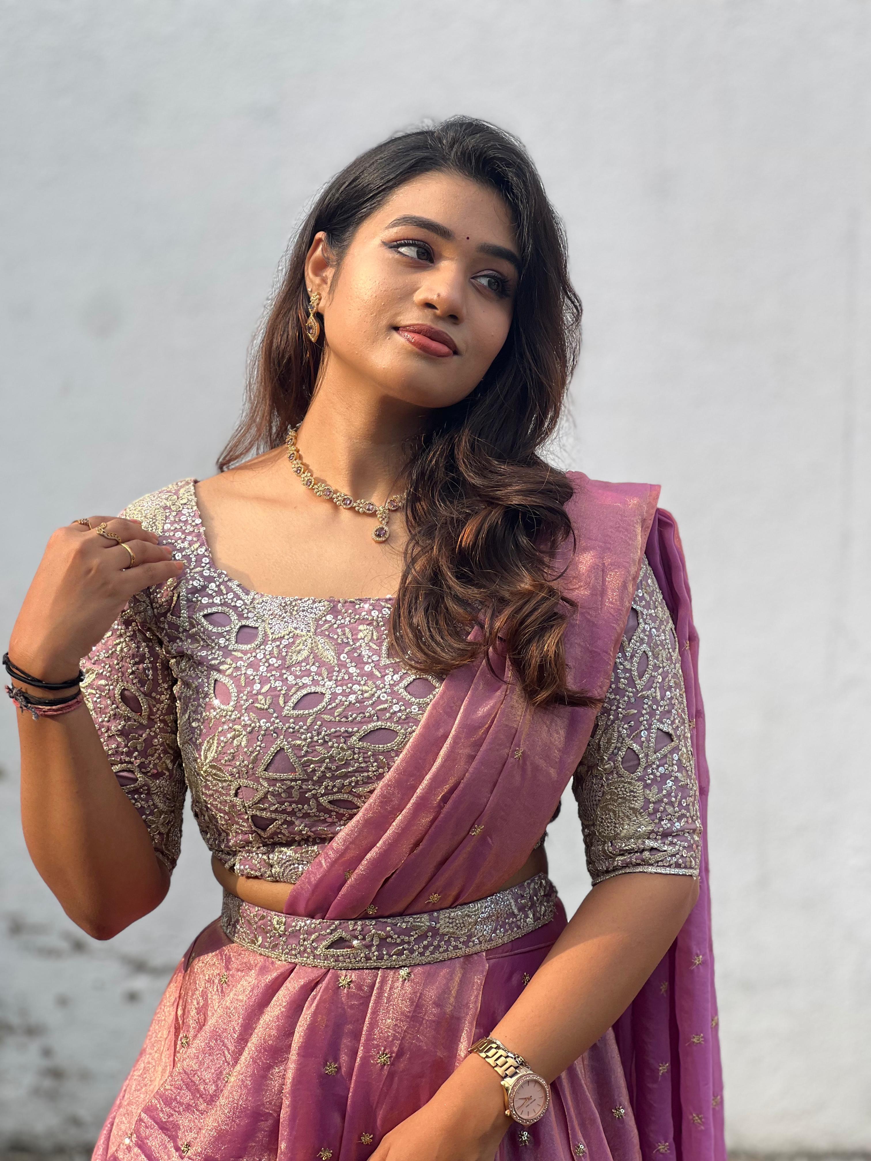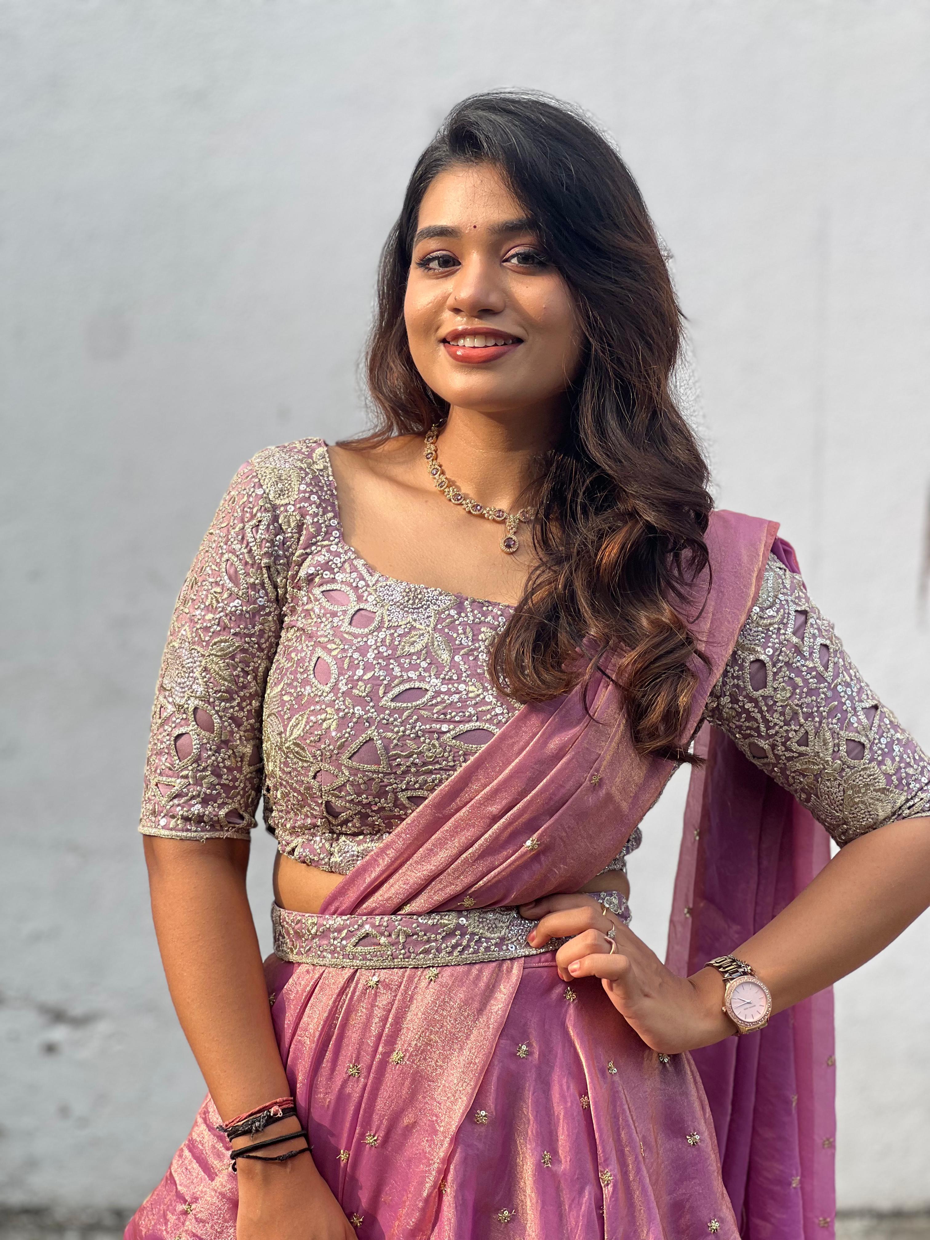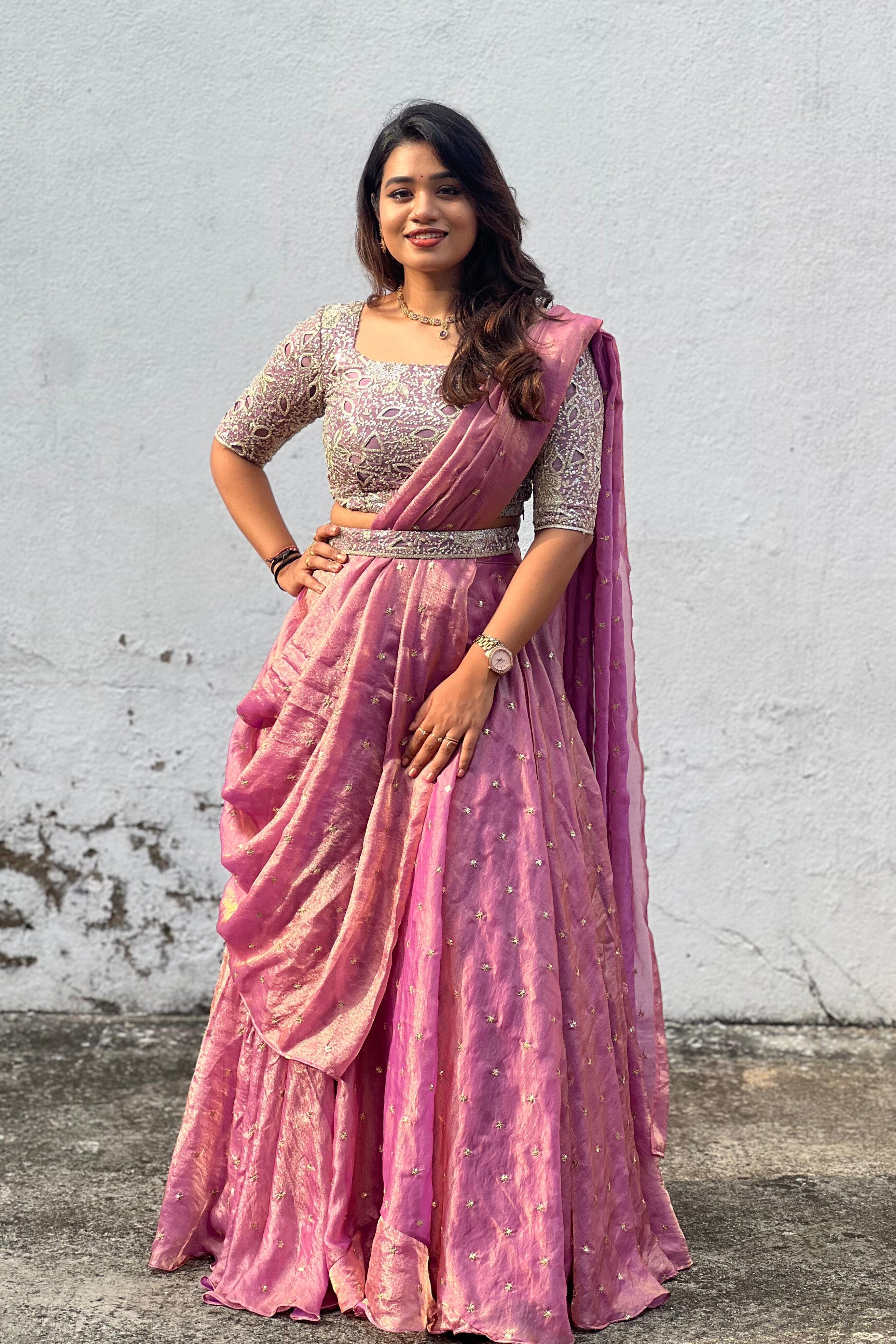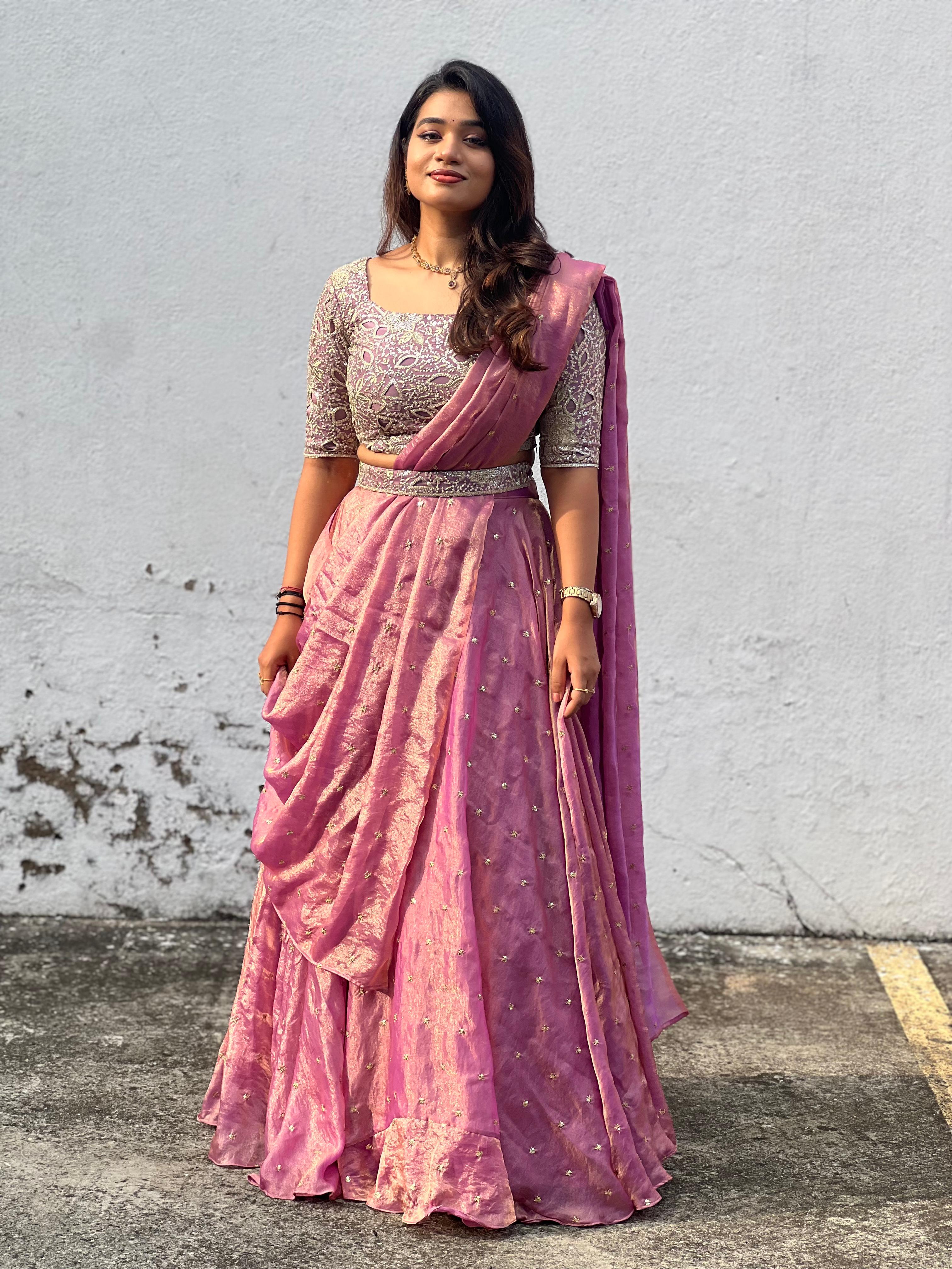 Experience elegance redefined with our exquisite Naveena Collection! This beautiful drapewear, crafted with intricate cutwork and delicate space silk butty fabric, exudes sophistication and style. Paired with a stylish belt, it accentuates your silhouette, making it the perfect outfit for grand occasions.