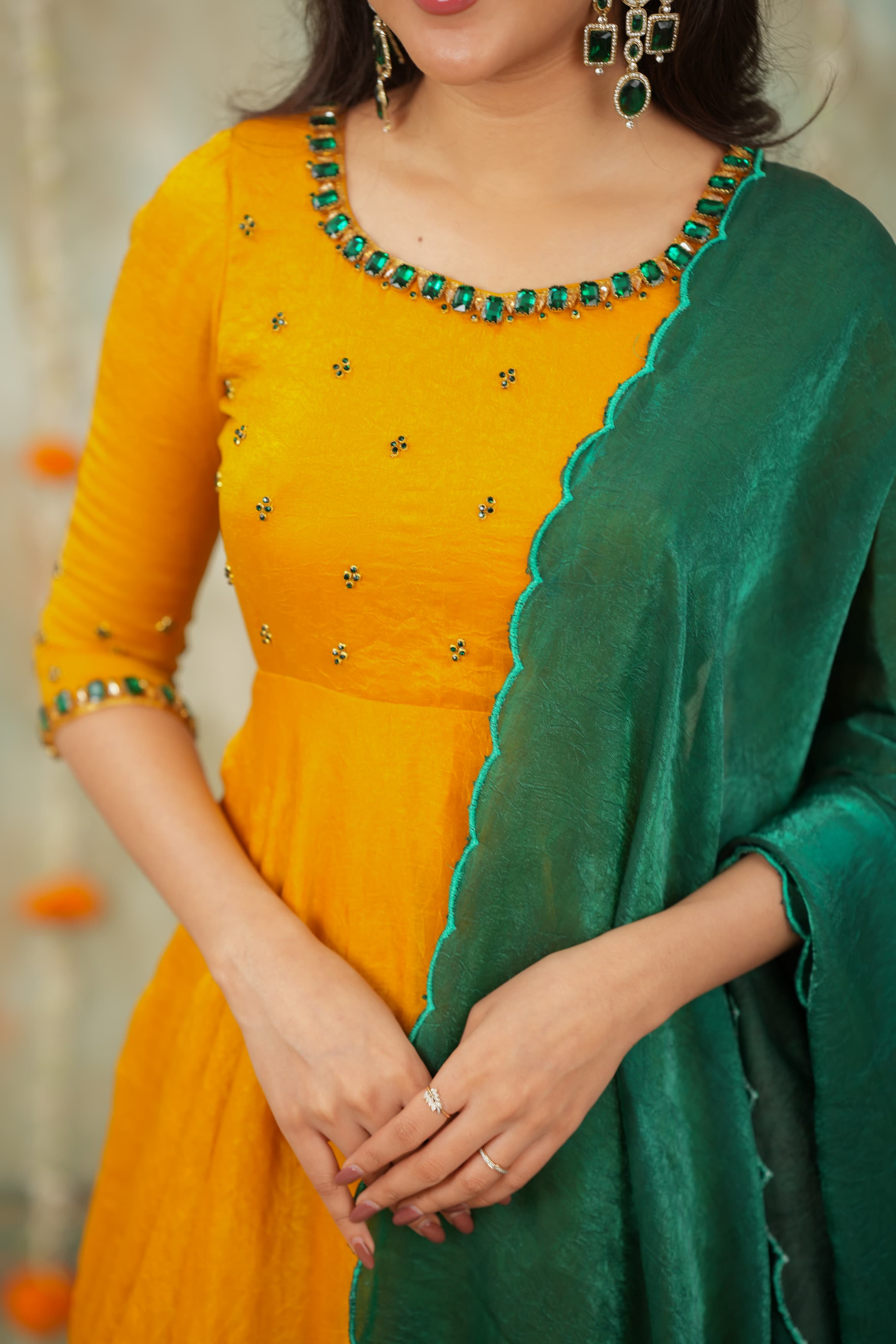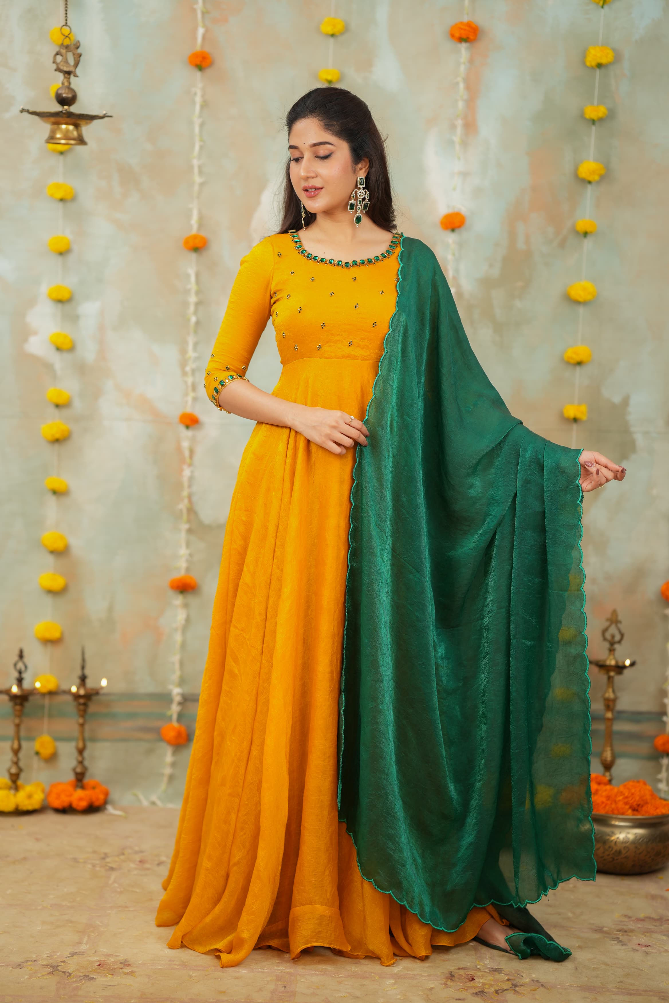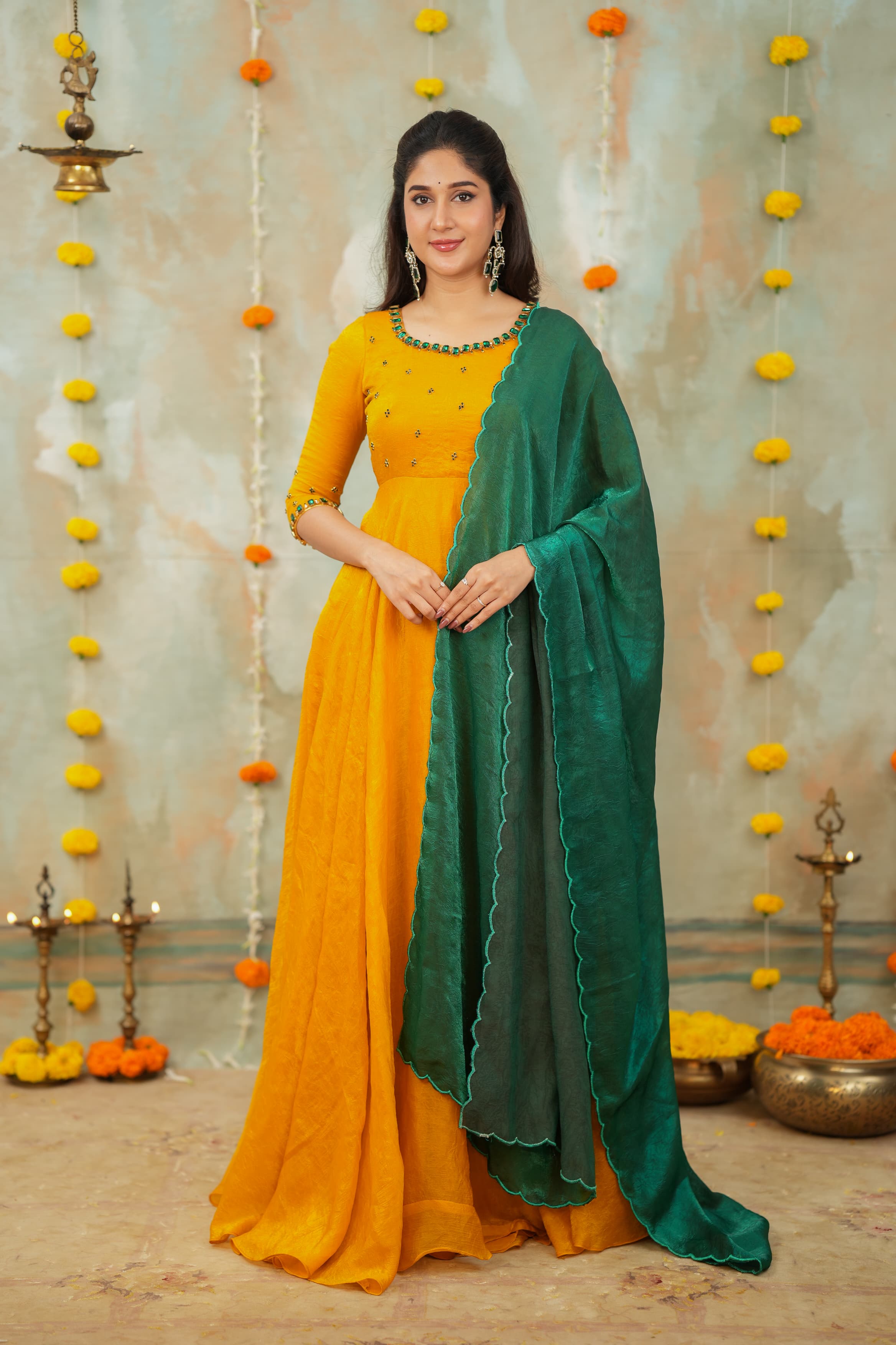 Whether attending a haldi , candlelit Diwali puja, a Mehendi celebration, or walking into a wedding event, this ensemble offers a statement of poise and elegance. The hand-crafted jewel detailing adds richness without overpowering, allowing you to shine with minimal accessories.