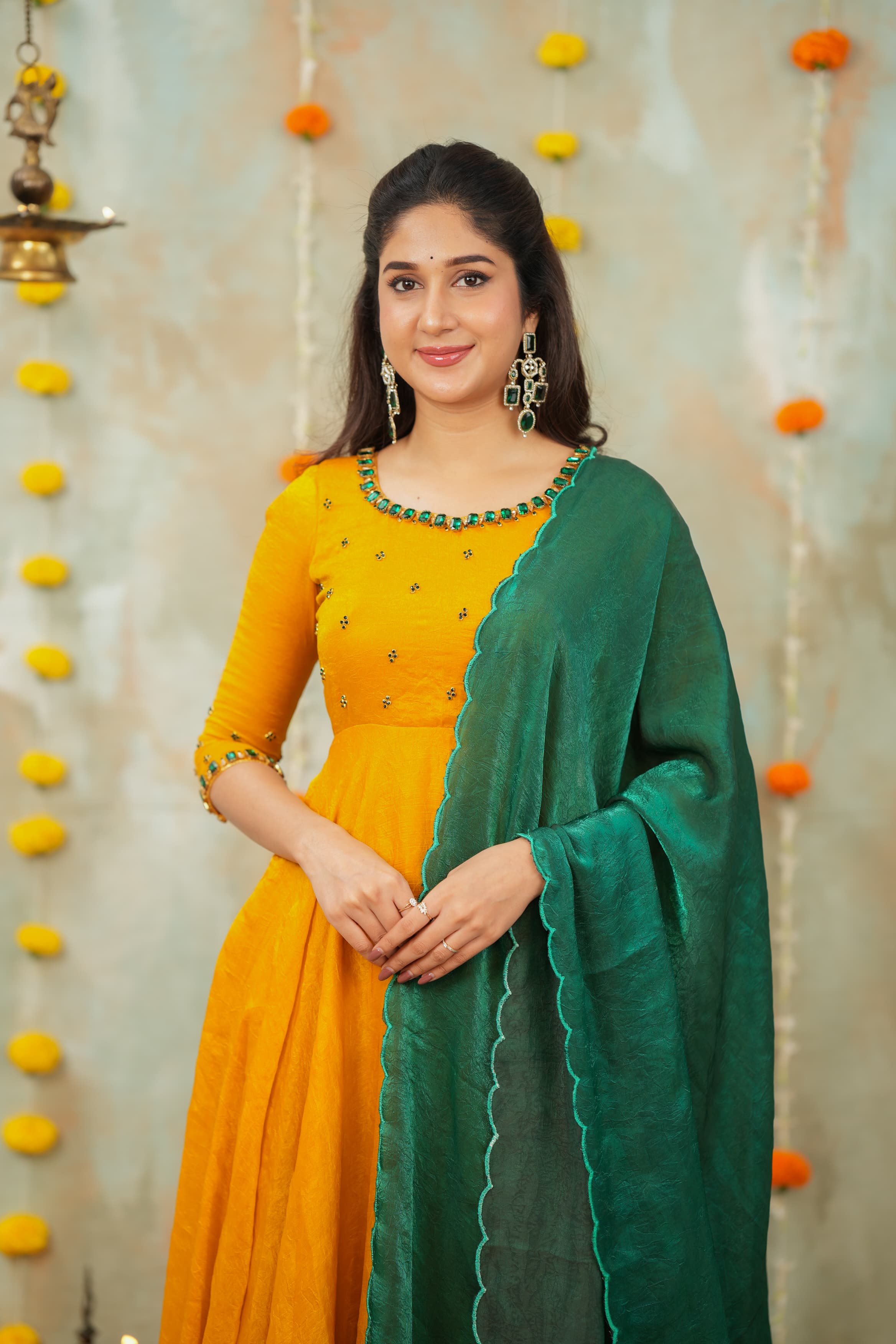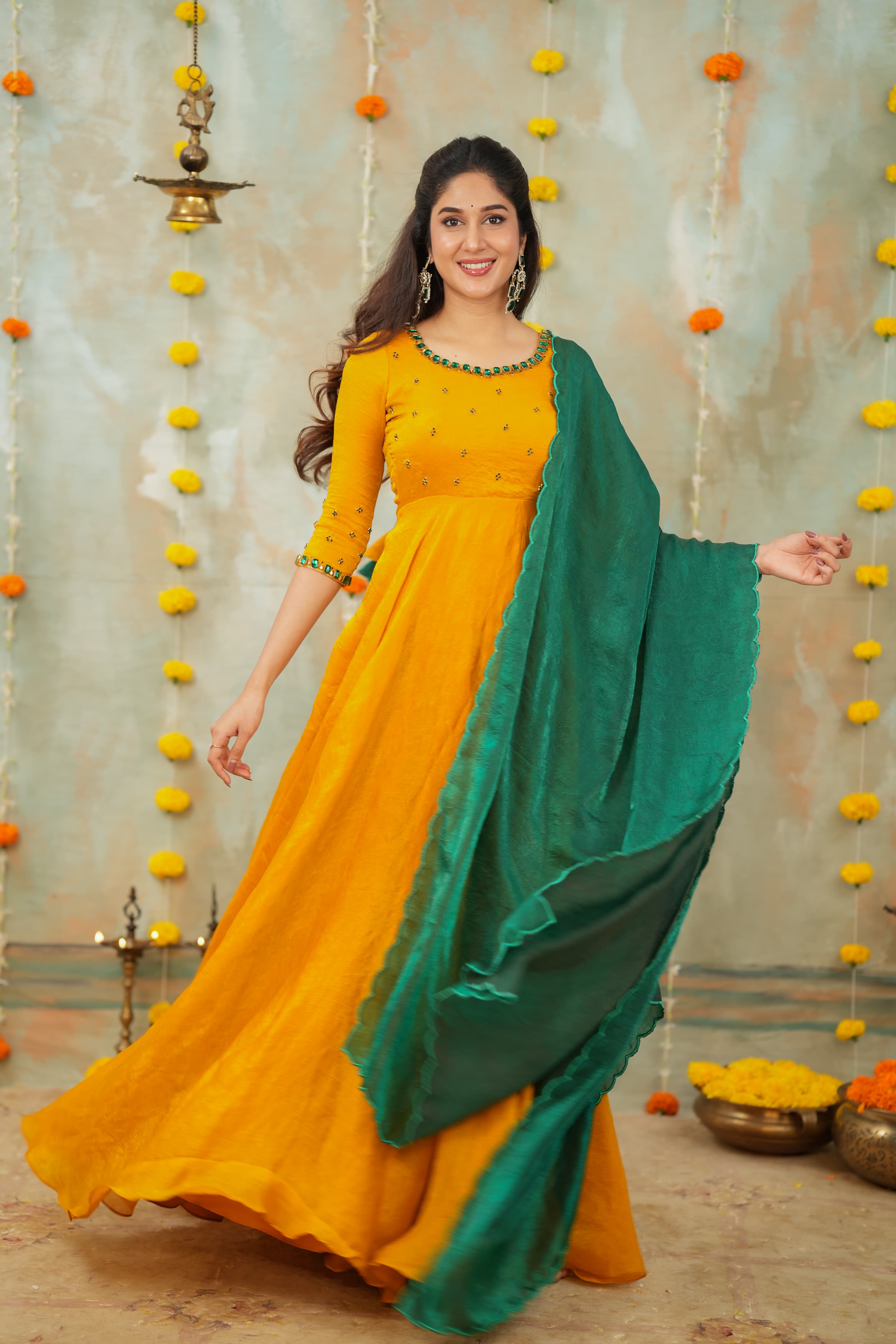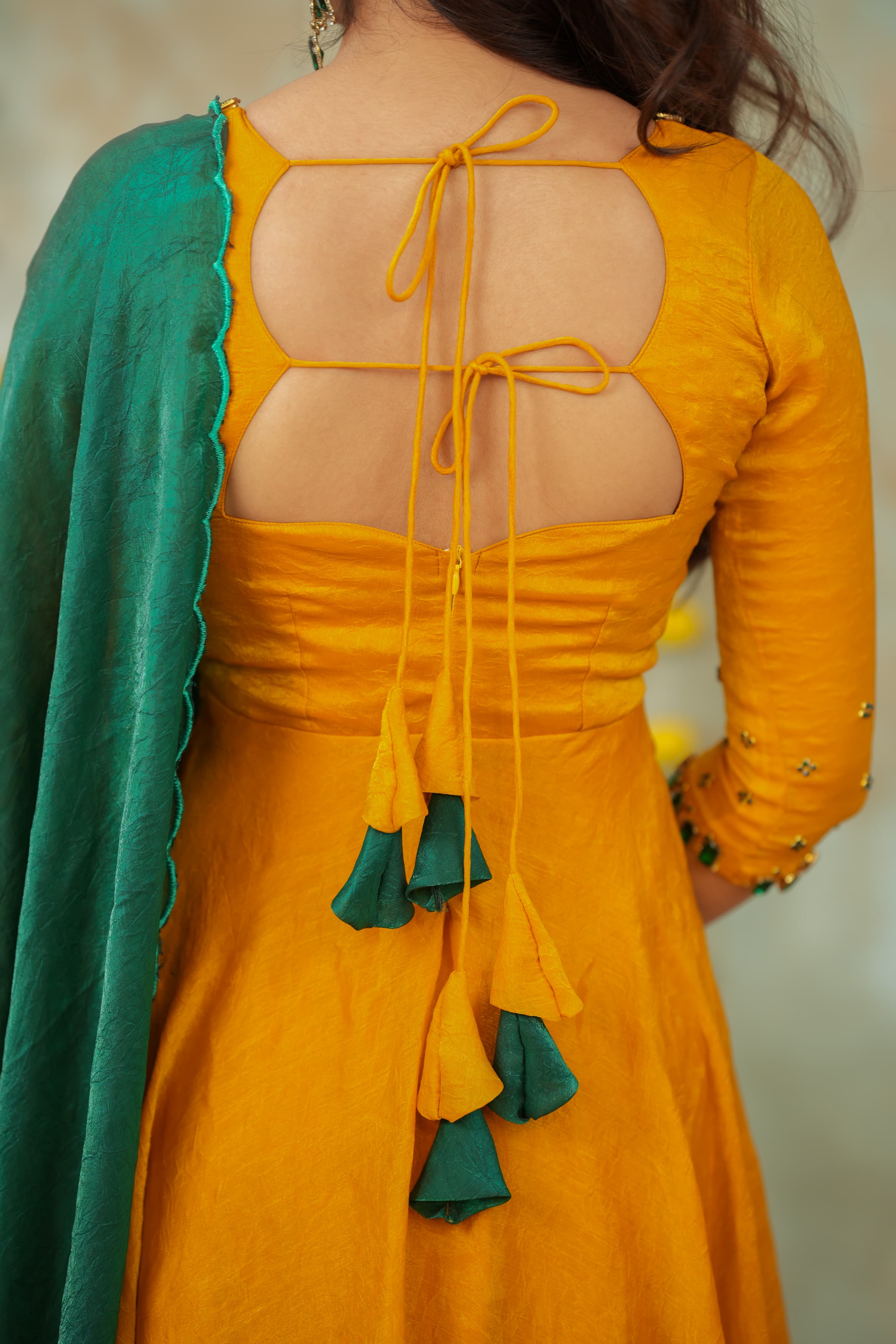 Whether attending a haldi , candlelit Diwali puja, a Mehendi celebration, or walking into a wedding event, this ensemble offers a statement of poise and elegance. The hand-crafted jewel detailing adds richness without overpowering, allowing you to shine with minimal accessories.