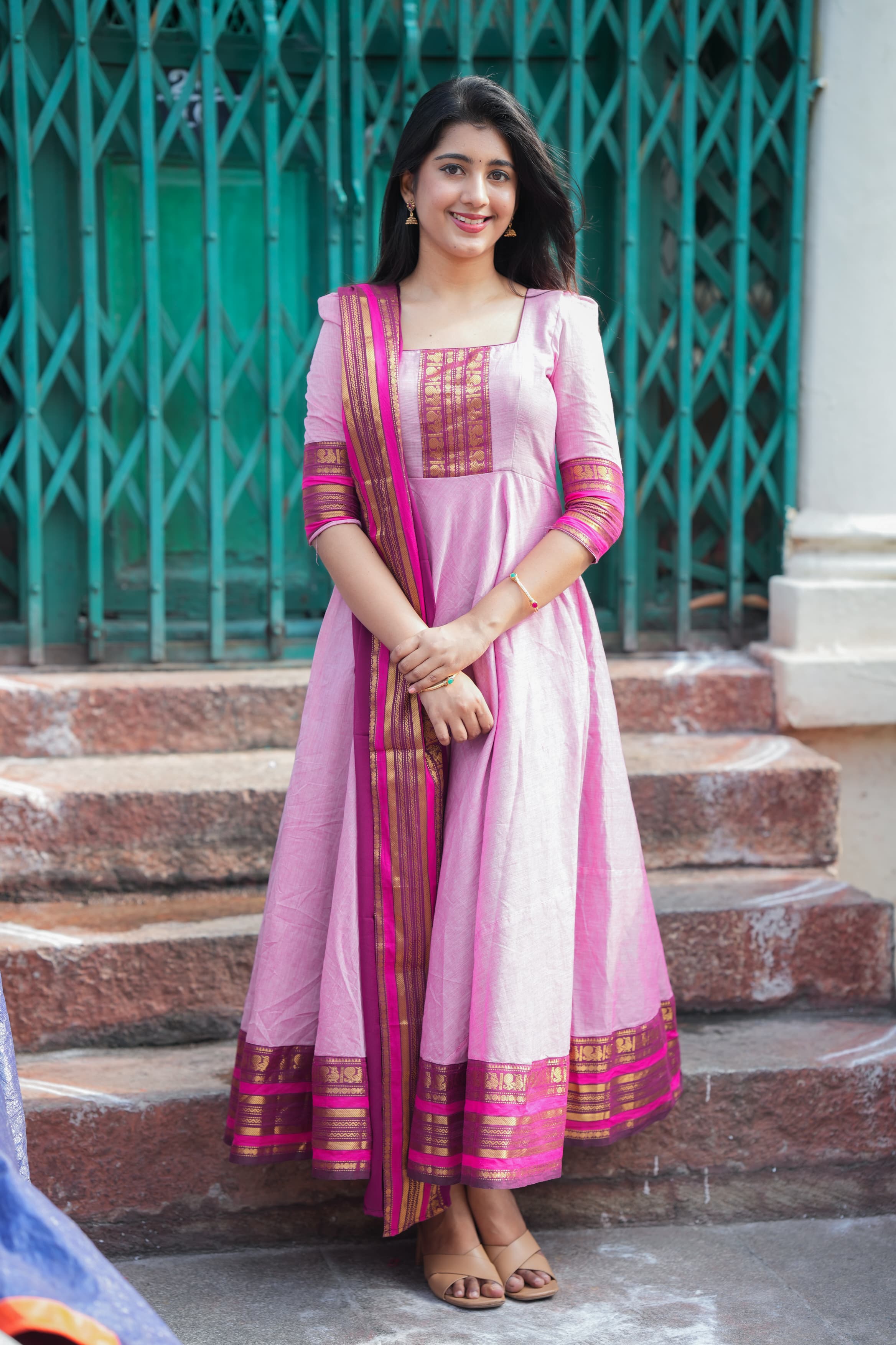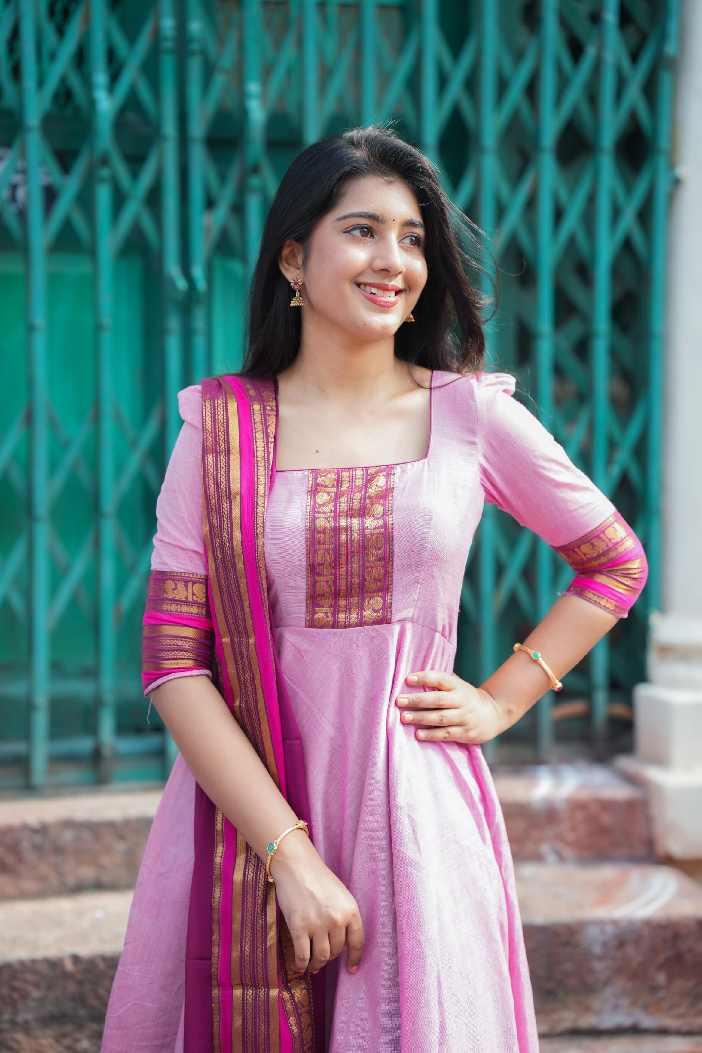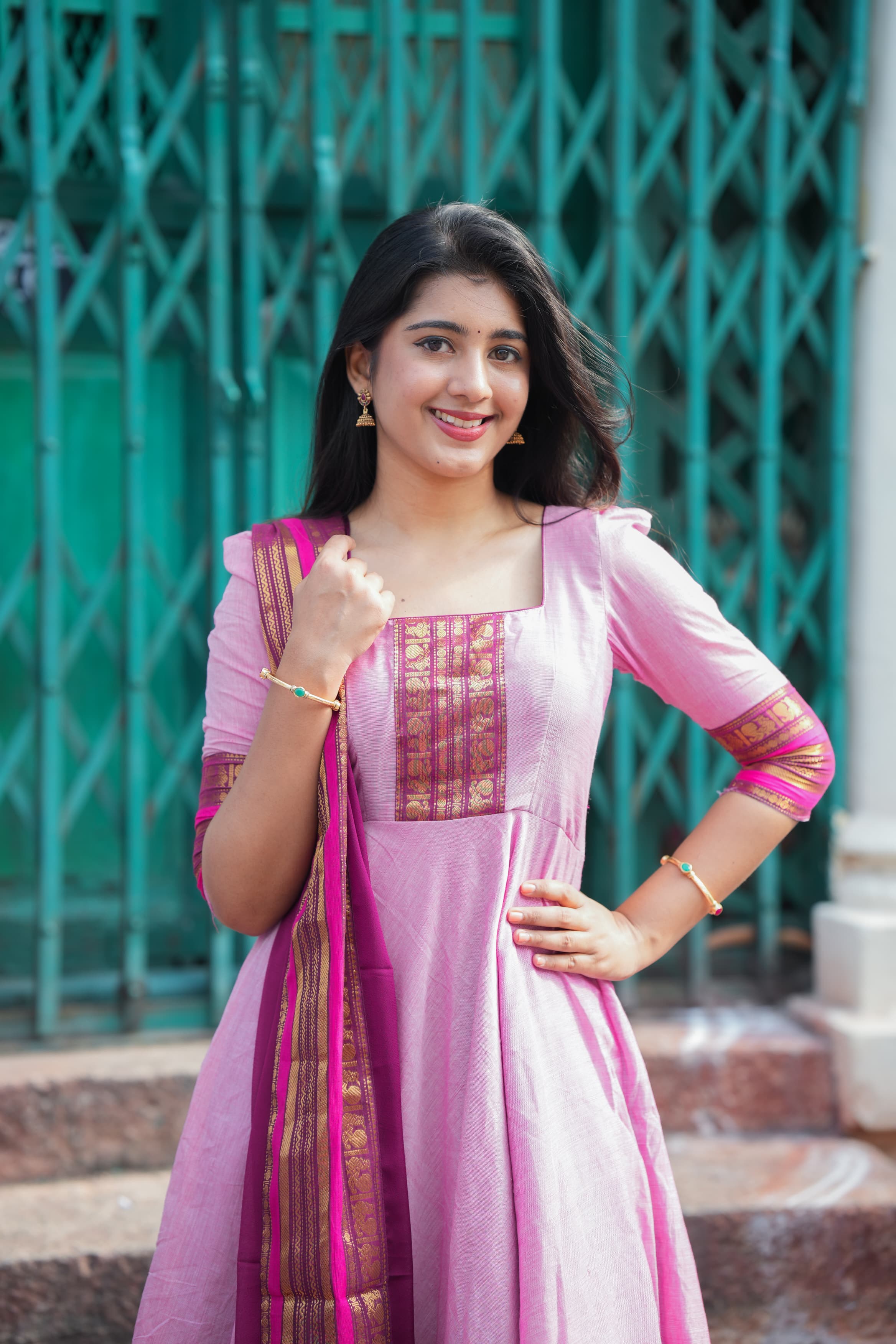 Elevate your traditional look with the stunning Shruthika Collection! This beautiful handloom cotton ensemble is perfect for festive occasions, family gatherings, or even a cultural day at work or college. The vibrant dark pink with a contrast purple dupatta adds an elegant touch, making it a timeless piece for your wardrobe.