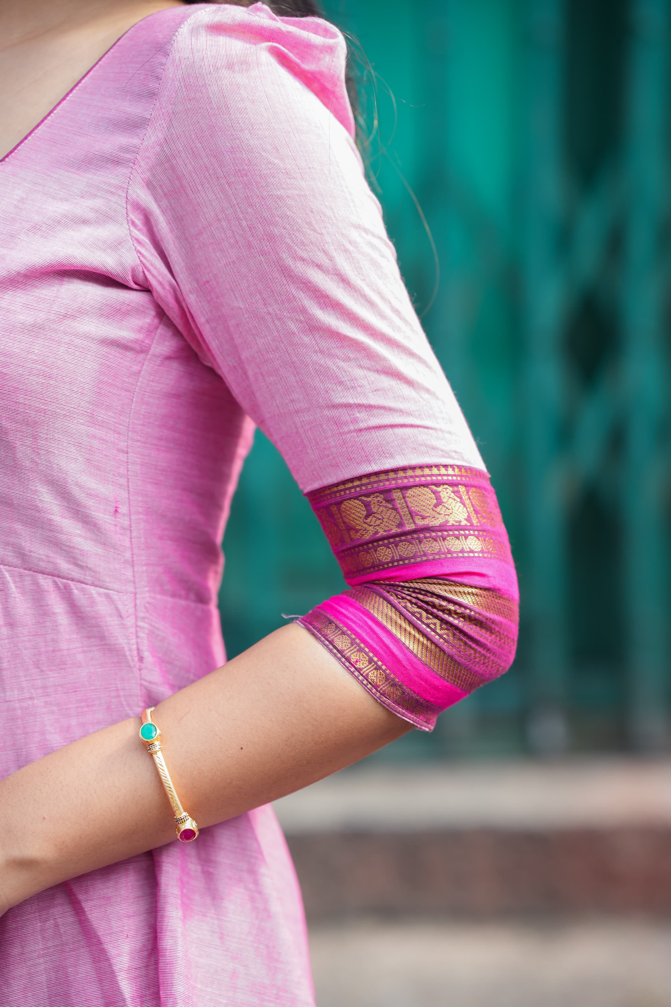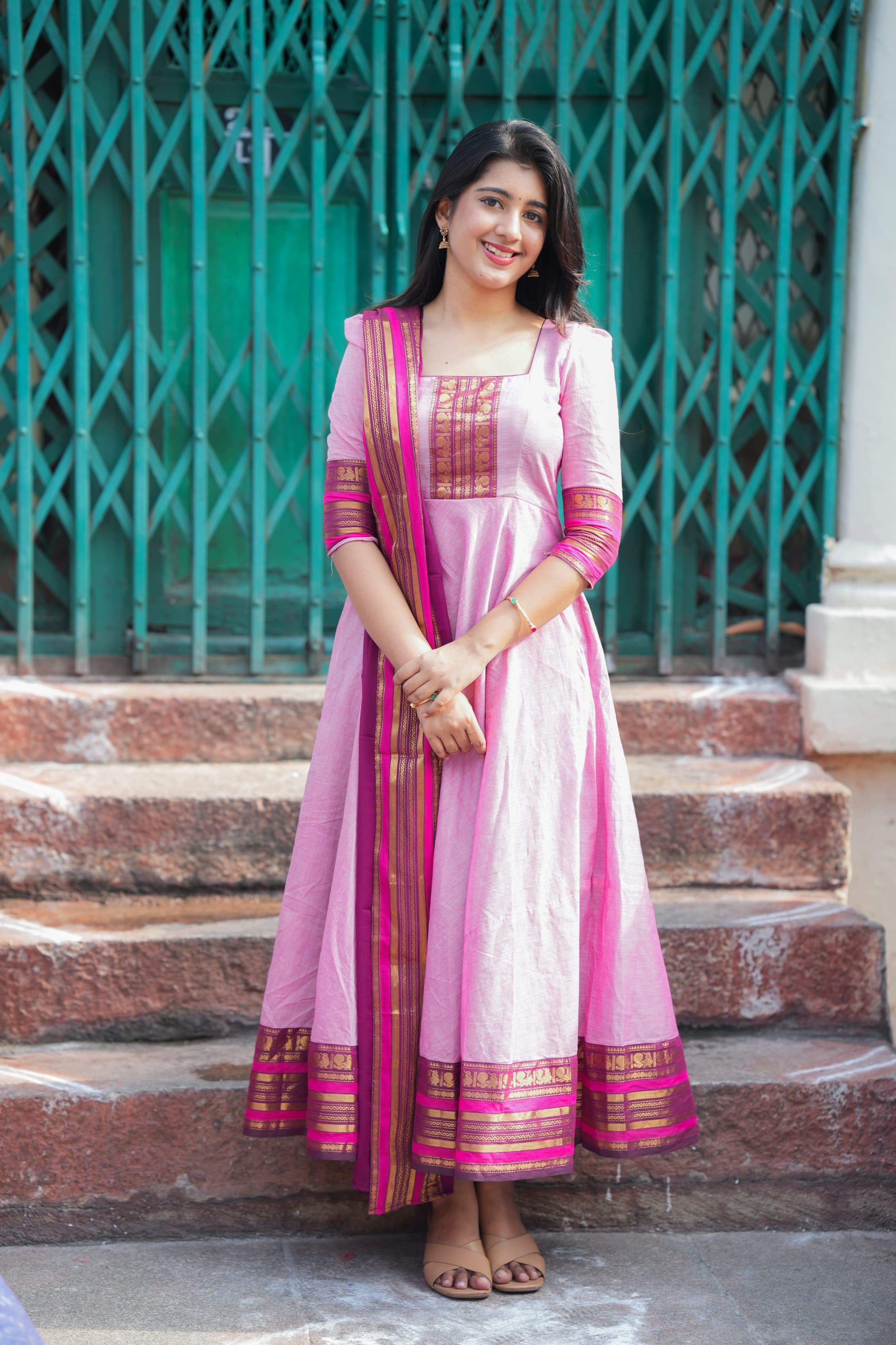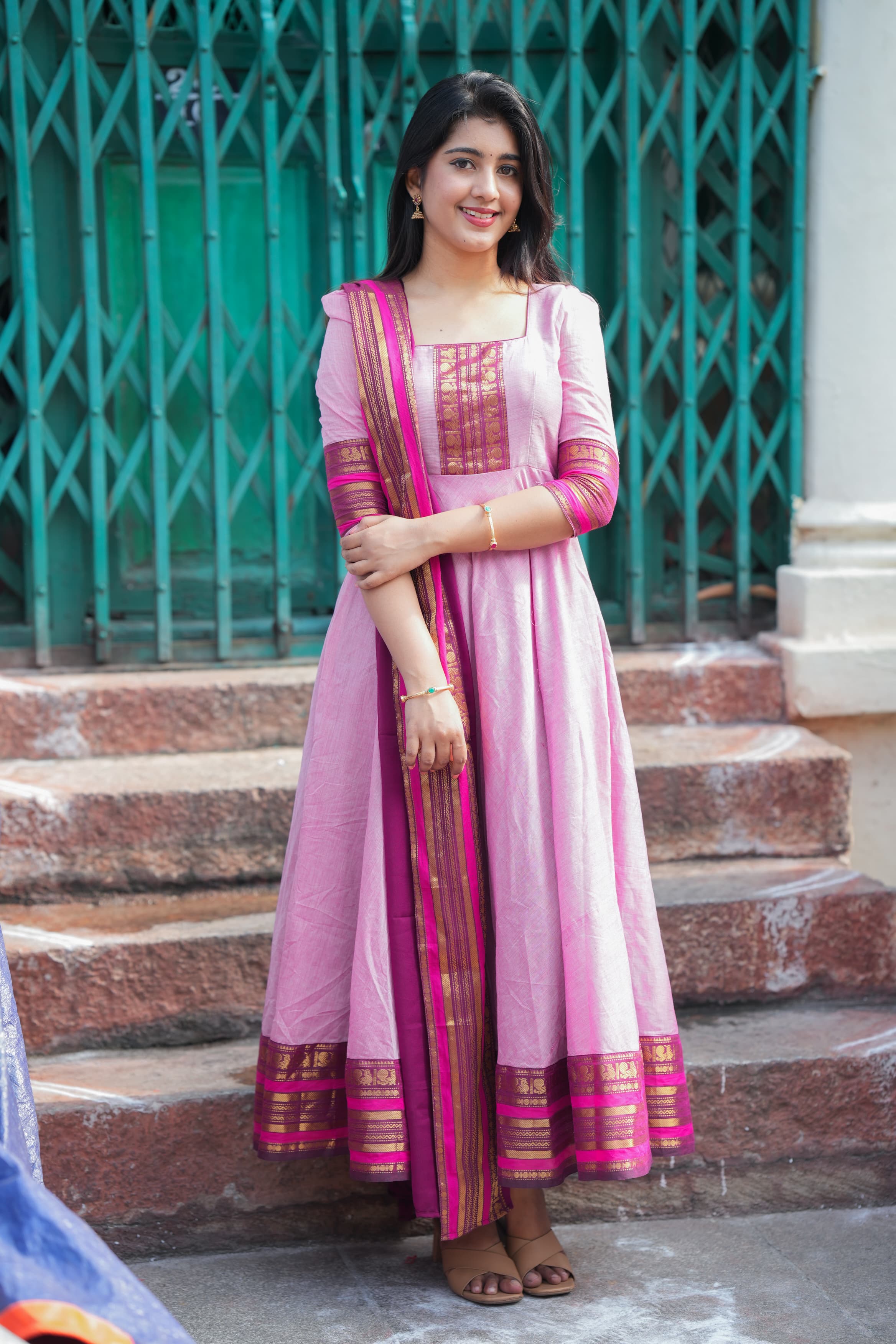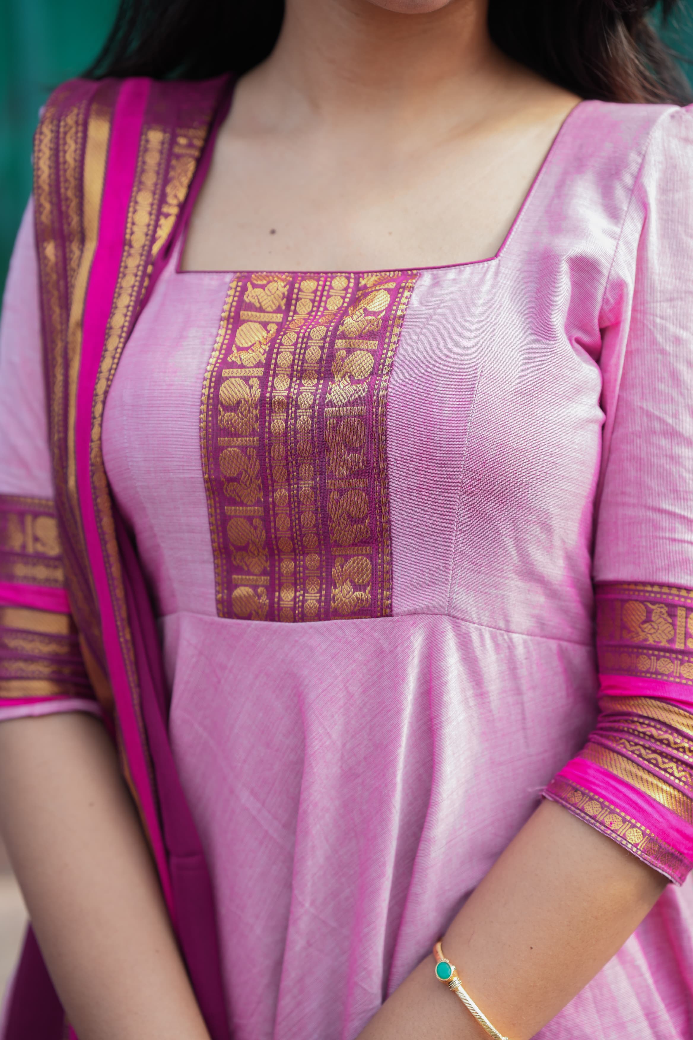 Elevate your traditional look with the stunning Shruthika Collection! This beautiful handloom cotton ensemble is perfect for festive occasions, family gatherings, or even a cultural day at work or college. The vibrant dark pink with a contrast purple dupatta adds an elegant touch, making it a timeless piece for your wardrobe.
