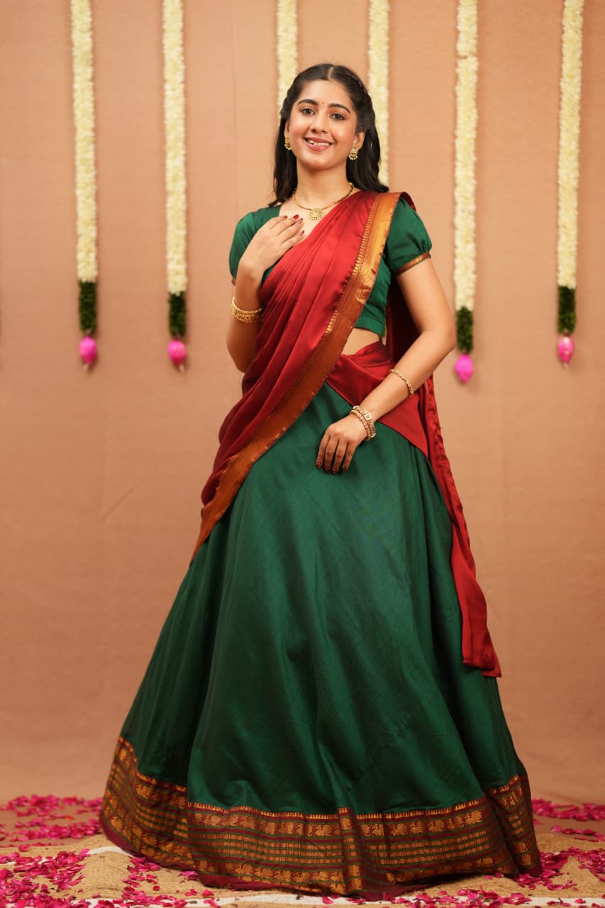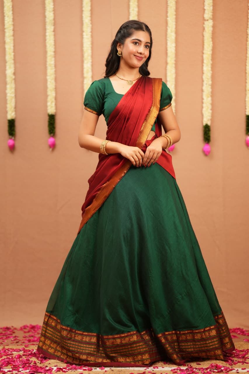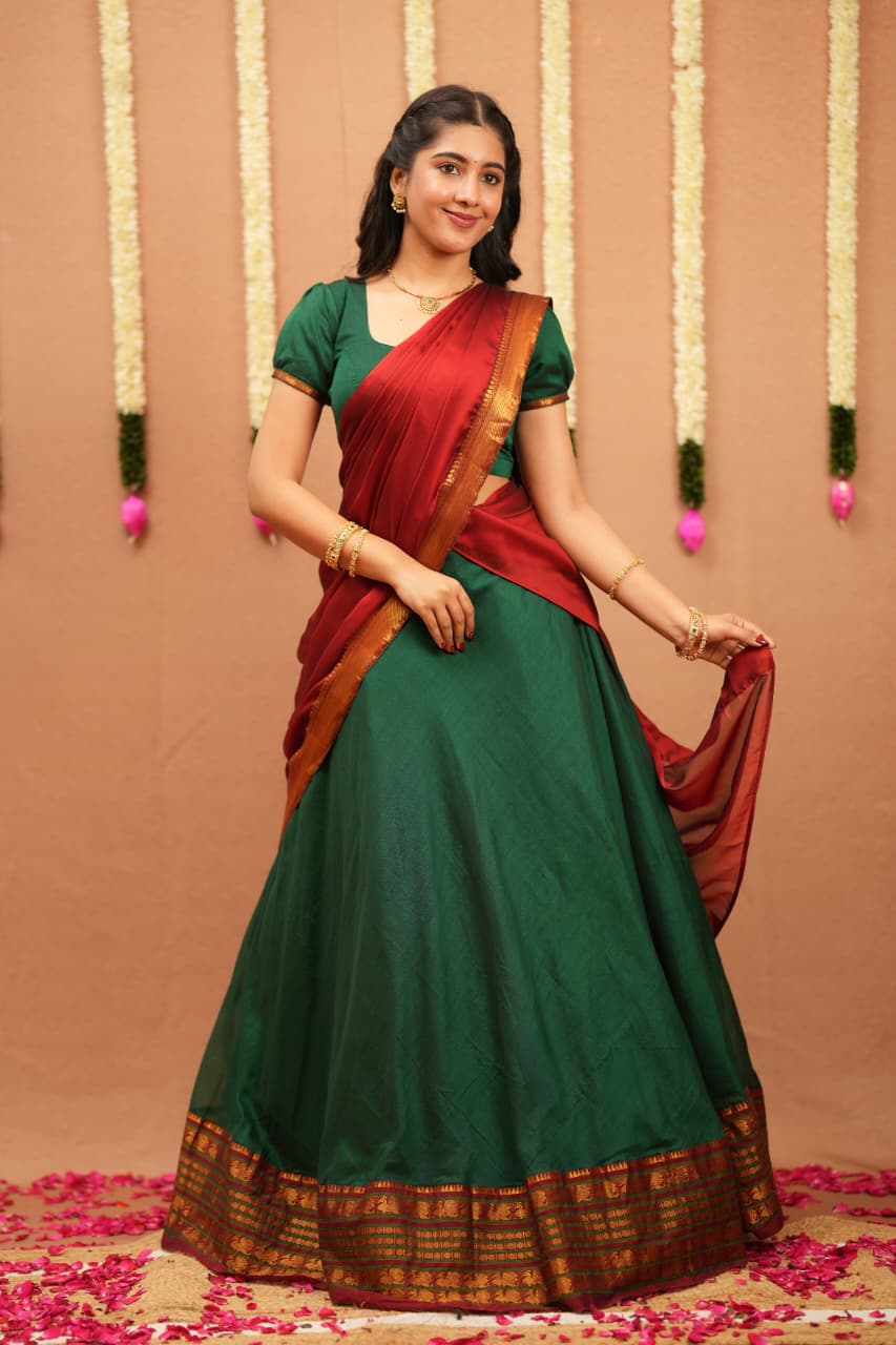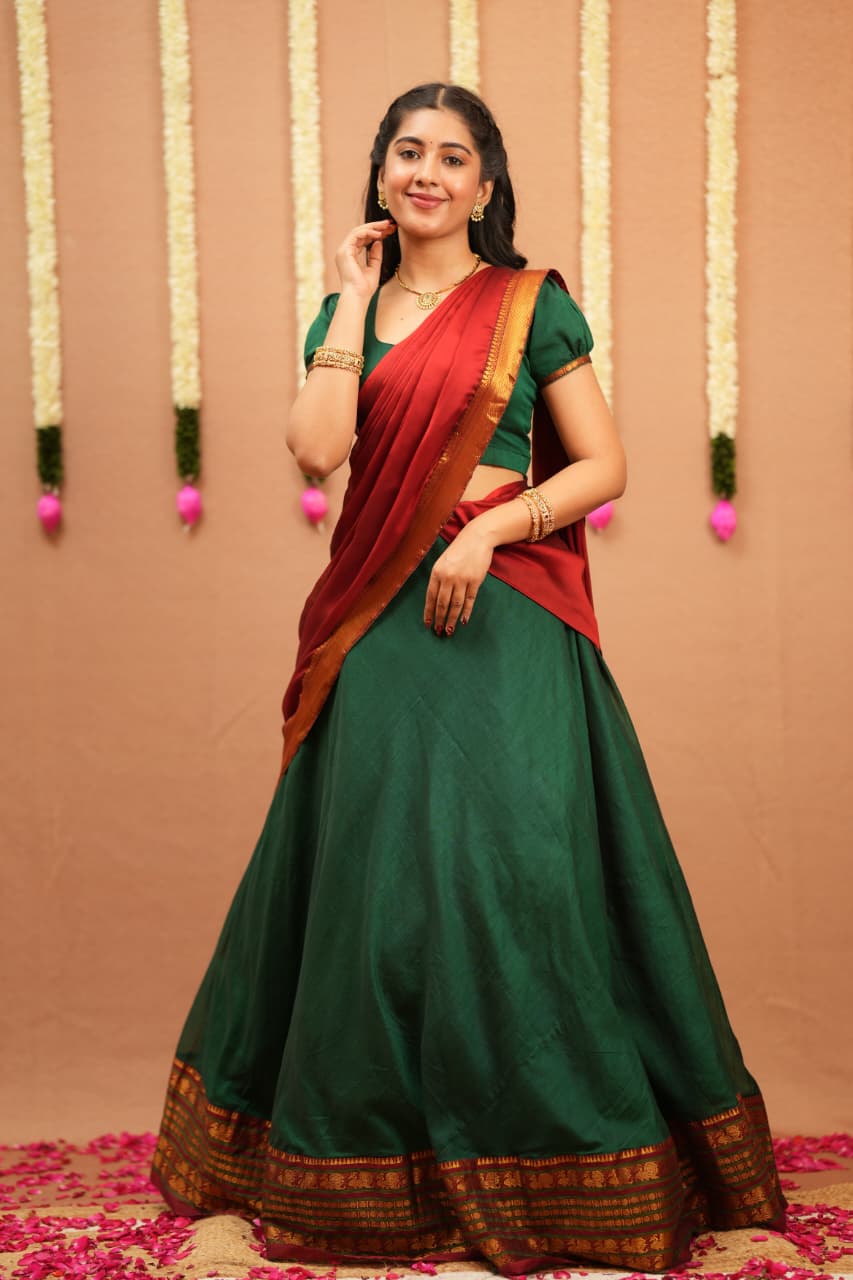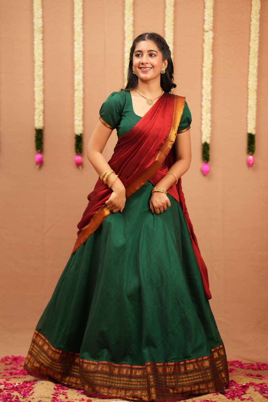Flowy cotton skirt featuring a rich zari border and soft pleats, offering both comfort and traditional beauty — perfect for festive celebrations.