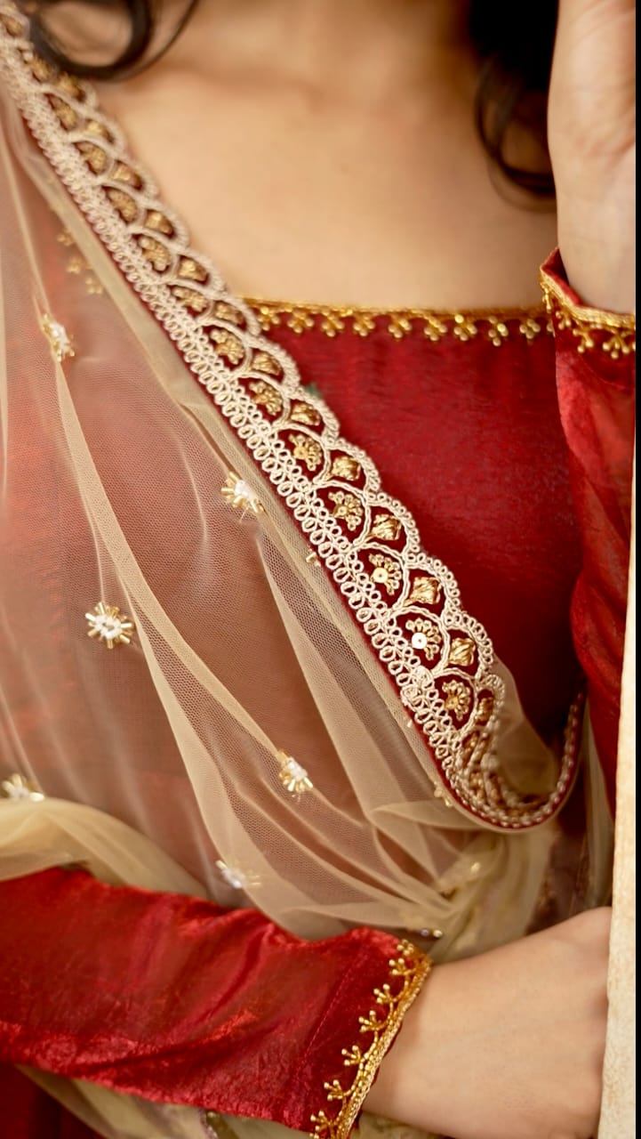 Comes with a matching net dupatta finished with a delicate lace border — a subtle yet stunning complement to the Anarkali.
