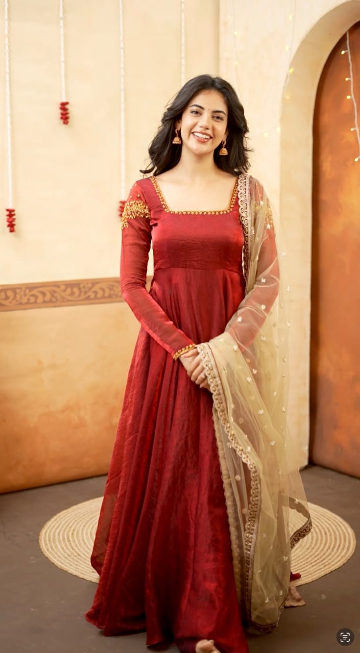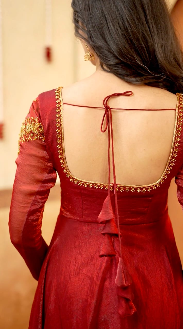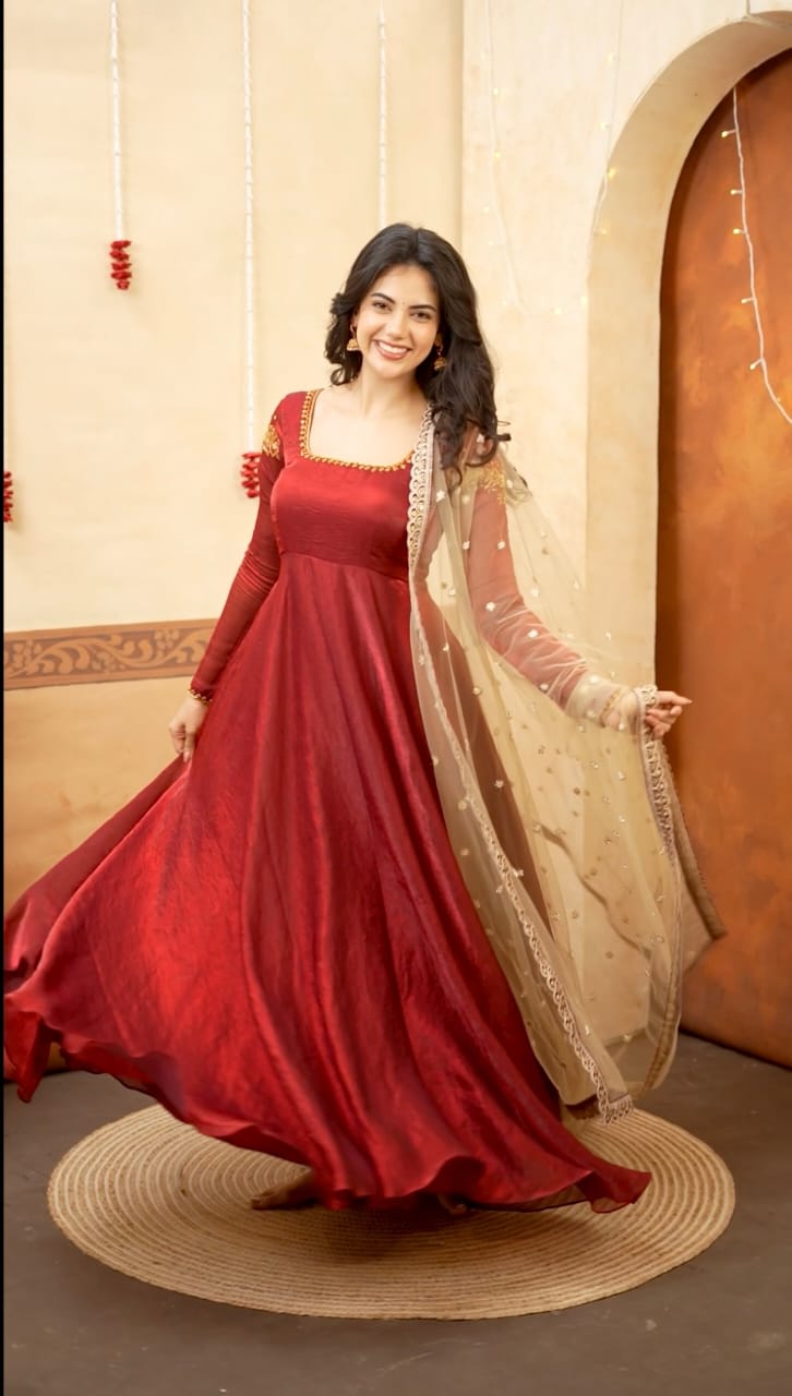Crafted from luxurious shiny georgette this Anarkali showcases exquisite handwork embroidery on the bodice and sleeves, radiating a perfect blend of traditional charm and modern grace. Designed to drape beautifully, enhancing your festive look with effortless elegance.