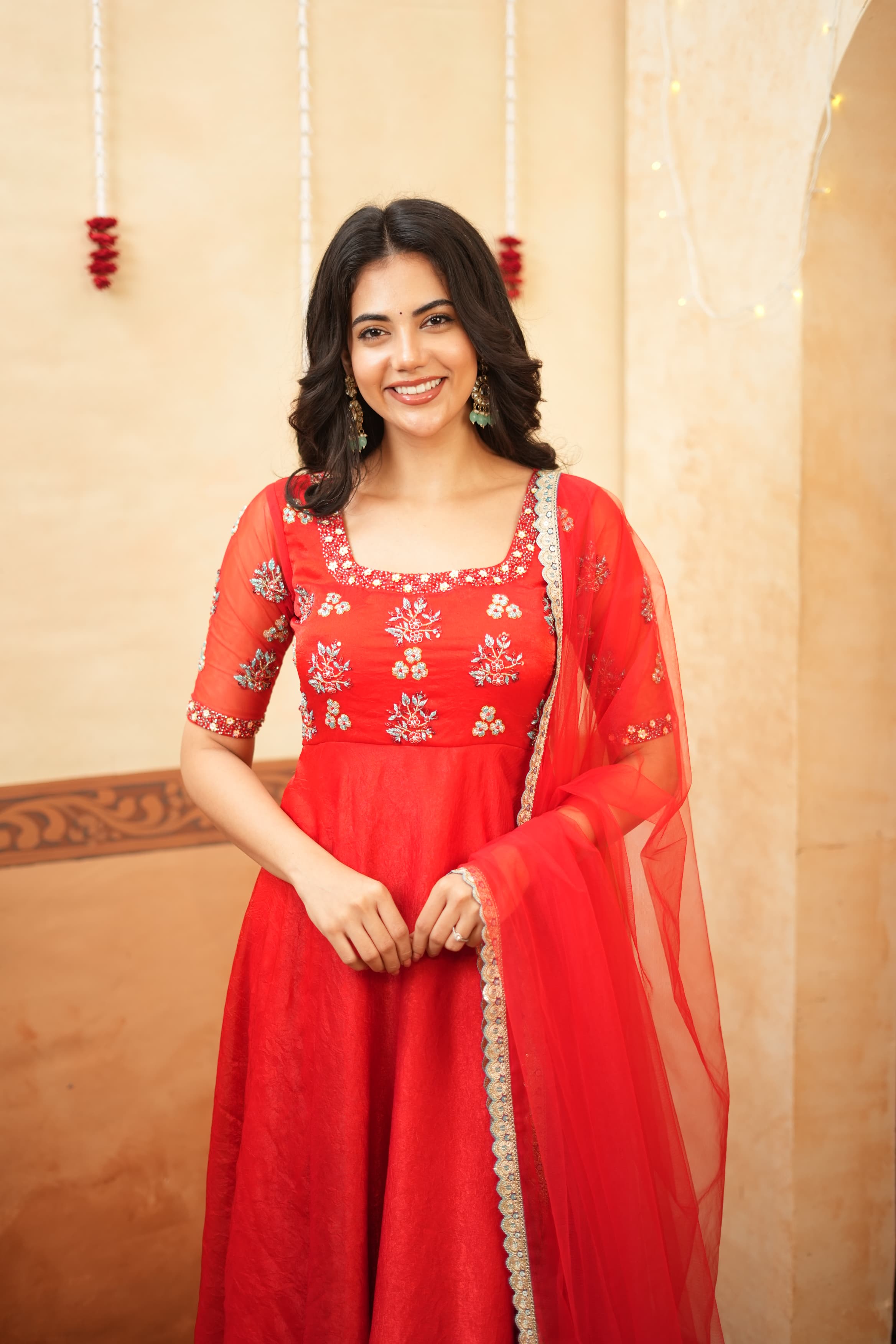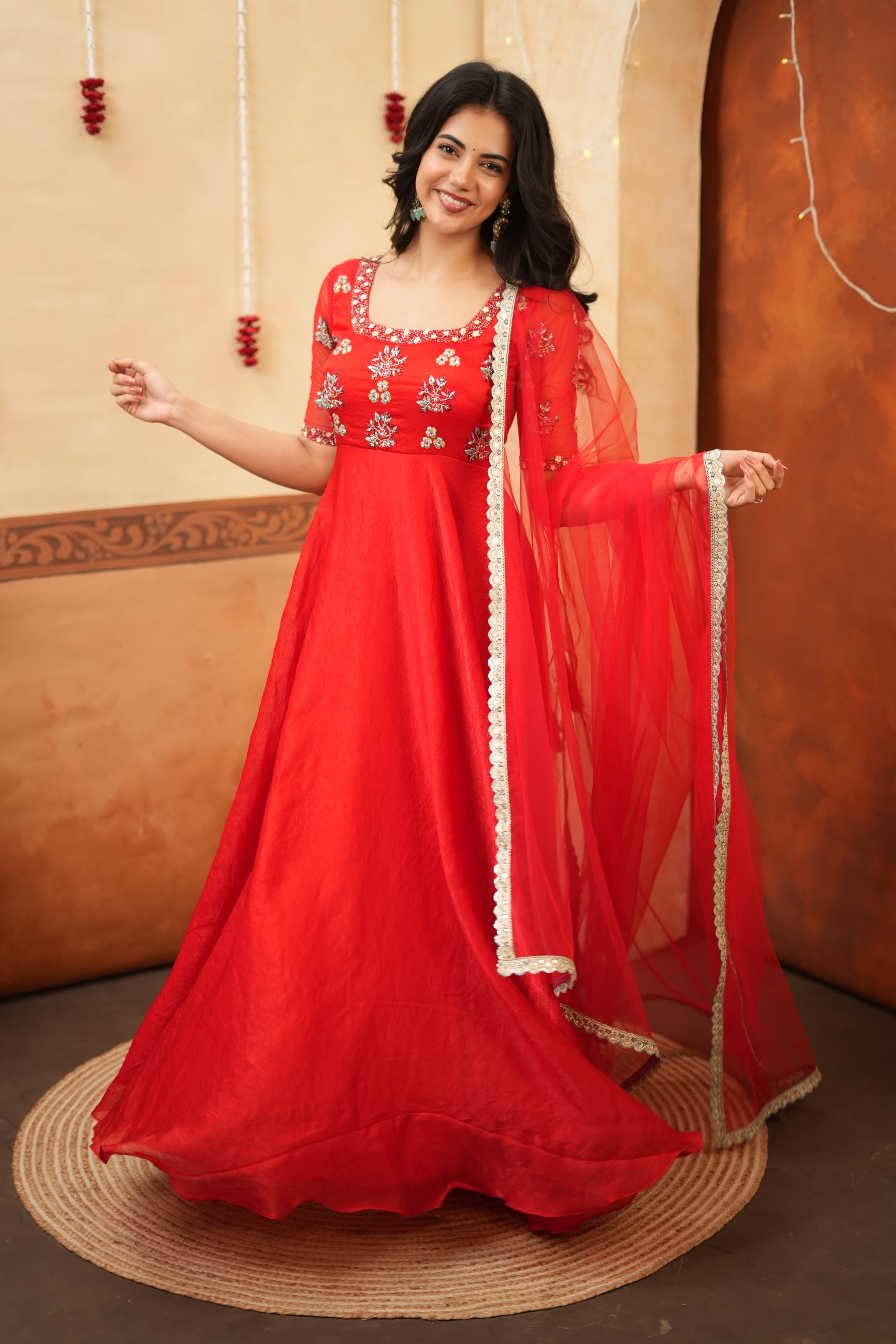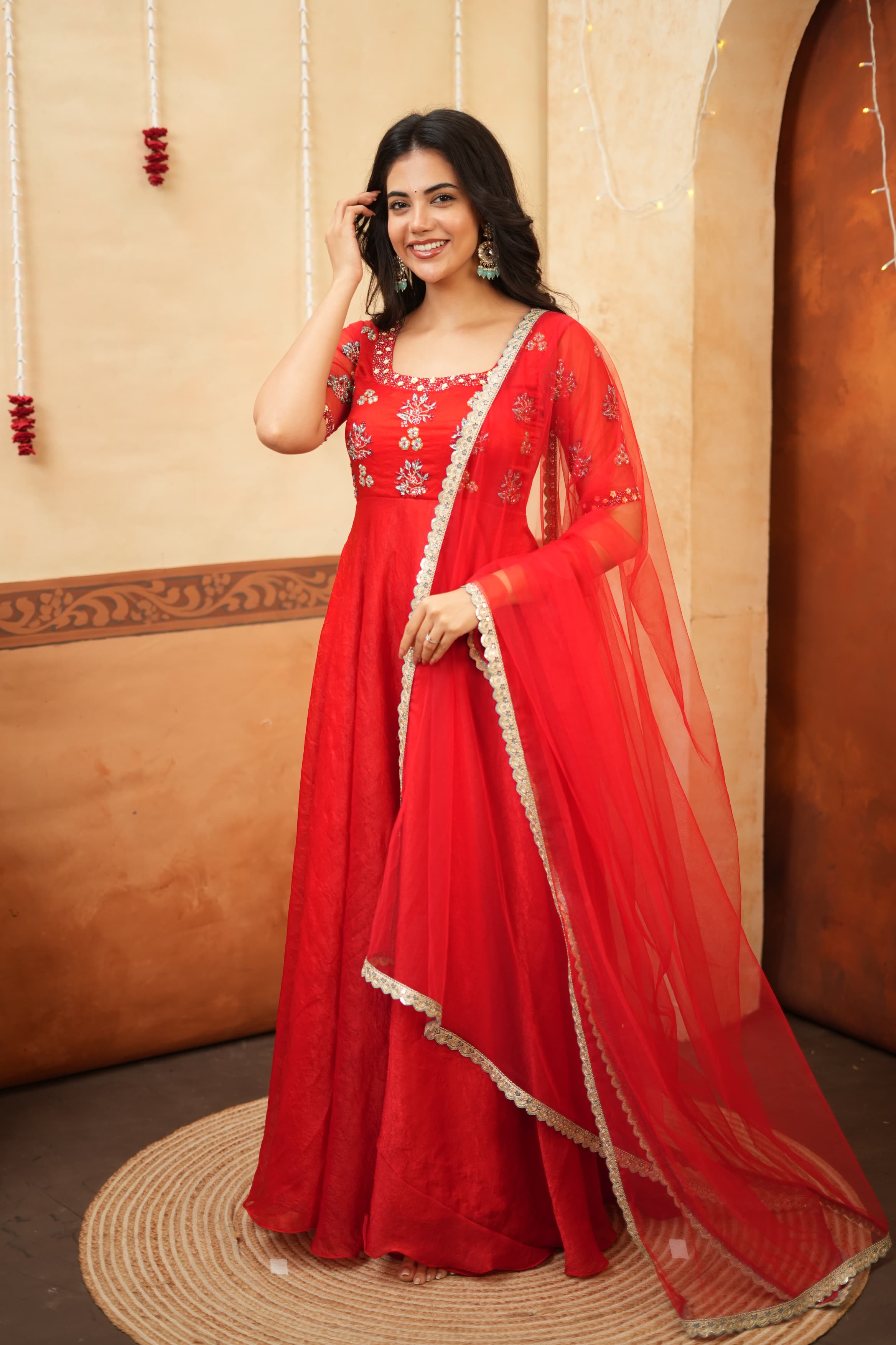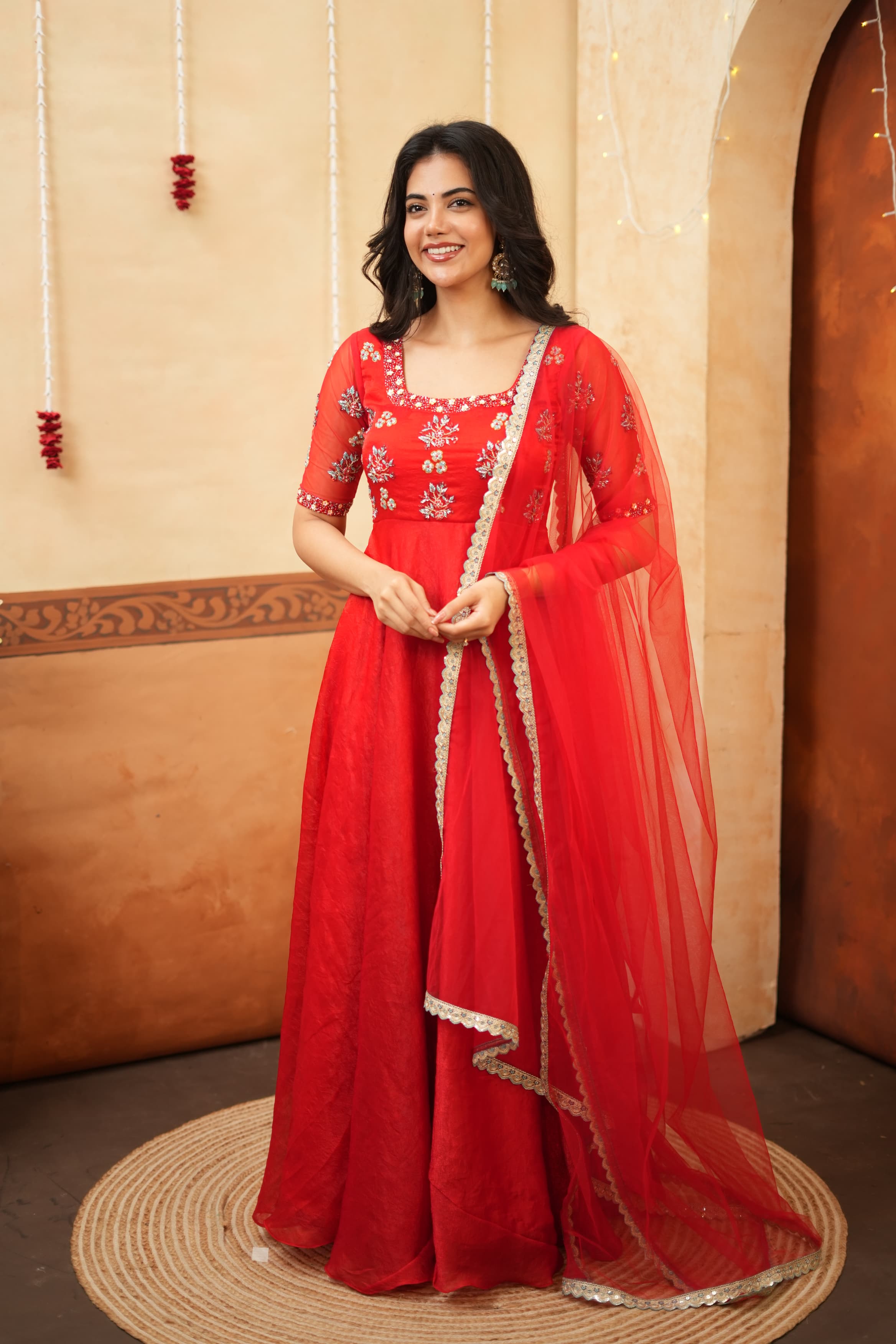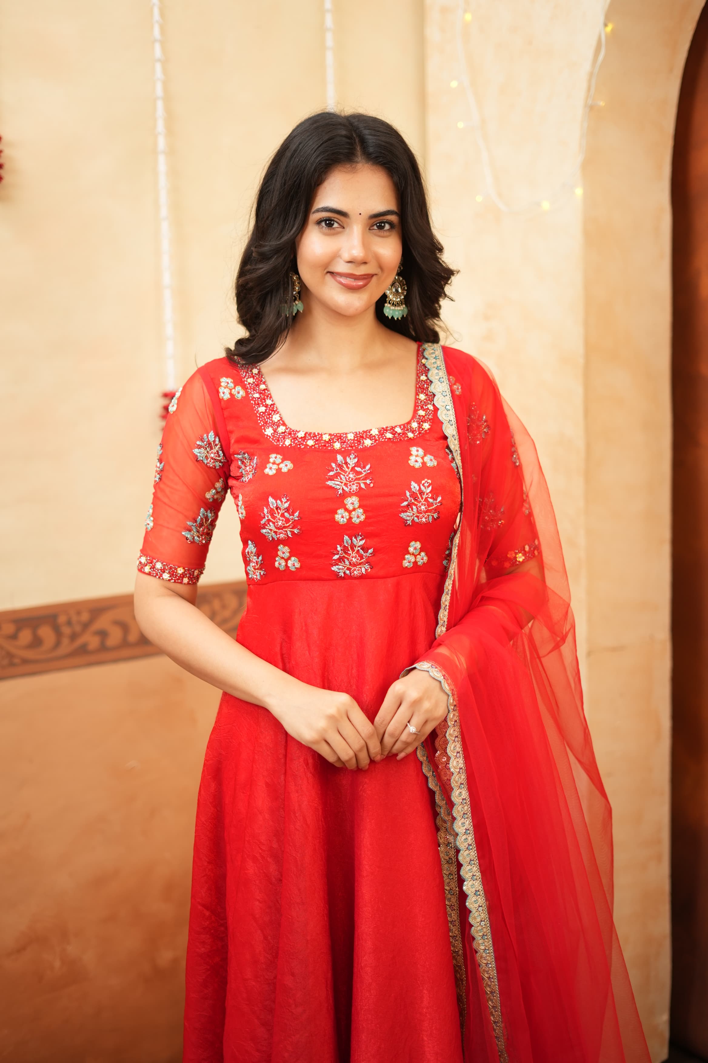 Crafted from luxurious shiny georgette this Anarkali showcases exquisite handwork embroidery on the bodice and sleeves, radiating a perfect blend of traditional charm and modern grace. Designed to drape beautifully, enhancing your festive look with effortless elegance.