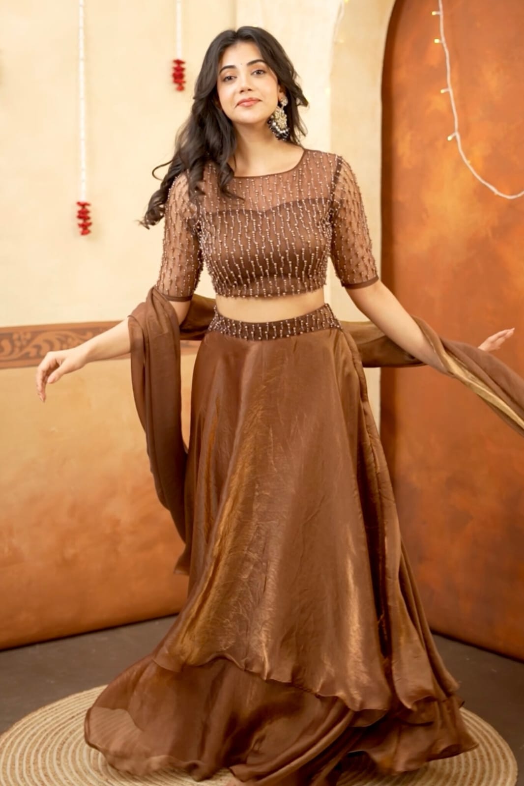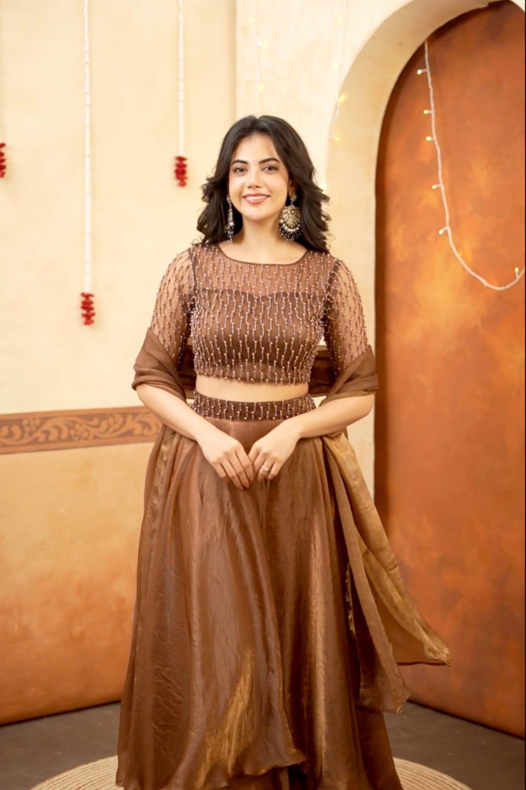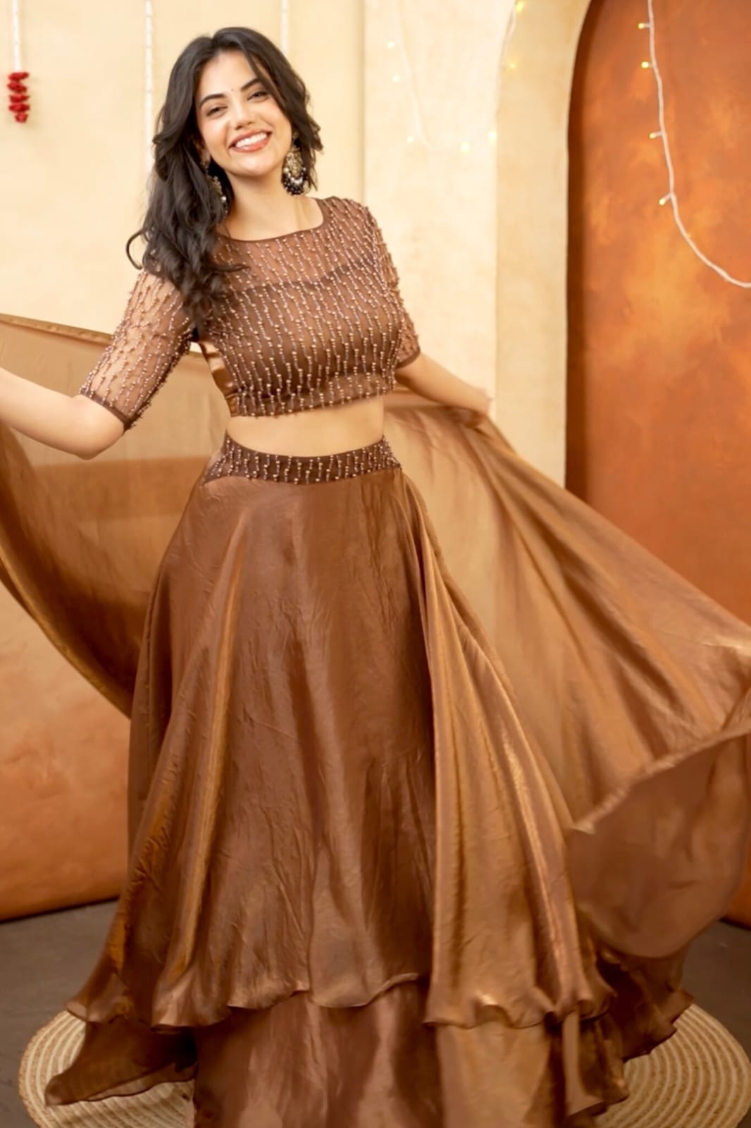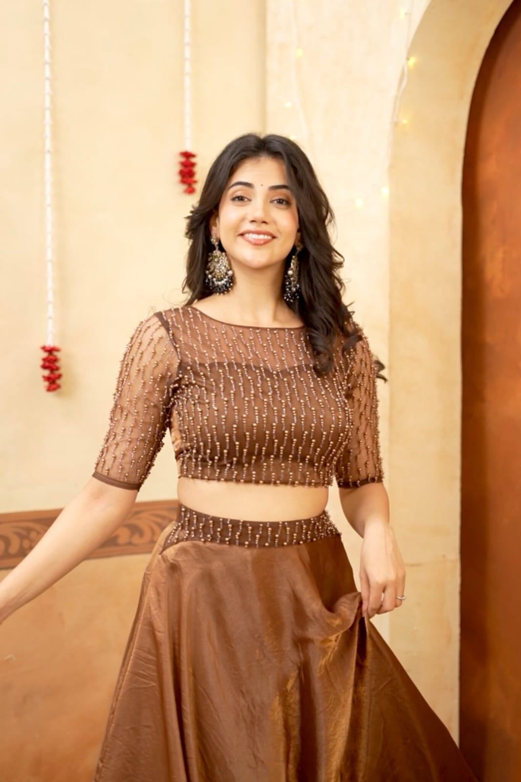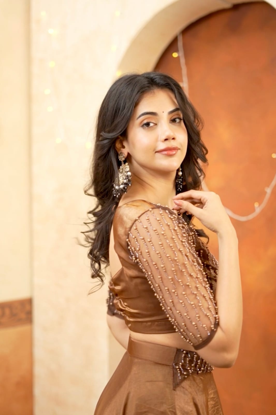 The full-flared space silk skirt flows beautifully with every step. Its soft sheen, layered drape, and smooth fall make it an ideal choice for celebrations. Lightweight yet grand, it delivers a sophisticated and effortless festive appeal.