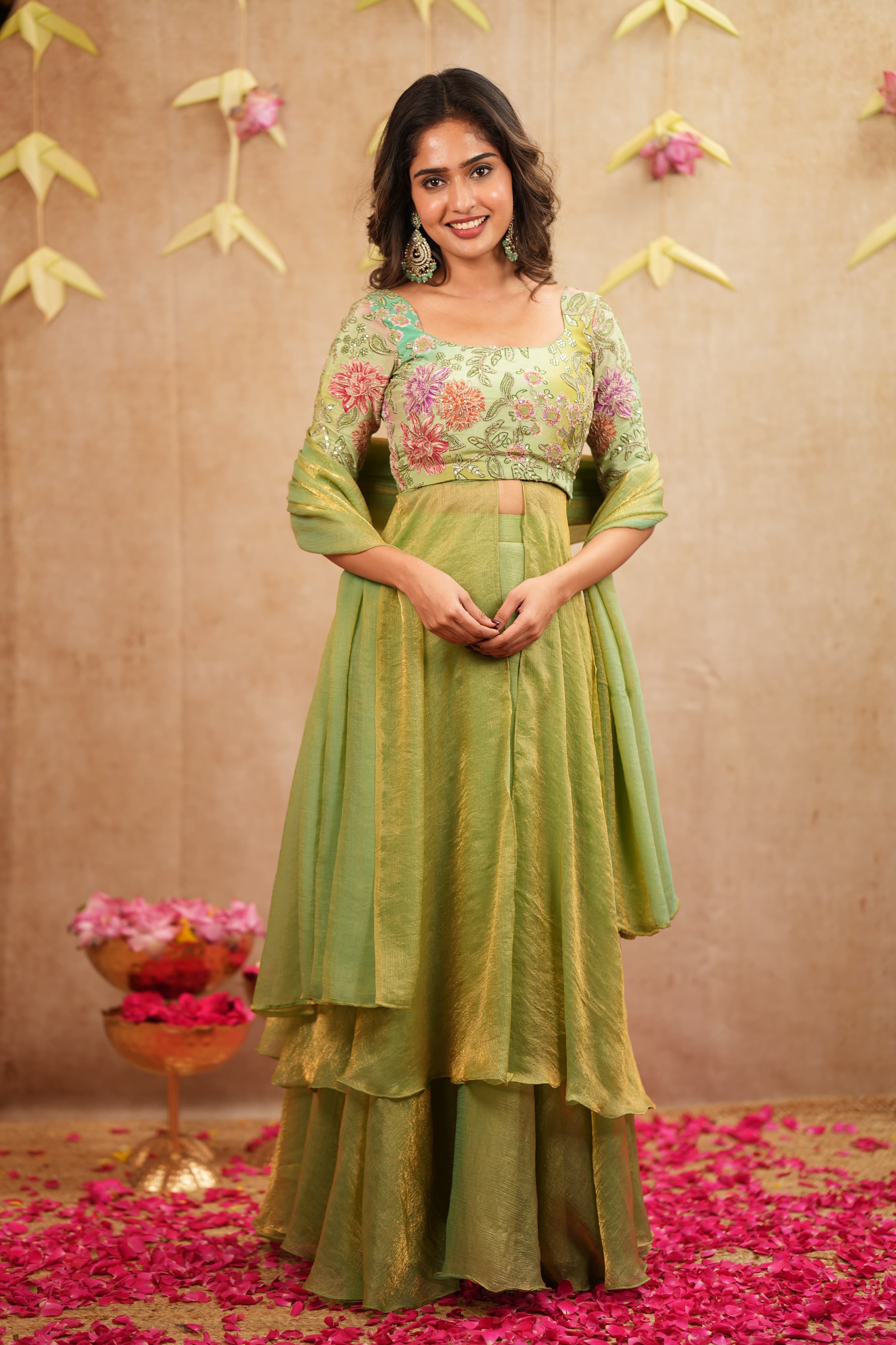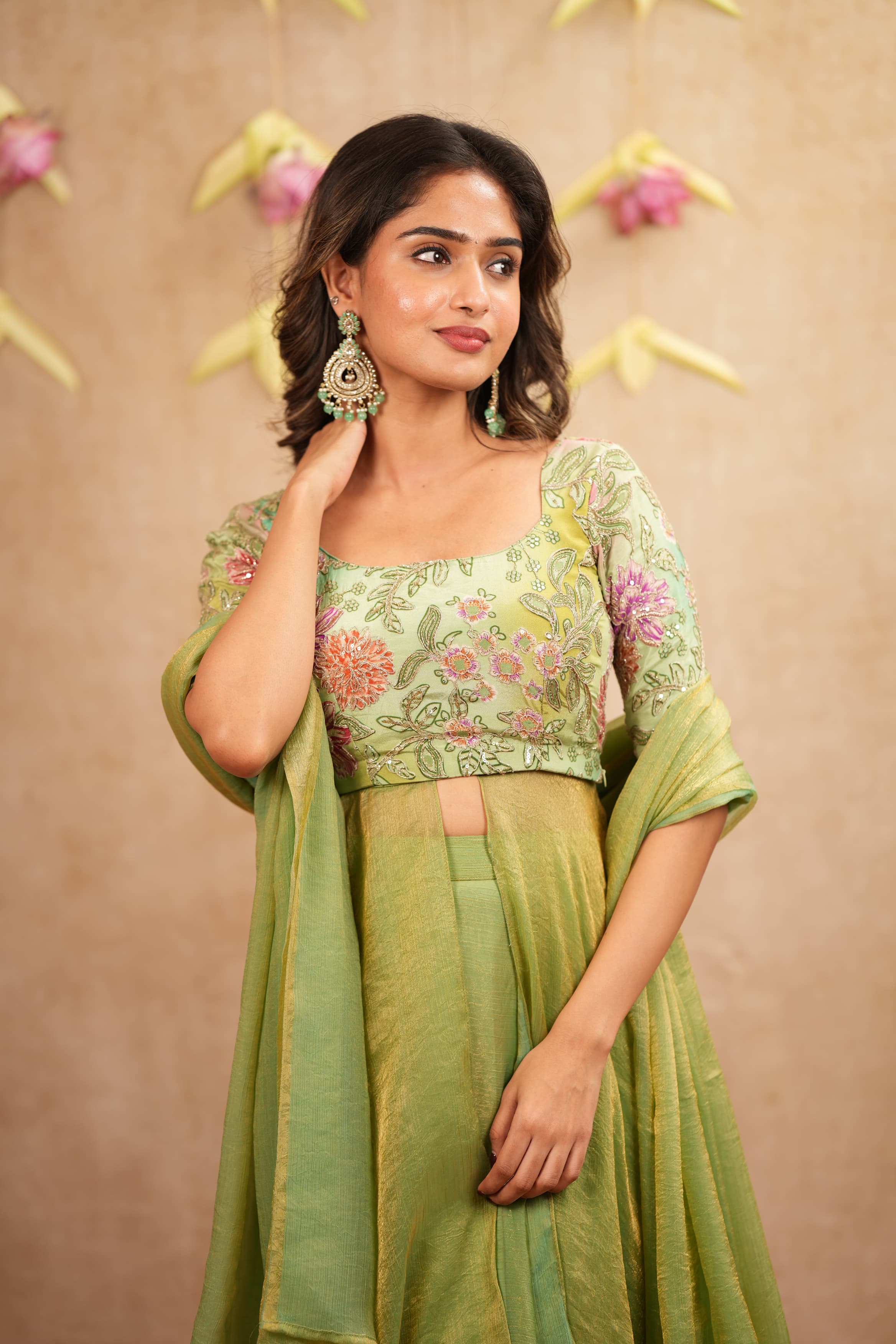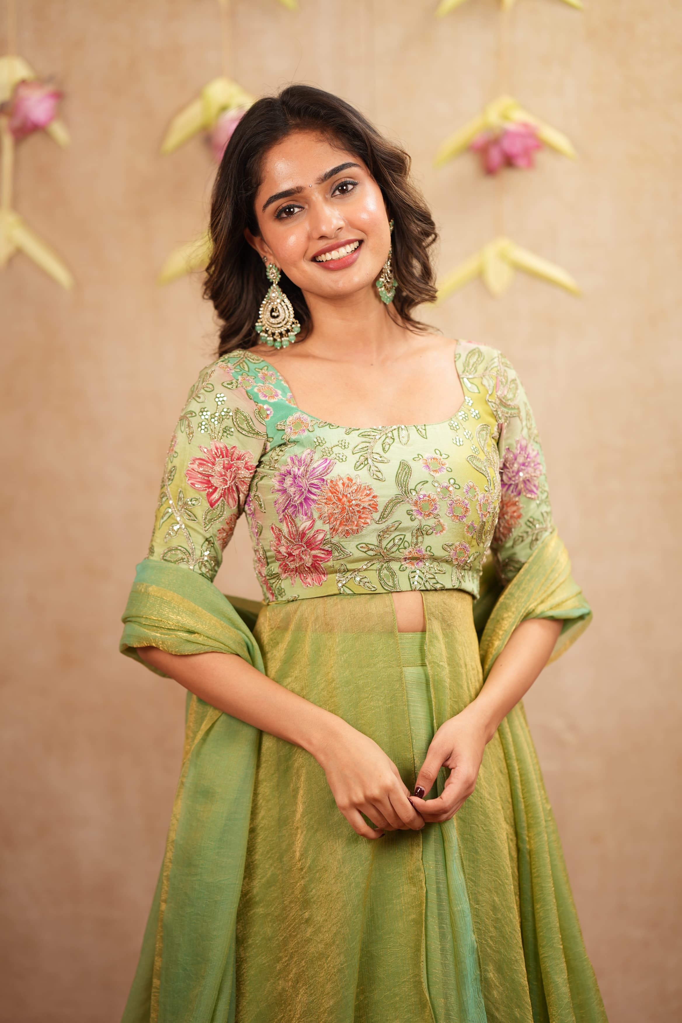 This versatile set can be styled in multiple ways — as a lehanga set, gown-style look, or traditional festive wear, making it a perfect wardrobe essential for every occasion.