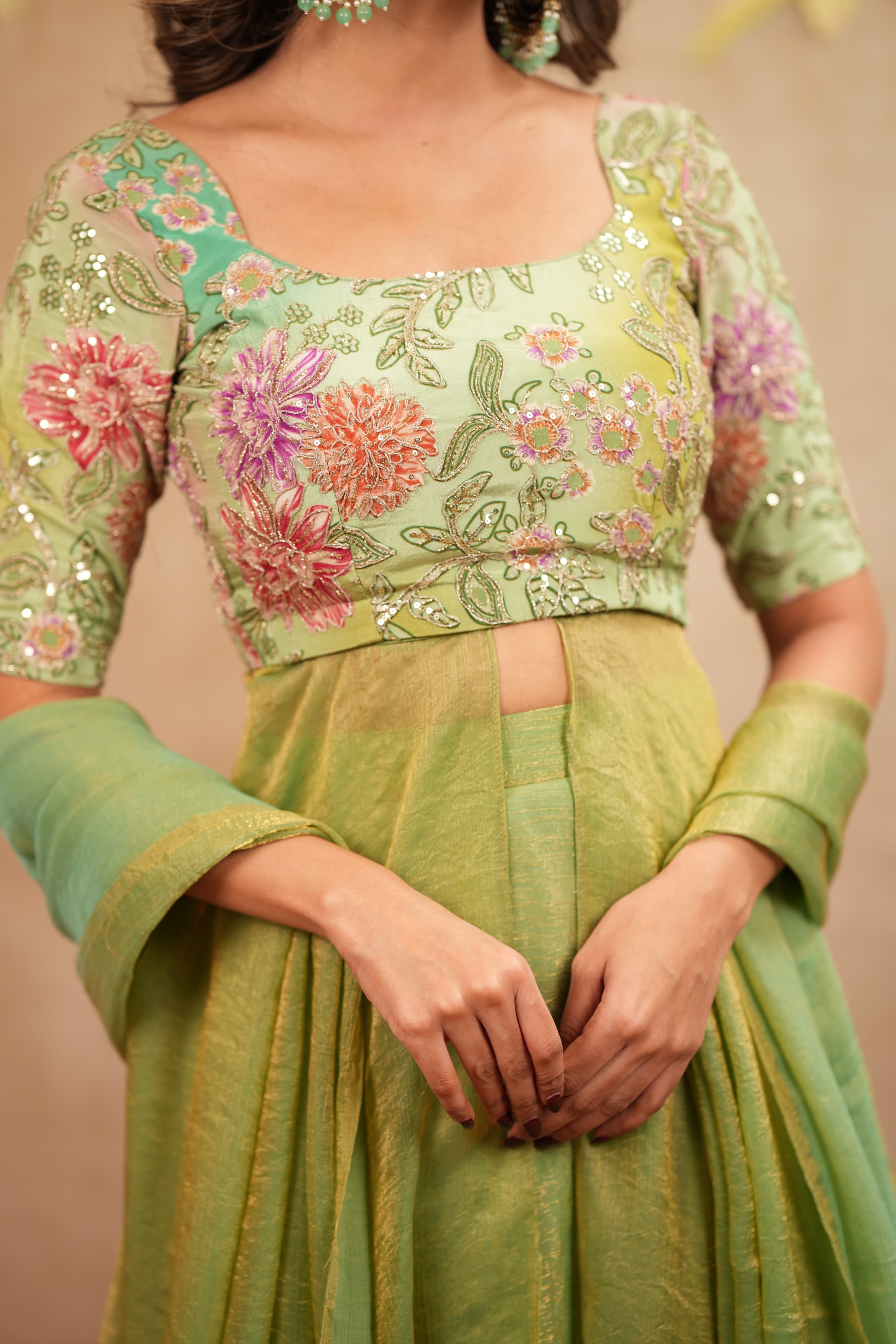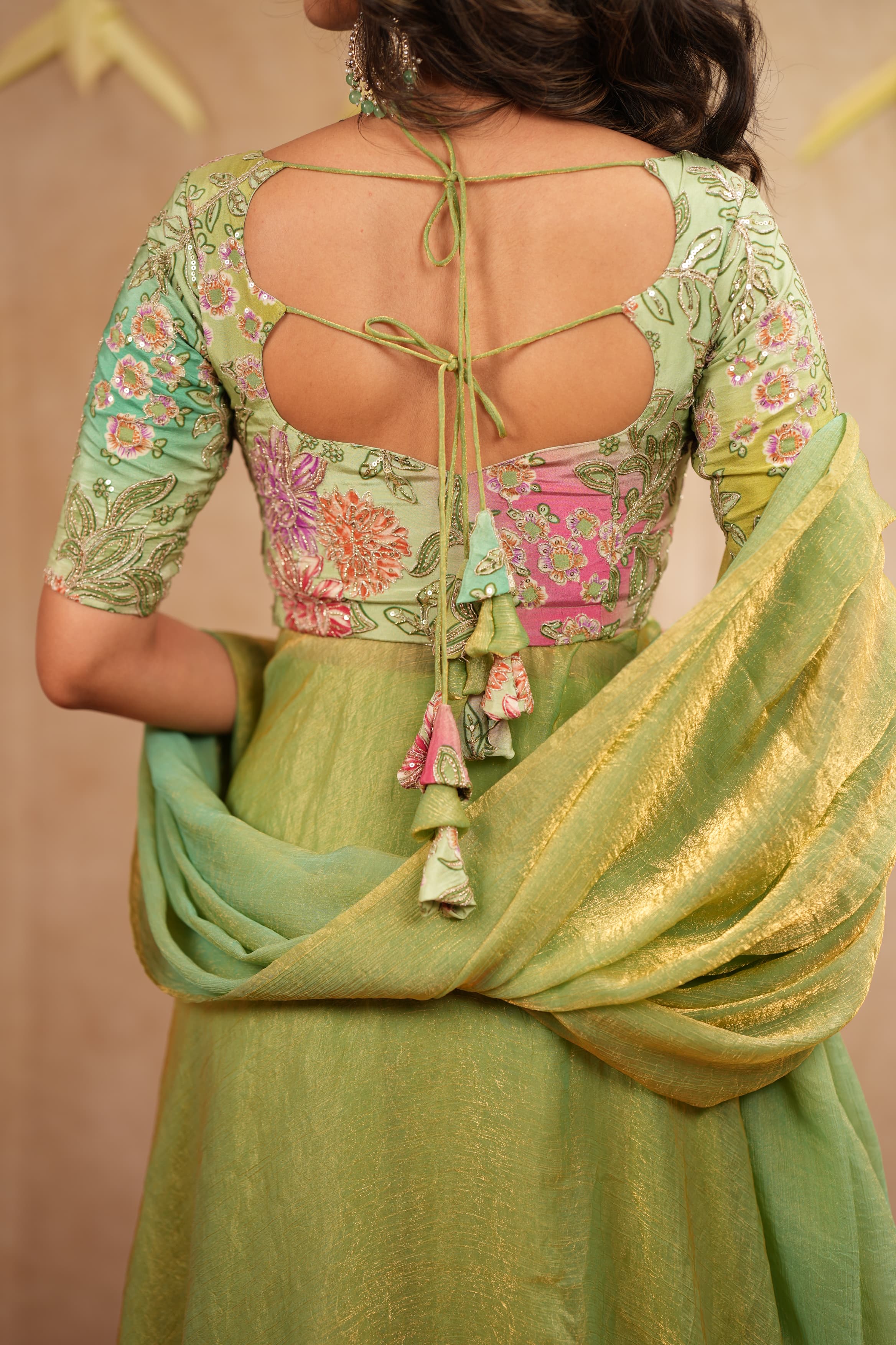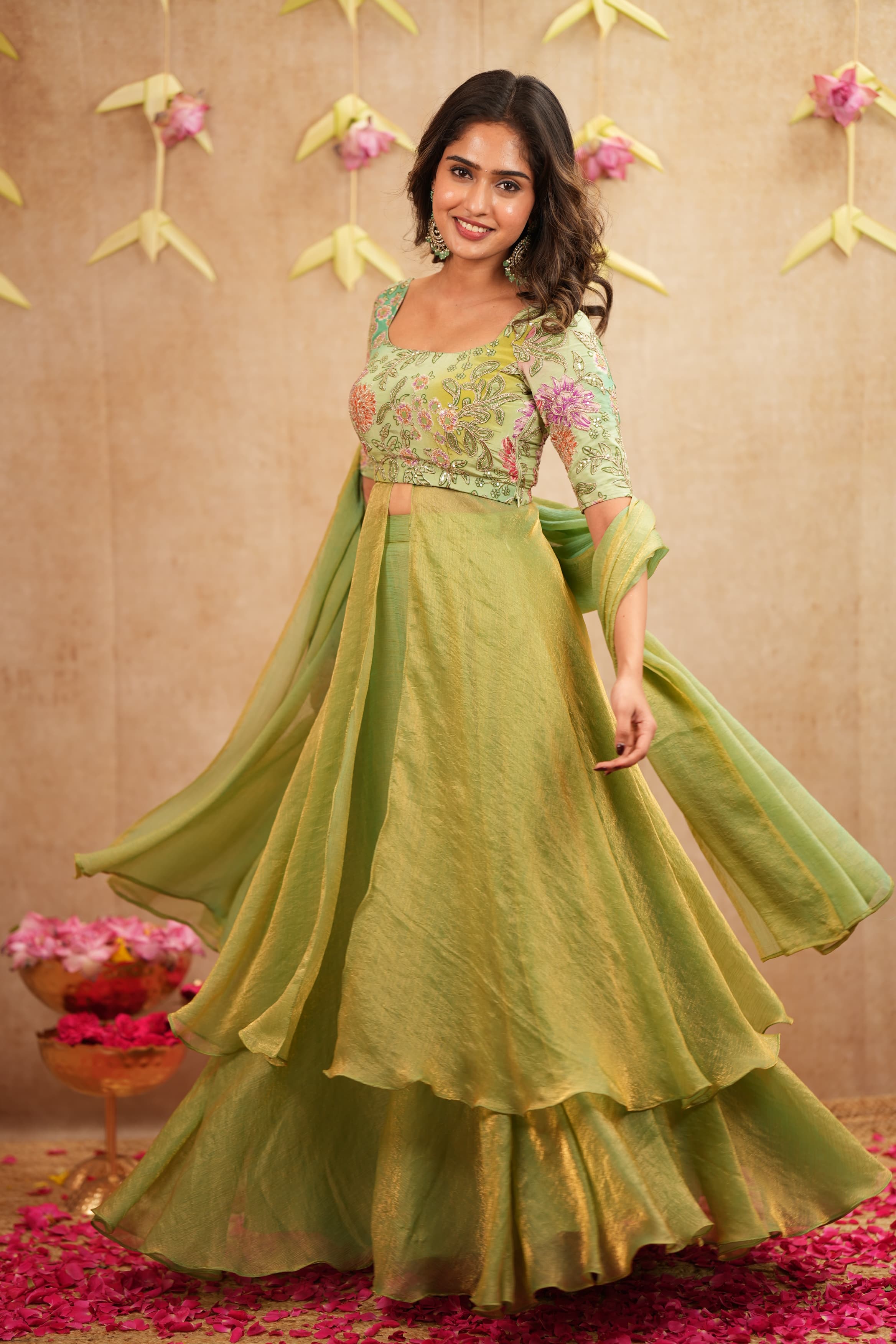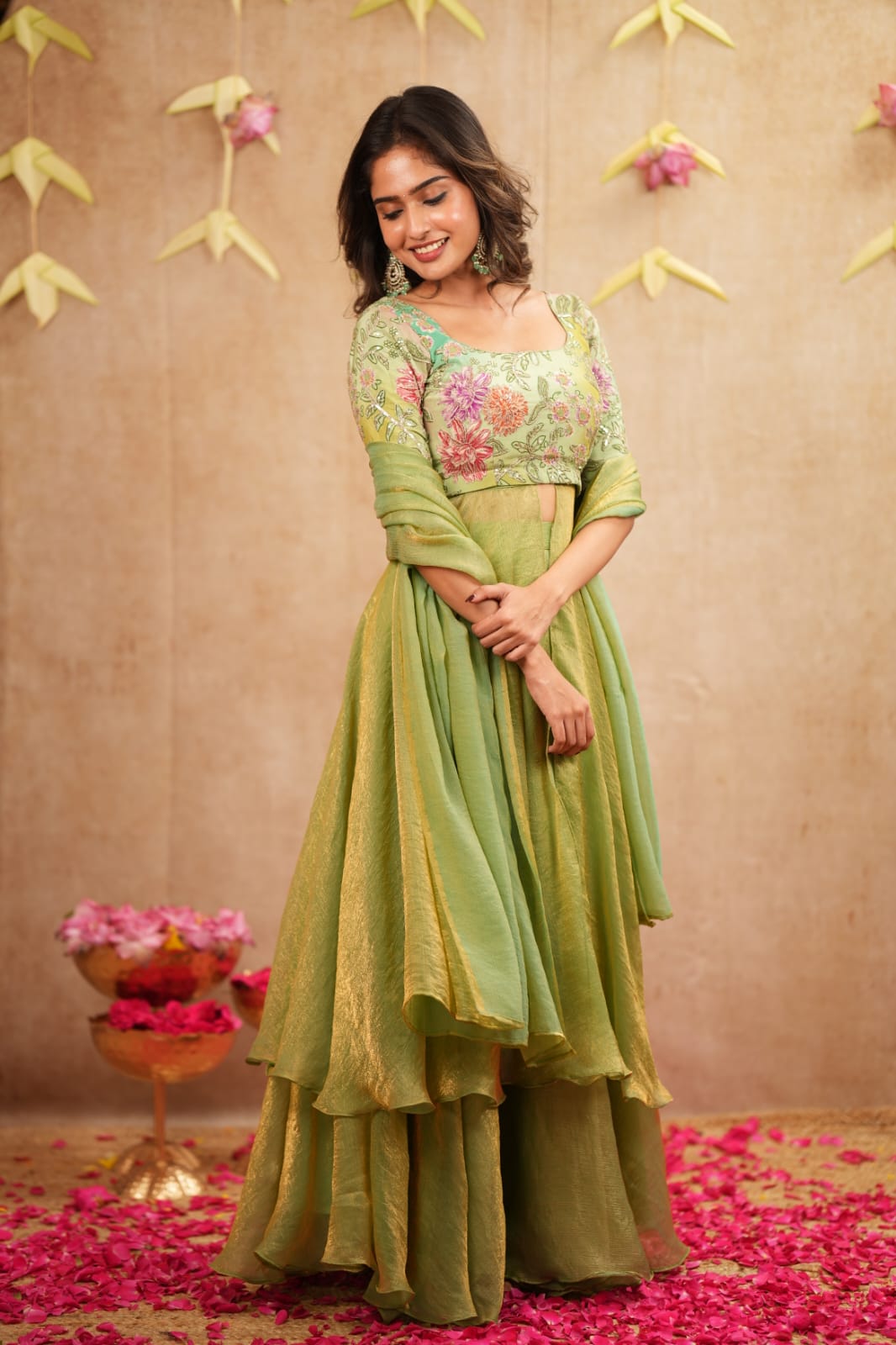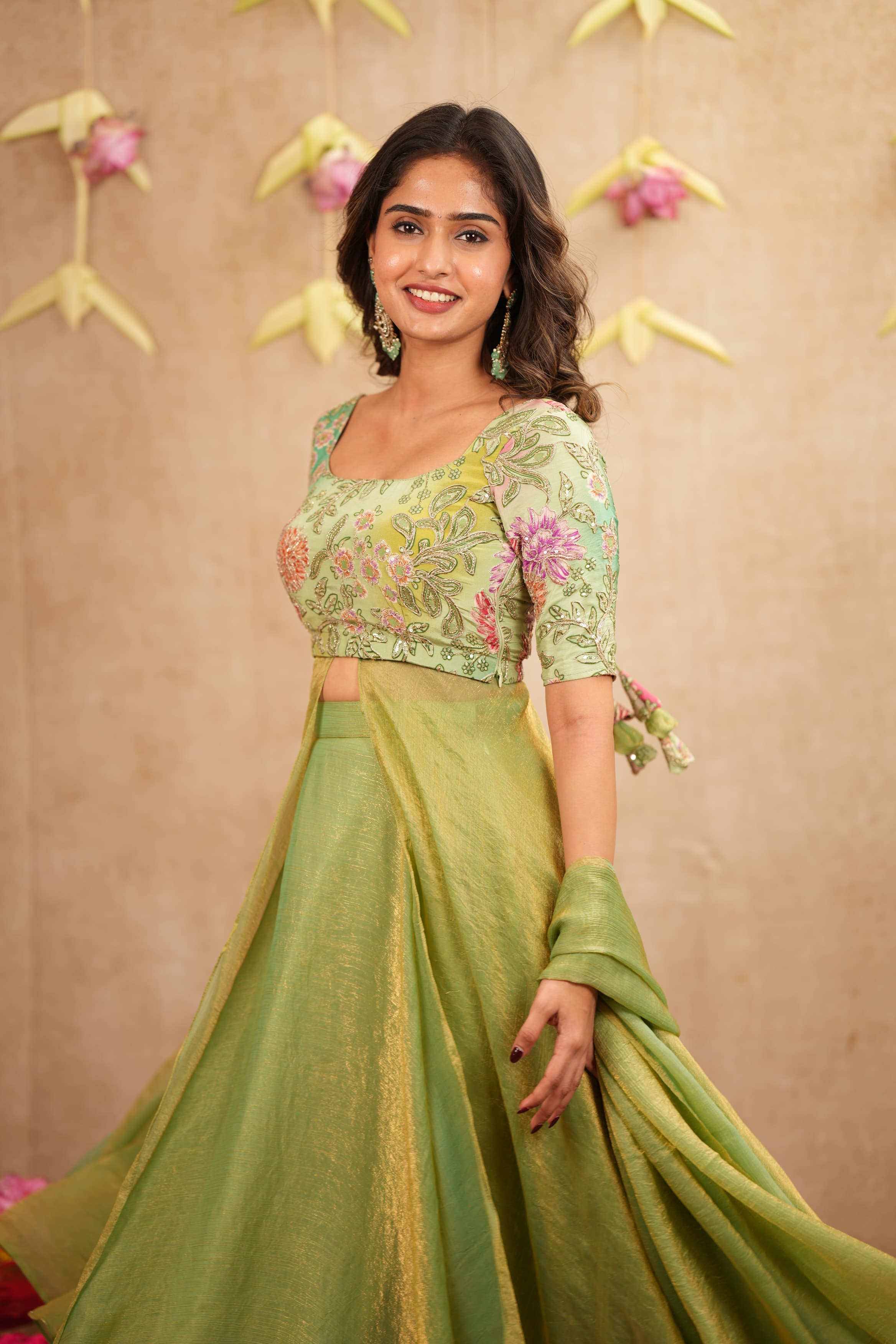Skirt: Made from premium crush tissue, the skirt flows effortlessly with every step. Its layered drape, natural shine, and lightweight fall give you a grand festive look without compromising on comfort — perfect for any celebration.
