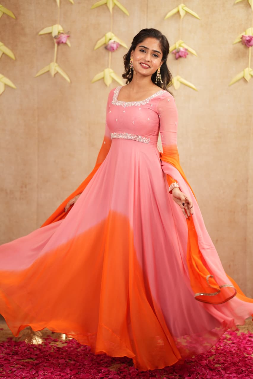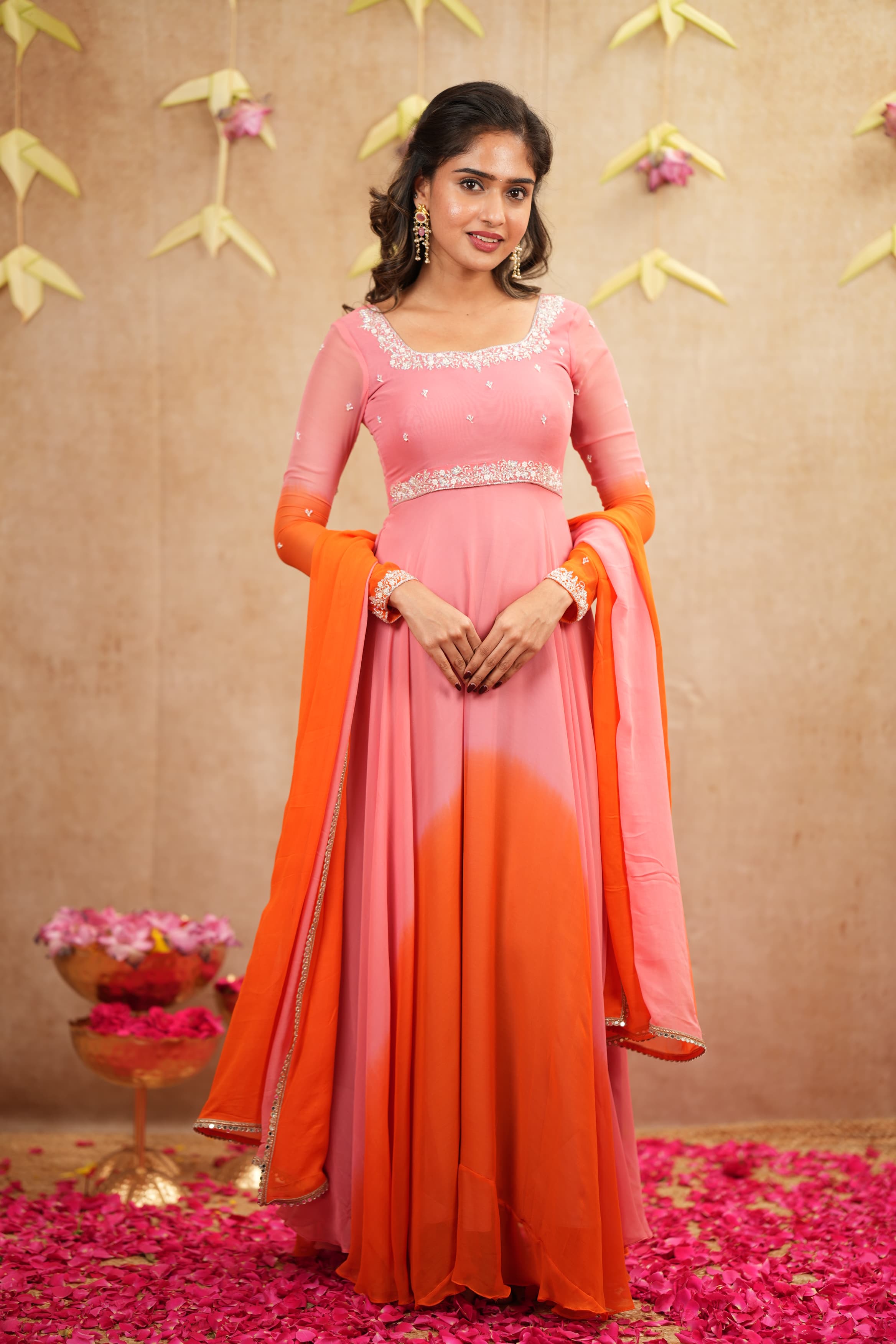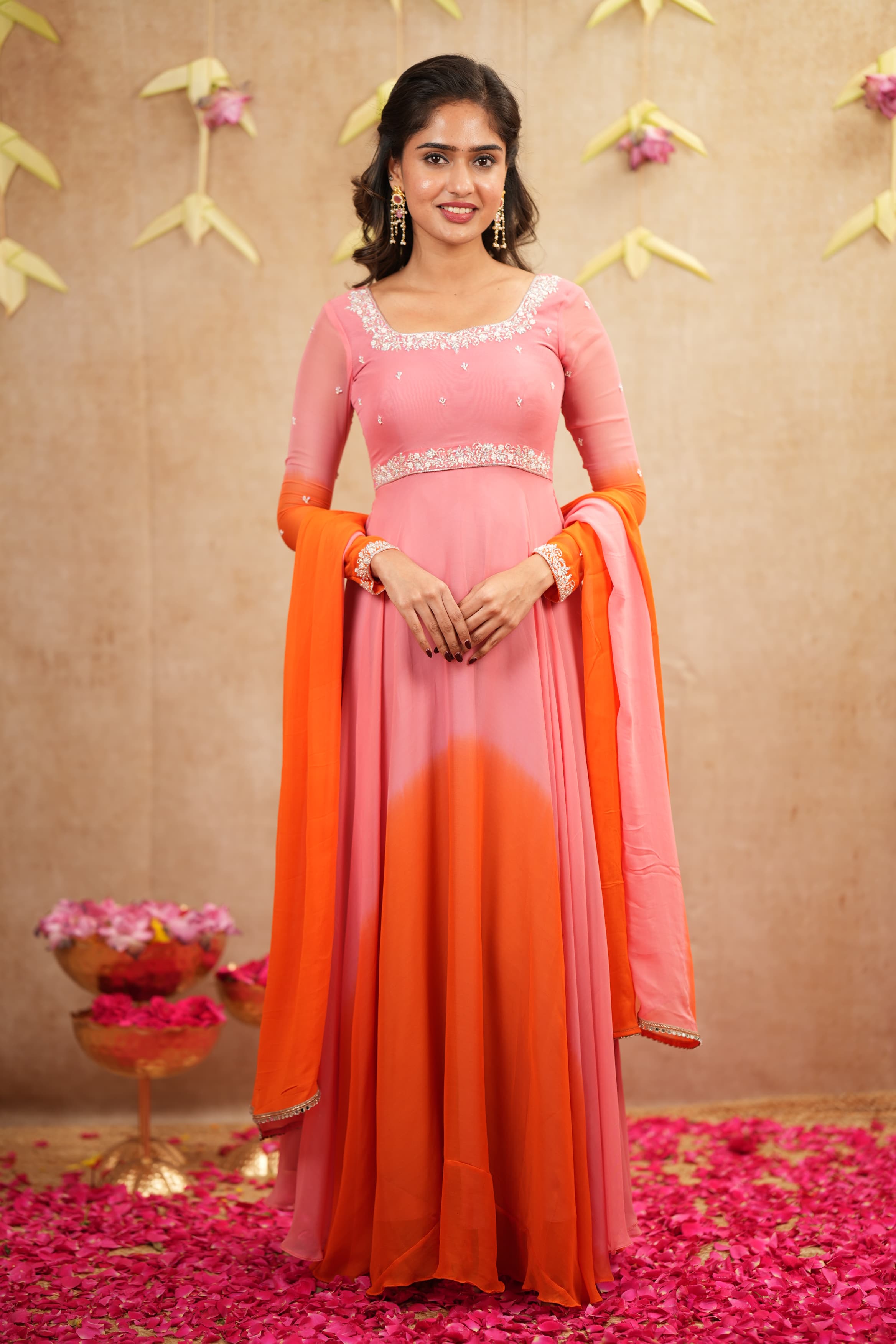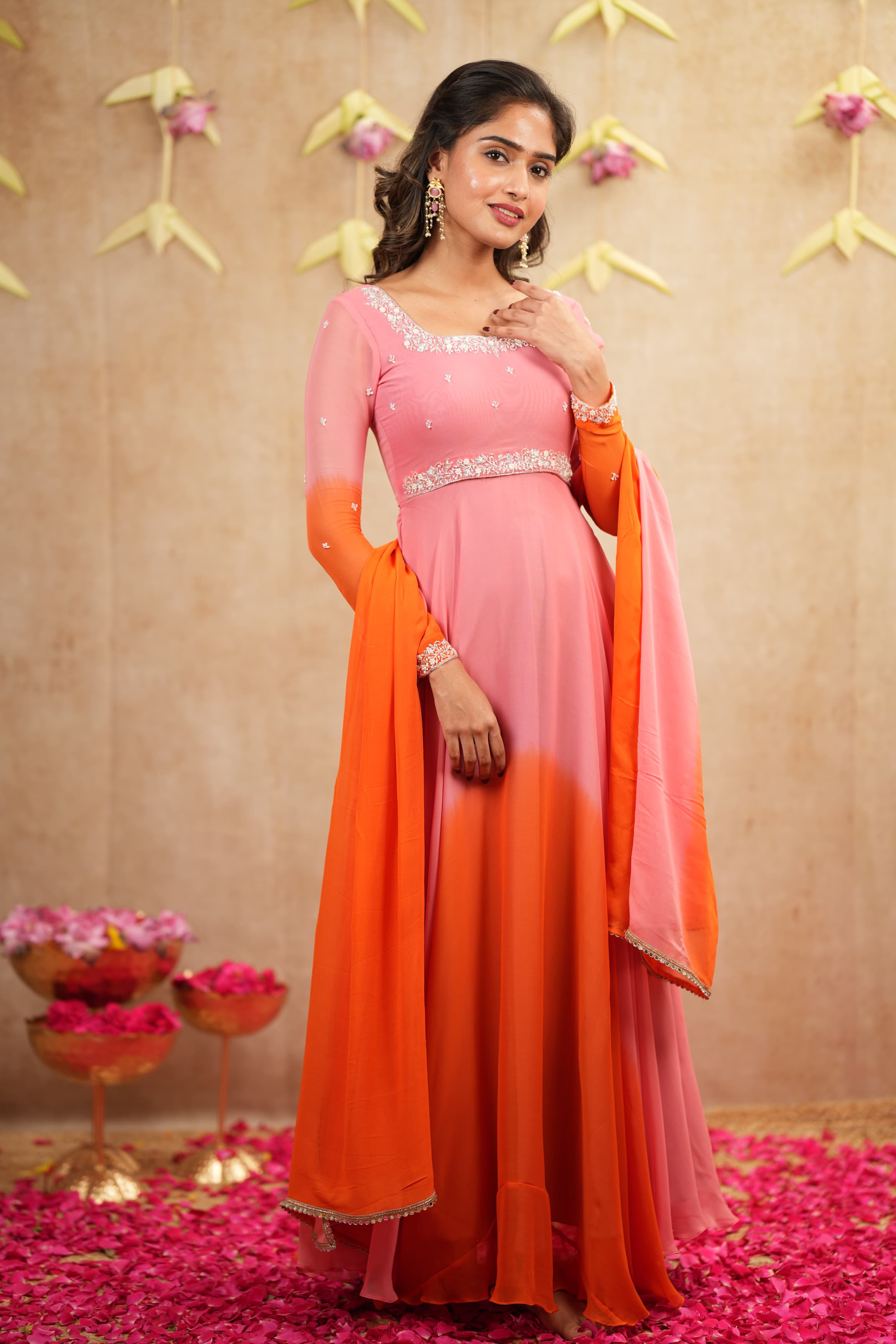 Made from luxurious georgette in a beautifully blended ombré finish, this Anarkali features elegant handwork detailing along the neckline and sleeves. The soft, flowy silhouette, graceful fall, and vibrant colour transition add a dreamy charm to every step — making it the perfect blend of festive elegance and modern style.