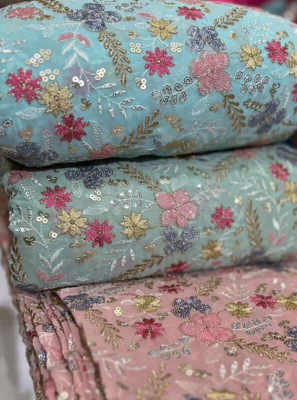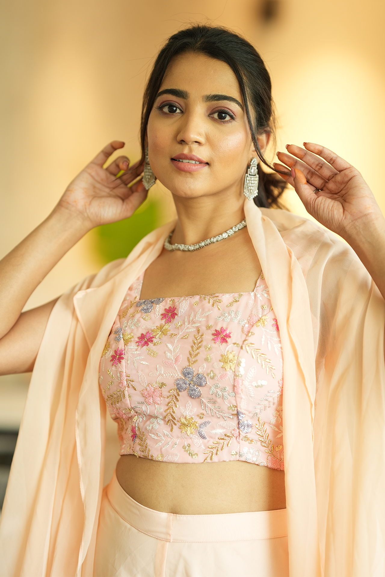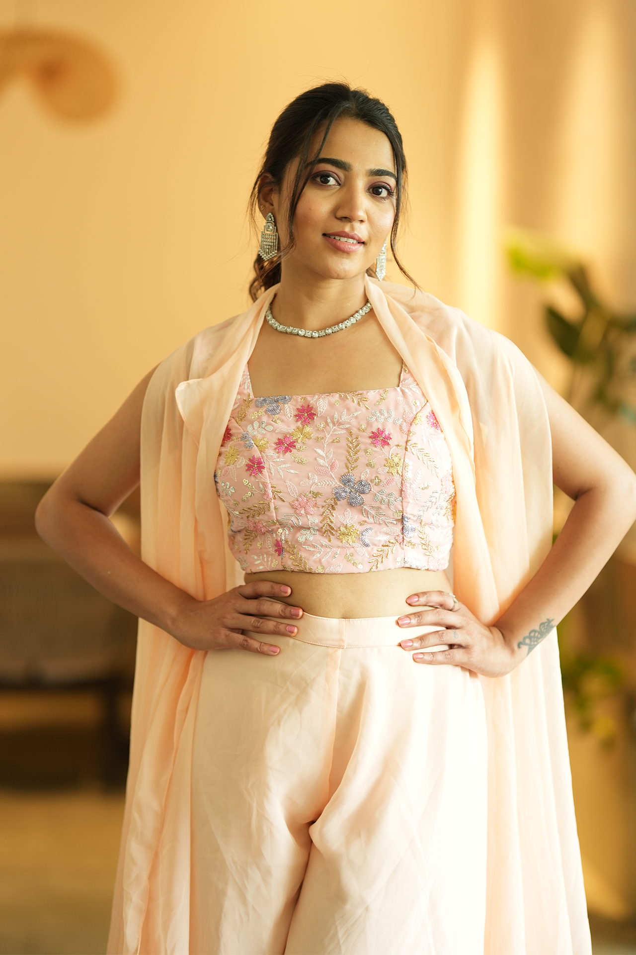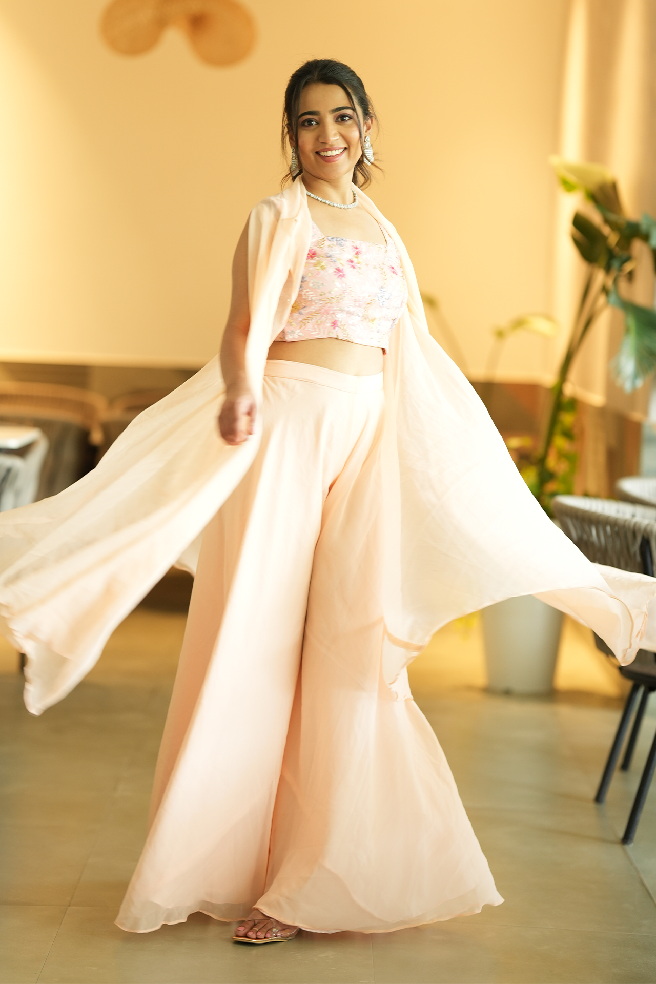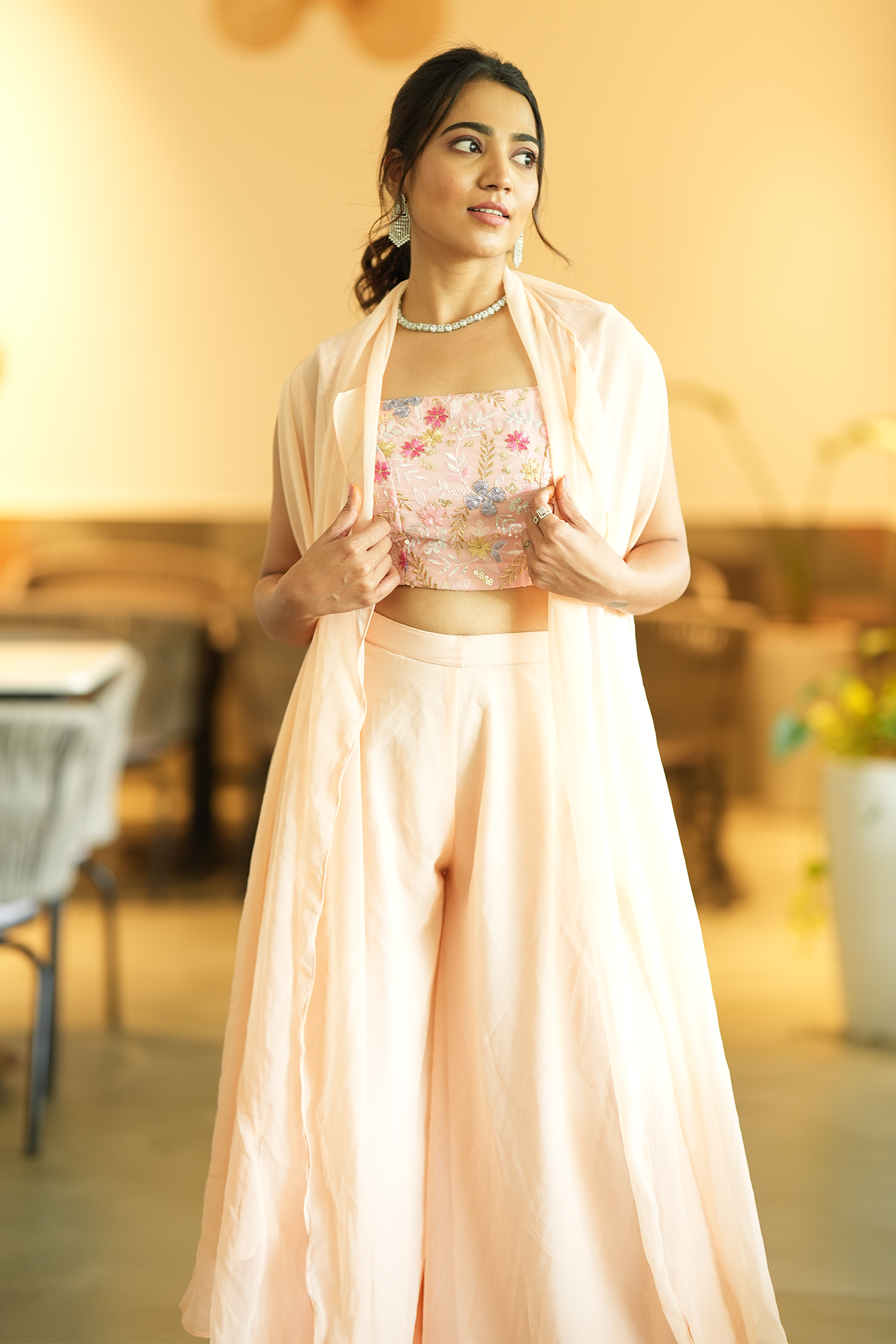 Fabric: Embroidery georgette fabric as crop top and palazzo pants and shrug.