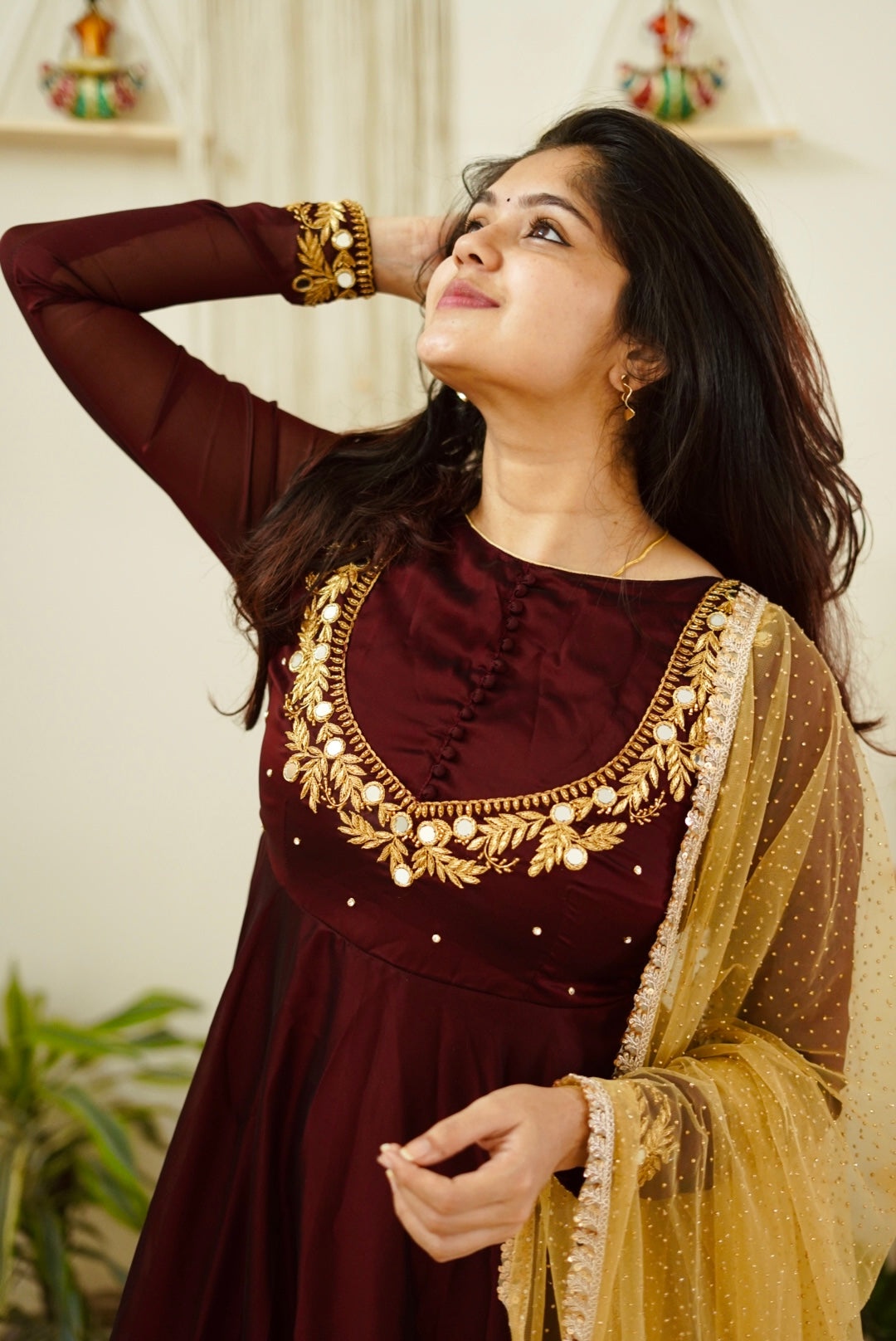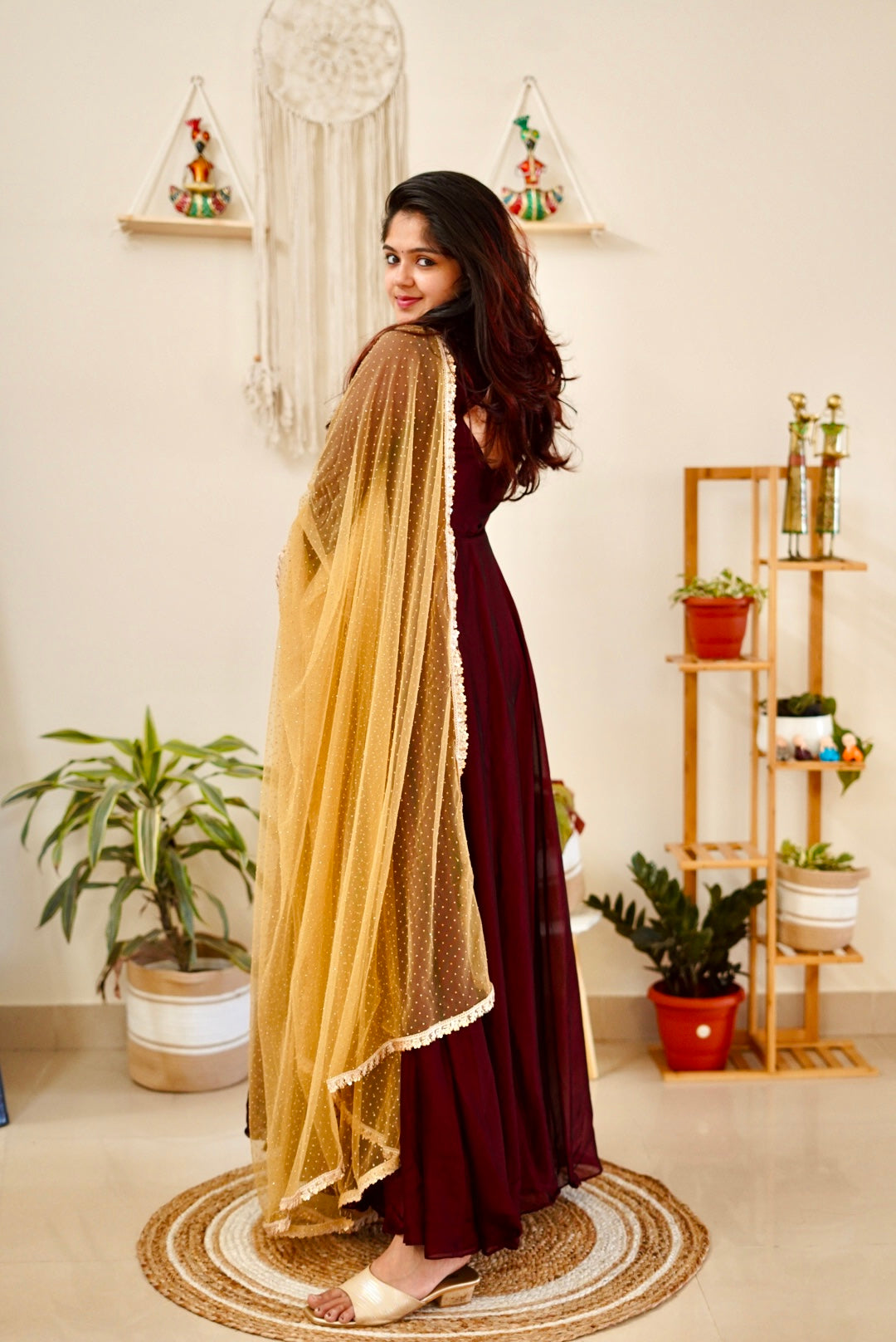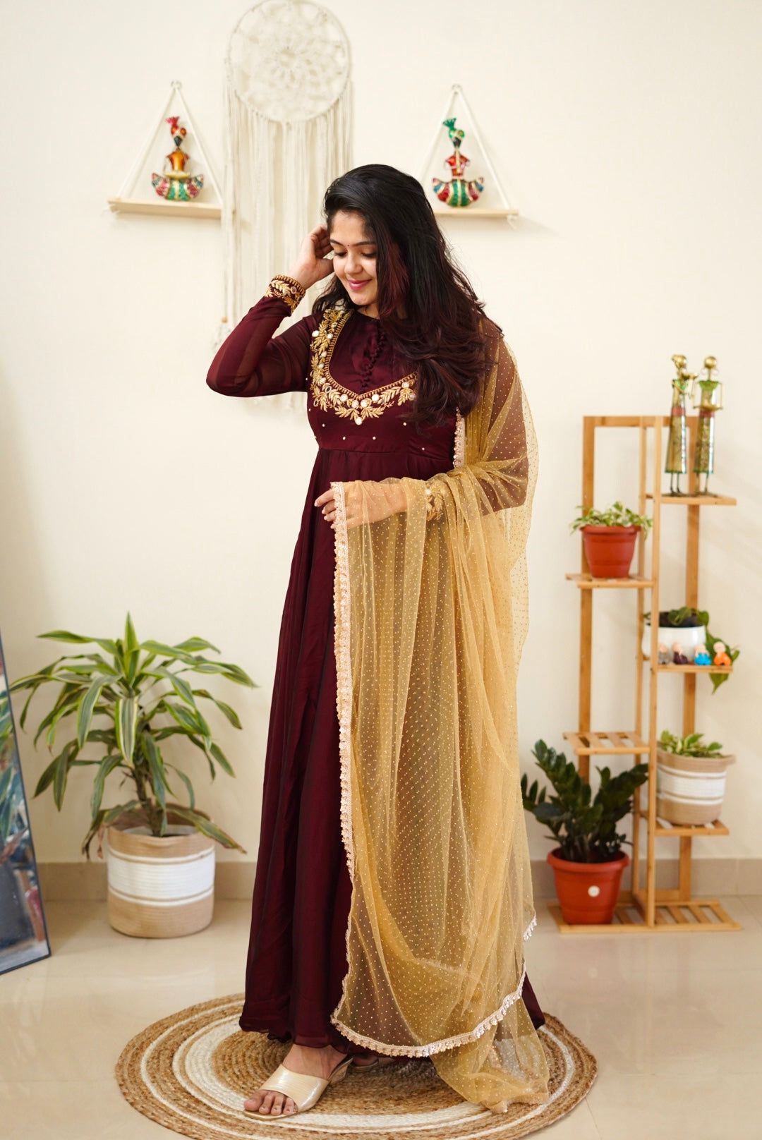 - Beautiful coffee brown anarkali with golden Dupatta.