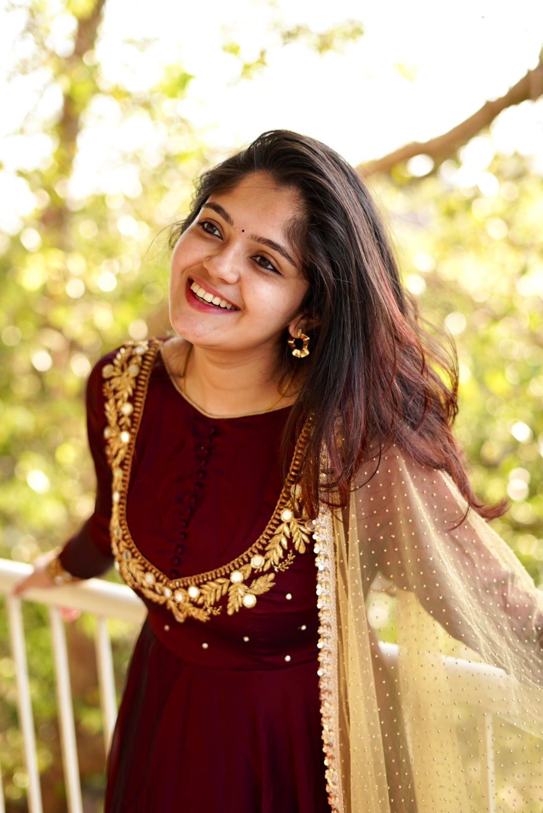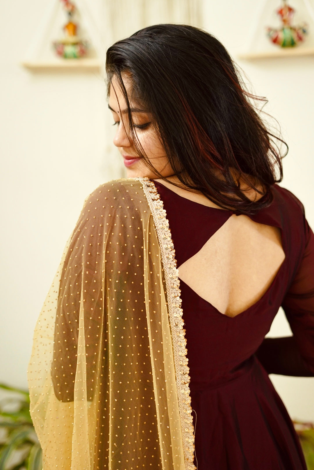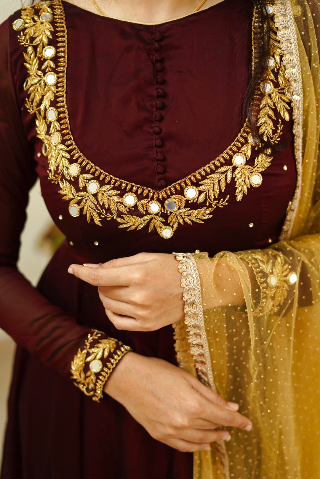 - Beautiful coffee brown anarkali with golden Dupatta.