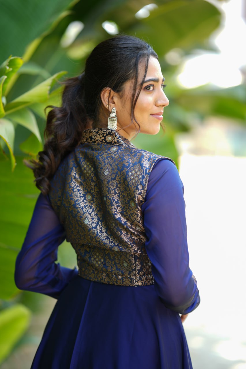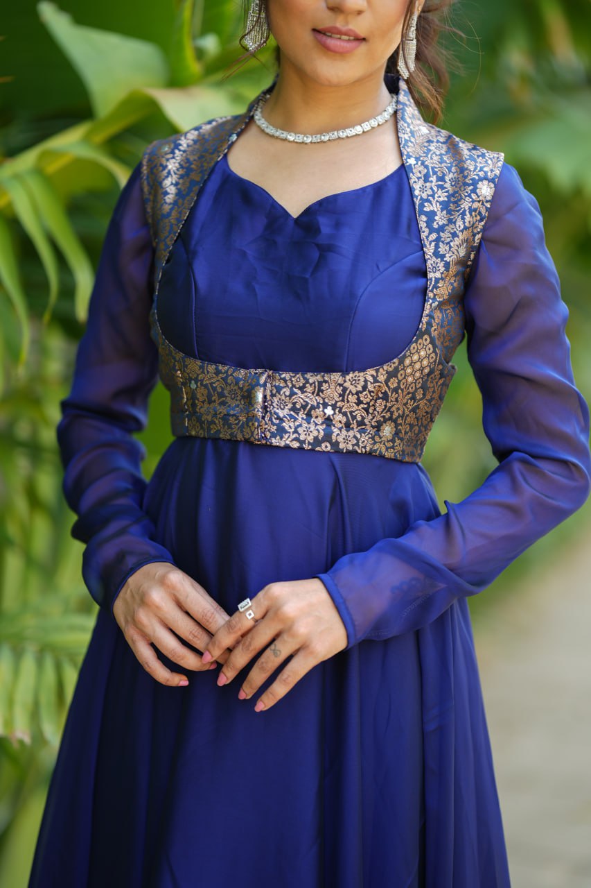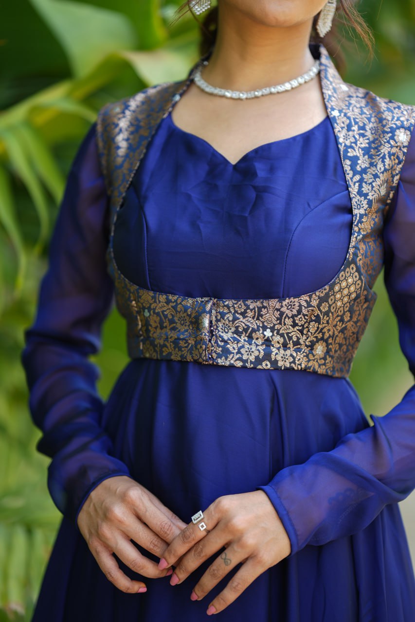 The versatile two-in-one dress can be worn with or without the banaras coat, making it perfect for festive occasions, wedding functions