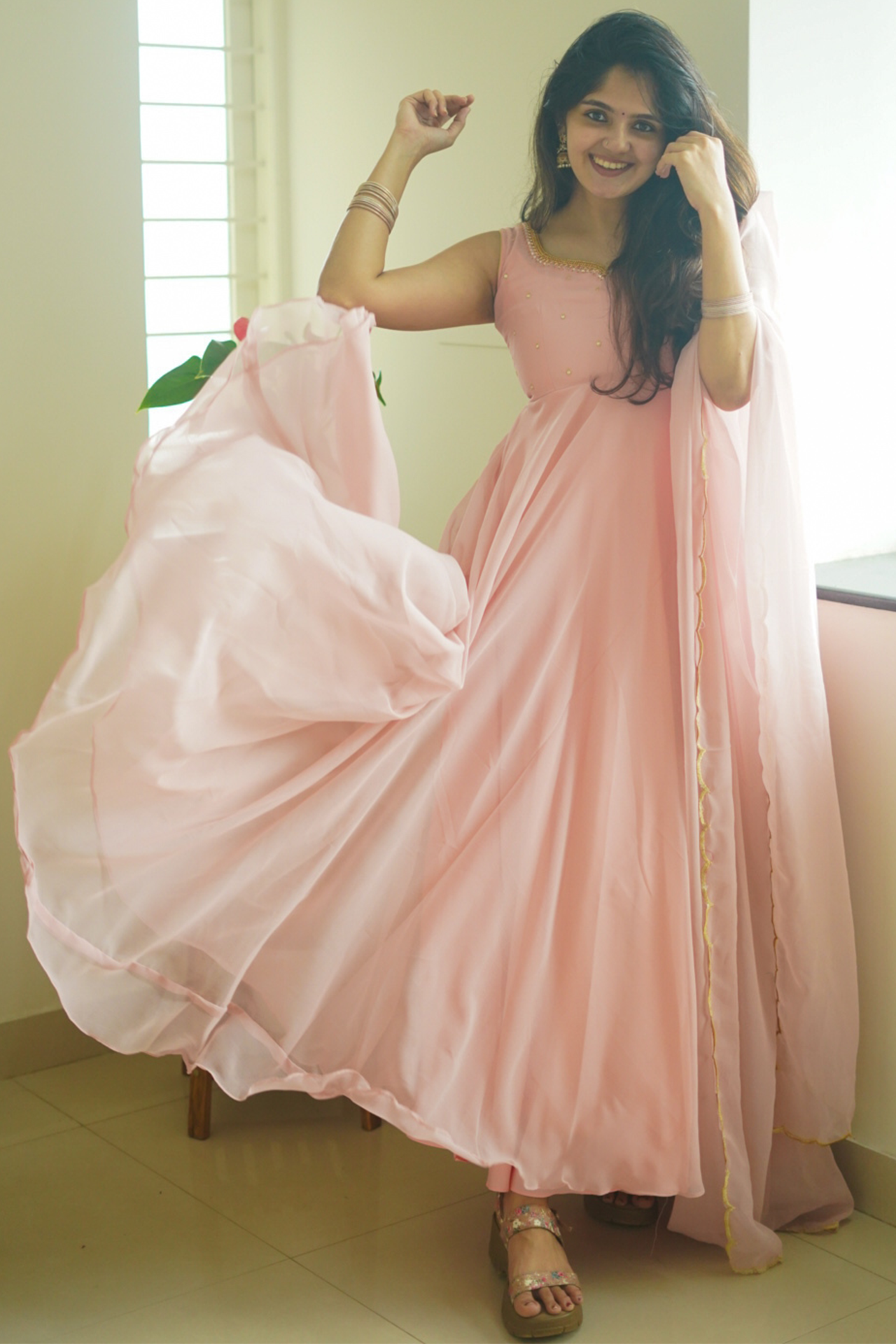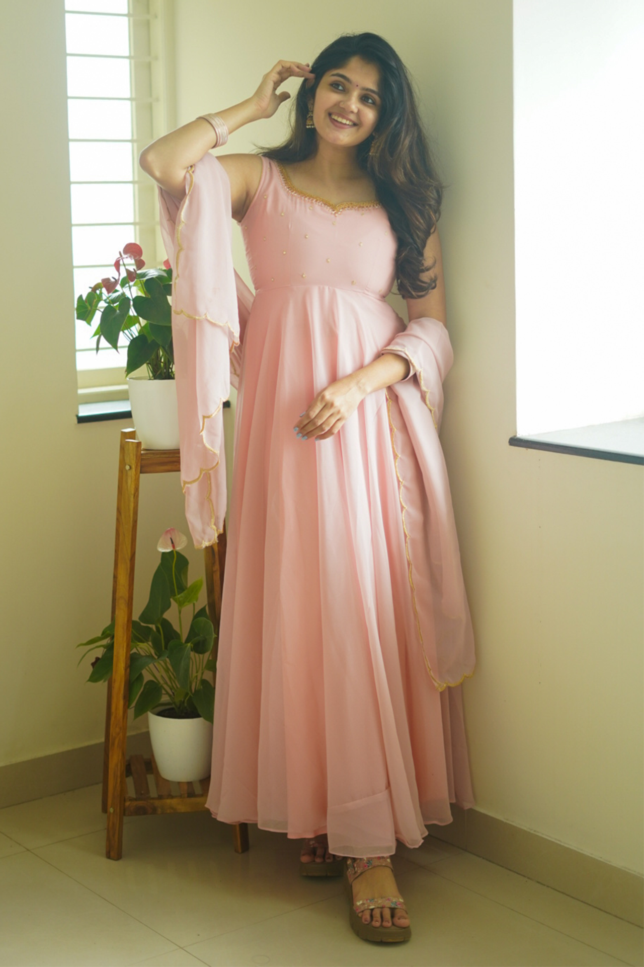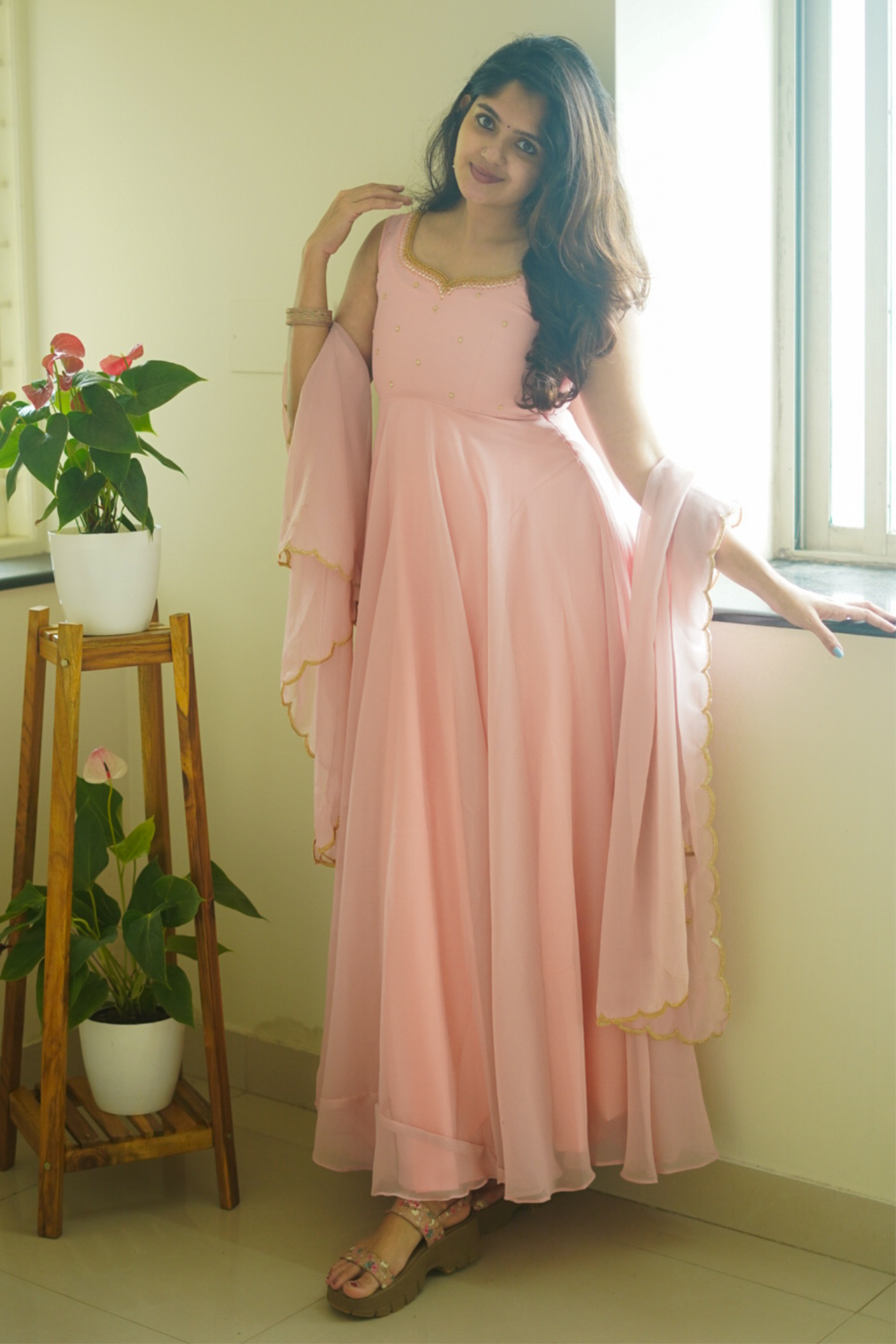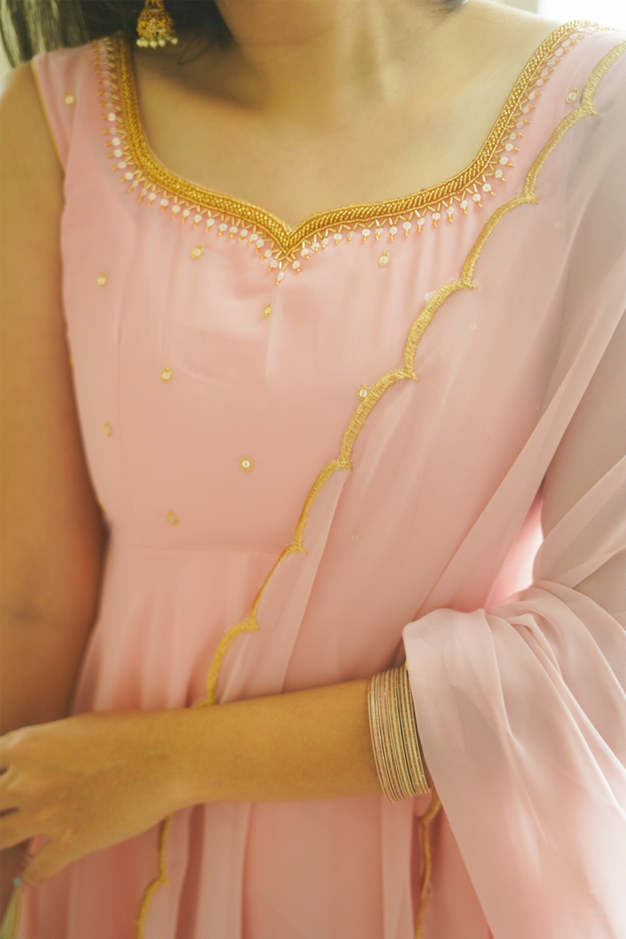Fabric: Beautiful pastel peach color Anarkali with scallop border dupatta