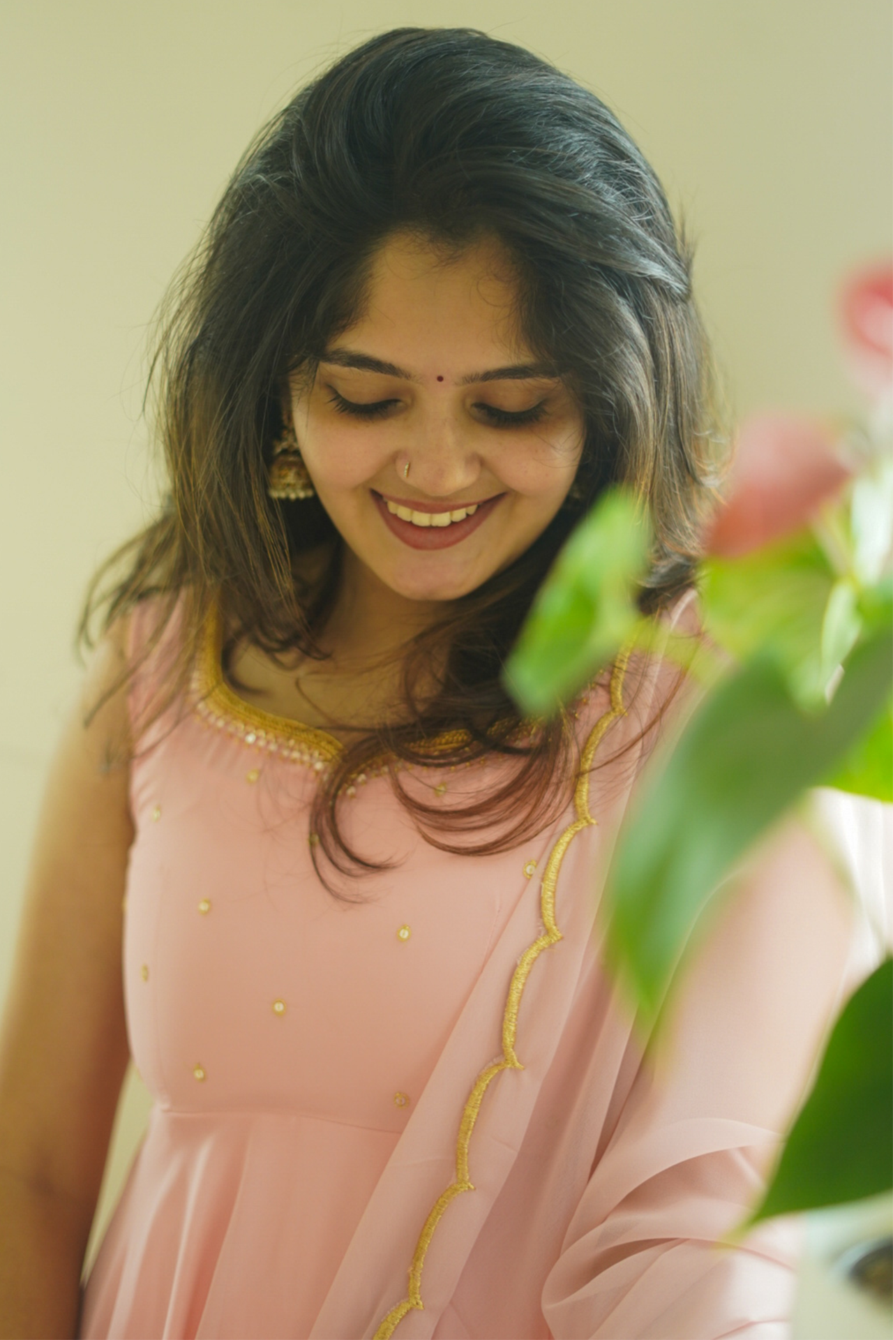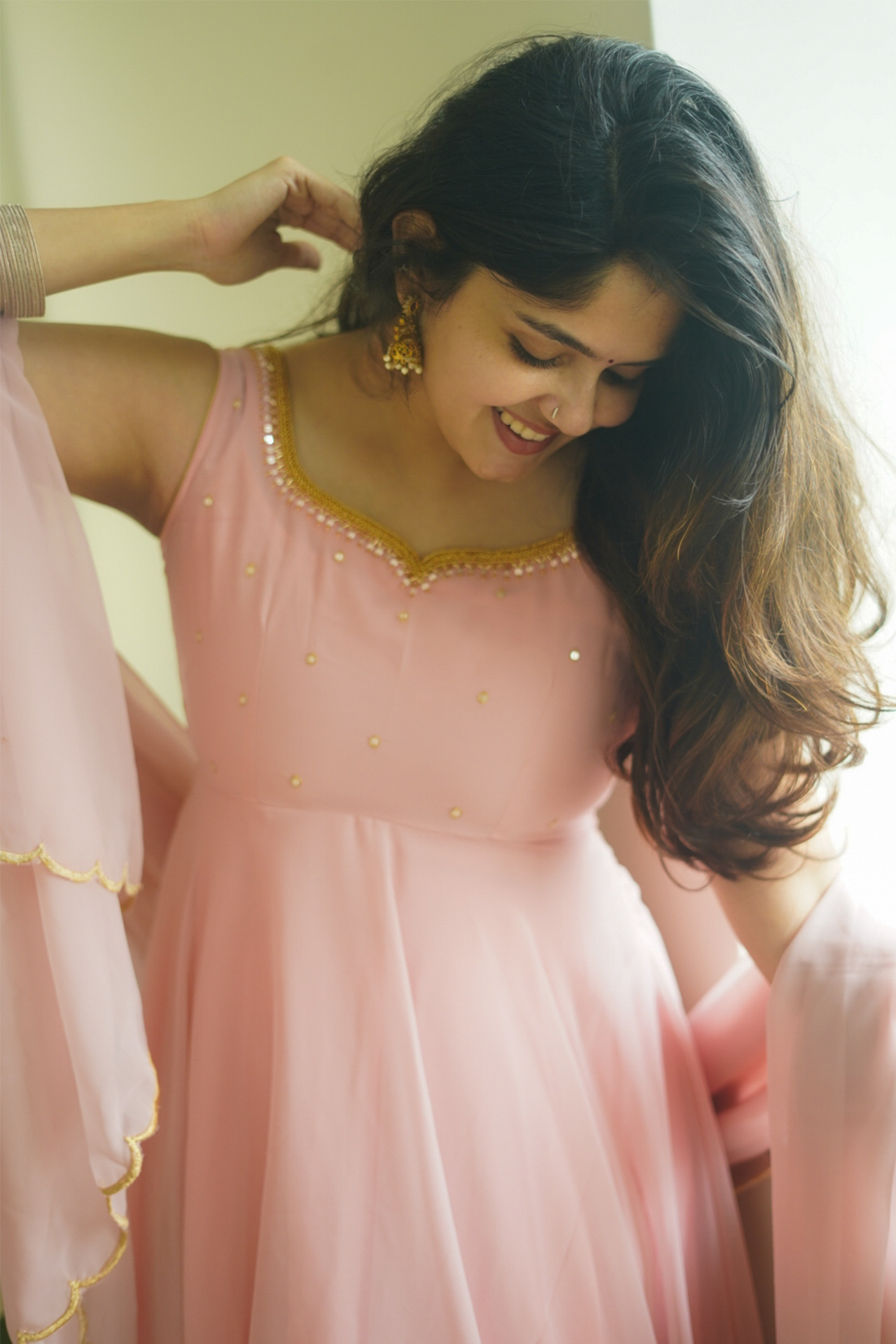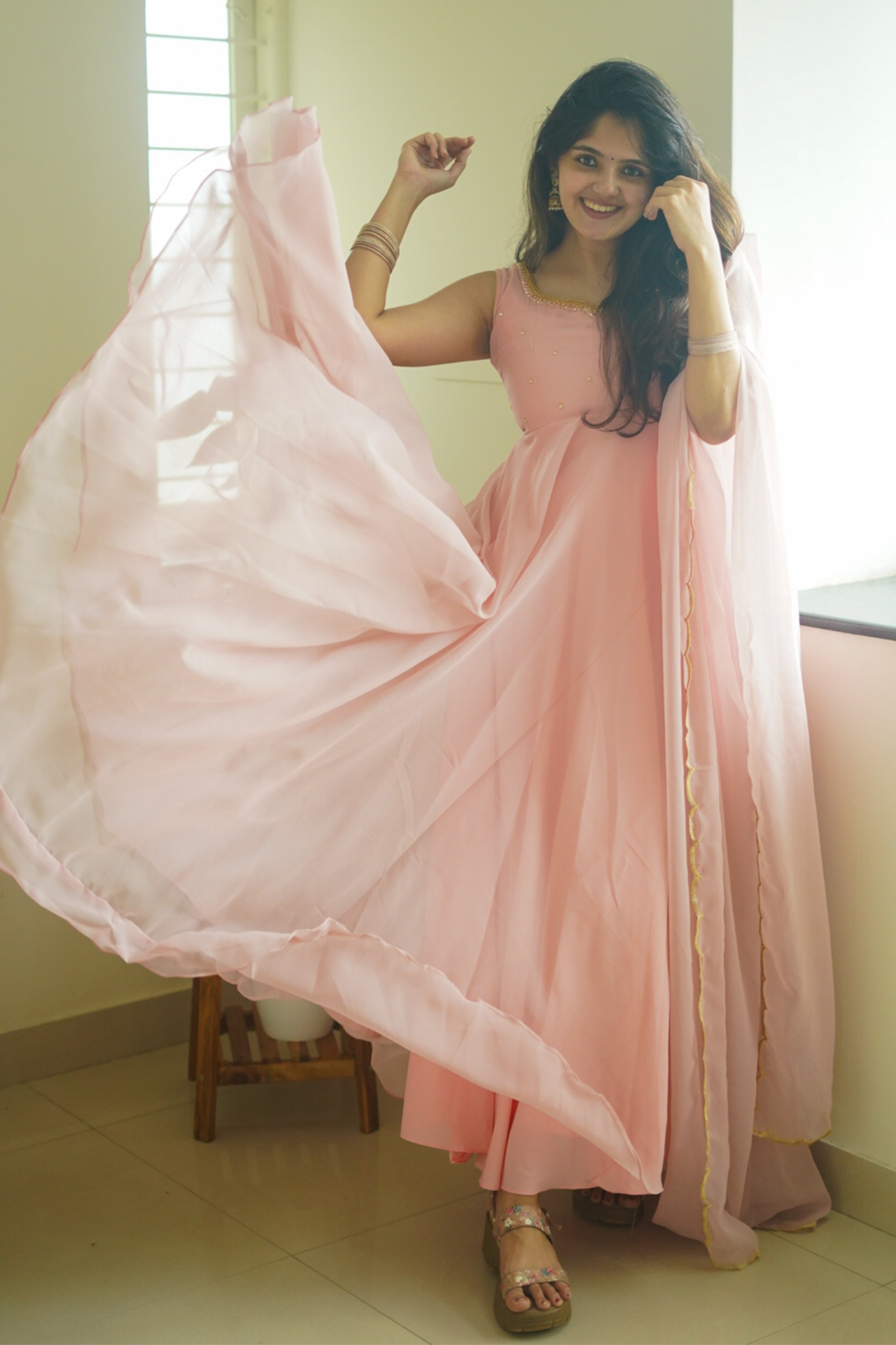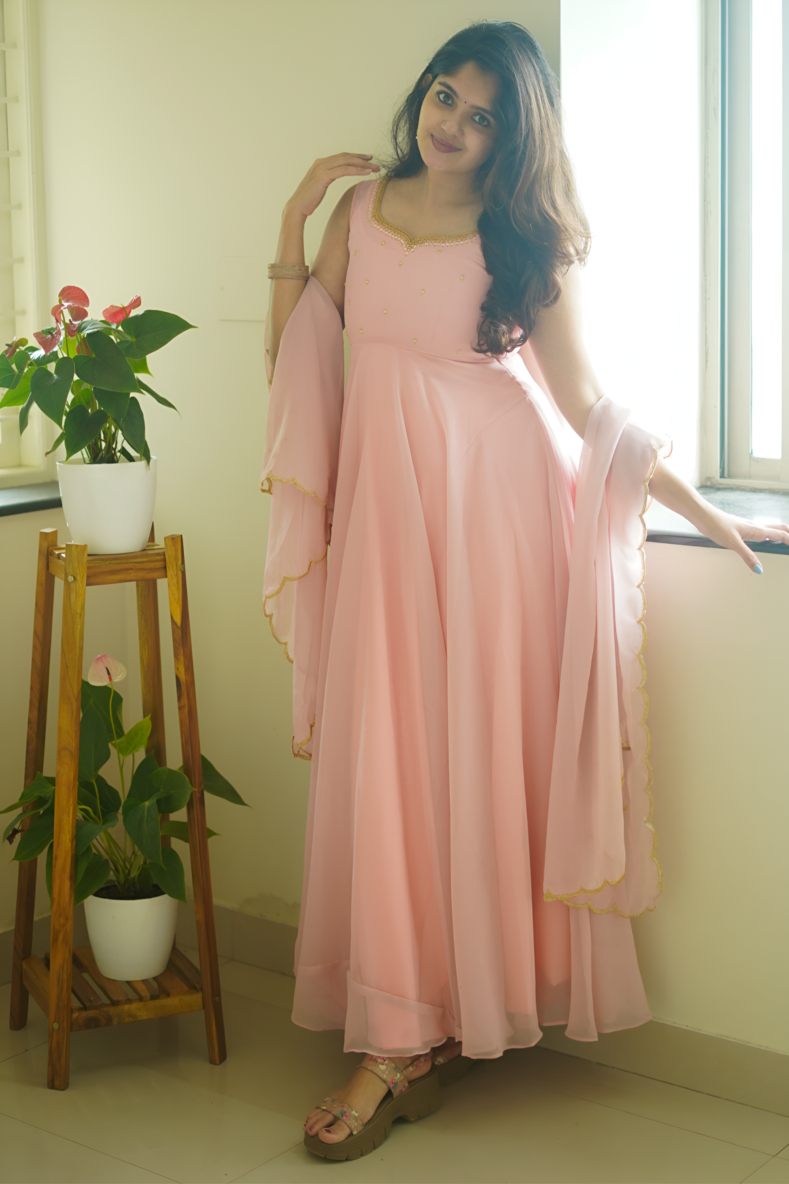 Fabric: Beautiful pastel peach color Anarkali with scallop border dupatta