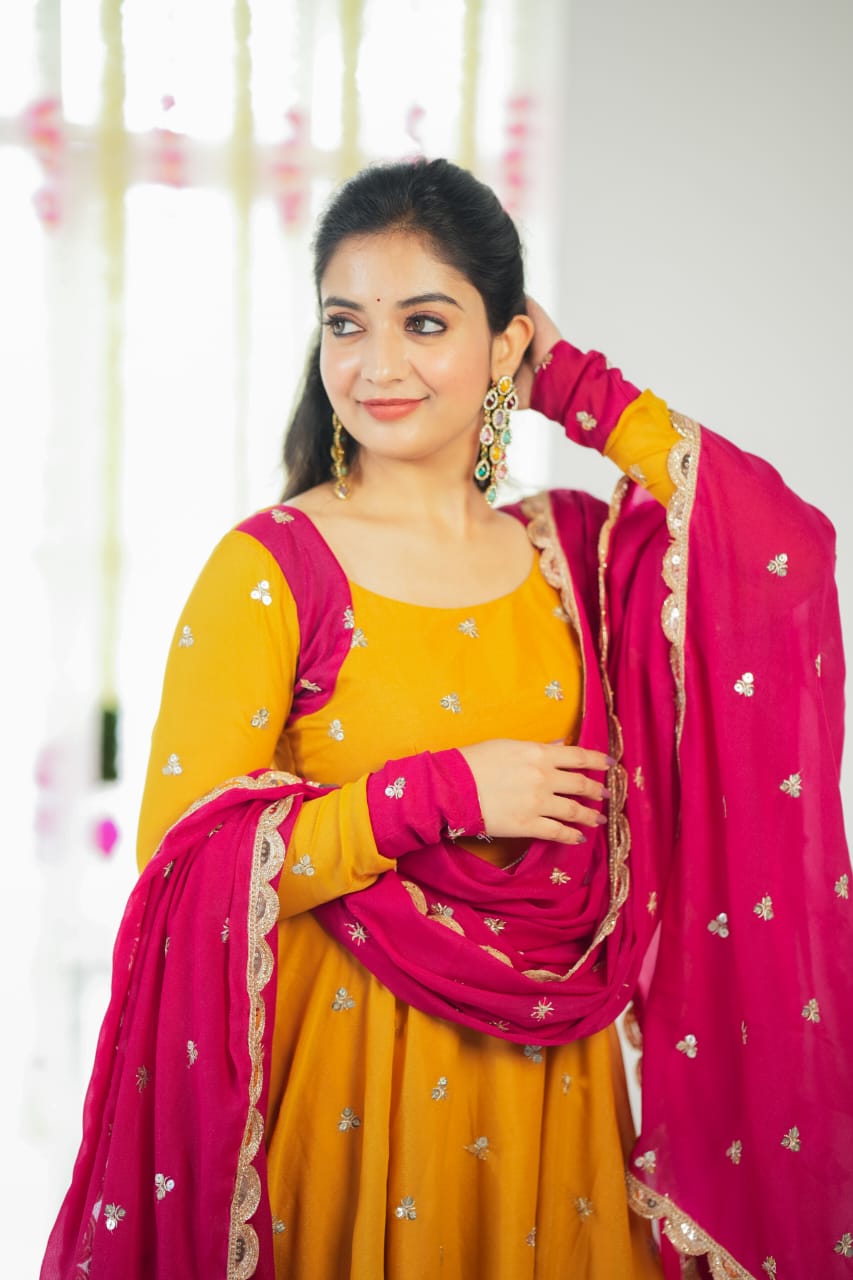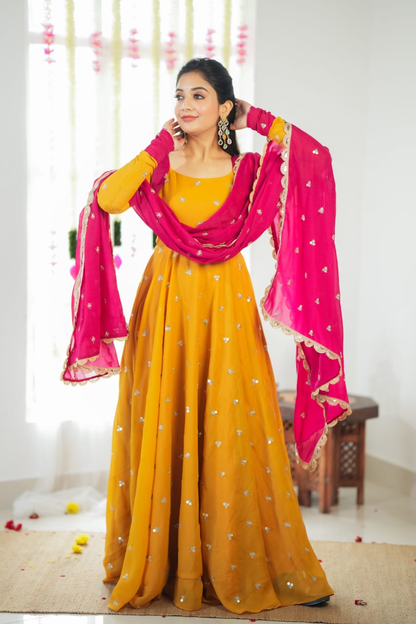 This stunning outfit is a recreation of the elegant style from the latest Goat movie. While Trisha wore a beautiful saree in one of the popular songs, we’ve taken inspiration to create this gorgeous Anarkali version, crafted with soft georgette fabric. The vibrant yellow and pink combination adds a festive and glamorous touch to your wardrobe!
