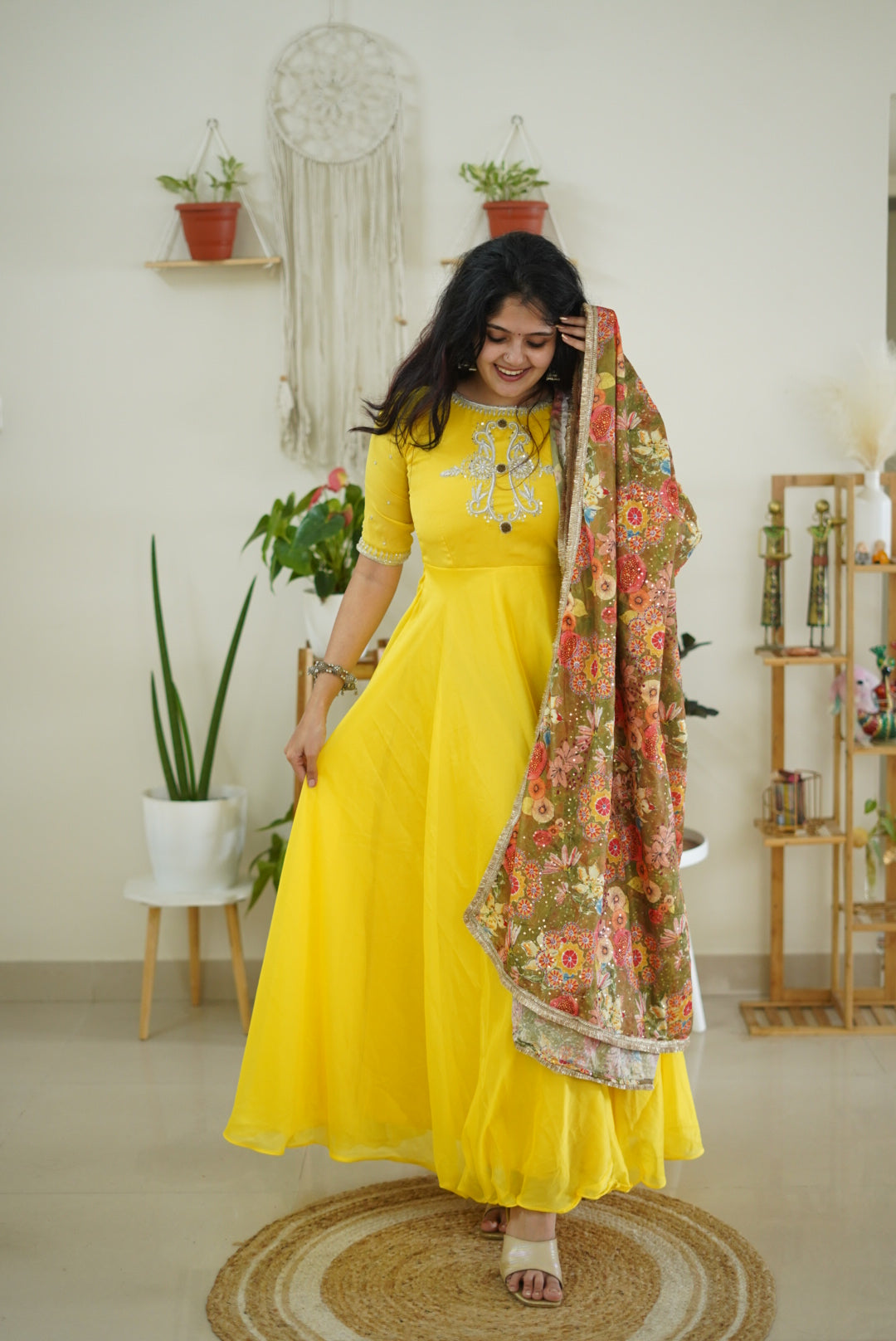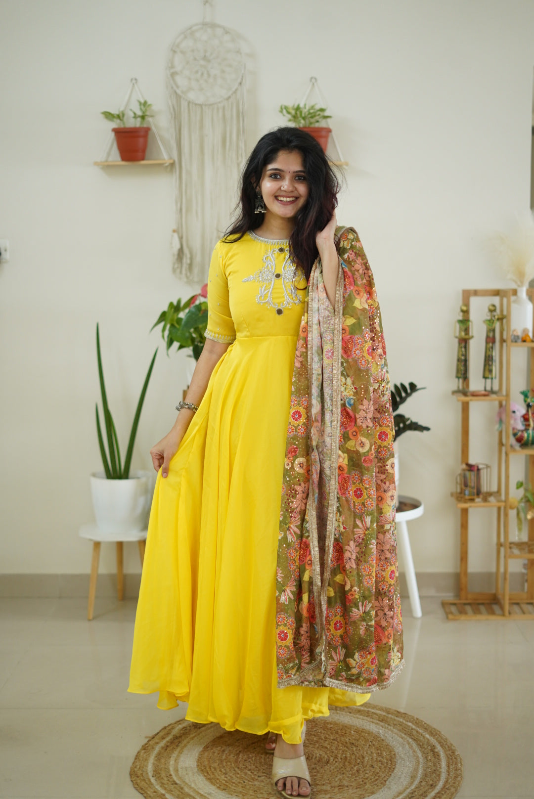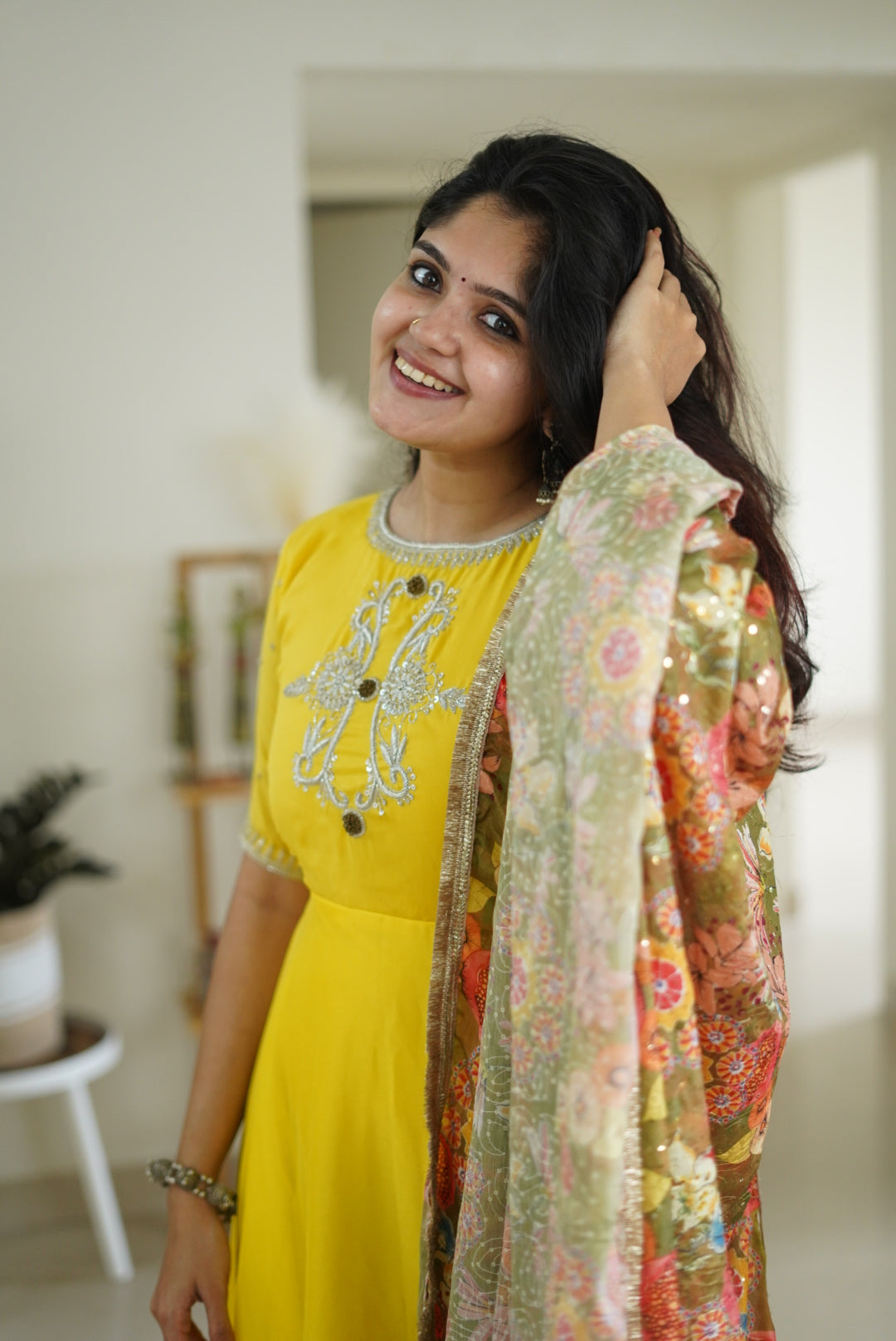 Style Tip: Complete your look by draping a floral embroidered dupatta to enhance the charm. Pair it with statement jhumkas and soft curls for an effortlessly chic appearance. With customizable color options, you can choose any shade to complement your unique style!
