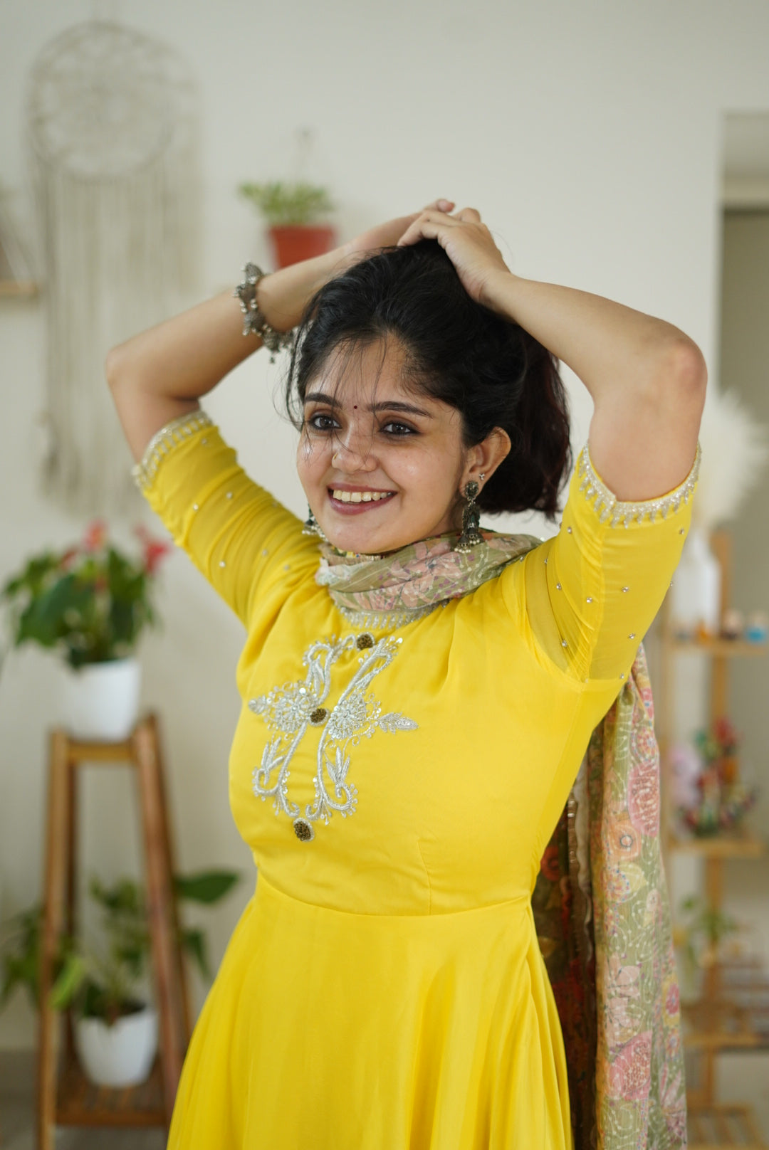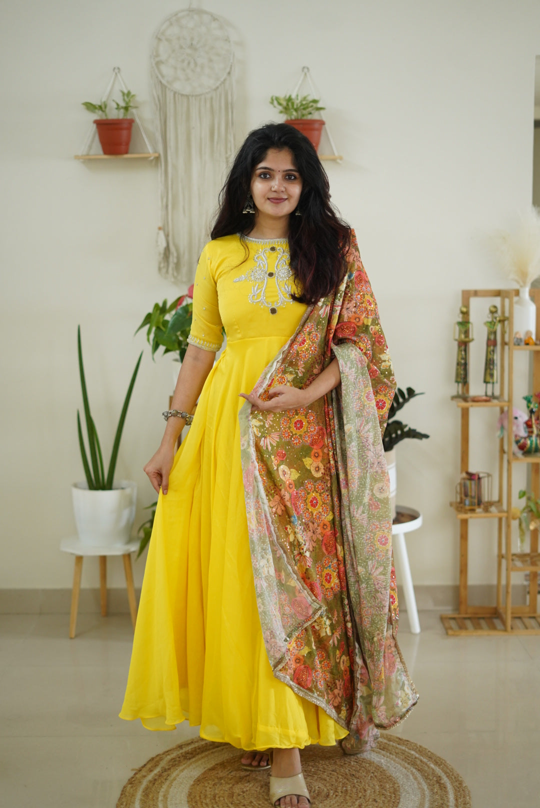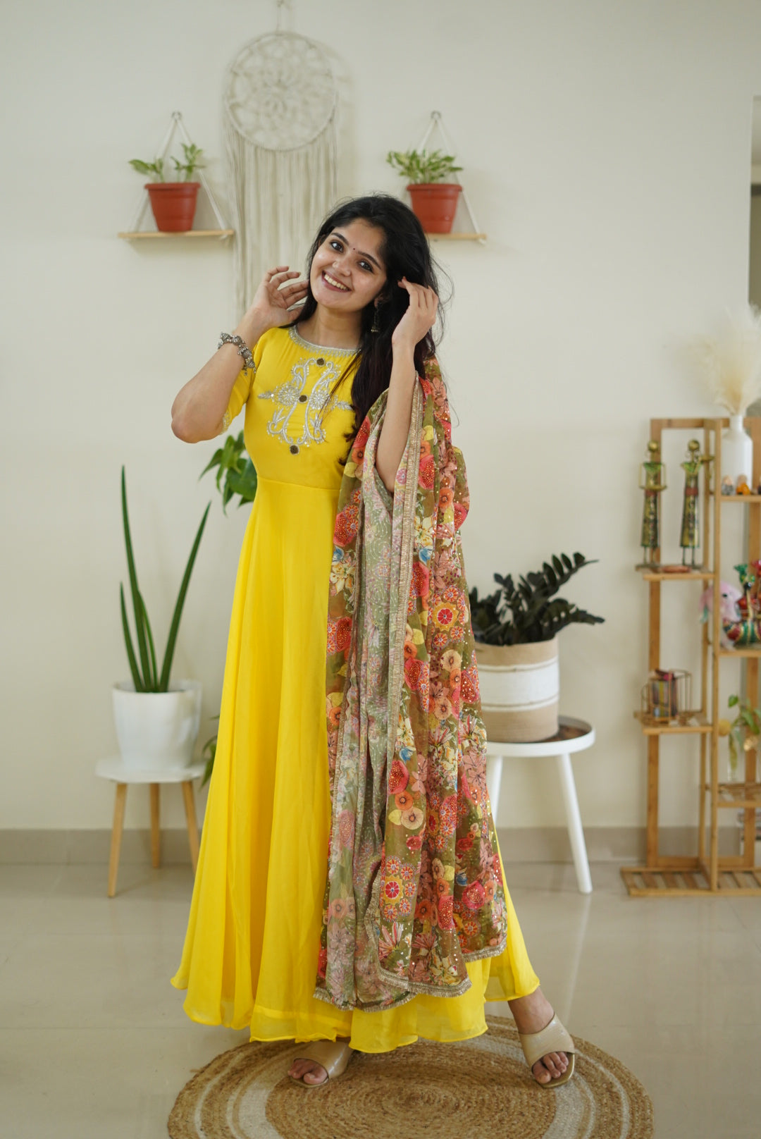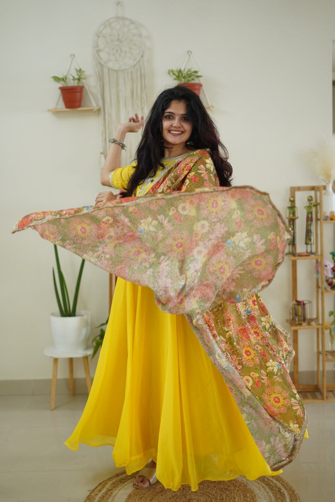 Style Tip: Complete your look by draping a floral embroidered dupatta to enhance the charm. Pair it with statement jhumkas and soft curls for an effortlessly chic appearance. With customizable color options, you can choose any shade to complement your unique style!