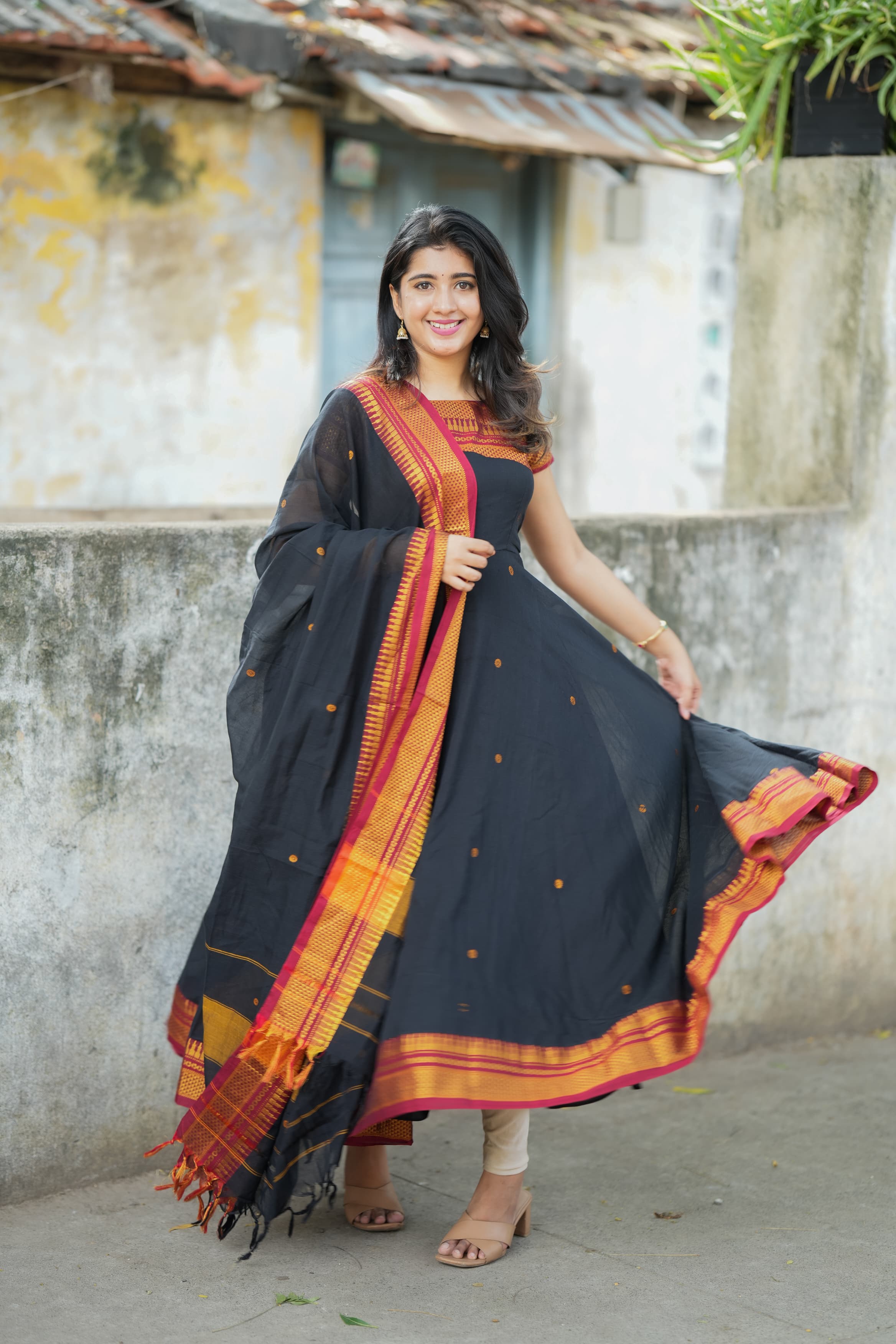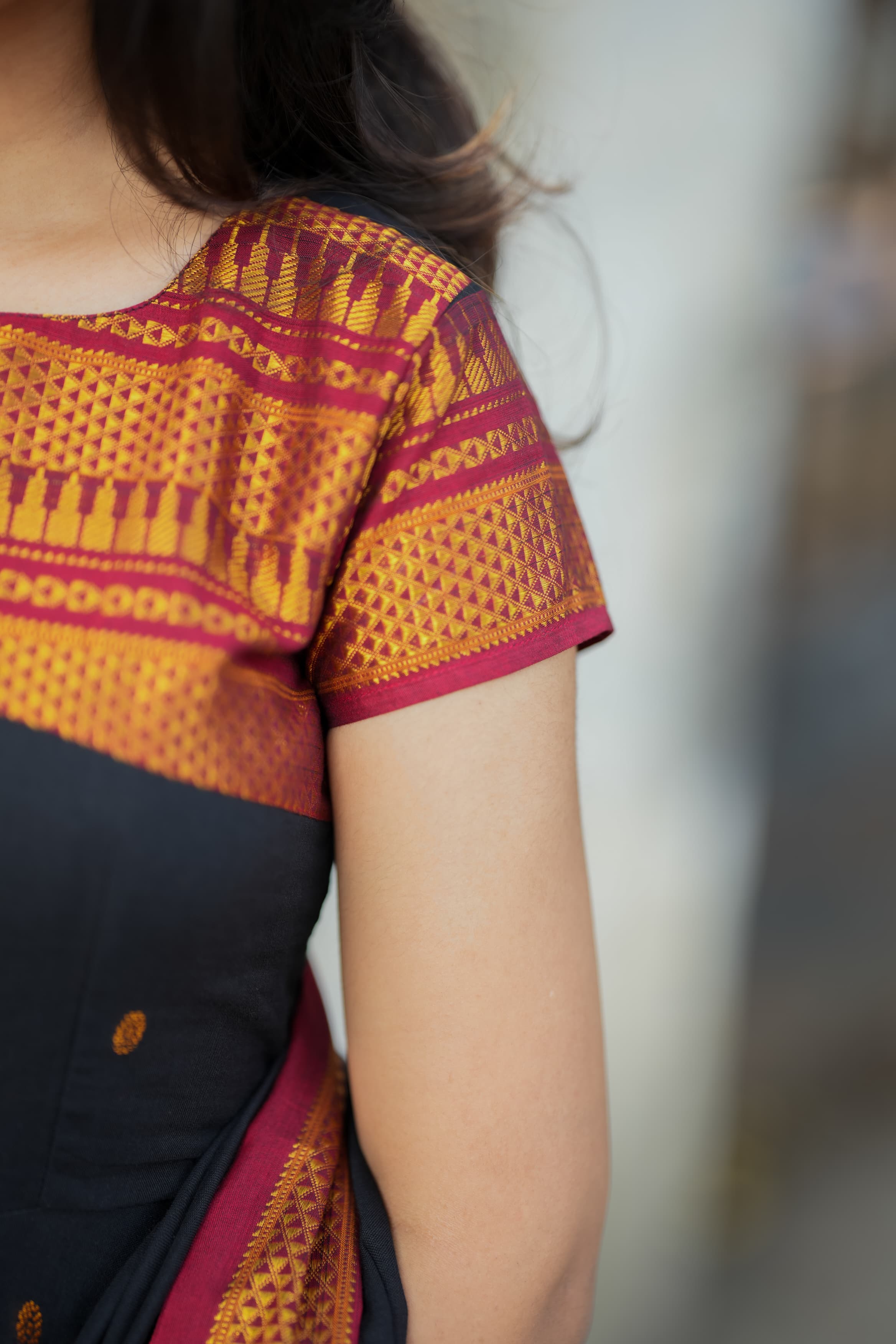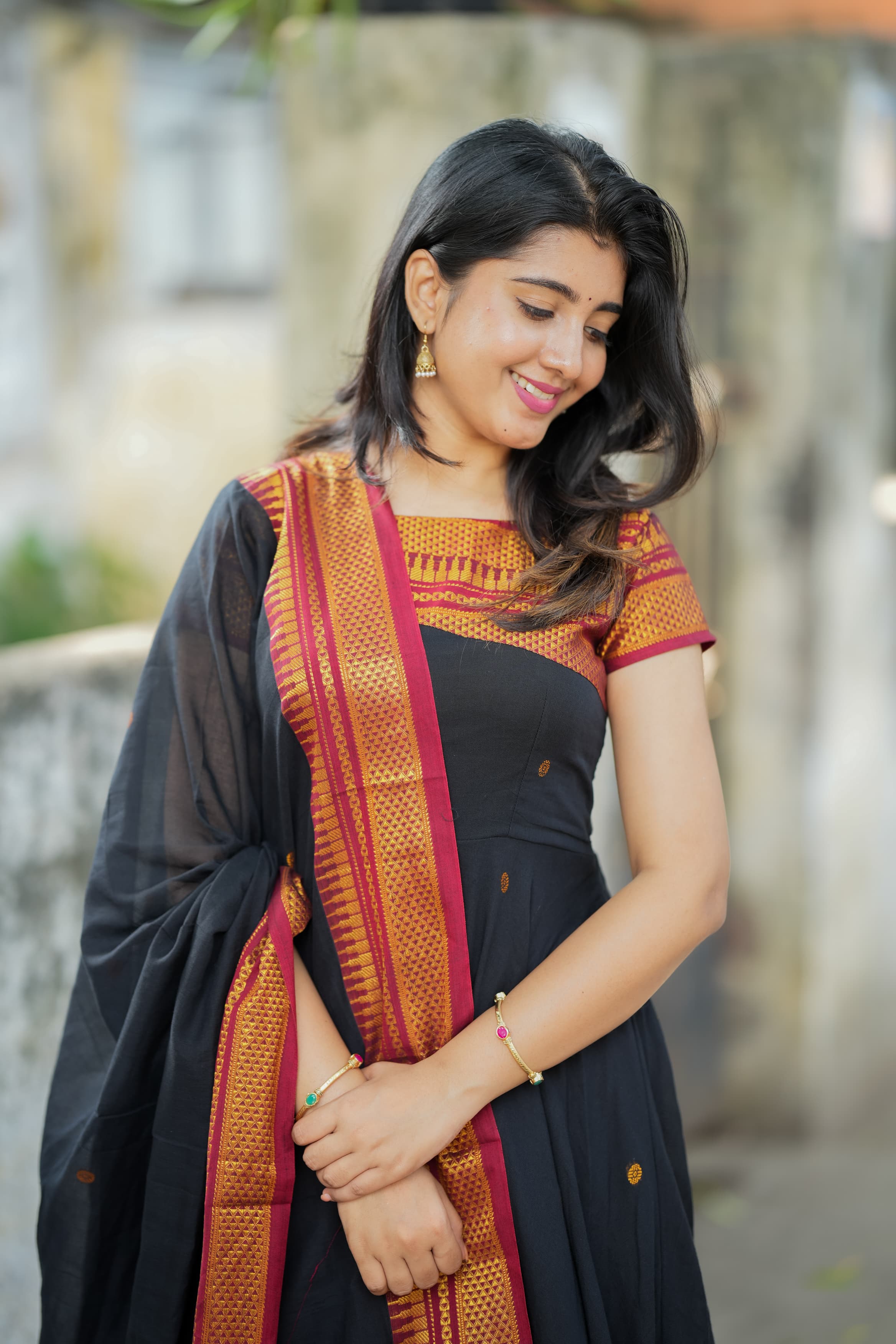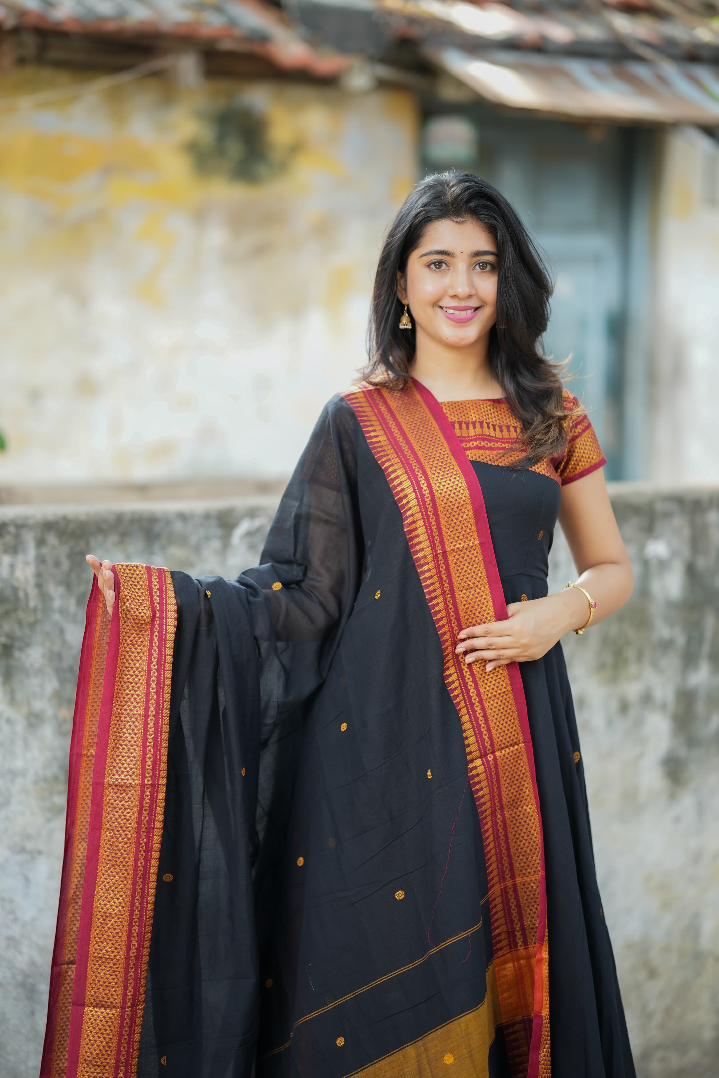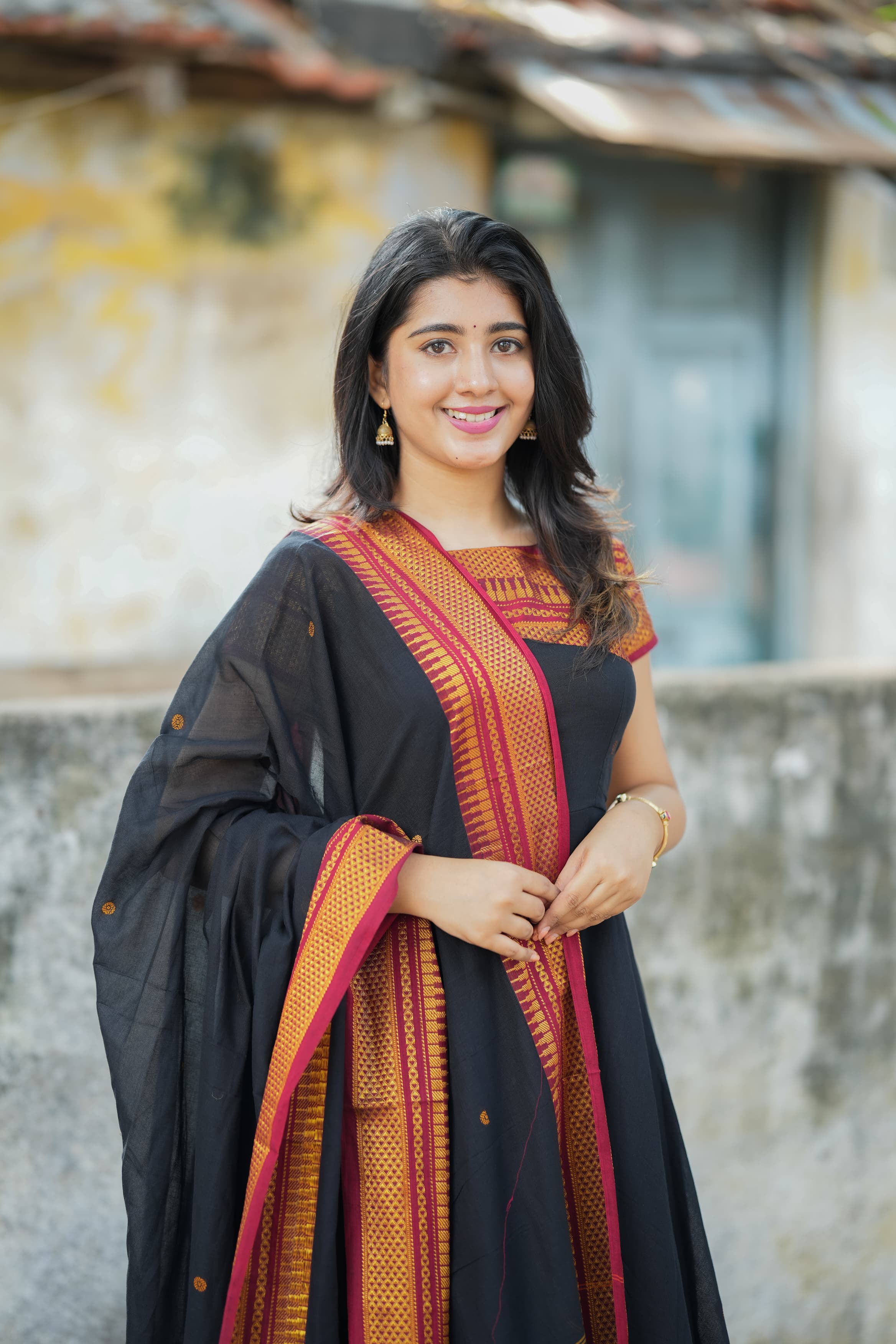 Crafted in pure handloom, this beautiful black ensemble brings elegance and tradition together! With intricate patterns and a vibrant border, the Karunya Collection is perfect for adding a touch of heritage to your wardrobe. Ideal for festive gatherings or cultural events, this dress speaks of sophistication and grace.