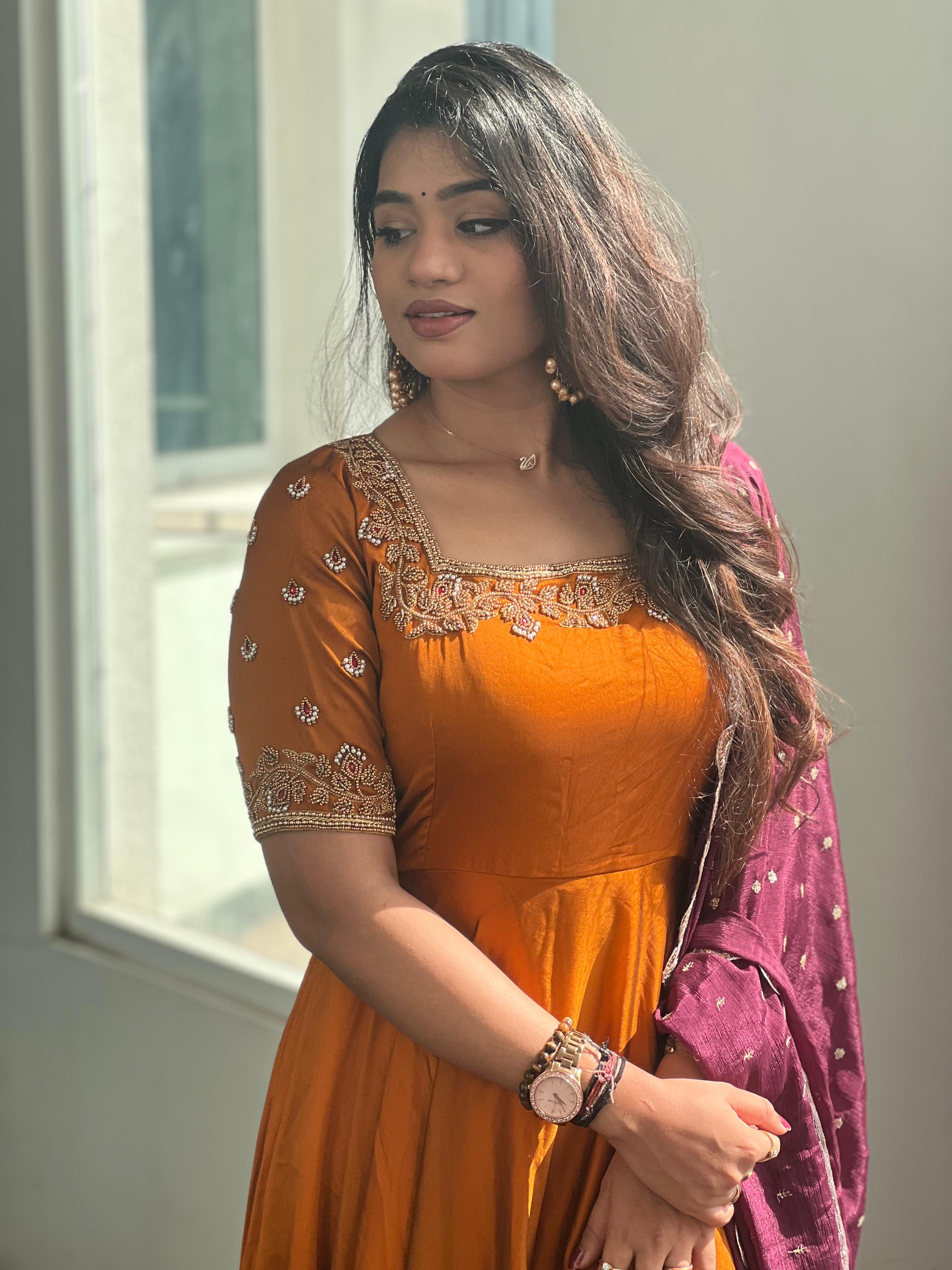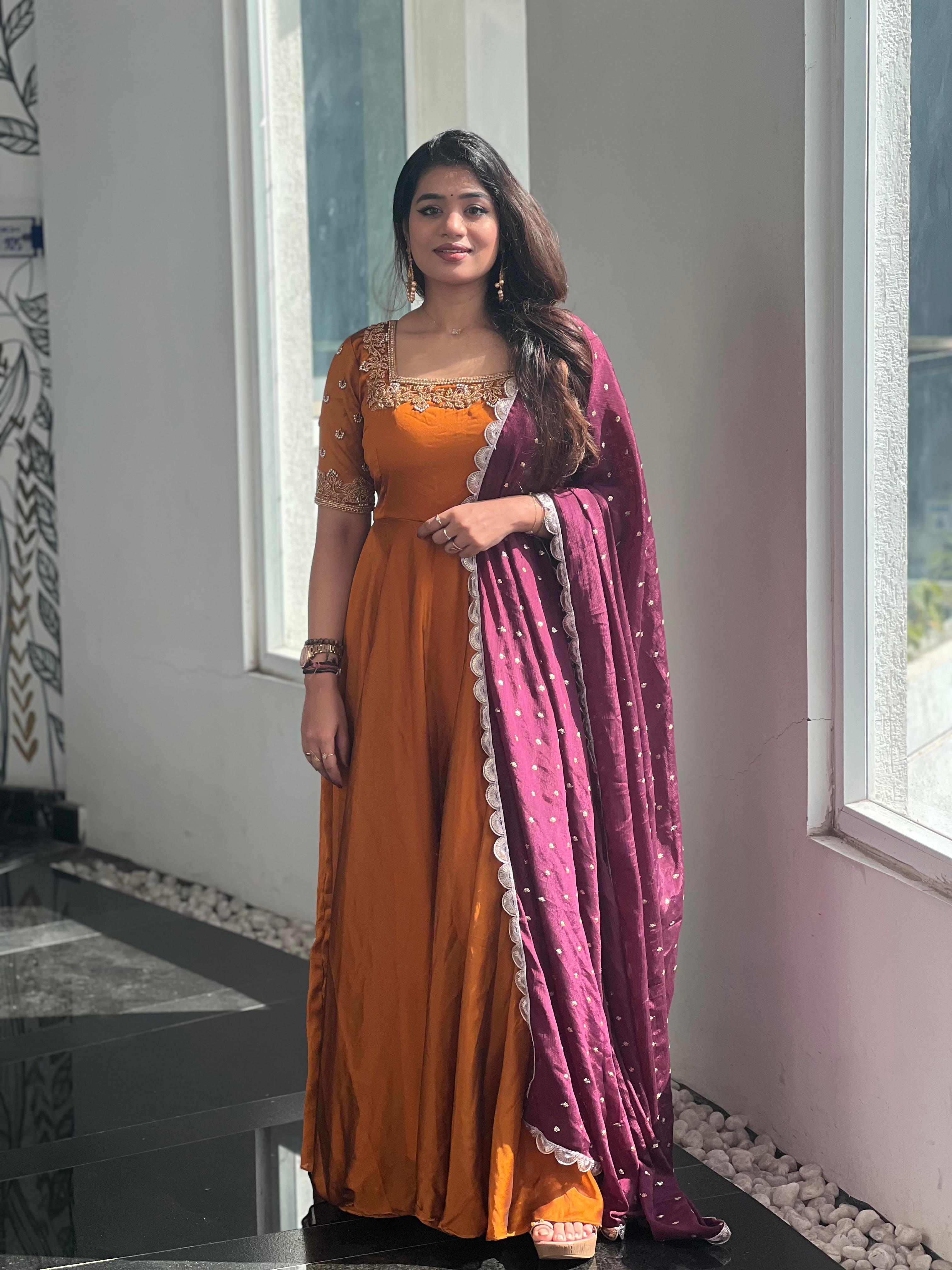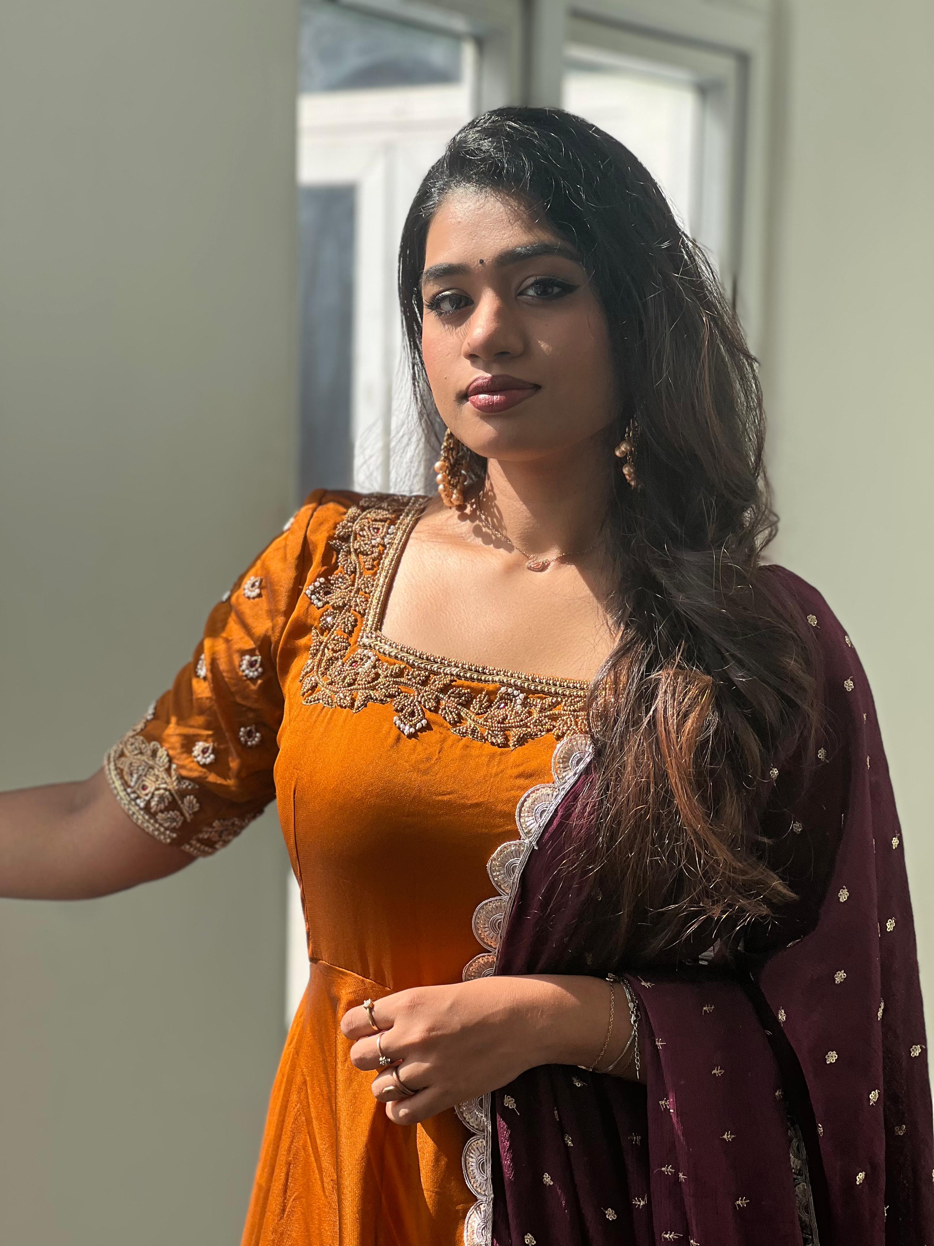 Step into elegance with the stunning Brindha collection! Crafted from luxurious georgette and adorned with intricate aari work, this outfit brings grace and tradition together. Perfect for festive occasions, family gatherings, or special events, where you can truly stand out in style.