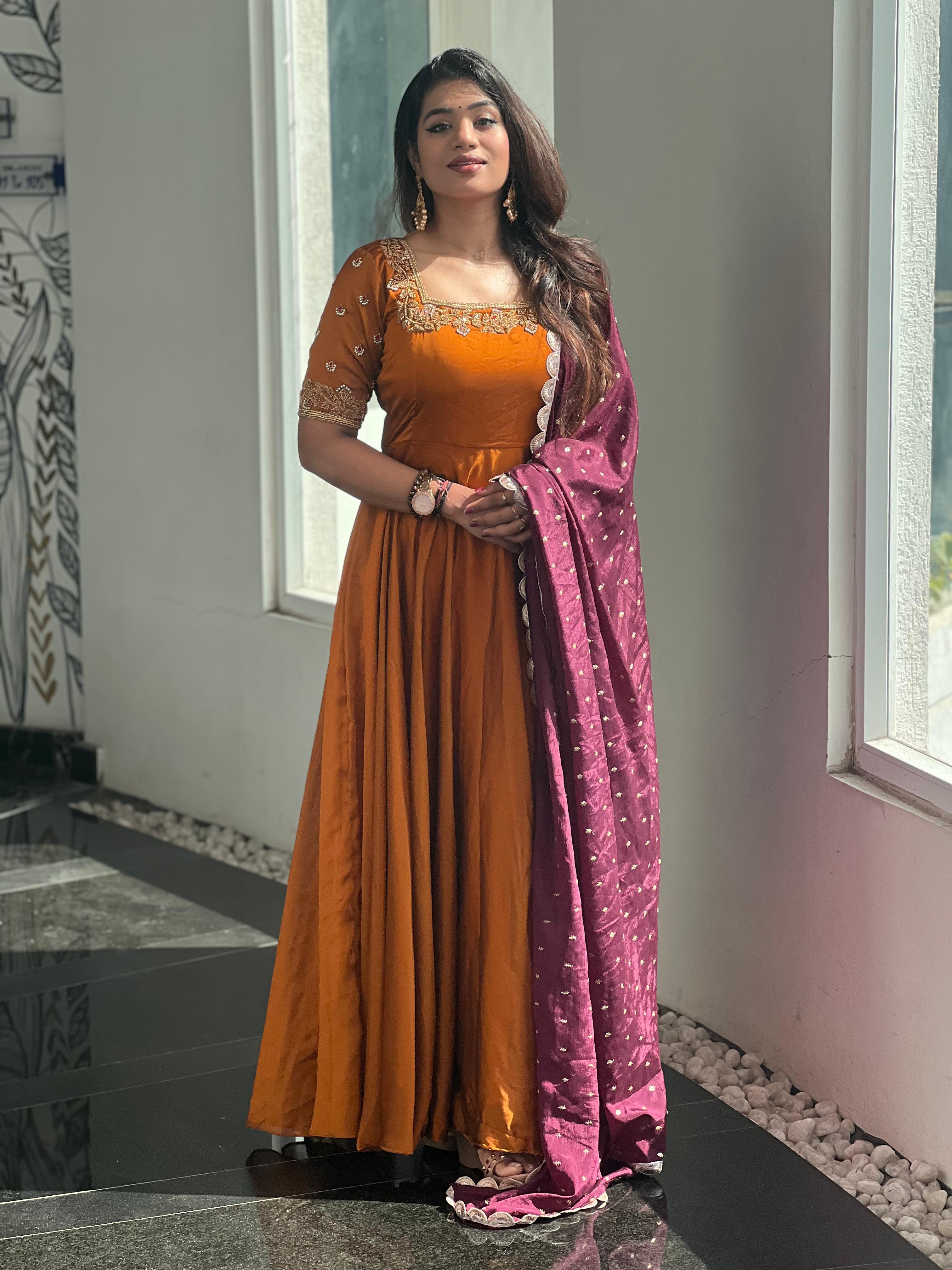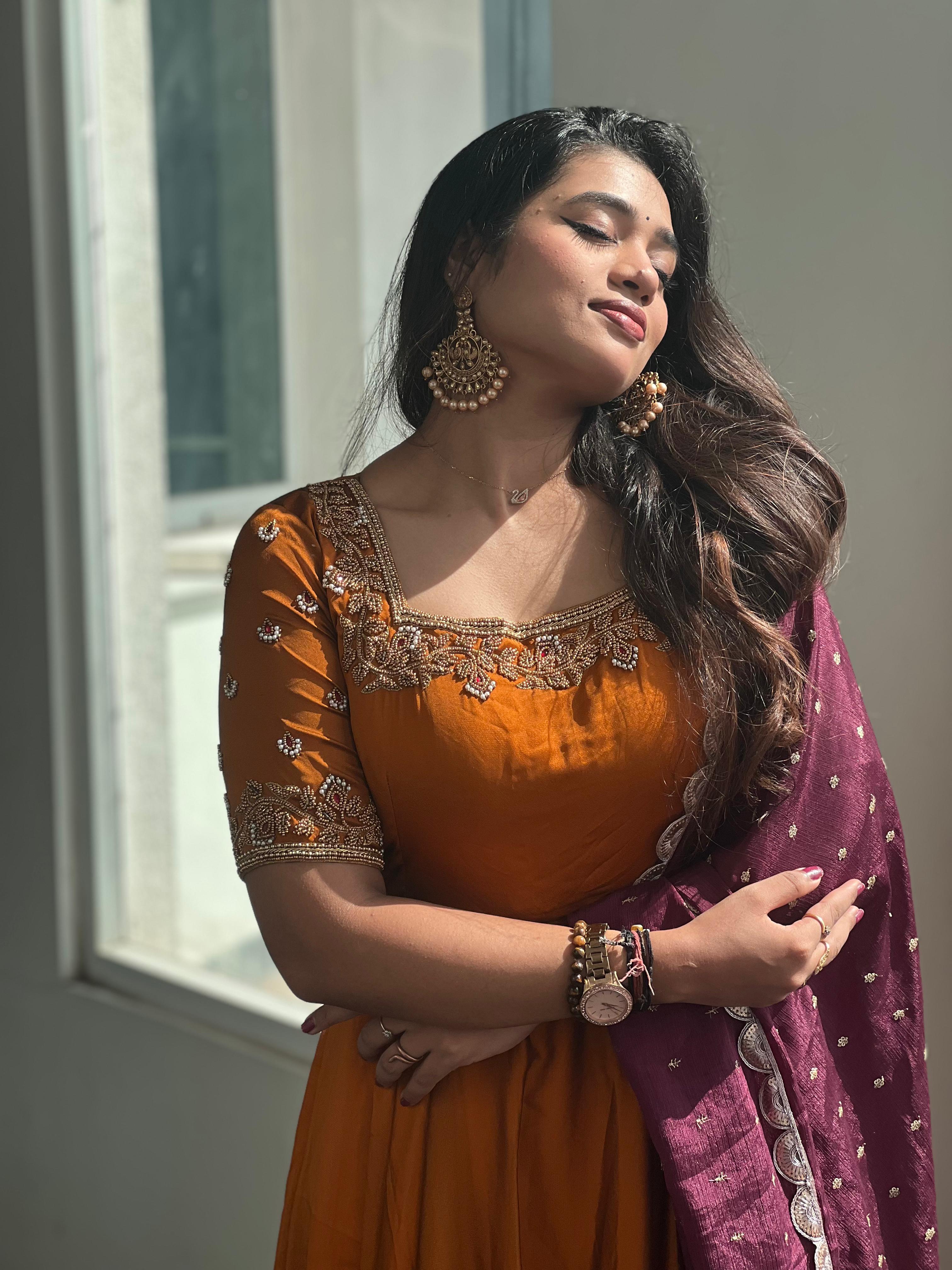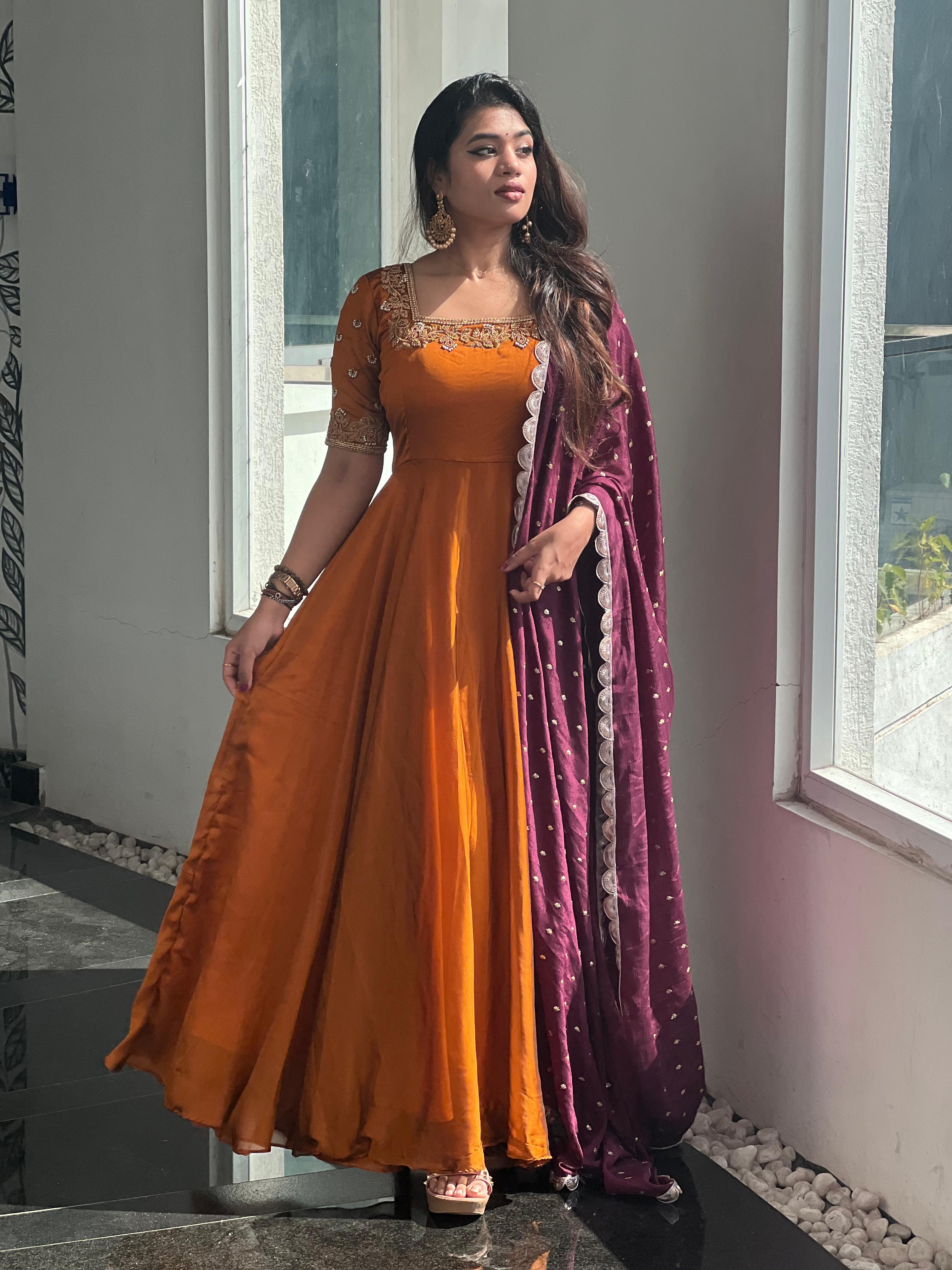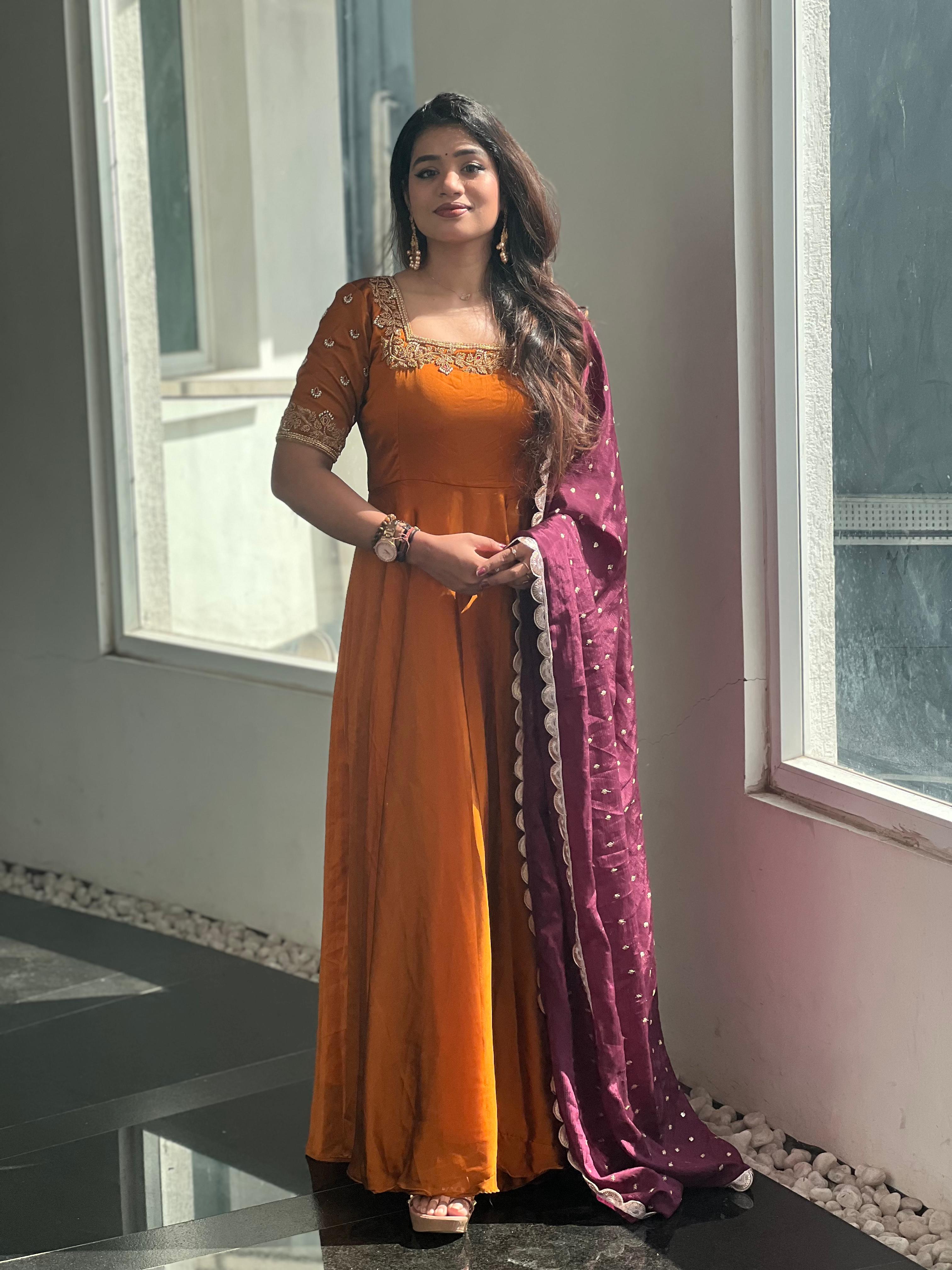 Step into elegance with the stunning Brindha collection! Crafted from luxurious georgette and adorned with intricate aari work, this outfit brings grace and tradition together. Perfect for festive occasions, family gatherings, or special events, where you can truly stand out in style.