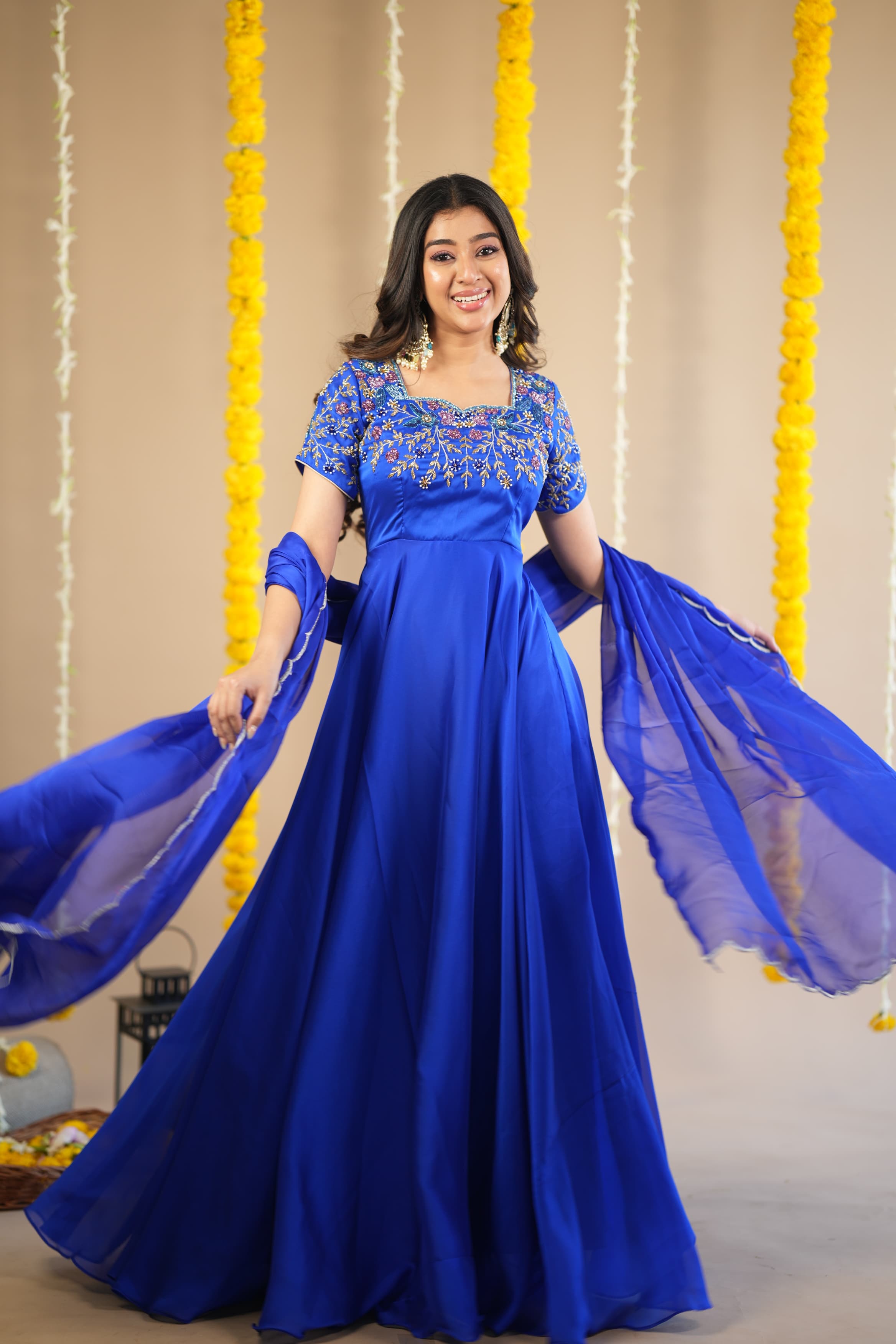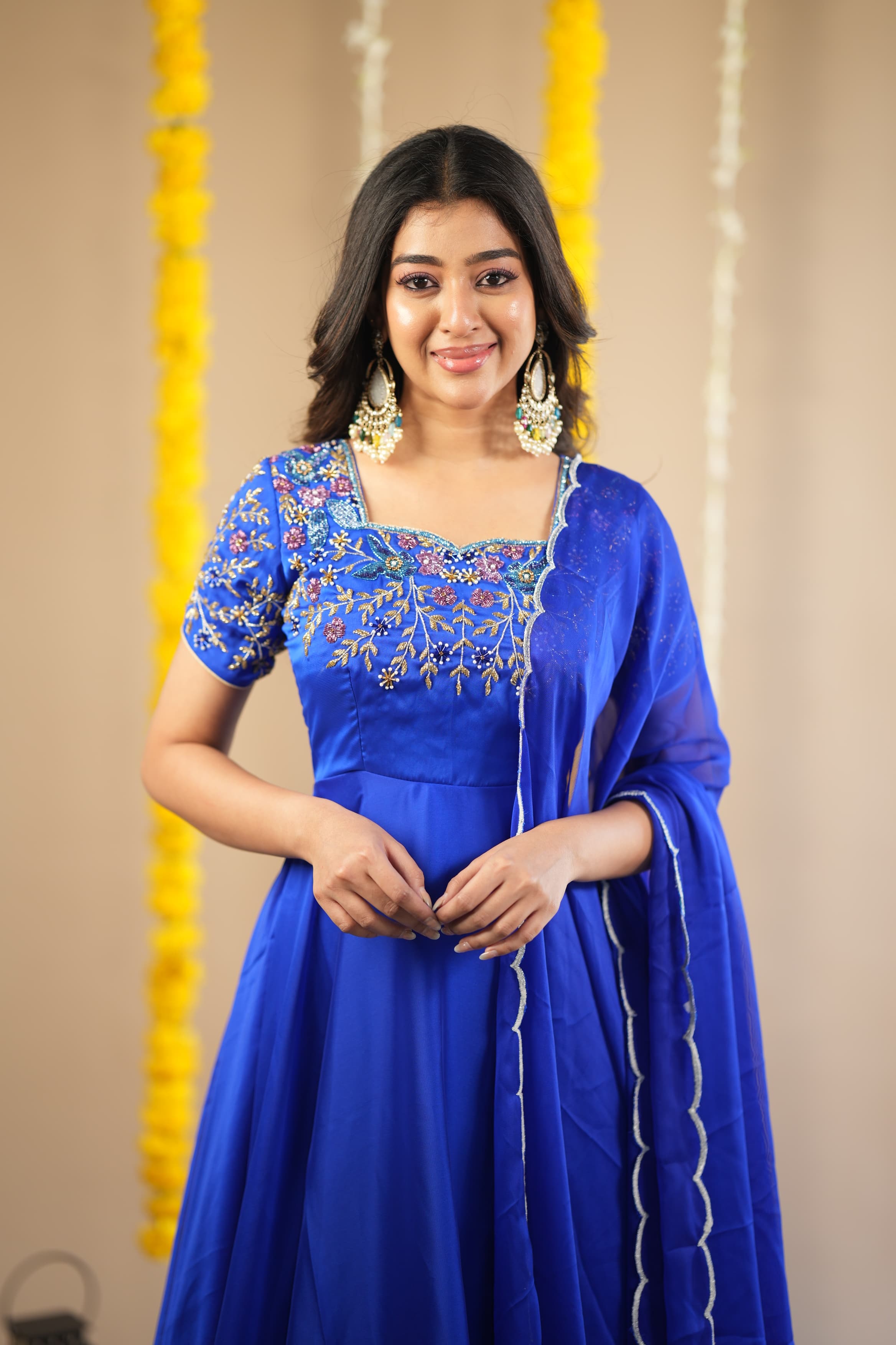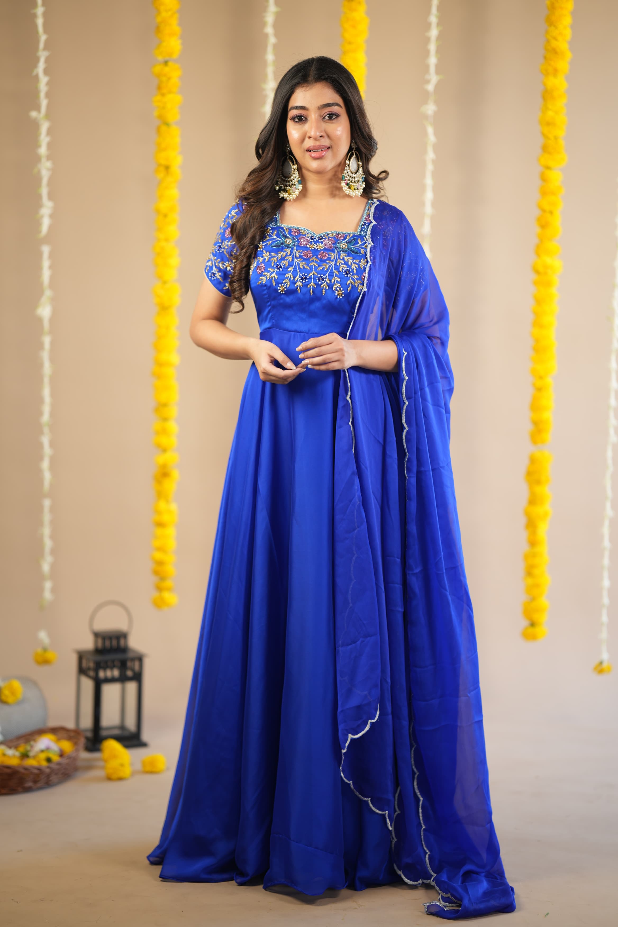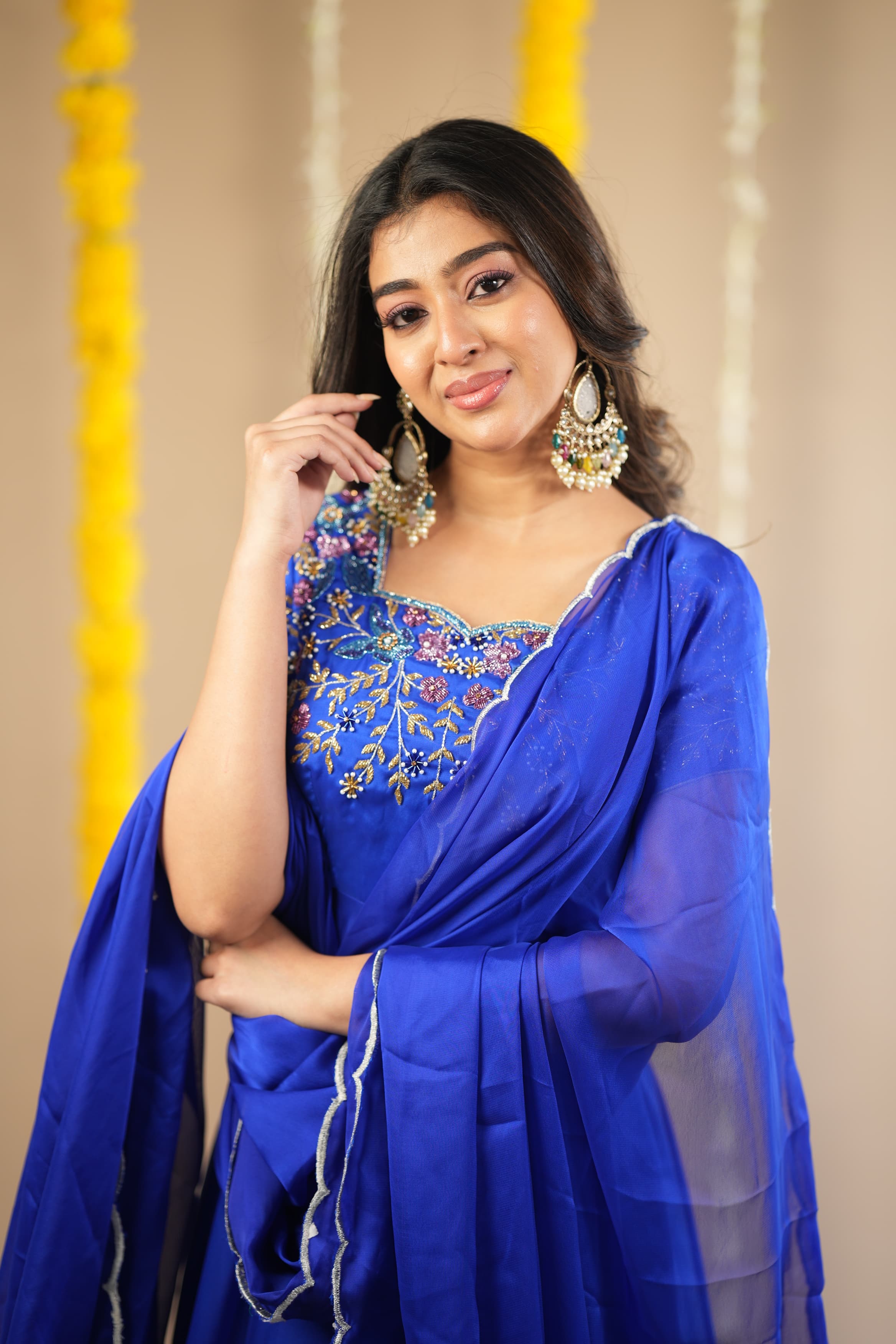 Elevate your festive wardrobe with our stunning Nethra collection, crafted from glossy georgette adorned with intricate zardosi work. This elegant outfit brings out the perfect blend of tradition and glamour.
