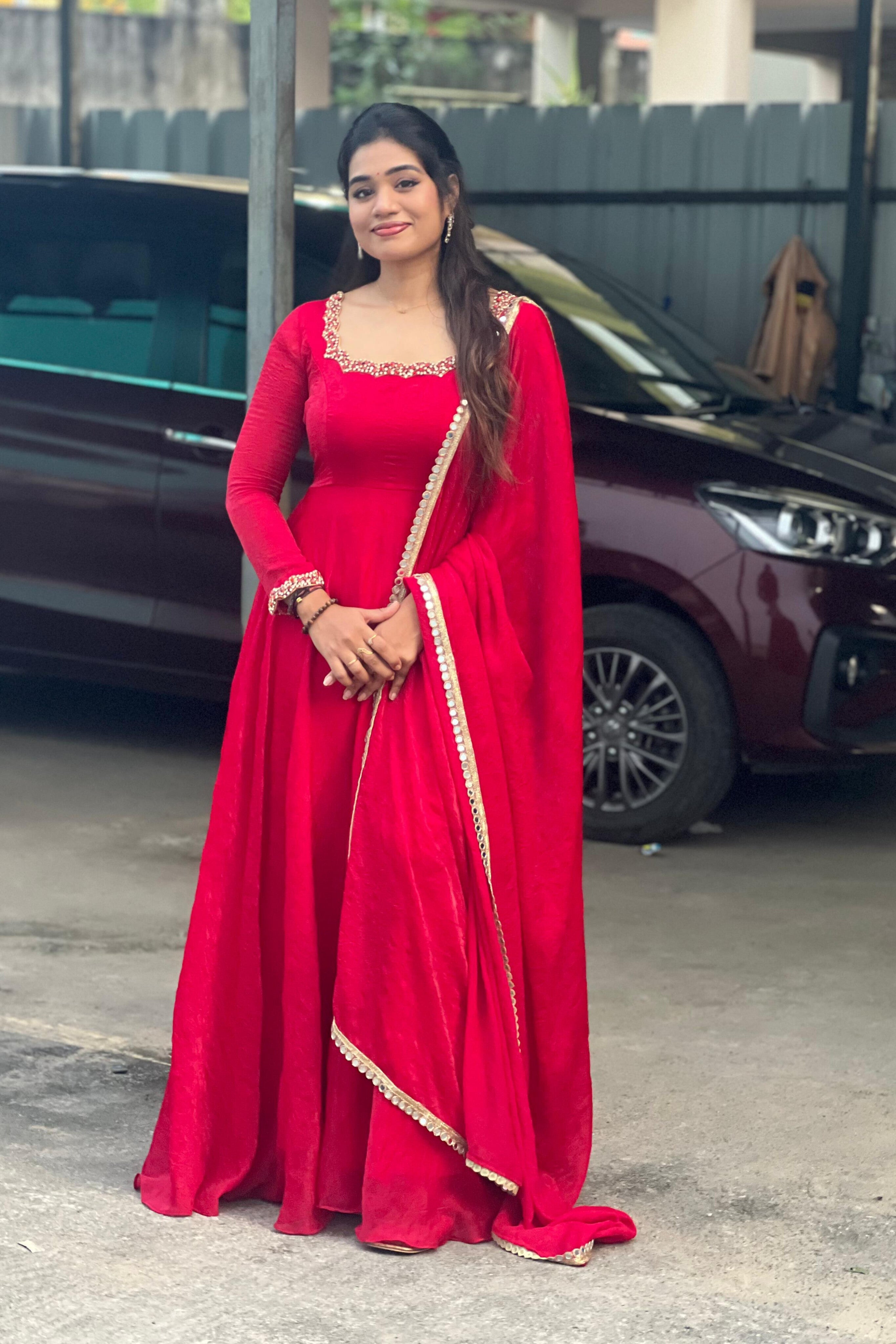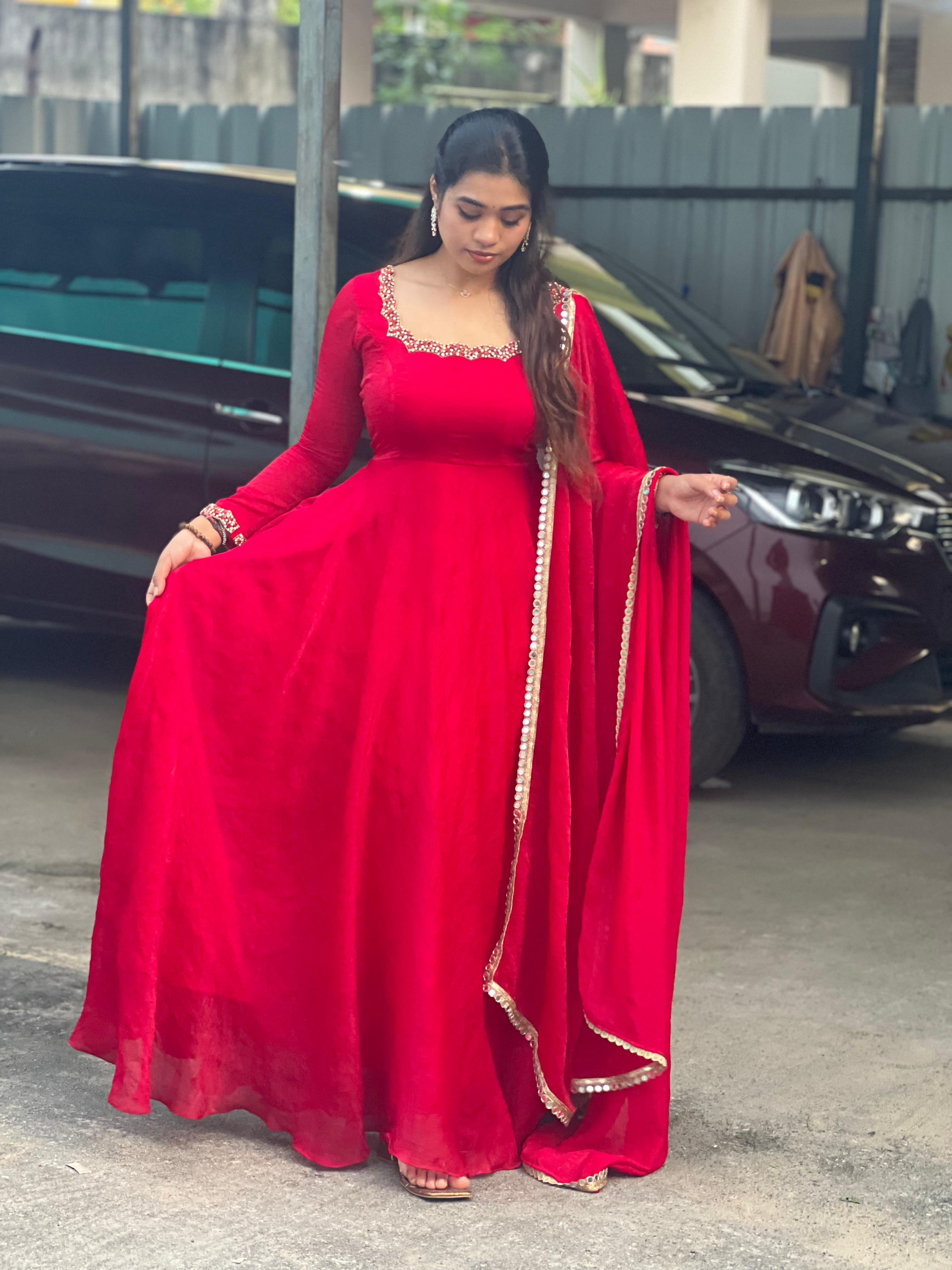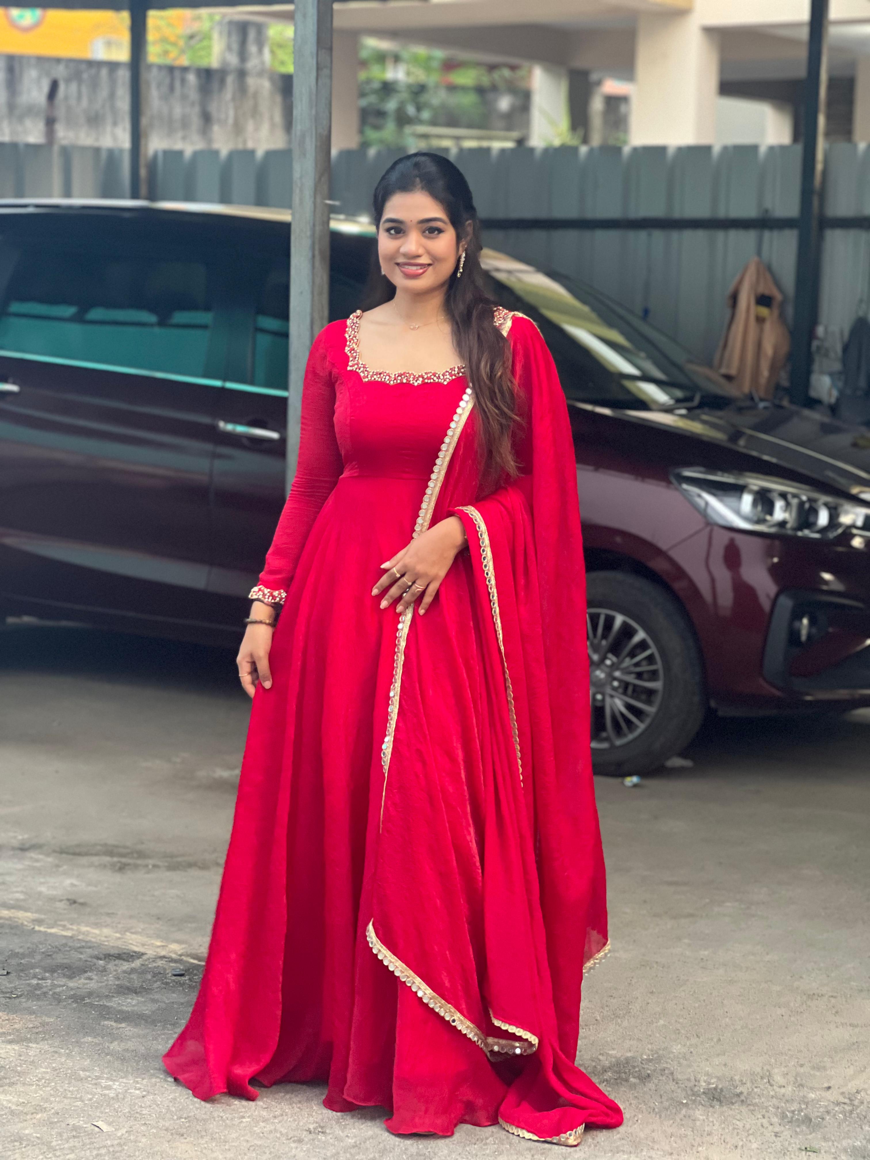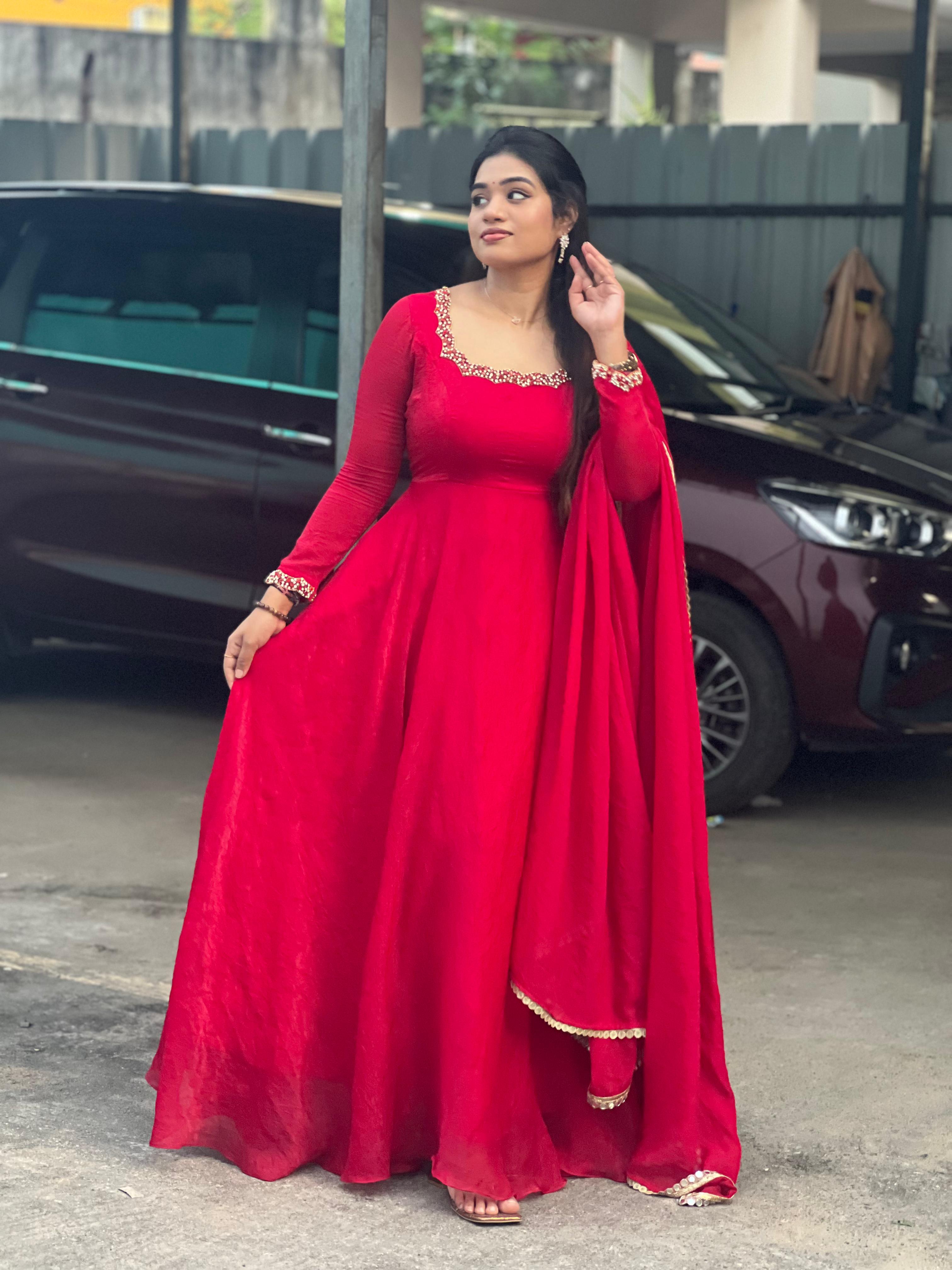 Unveiling the breathtaking Jessy Collection, crafted from luxurious crush tissue silk adorned with intricate handwork. This vibrant red dress adds an elegant charm to your festive moments, making you shine effortlessly.
