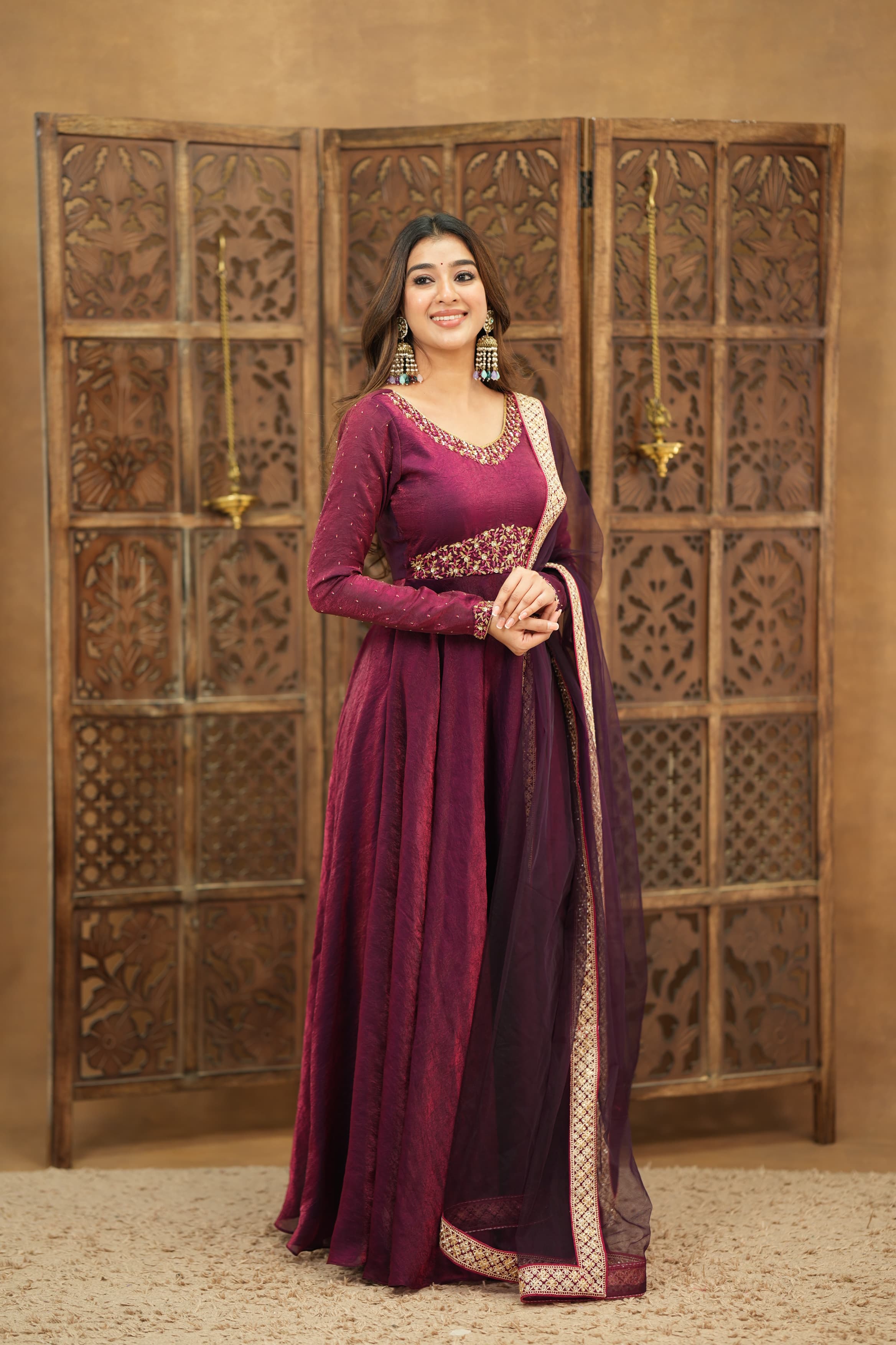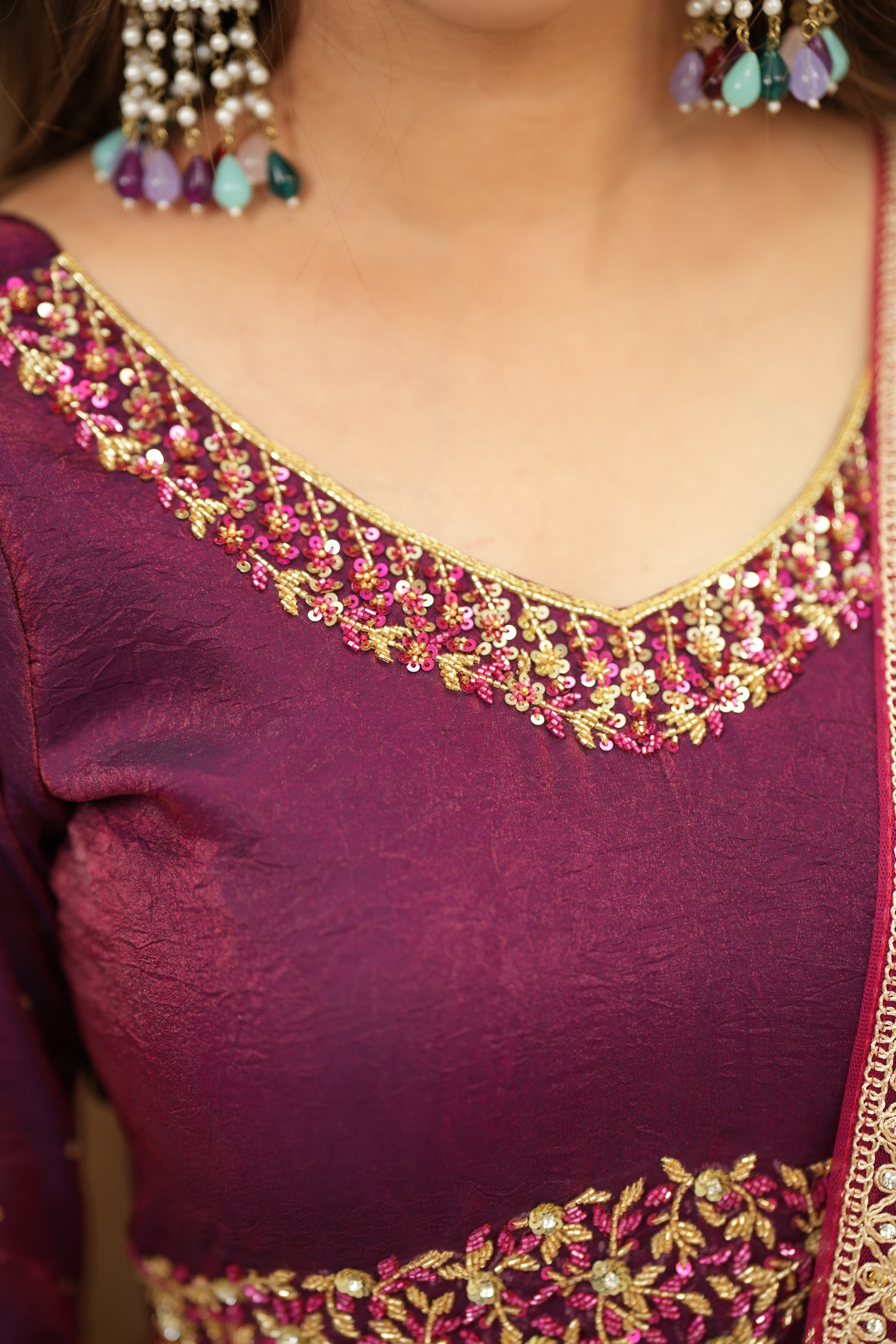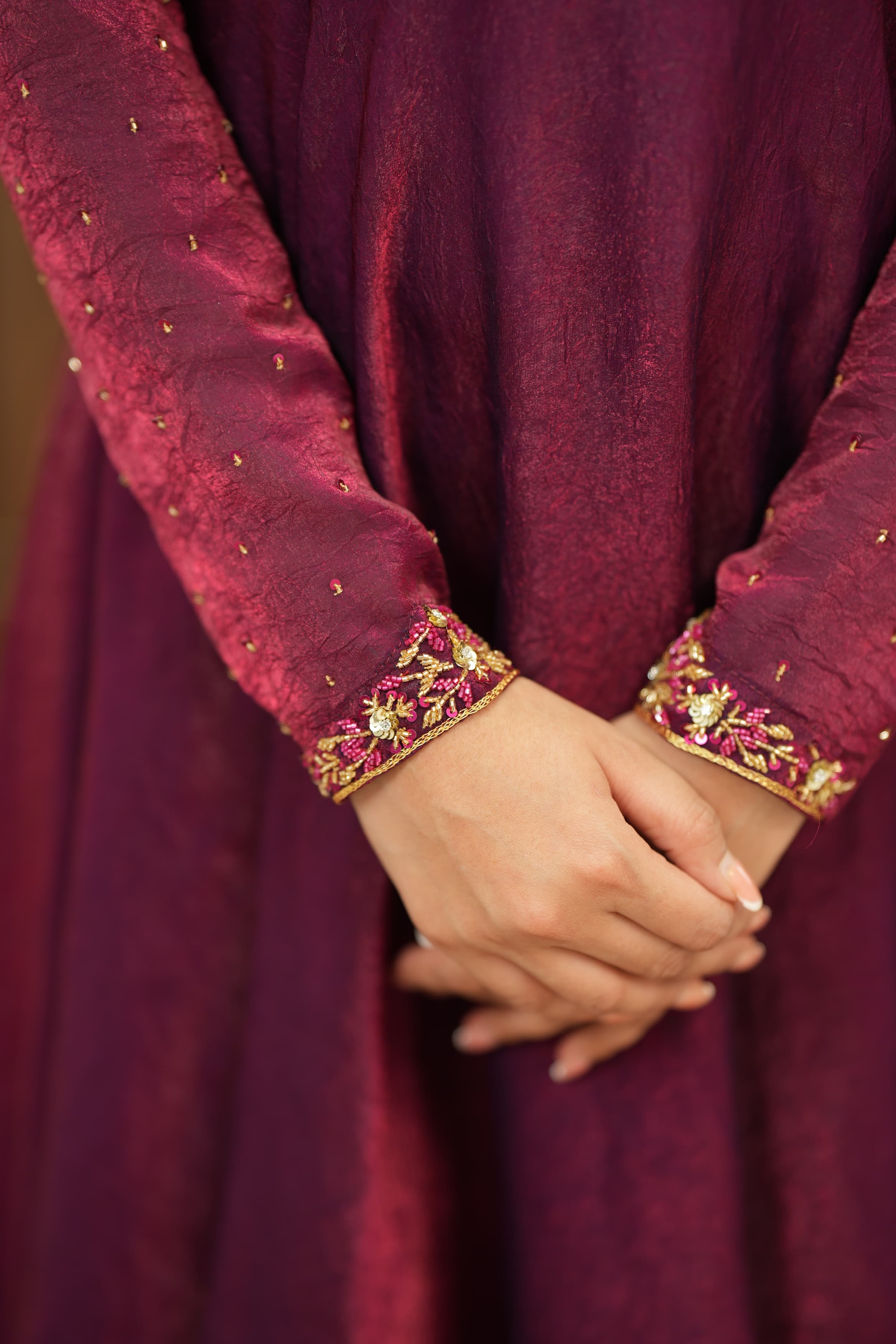 Draped in elegance and charm — this stunning piece is crafted from premium crush tissue fabric adorned with intricate hand work detailing, making it the perfect choice for your special moments.