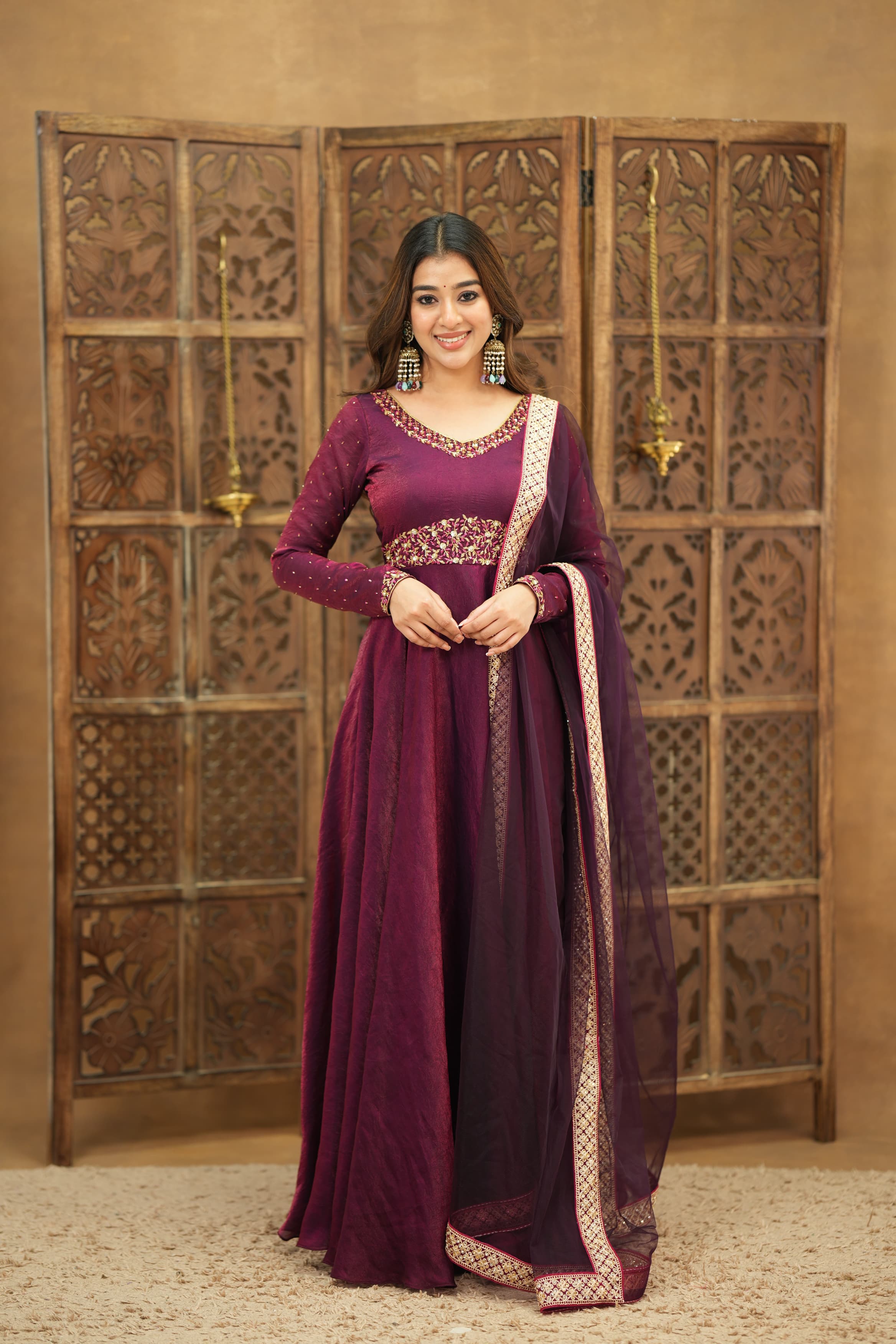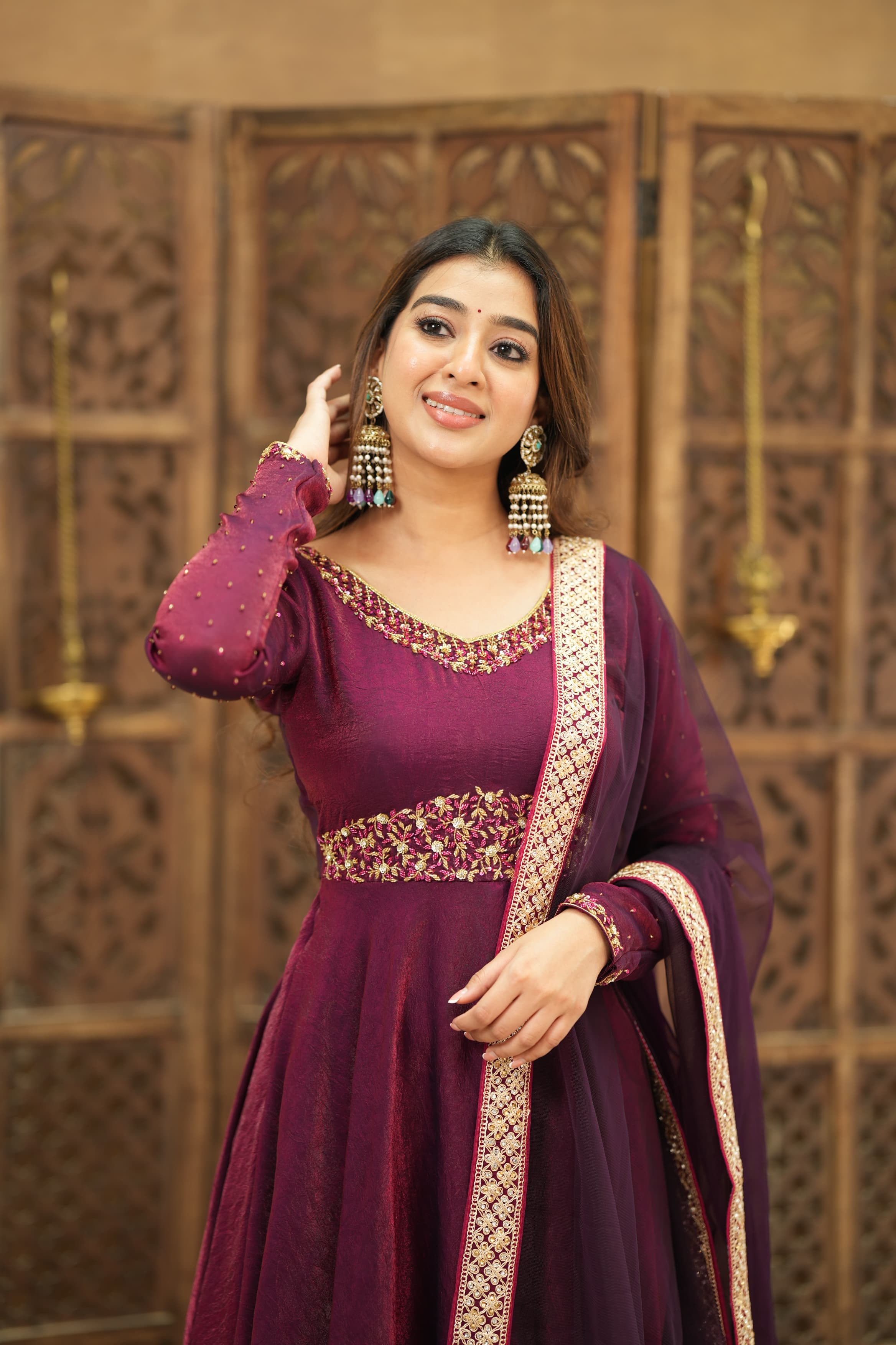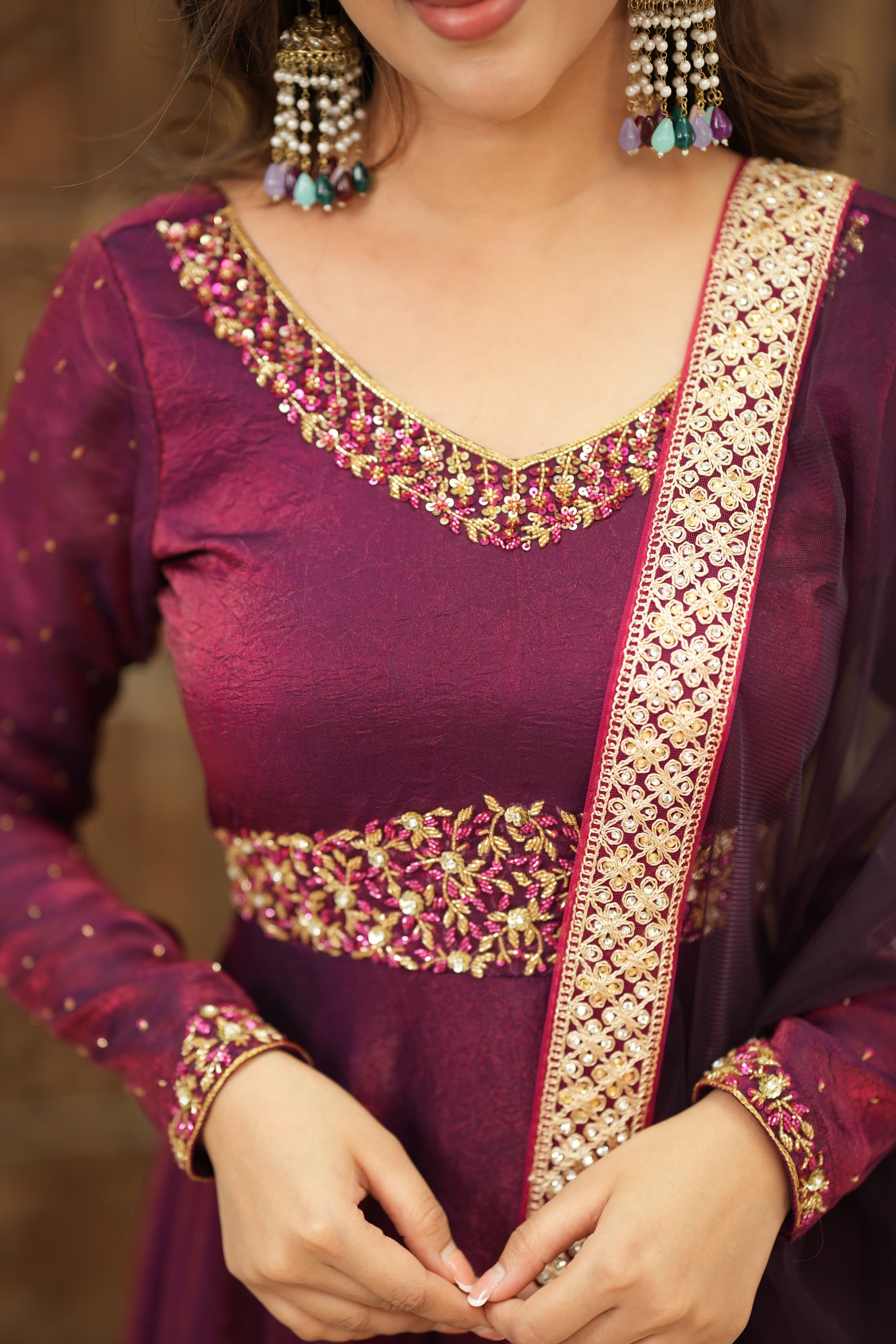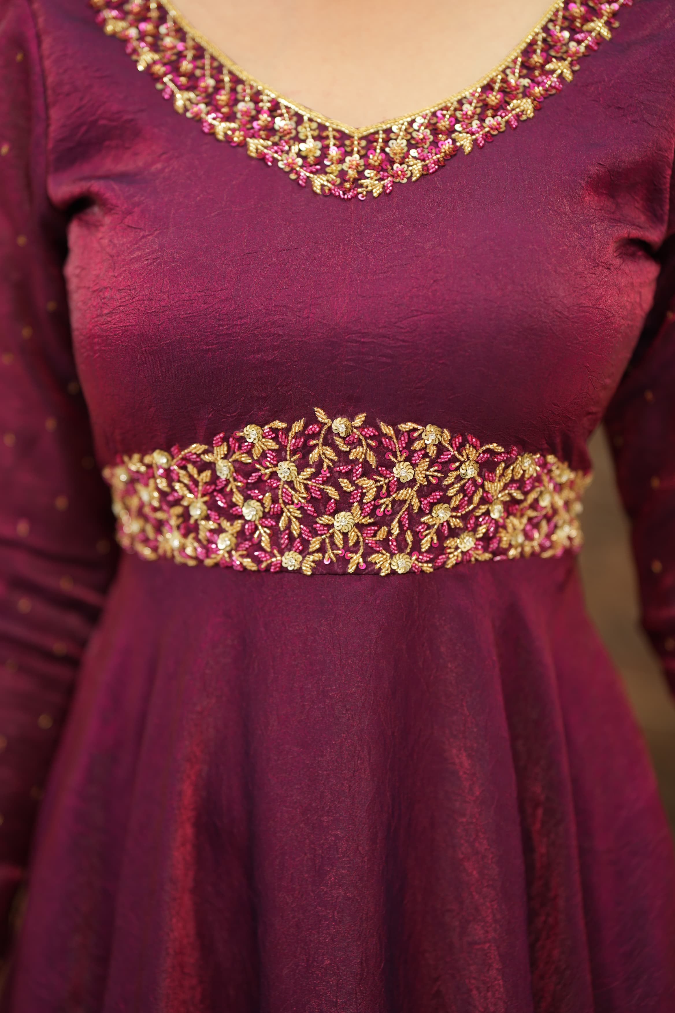 Draped in elegance and charm — this stunning piece is crafted from premium crush tissue fabric adorned with intricate hand work detailing, making it the perfect choice for your special moments.