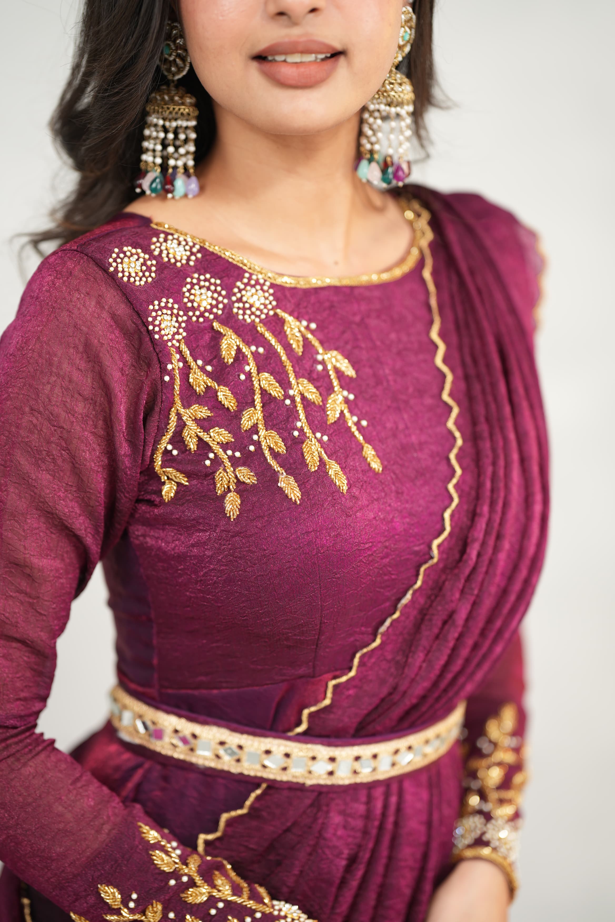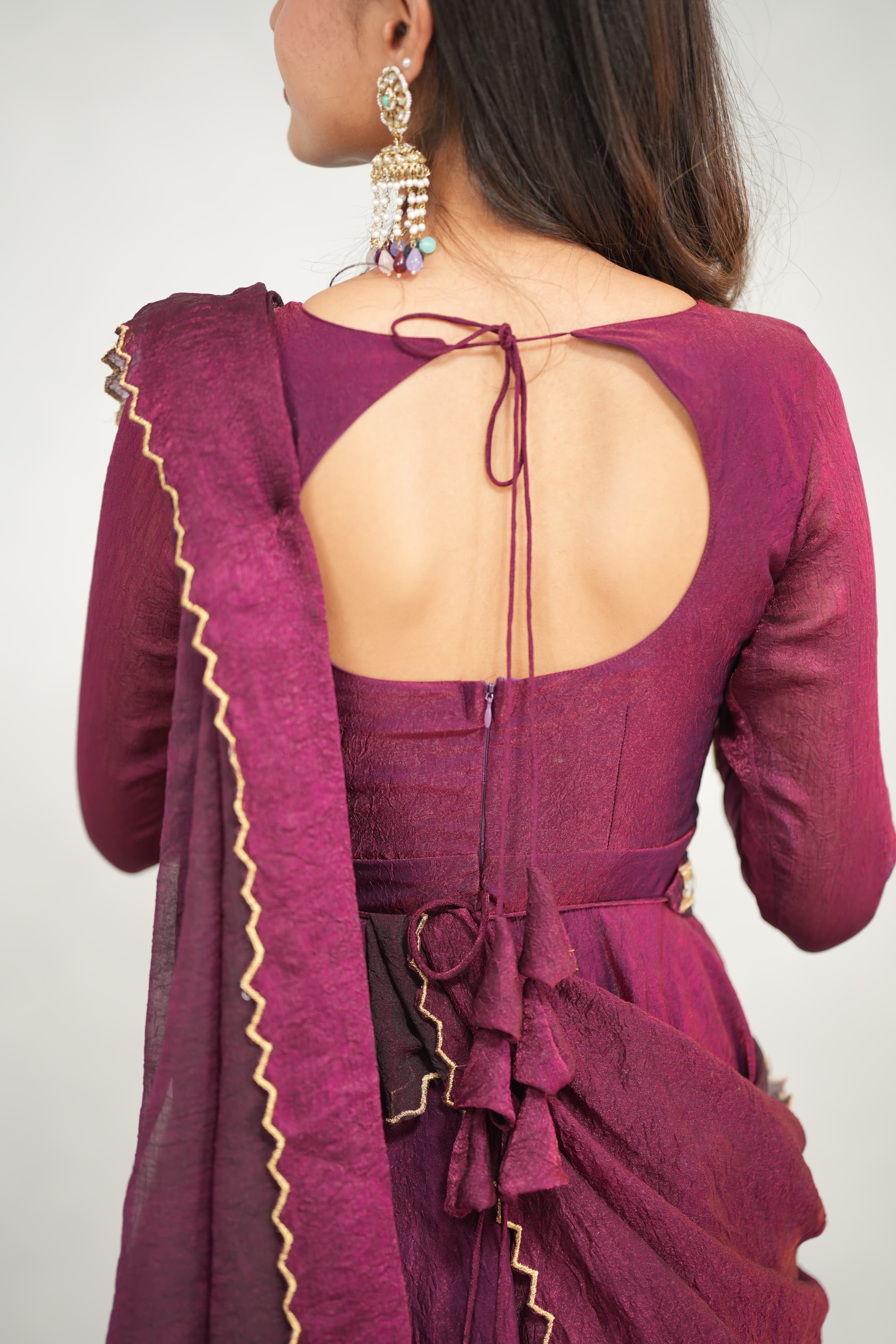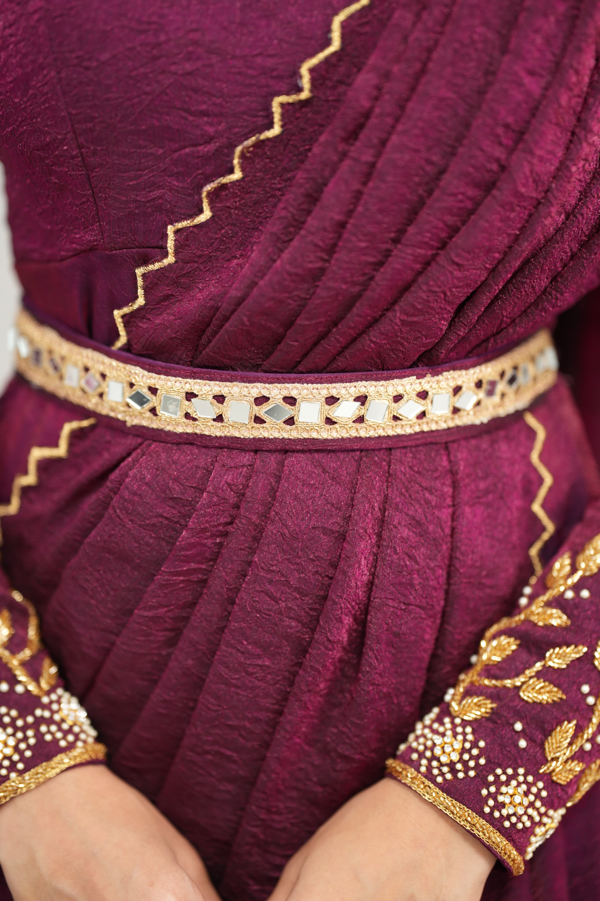 This stunning ensemble in crush tissue fabric is beautifully enhanced with intricate hand work—a perfect blend of tradition and elegance. Comes with a stylish hip belt to elevate your drape wear look effortlessly.