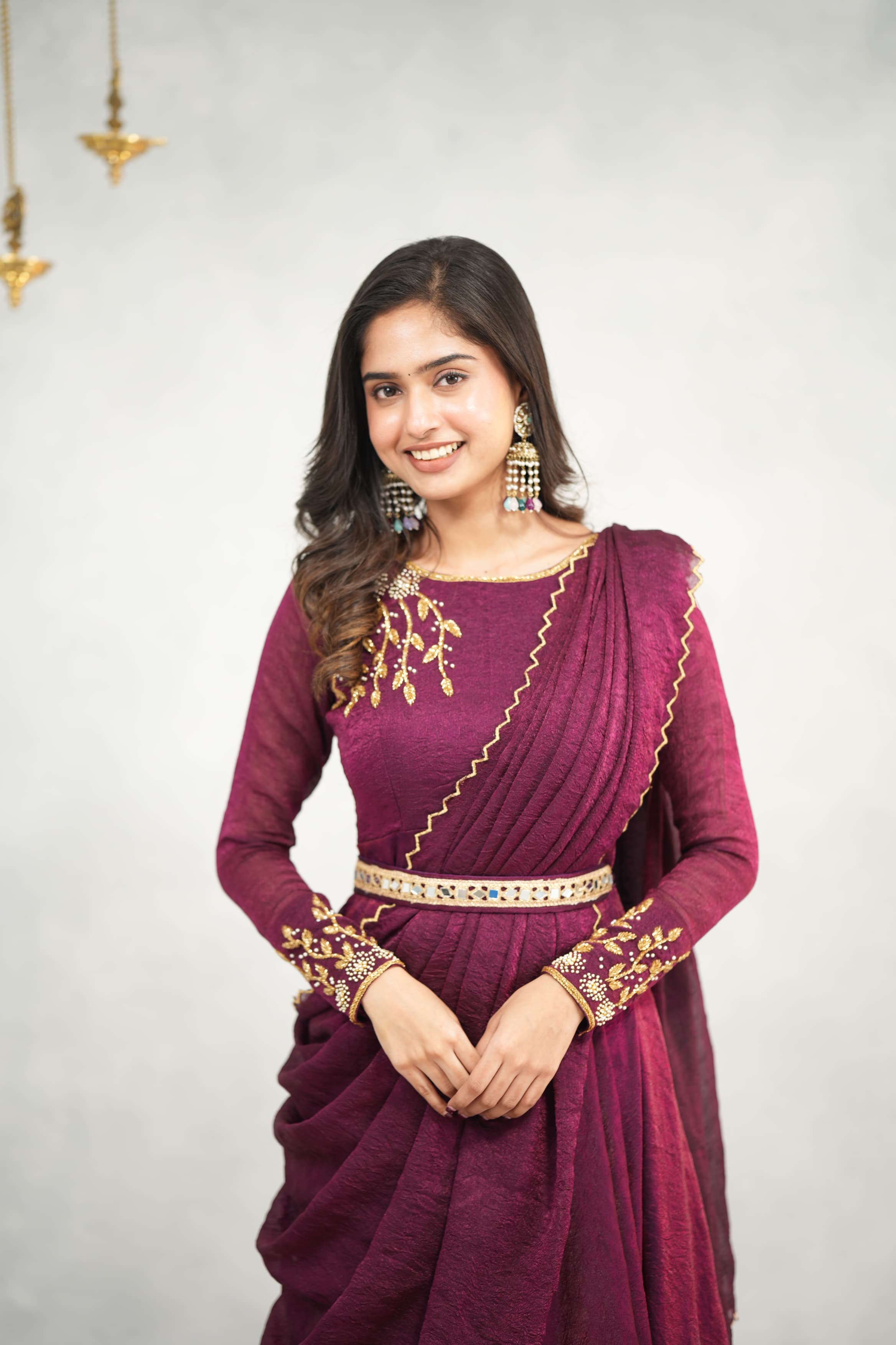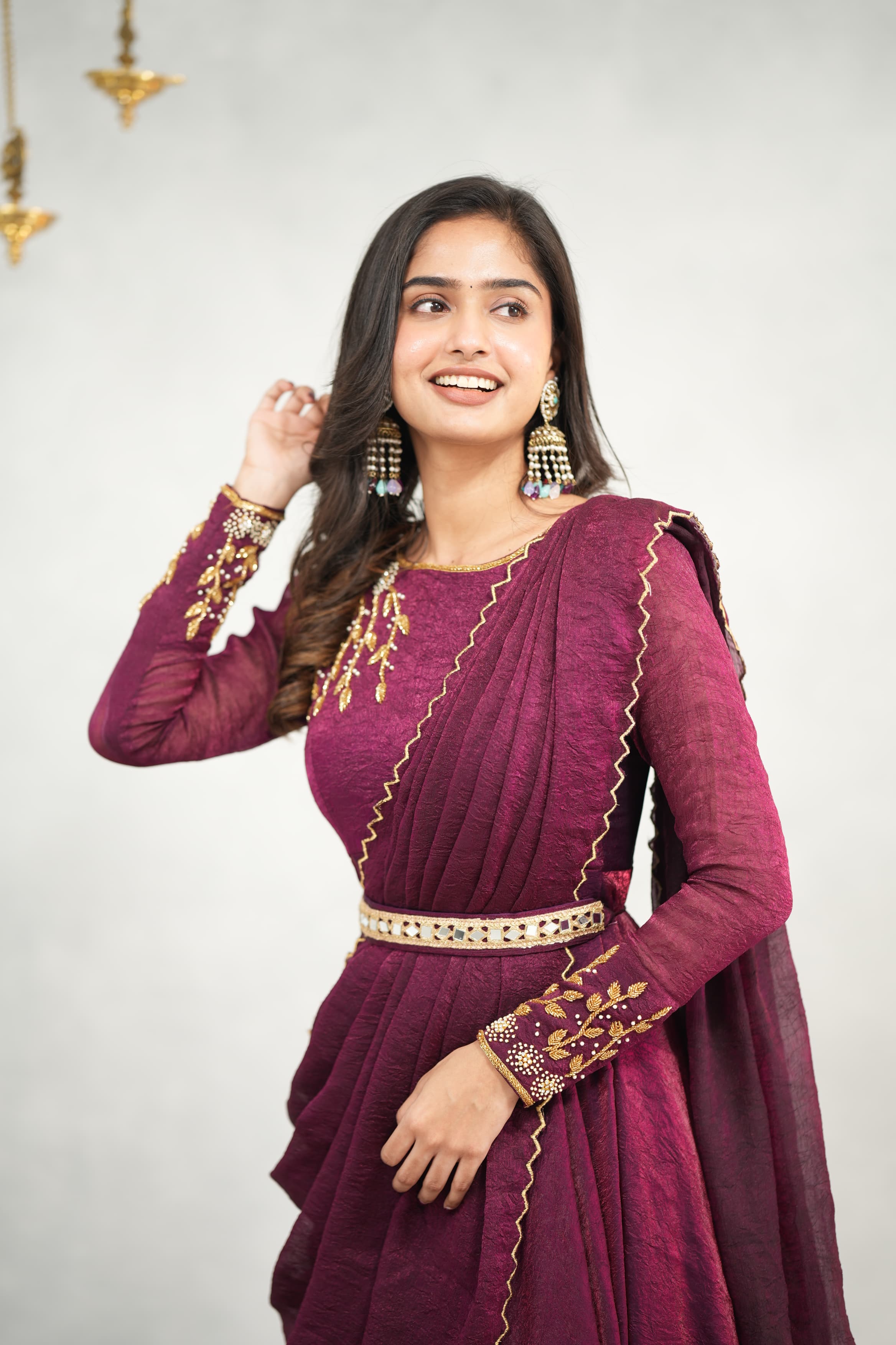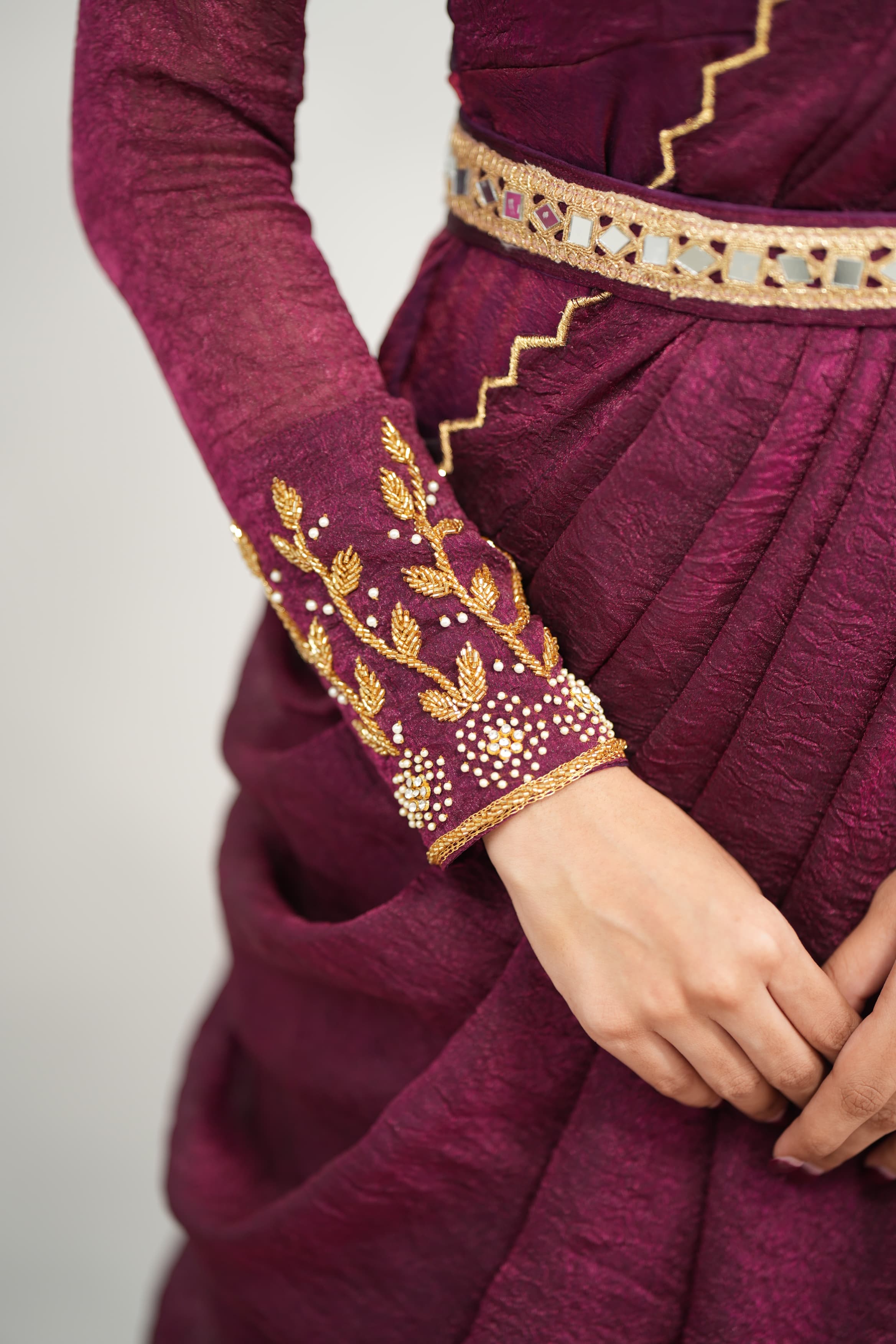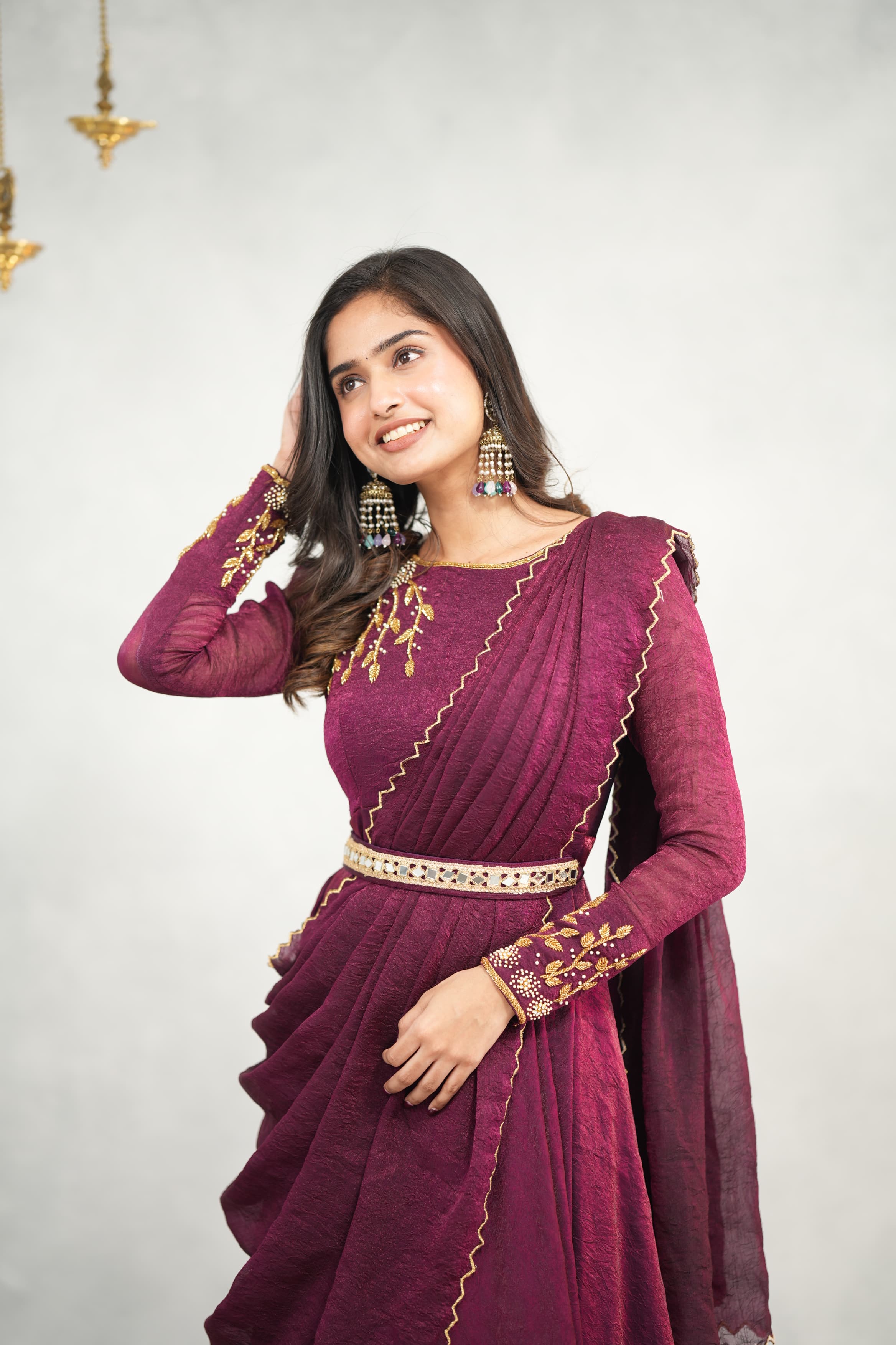 This stunning ensemble in crush tissue fabric is beautifully enhanced with intricate hand work—a perfect blend of tradition and elegance. Comes with a stylish hip belt to elevate your drape wear look effortlessly.