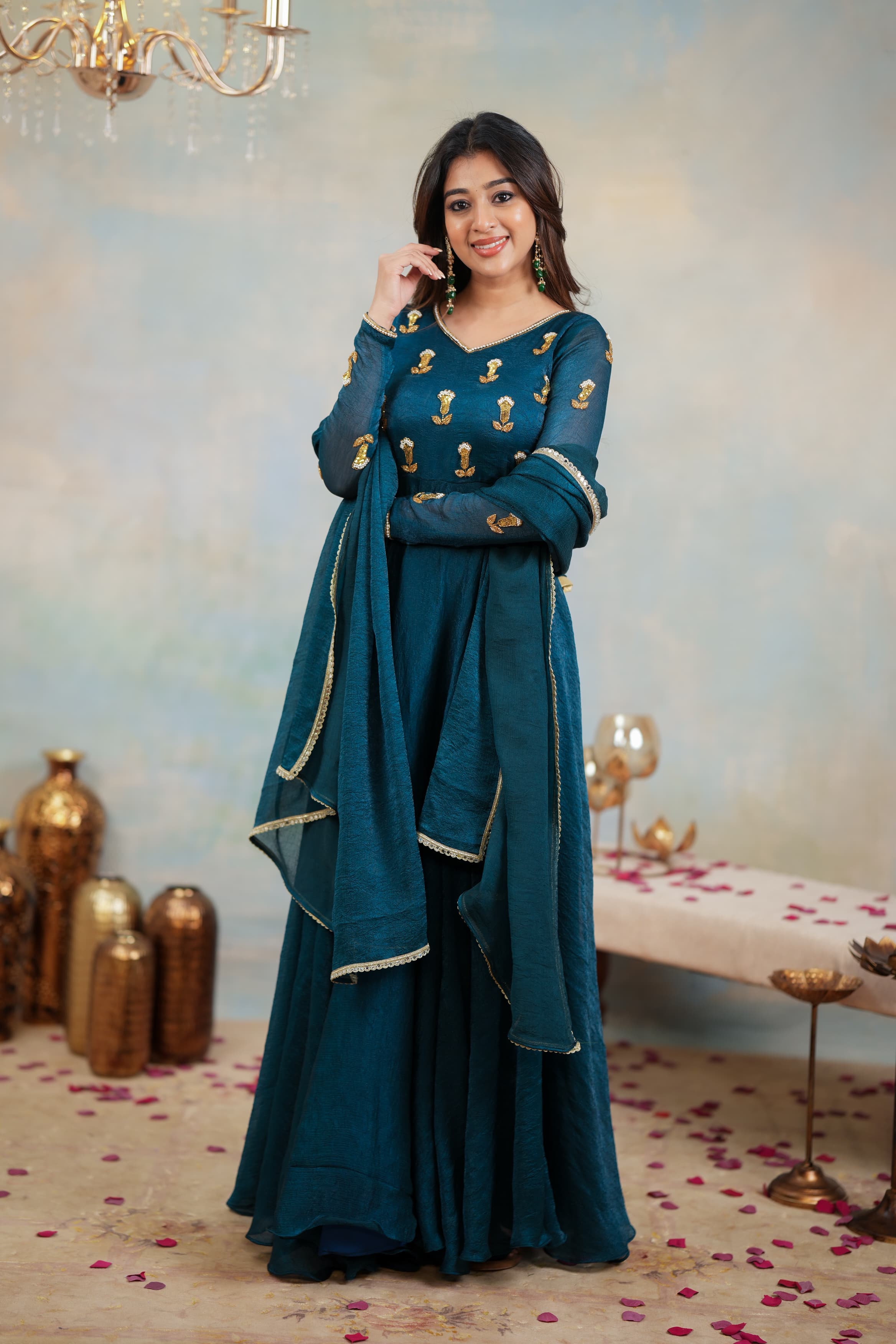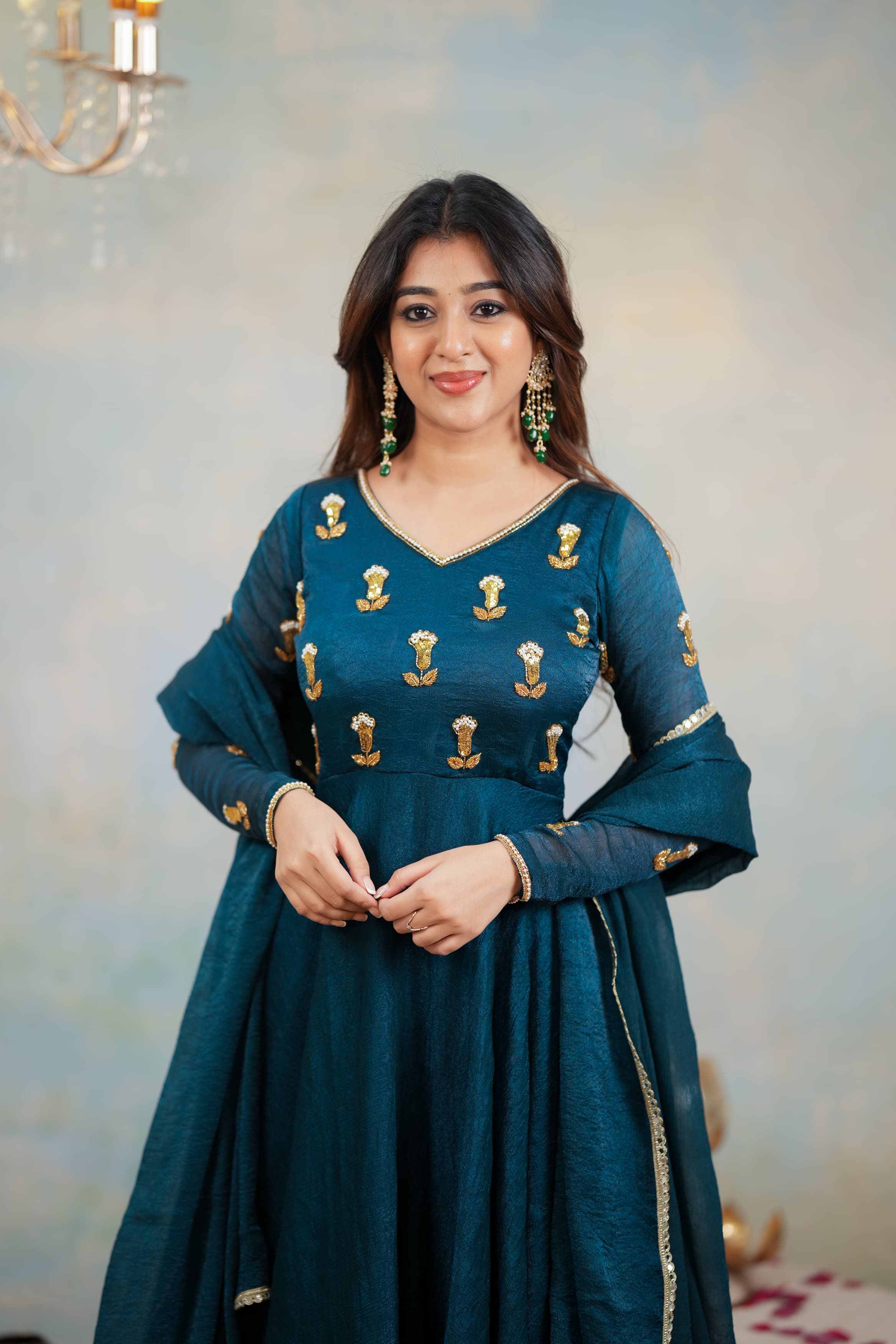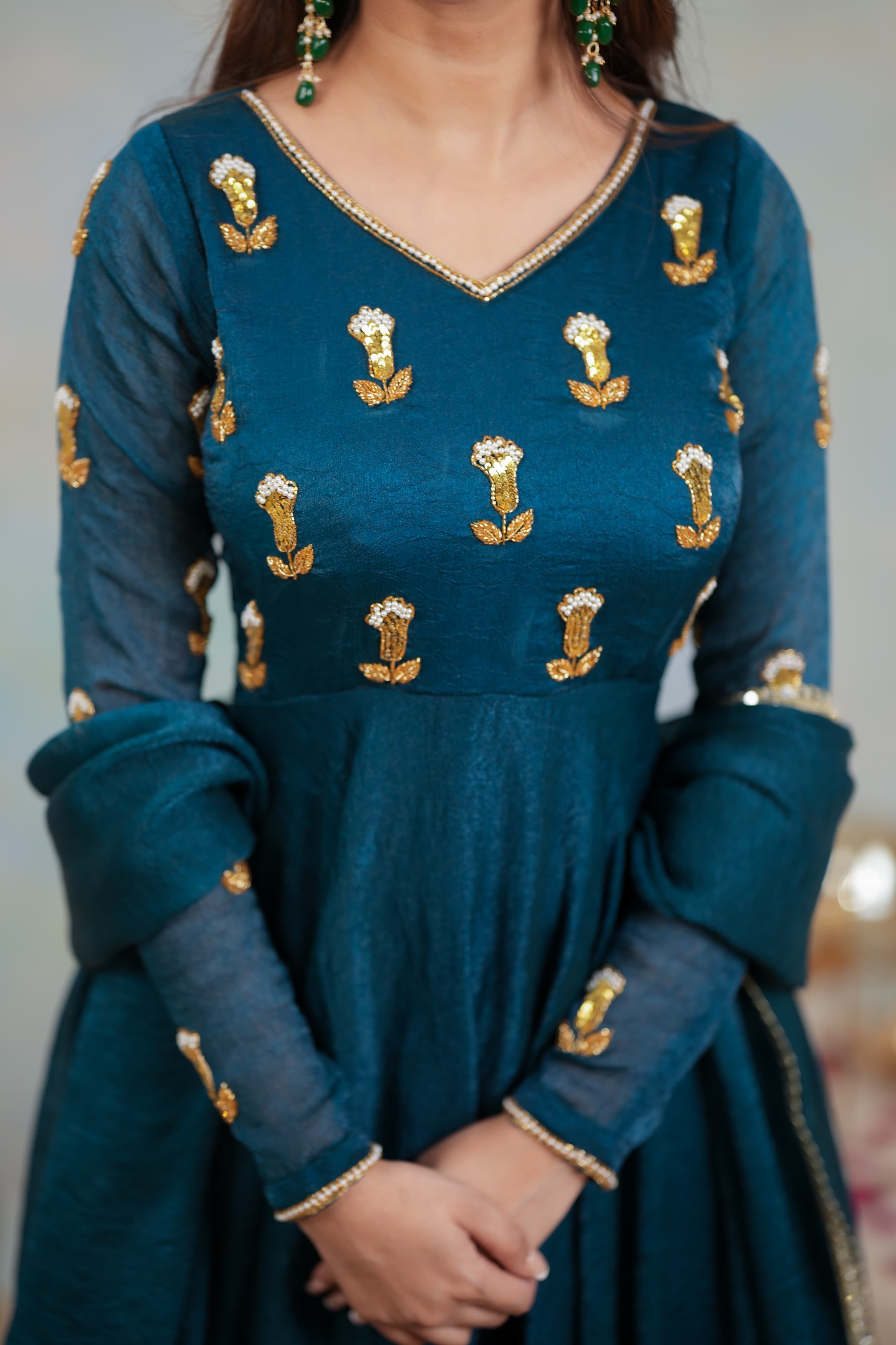 Royal teal crush tissue Anarkali adorned with elegant golden handwork motifs, full sleeves, and delicate zari lace highlights along the flare and sleeves.
