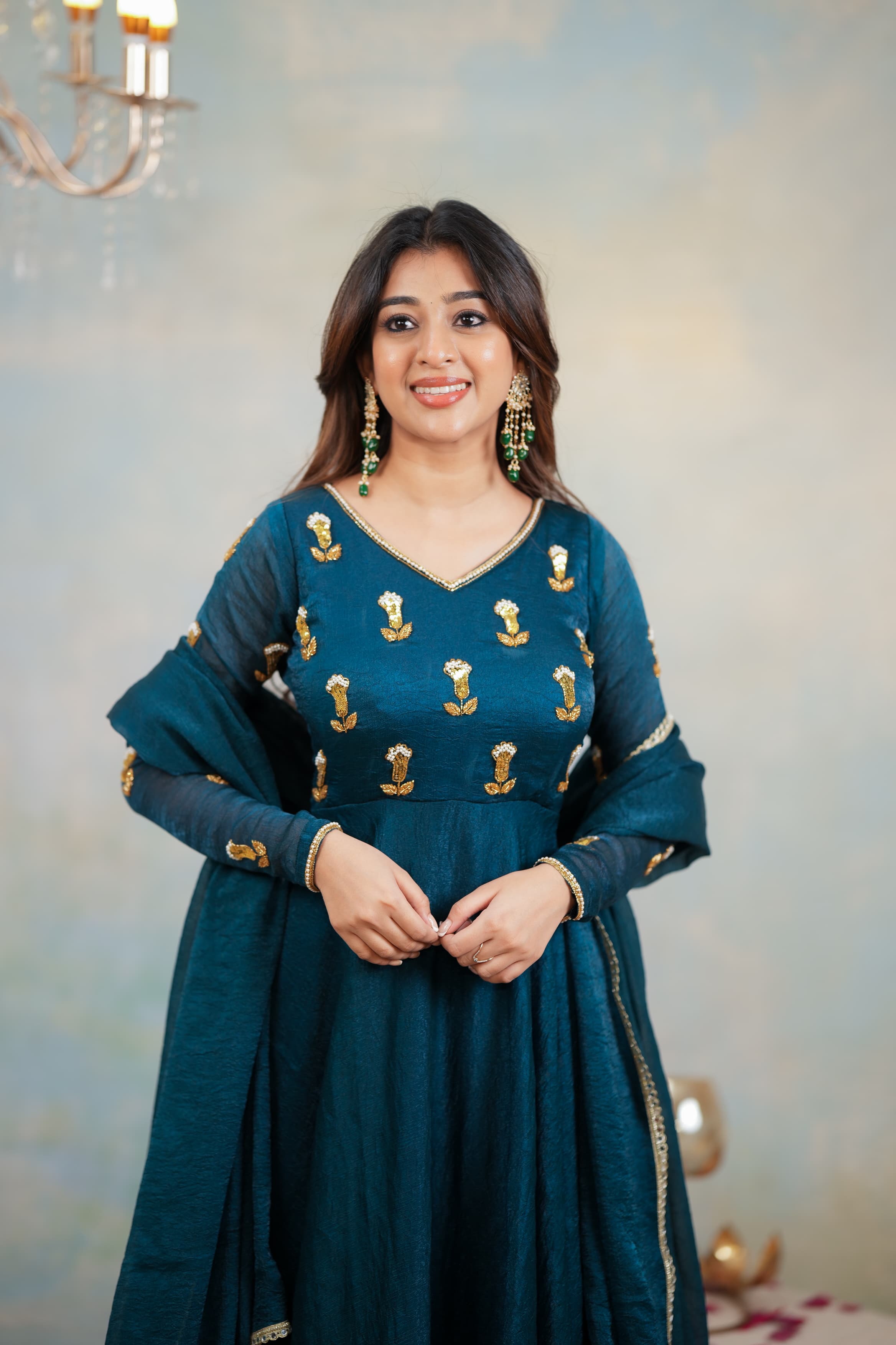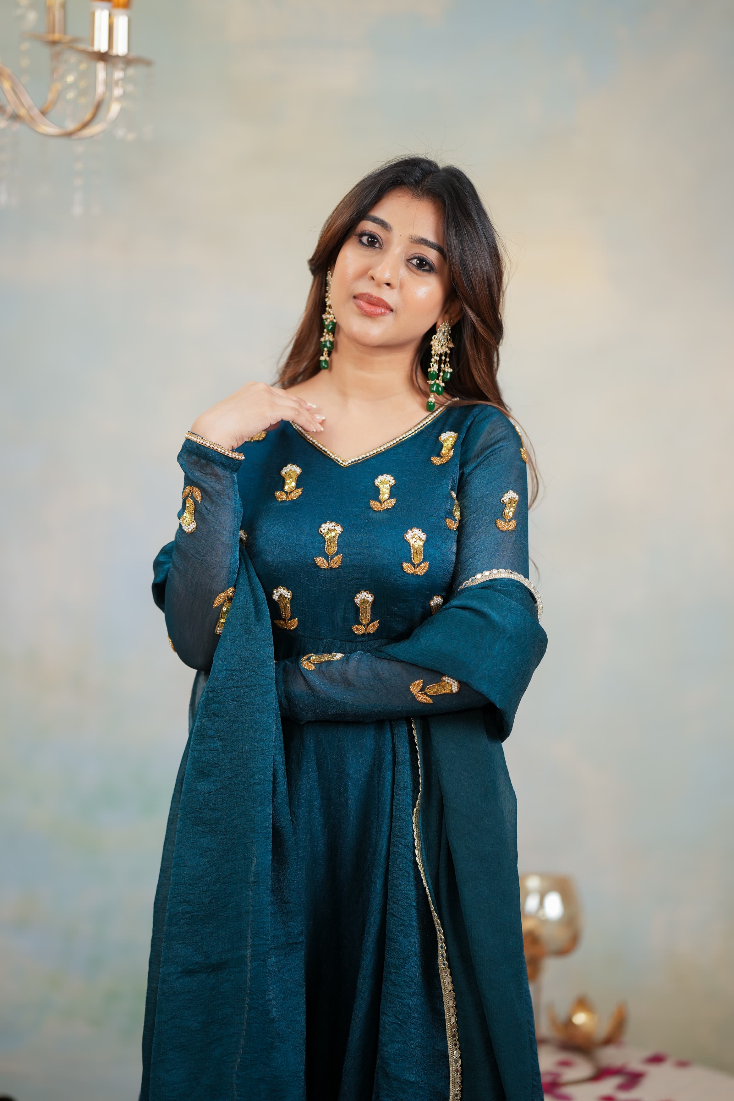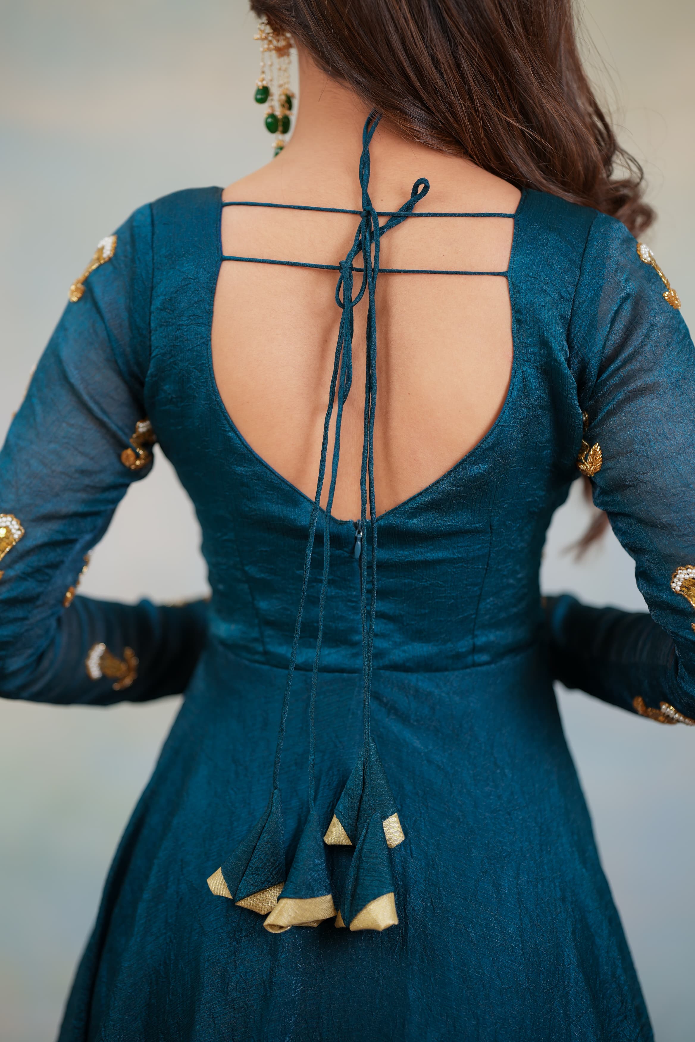 Royal teal crush tissue Anarkali adorned with elegant golden handwork motifs, full sleeves, and delicate zari lace highlights along the flare and sleeves.
