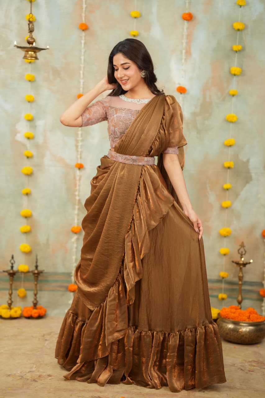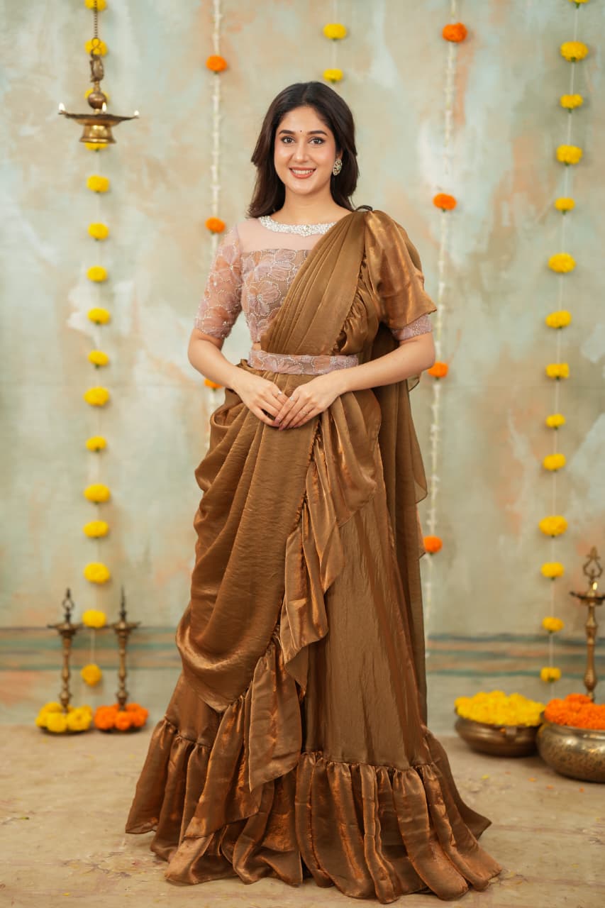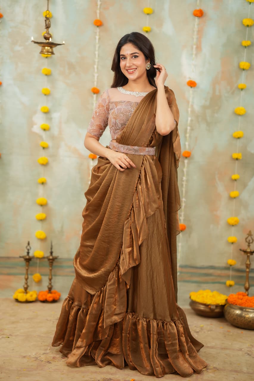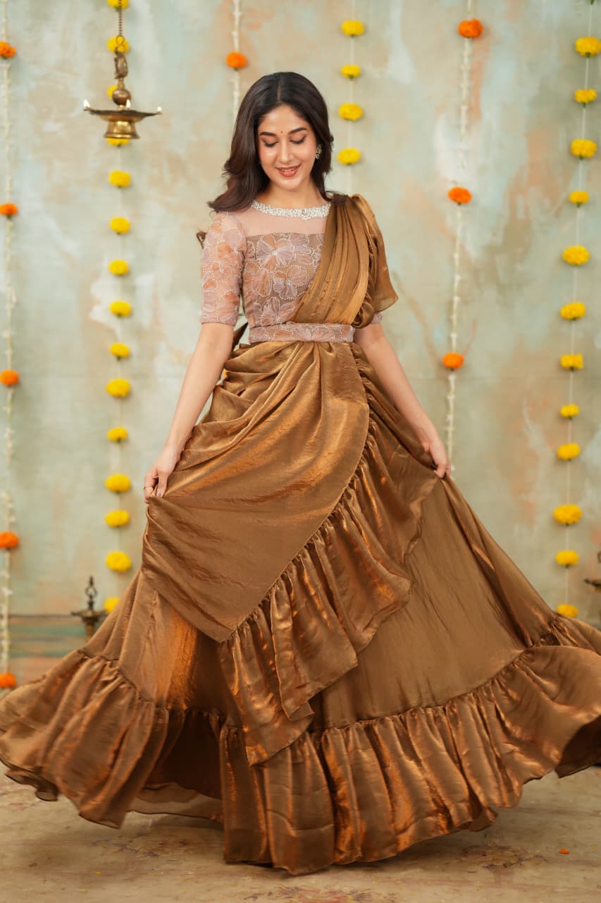 Elegant designer outfit crafted from sequence with space silk, featuring a graceful flared silhouette with ruffle detailing for a luxurious touch. The blouse comes with fine finishing, enhancing the festive charm.