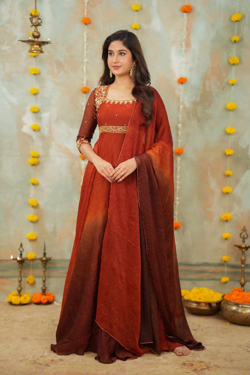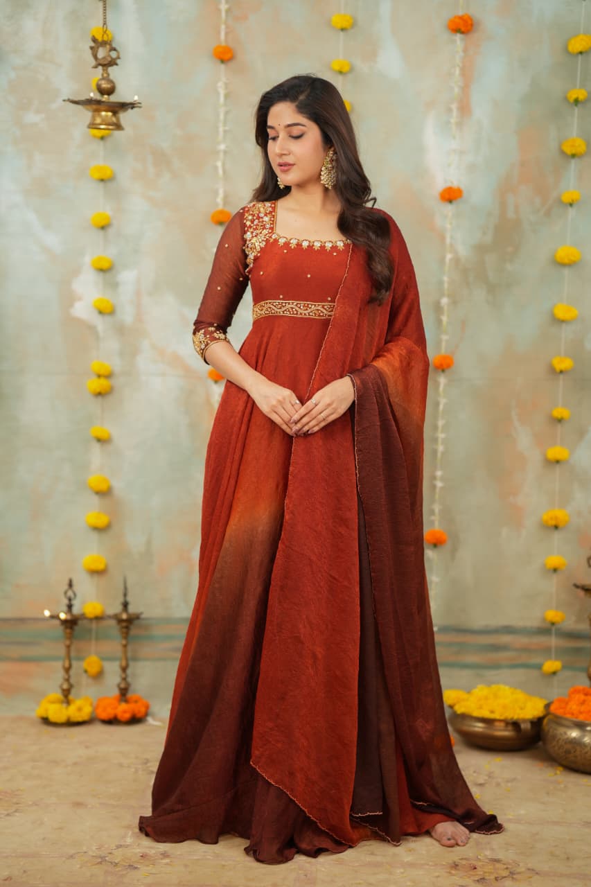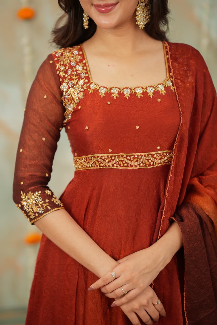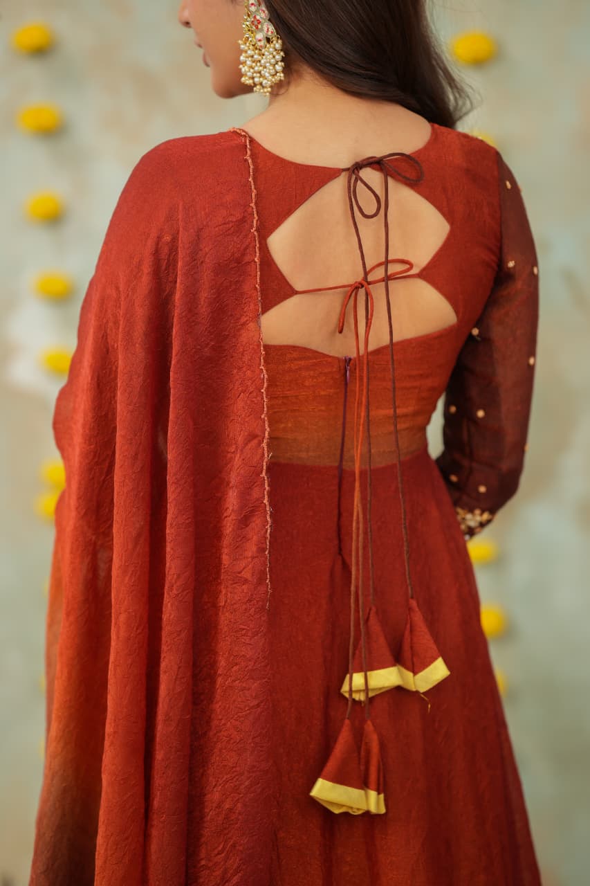 Rust ombré crush tissue Anarkali with delicate handworked detailing on the neckline and sleeves. Features a flattering regular fit, ankle length, and a beautifully flared hemline.