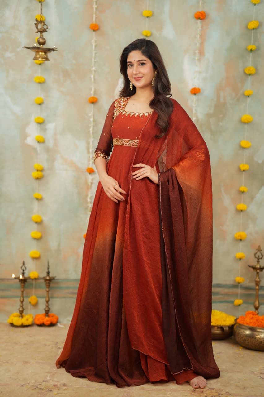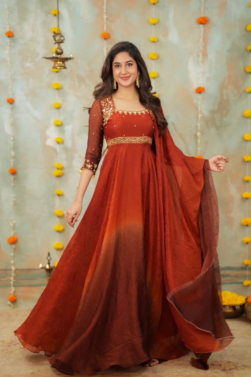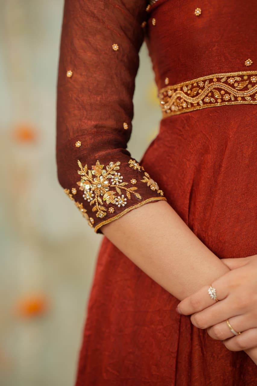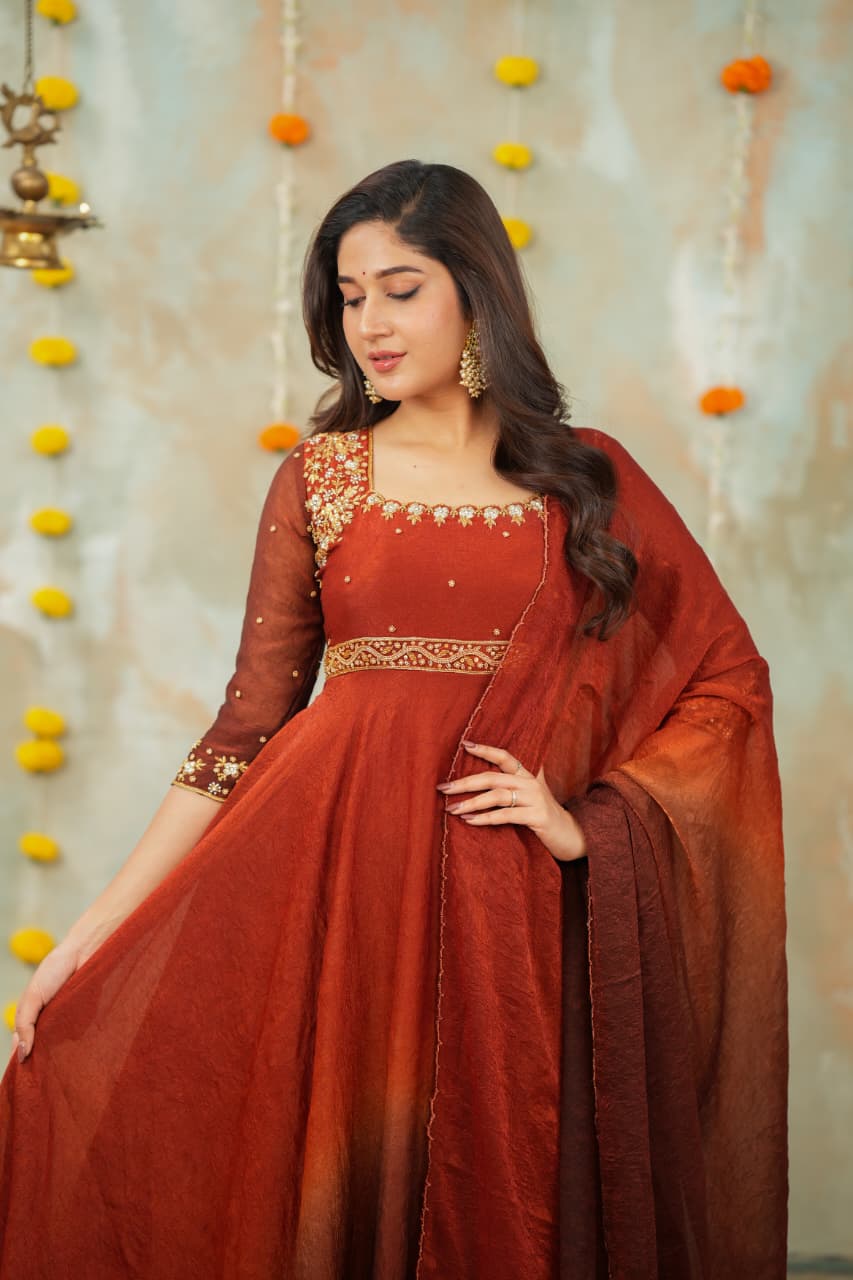 Rust ombré crush tissue Anarkali with delicate handworked detailing on the neckline and sleeves. Features a flattering regular fit, ankle length, and a beautifully flared hemline.