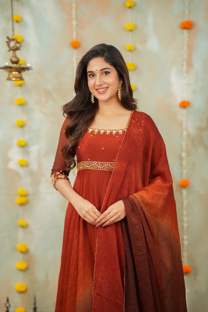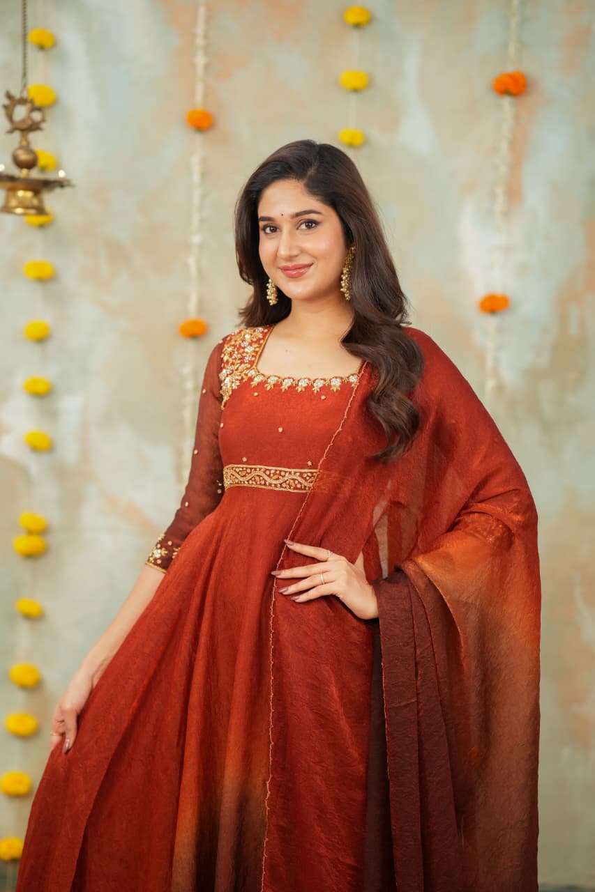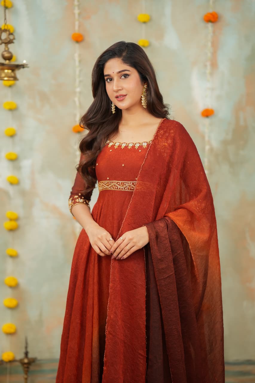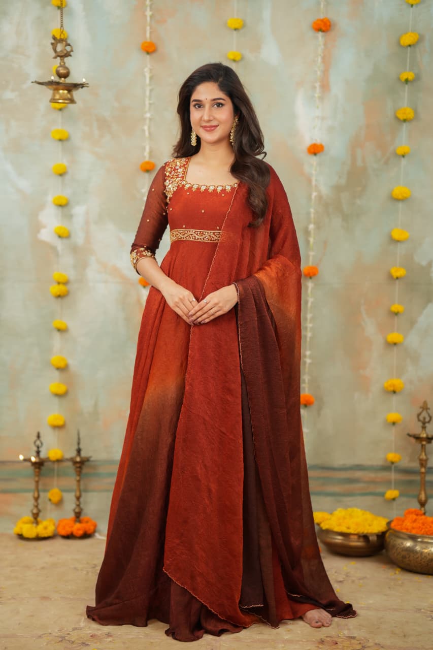 Rust ombré crush tissue Anarkali with delicate handworked detailing on the neckline and sleeves. Features a flattering regular fit, ankle length, and a beautifully flared hemline.