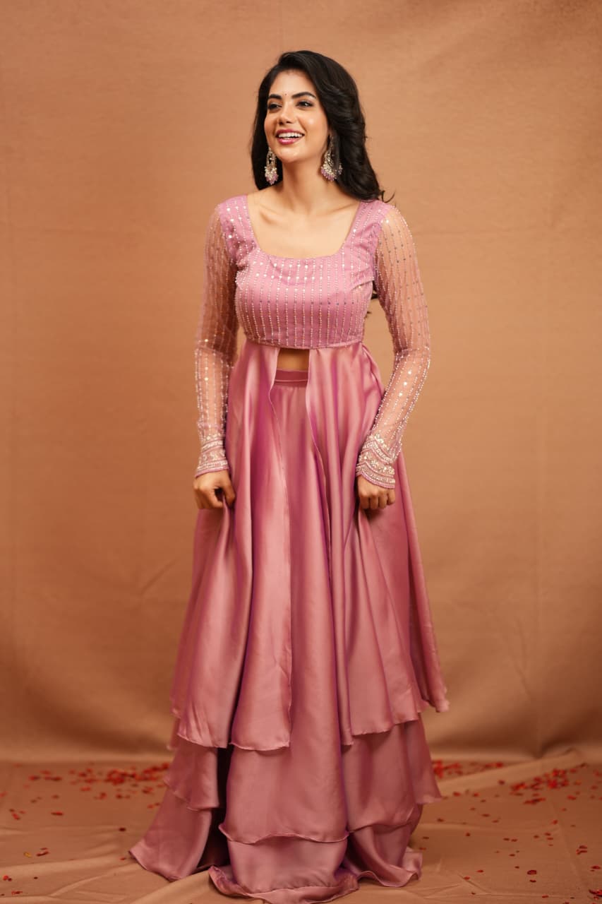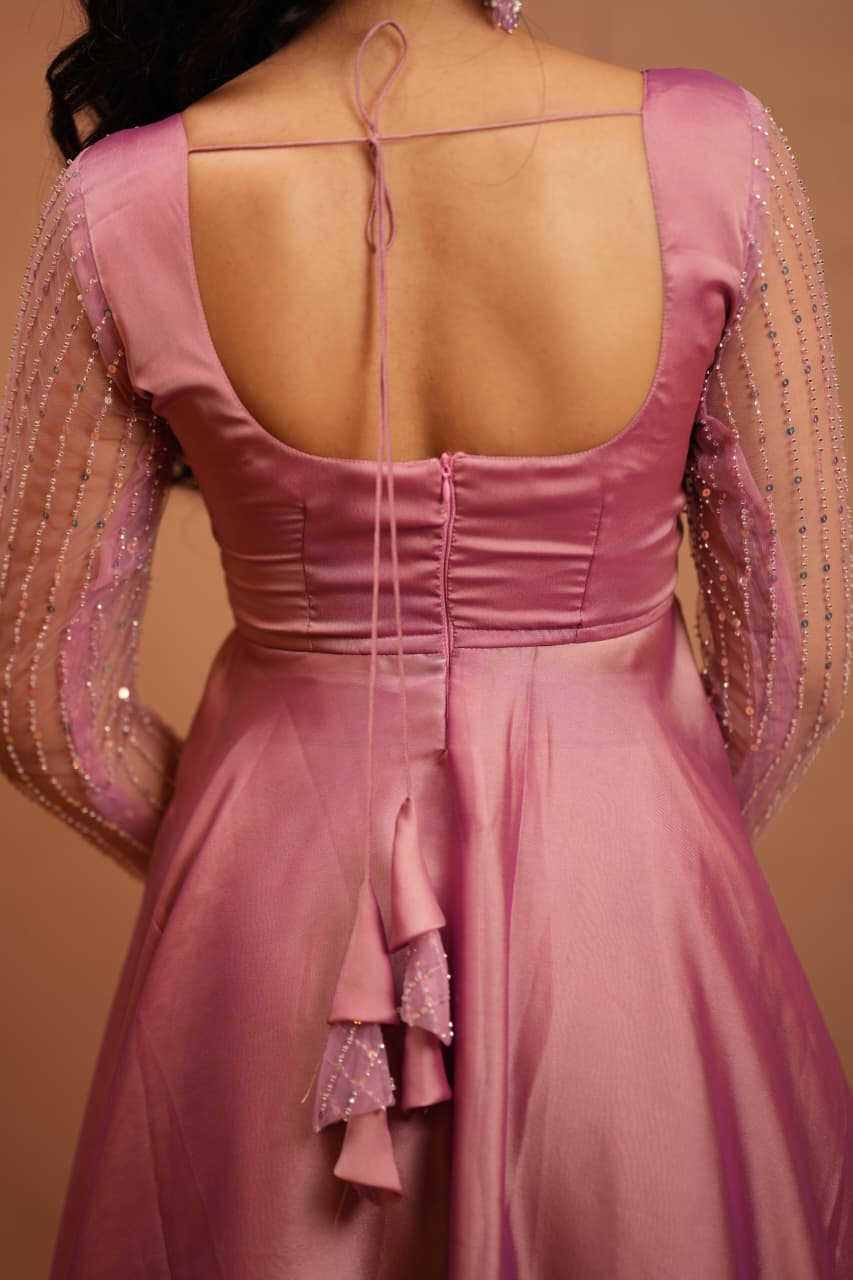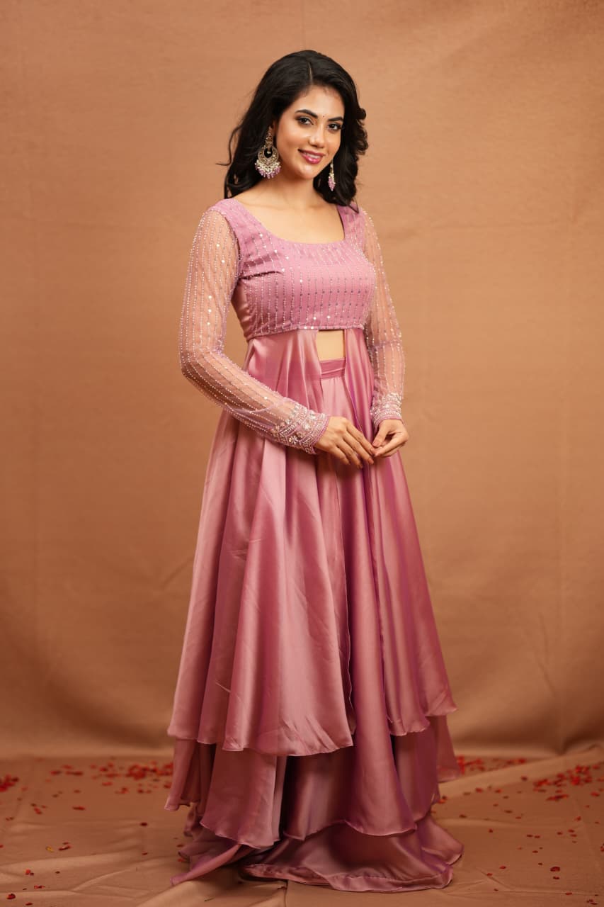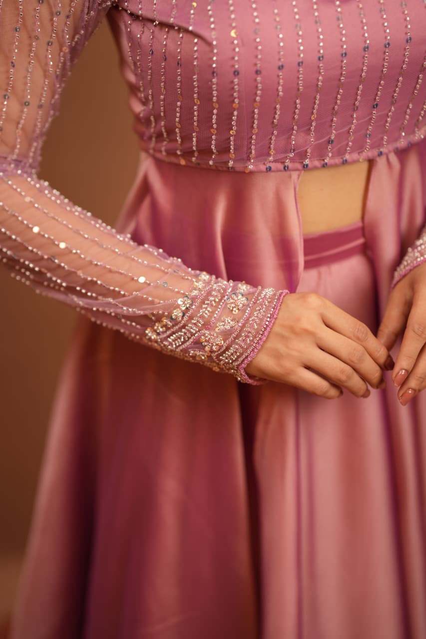 Full-flared lehanga skirt made from shiny georgette, offering a flowy silhouette with graceful movement. Finished with a smooth waistband and concealed side zipper for comfort and fit.