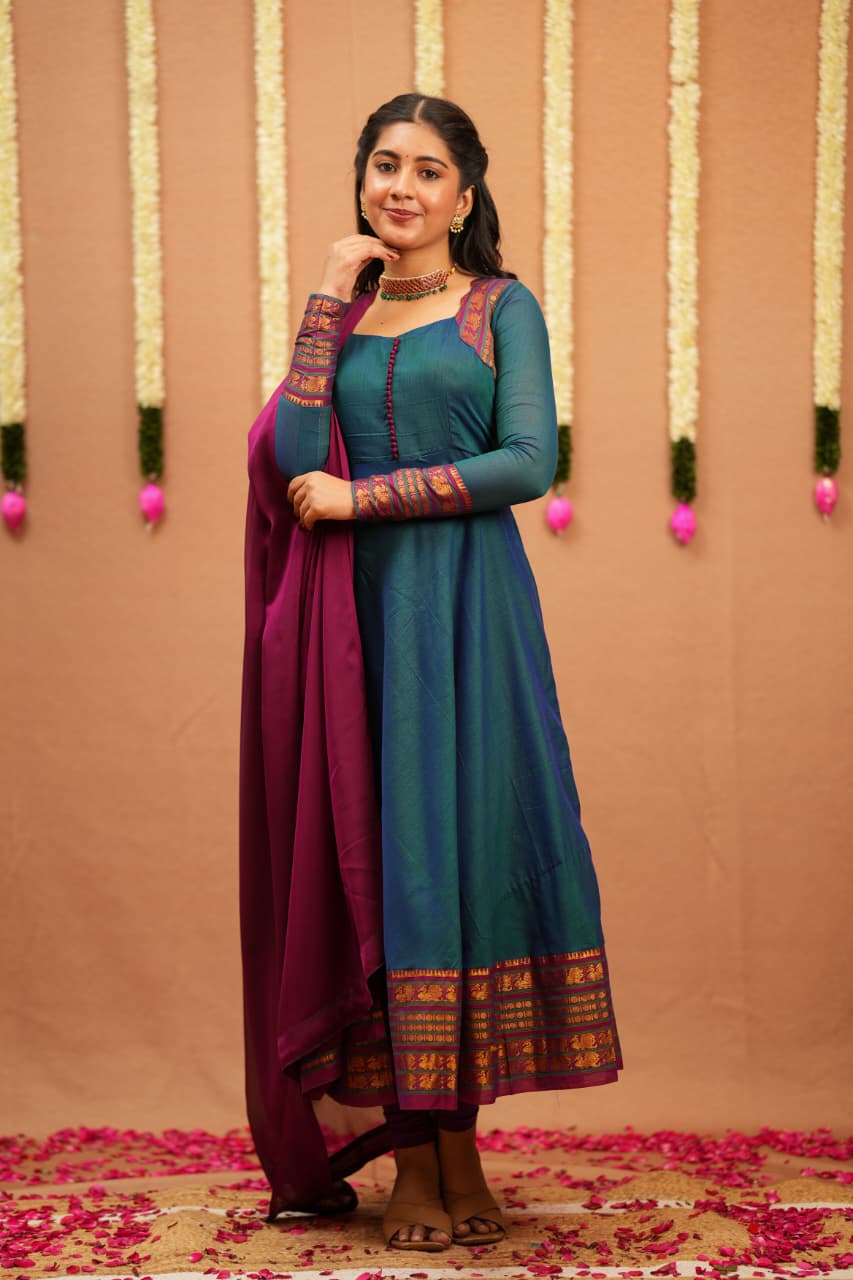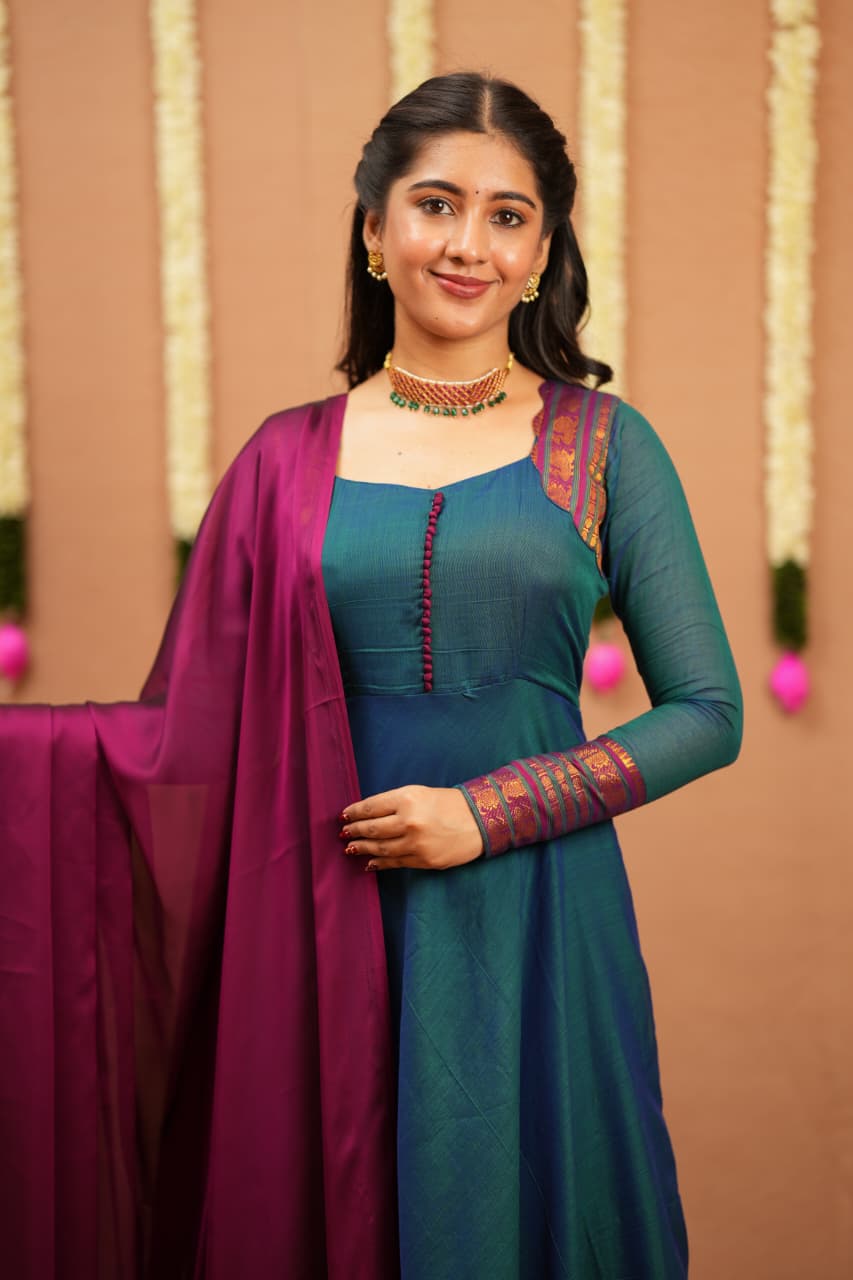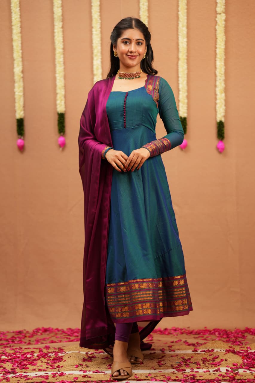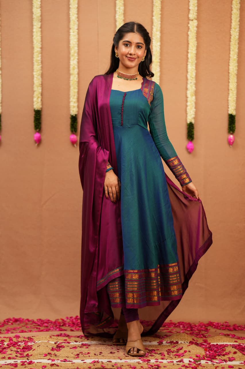This beautiful Anarkali from the Annapoorni Collection is an elegant fusion of heritage and comfort. Crafted from 100% pure handloom cotton, it boasts a perfect blend of intricate weaving and breathable fabric that makes it a timeless classic. The stunning design features a soft, earthy tone with detailed borders that add just the right amount of charm. Paired with a matching dupatta, this set is perfect for every occasion.