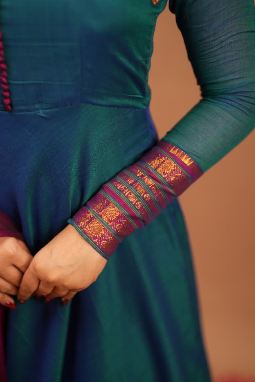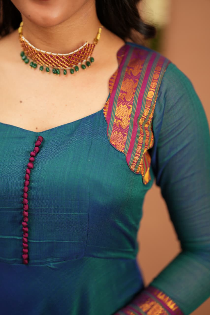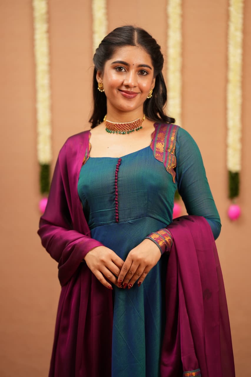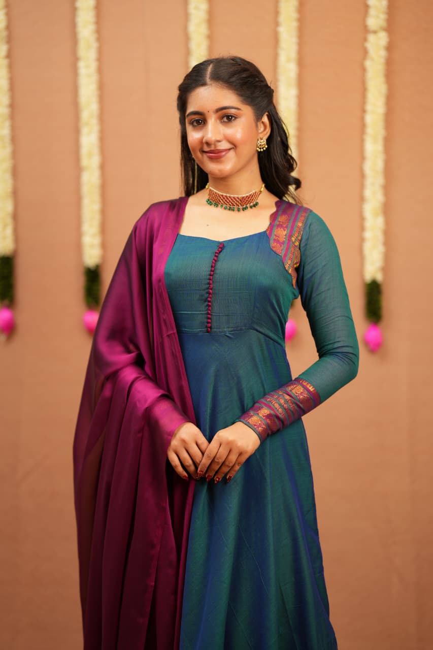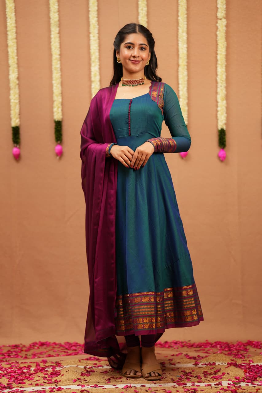 This beautiful Anarkali from the Annapoorni Collection is an elegant fusion of heritage and comfort. Crafted from 100% pure handloom cotton, it boasts a perfect blend of intricate weaving and breathable fabric that makes it a timeless classic. The stunning design features a soft, earthy tone with detailed borders that add just the right amount of charm. Paired with a matching dupatta, this set is perfect for every occasion.