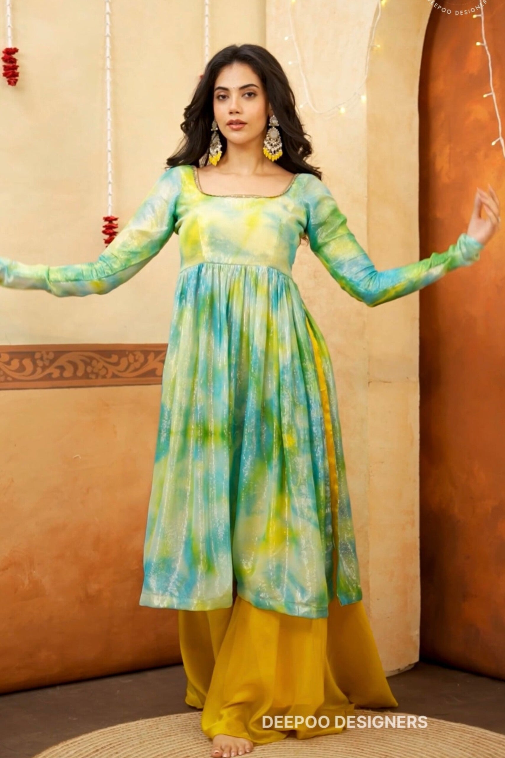 Crafted from exquisite laurex fabric, this Anarkali brings together shimmering elegance and effortless flow. The fabric features a soft glossy finish that beautifully catches the light, creating a dreamy, fluid movement with every twirl.
