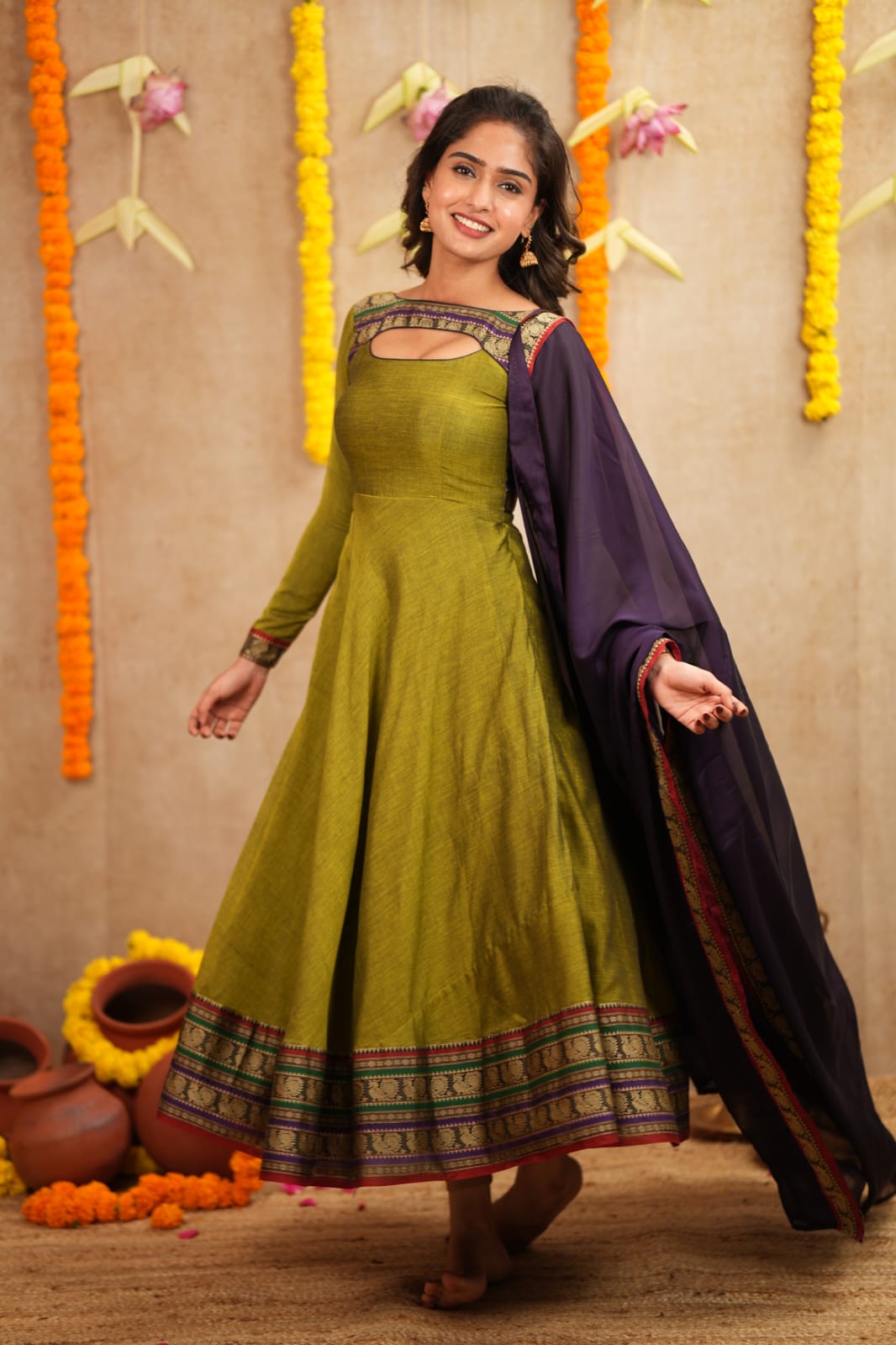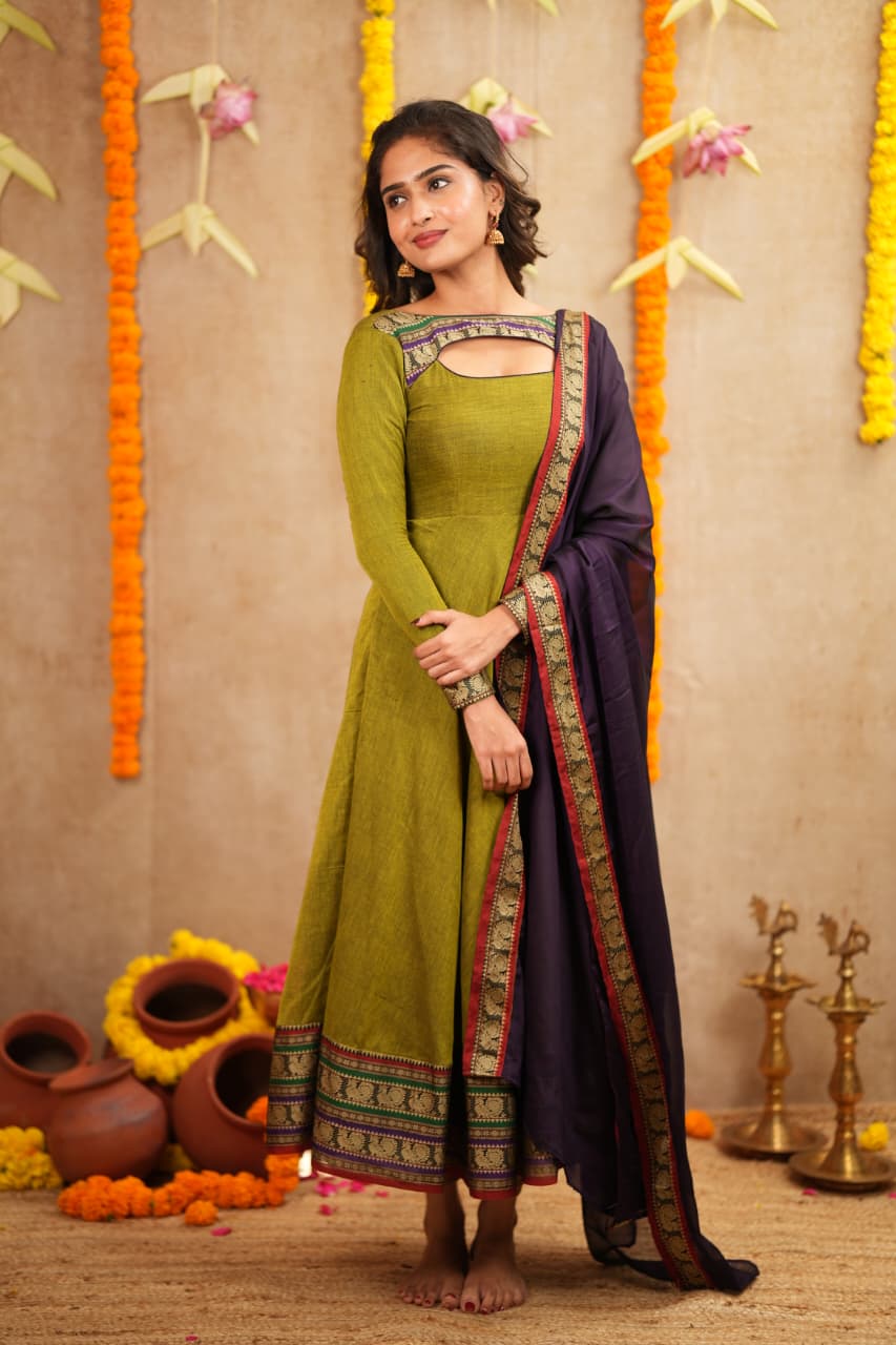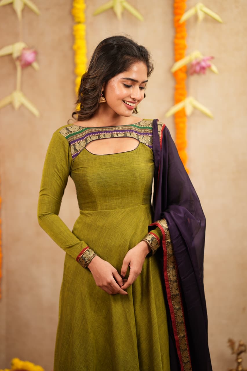 The Kannama Collection showcases a beautifully crafted Anarkali made from rich handloom cotton, designed for effortless elegance and all-day comfort. The naturally breathable fabric, graceful flare, and timeless silhouette make it a perfect choice for those who love understated traditional charm with a refined finish.